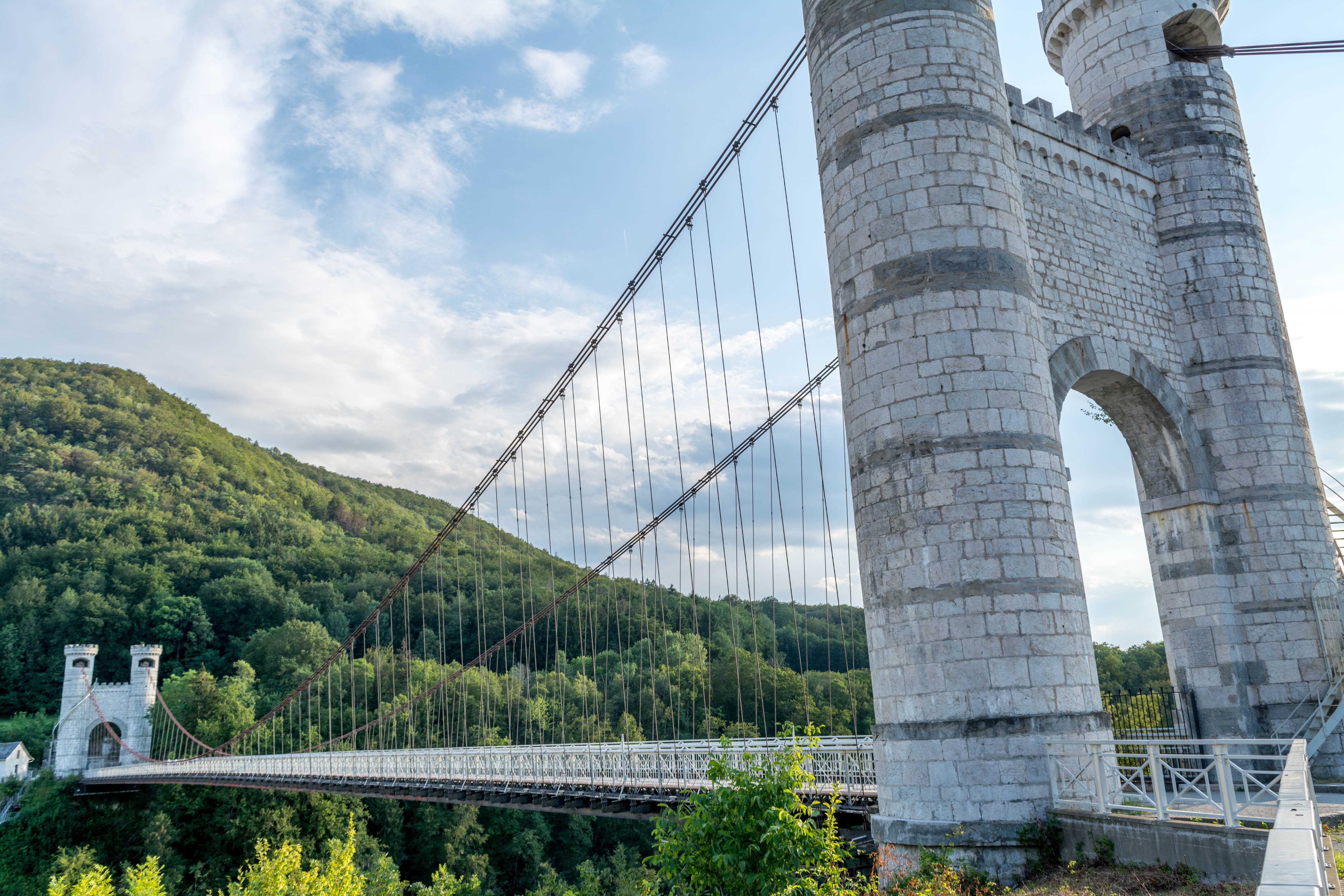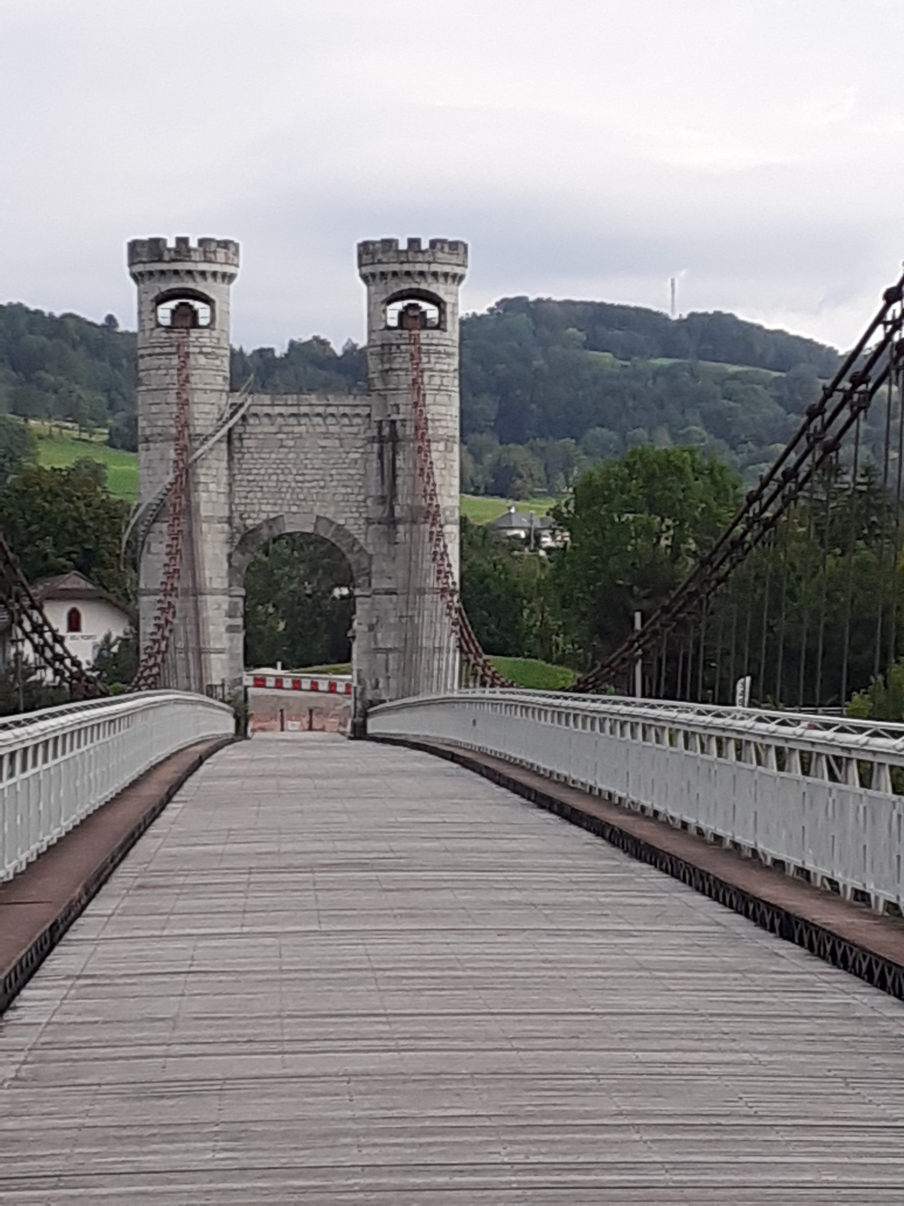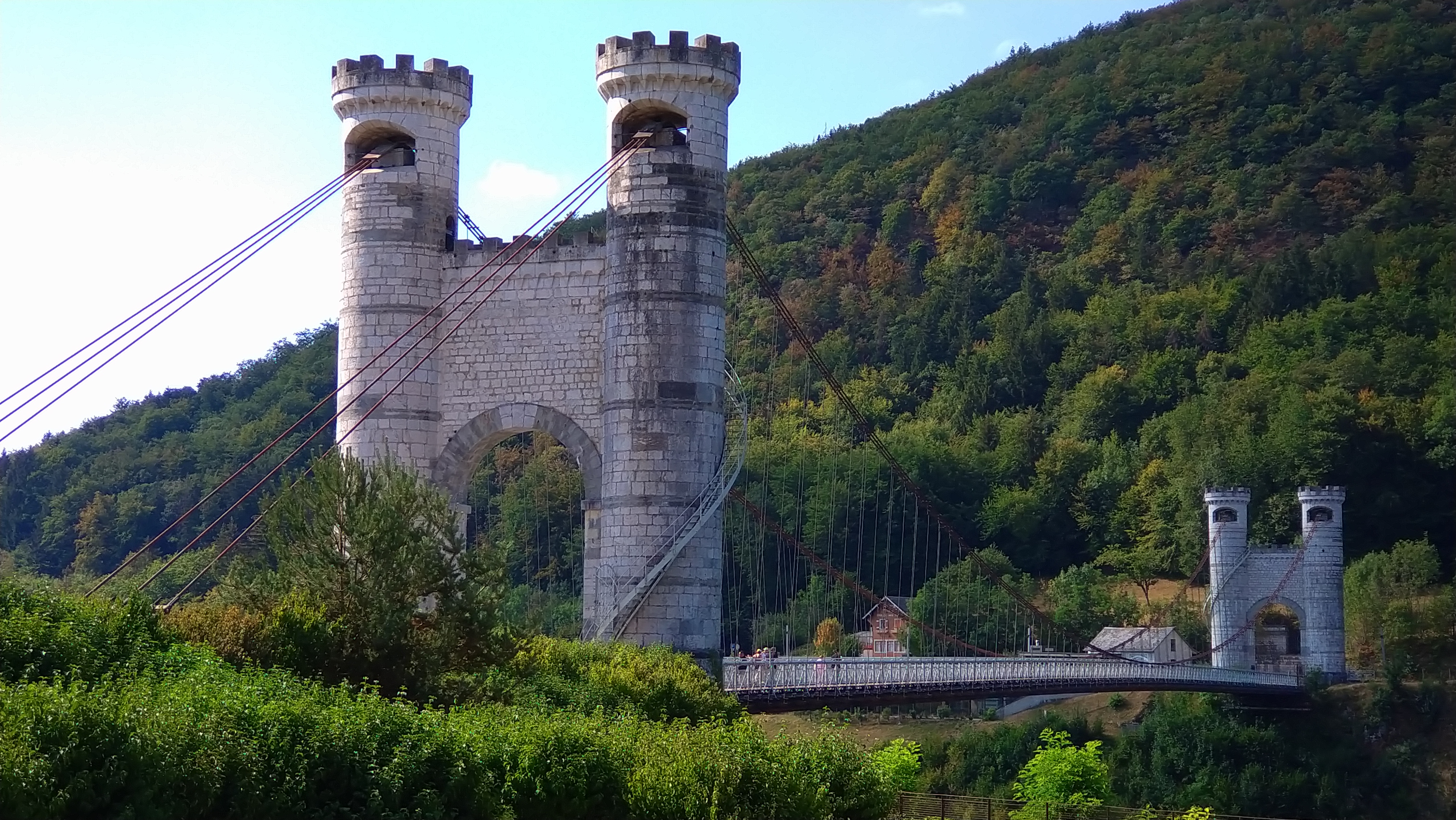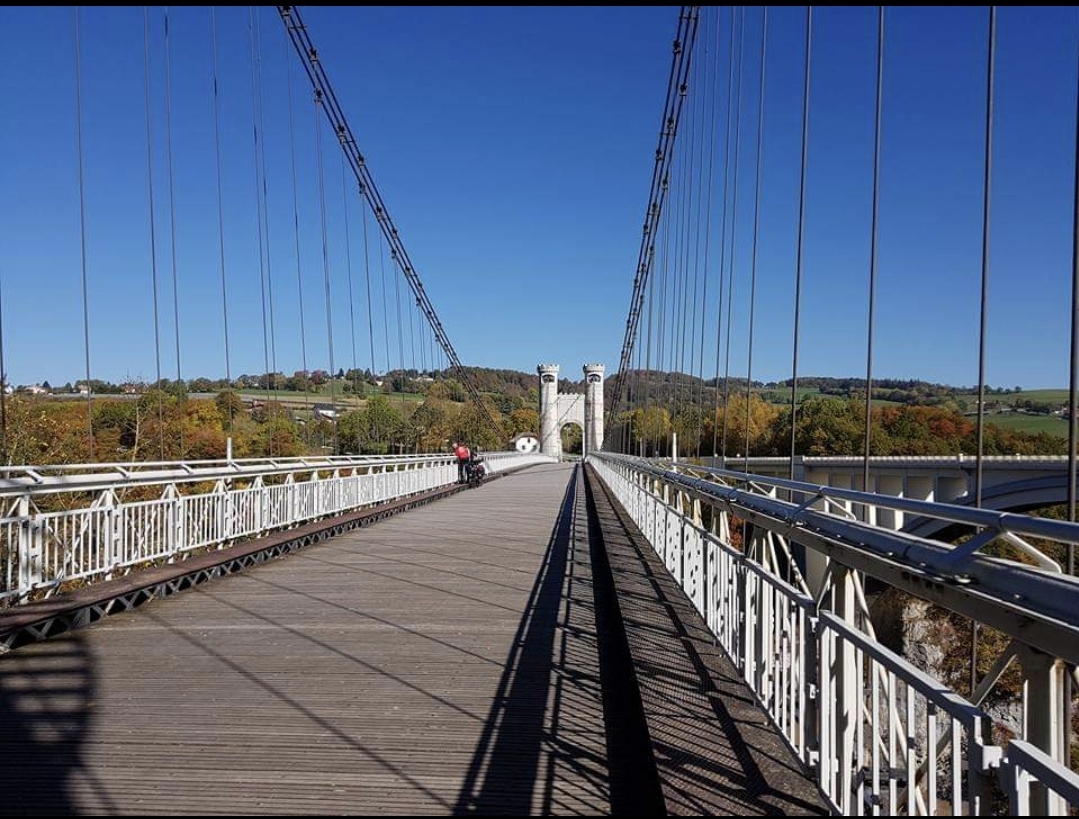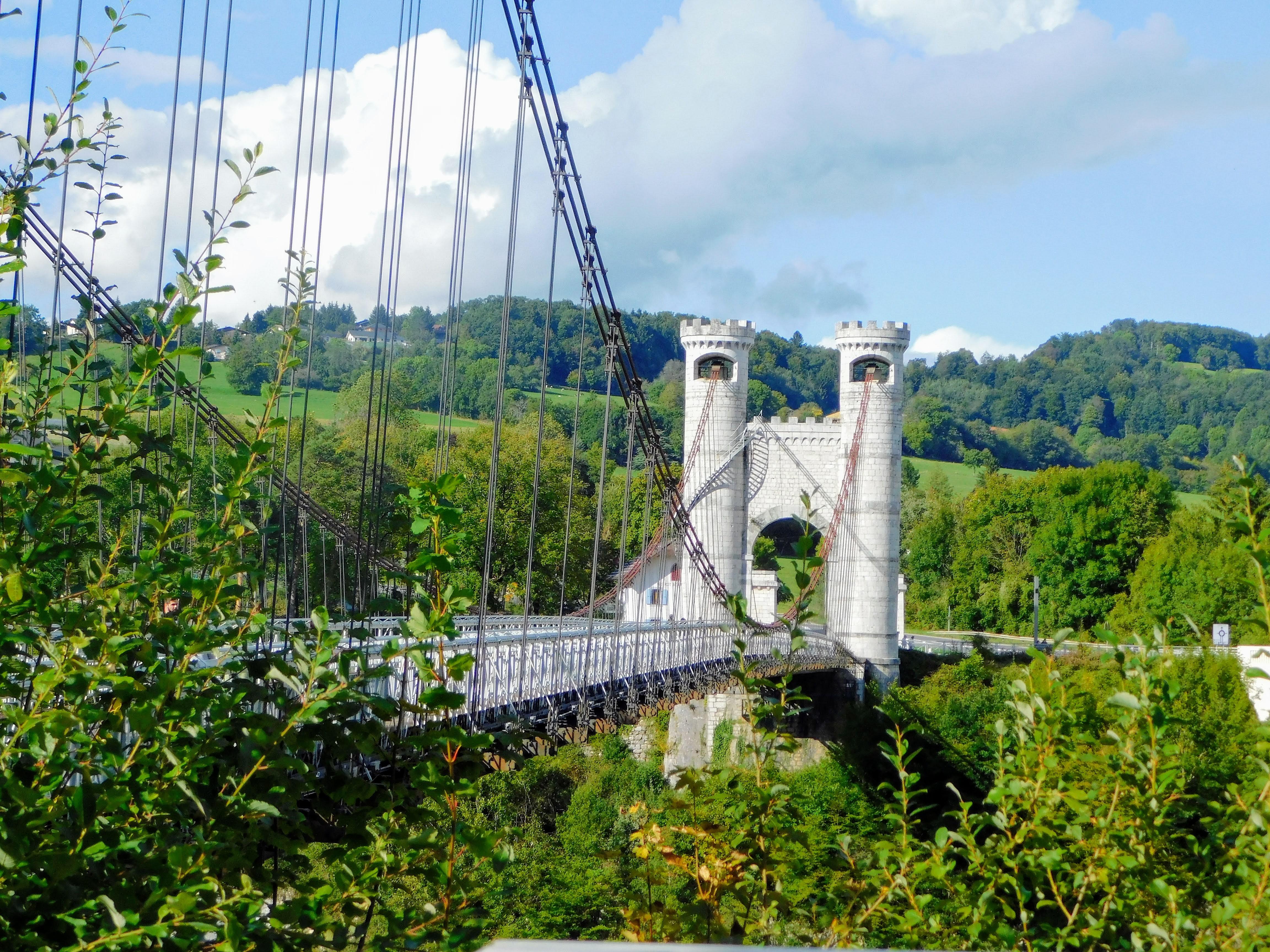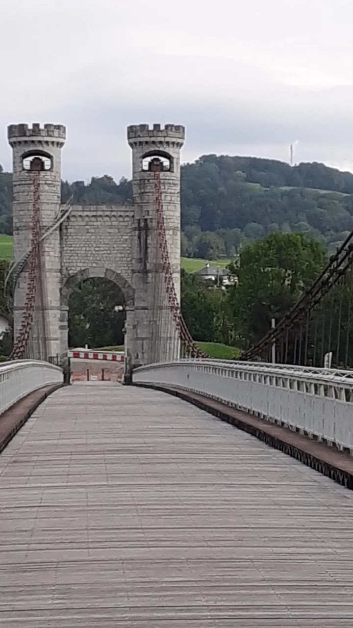 Spectaculaire pont suspendu en câble d'acier inscrit au titre des Monuments Historiques et c'est mérité. Il surplombe d'une belle hauteur une rivière. Le lieu est impressionnant avec toutes ces petites collines verdoyantes autour. Très belle réalisation avec des tours qui rappellent celles d'un château fort du moyen âge. Le panorama est magnifique.. À découvrir !