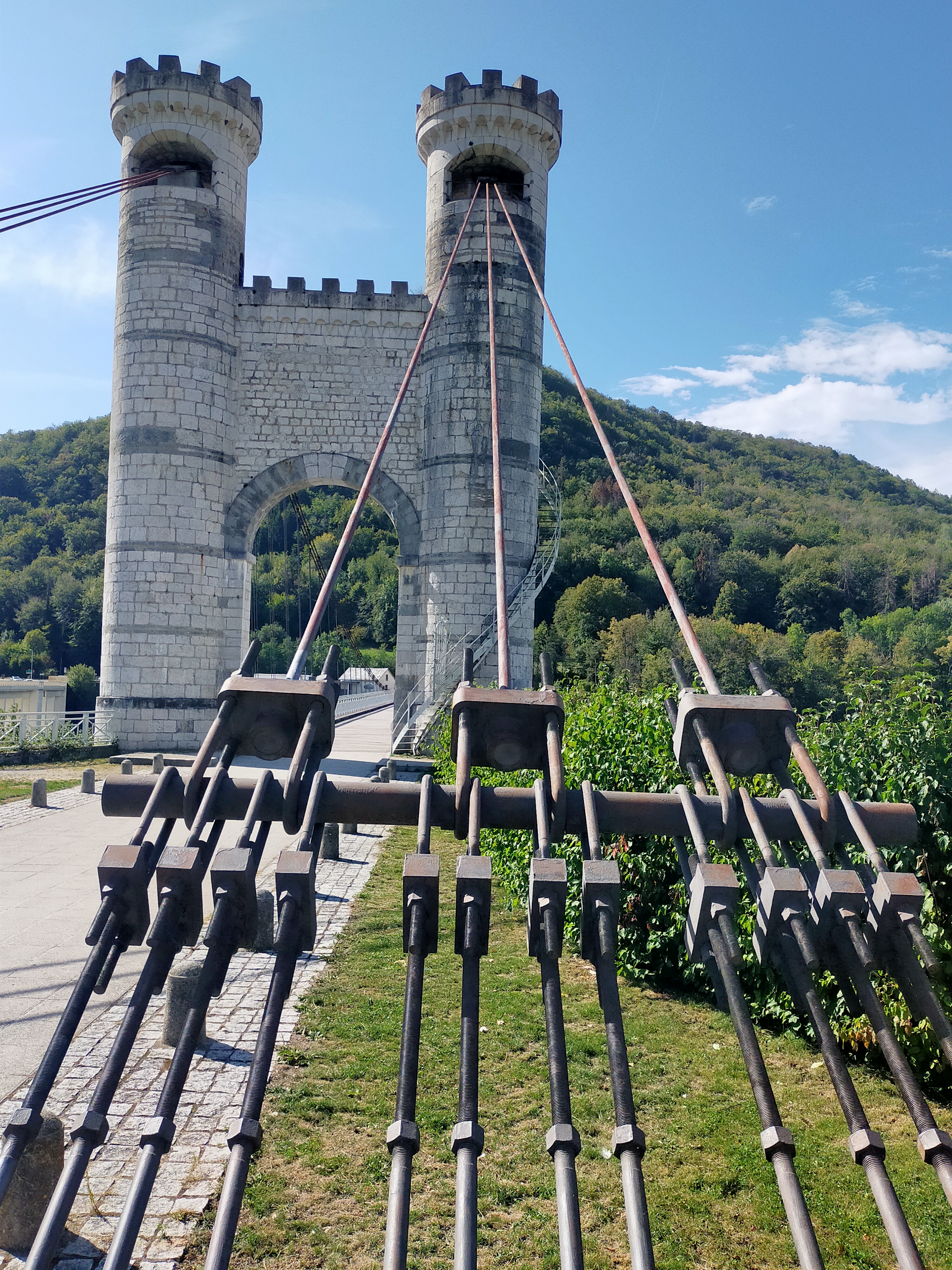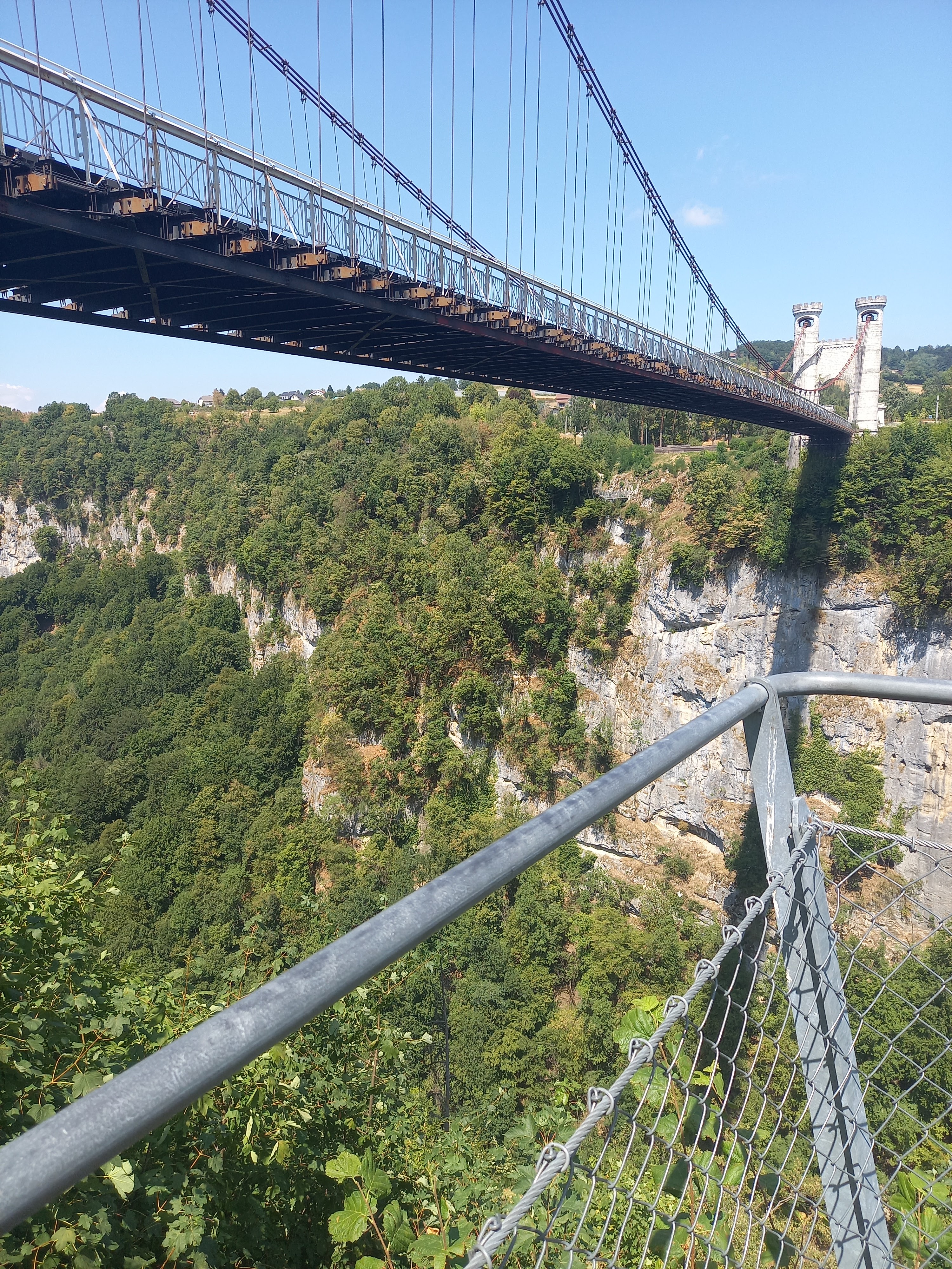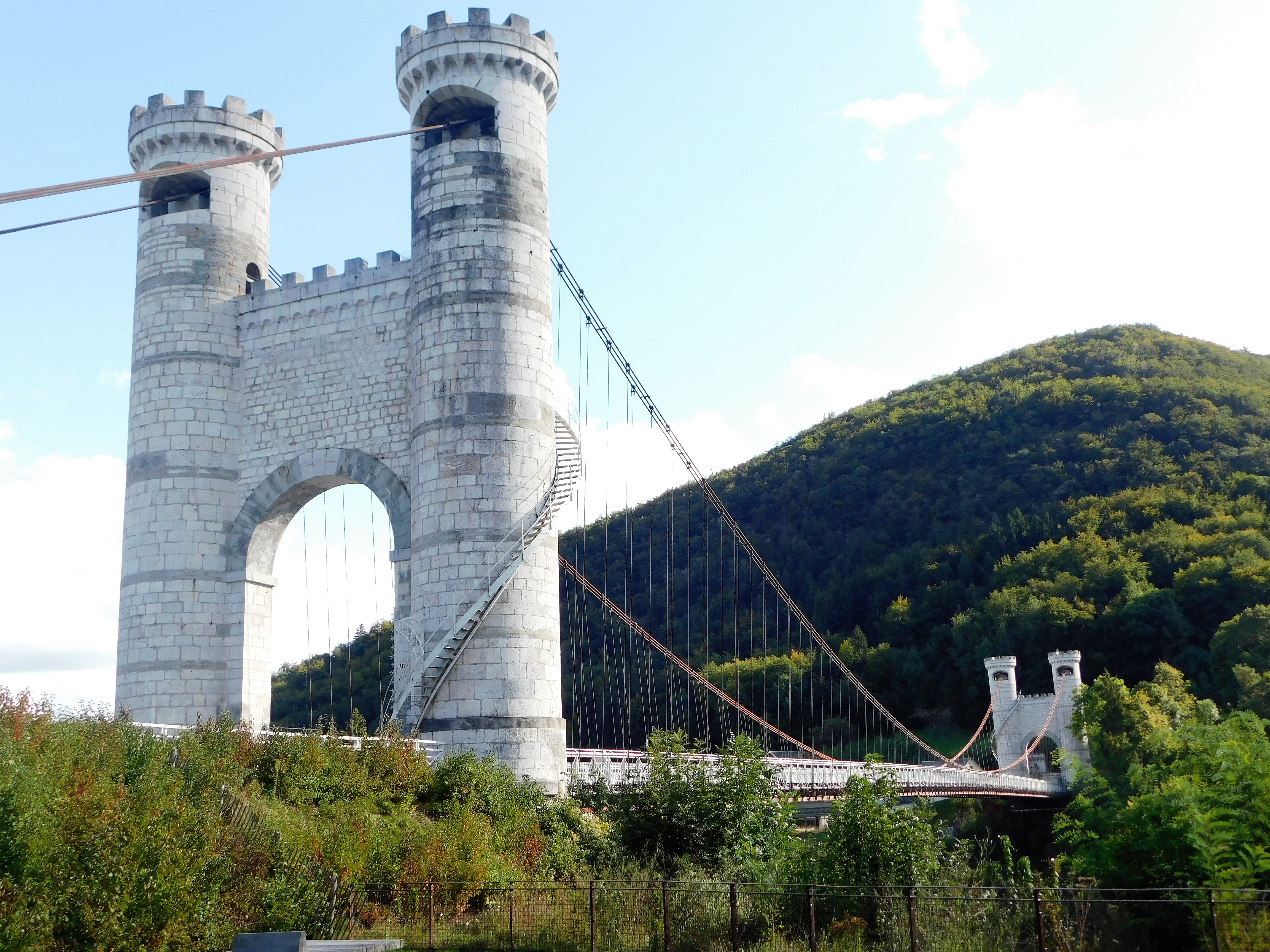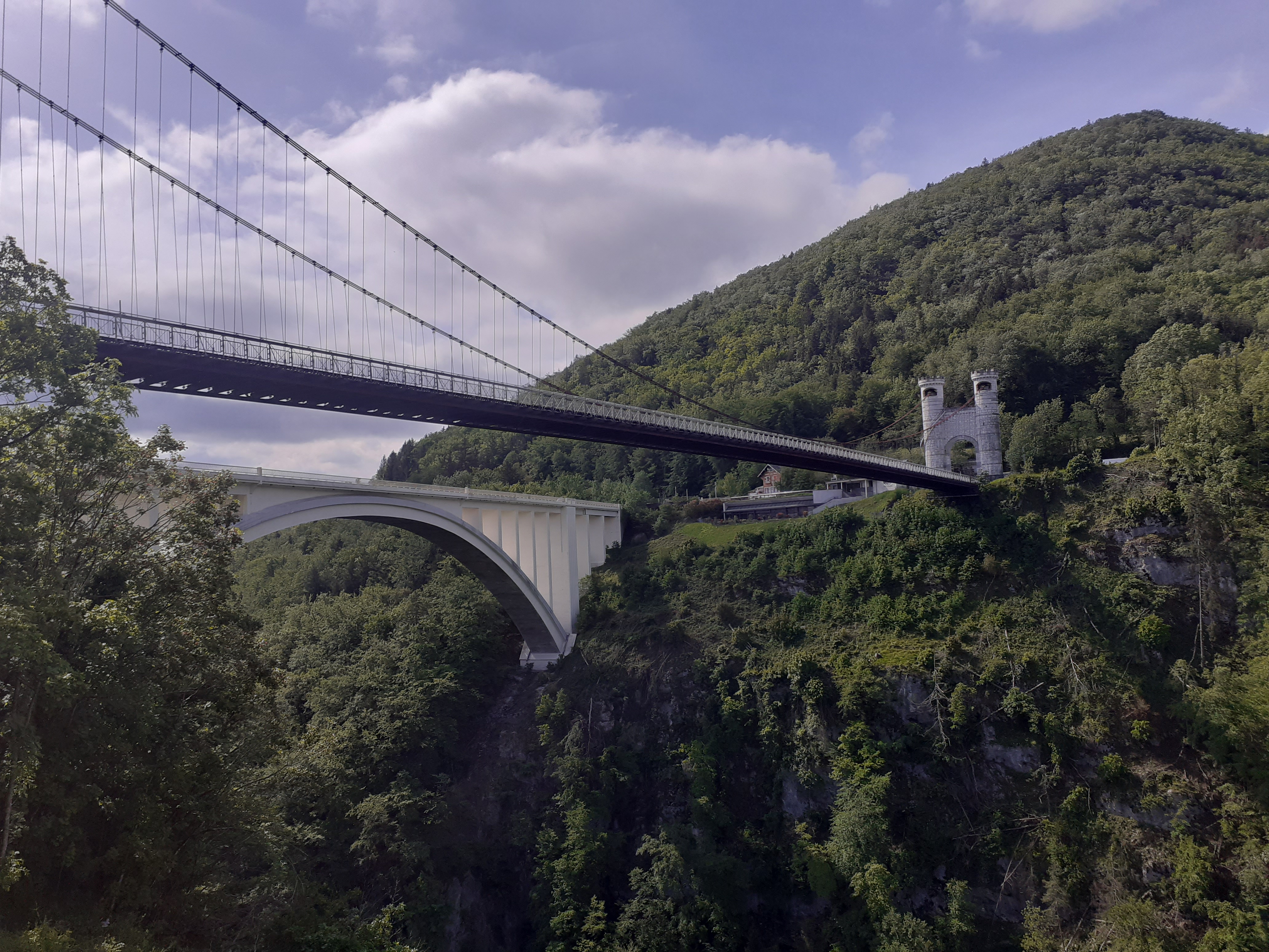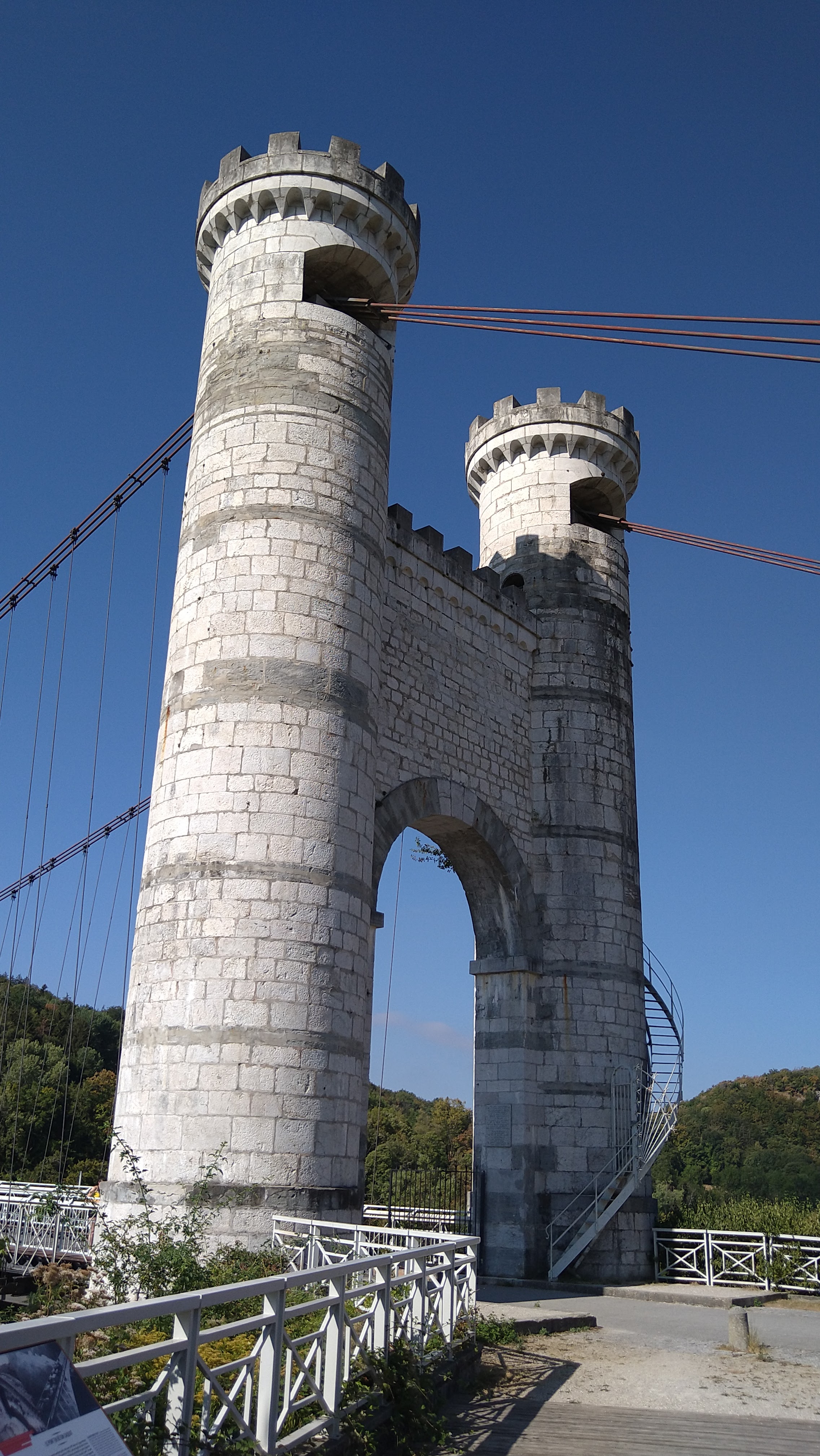 Spectaculaire pont suspendu en câble d'acier inscrit au titre des Monuments Historiques et c'est mérité. Il surplombe d'une belle hauteur une rivière. Le lieu est impressionnant avec toutes ces petites collines verdoyantes autour. Très belle réalisation avec des tours qui rappellent celles d'un château fort du moyen âge. Le panorama est magnifique.. À découvrir !