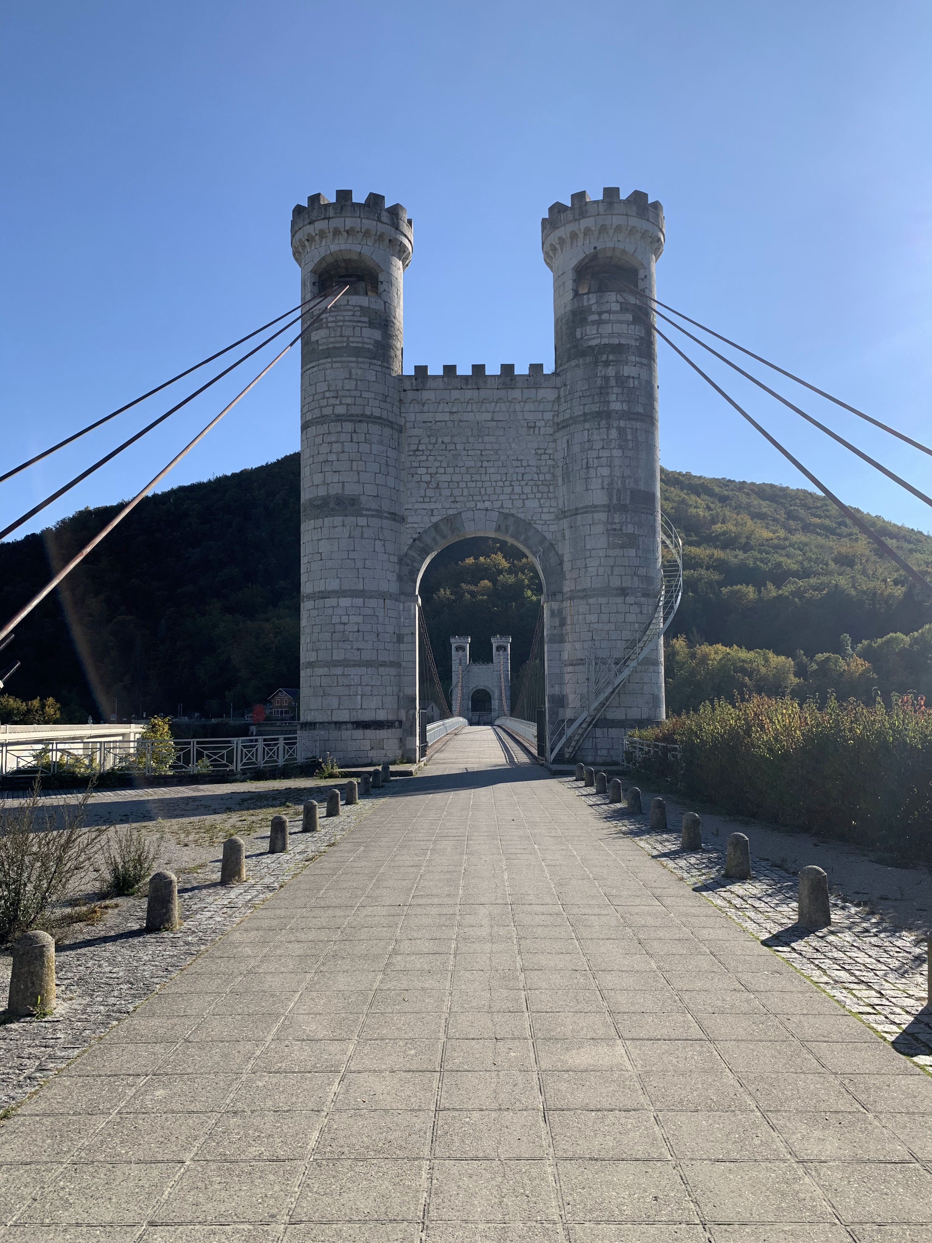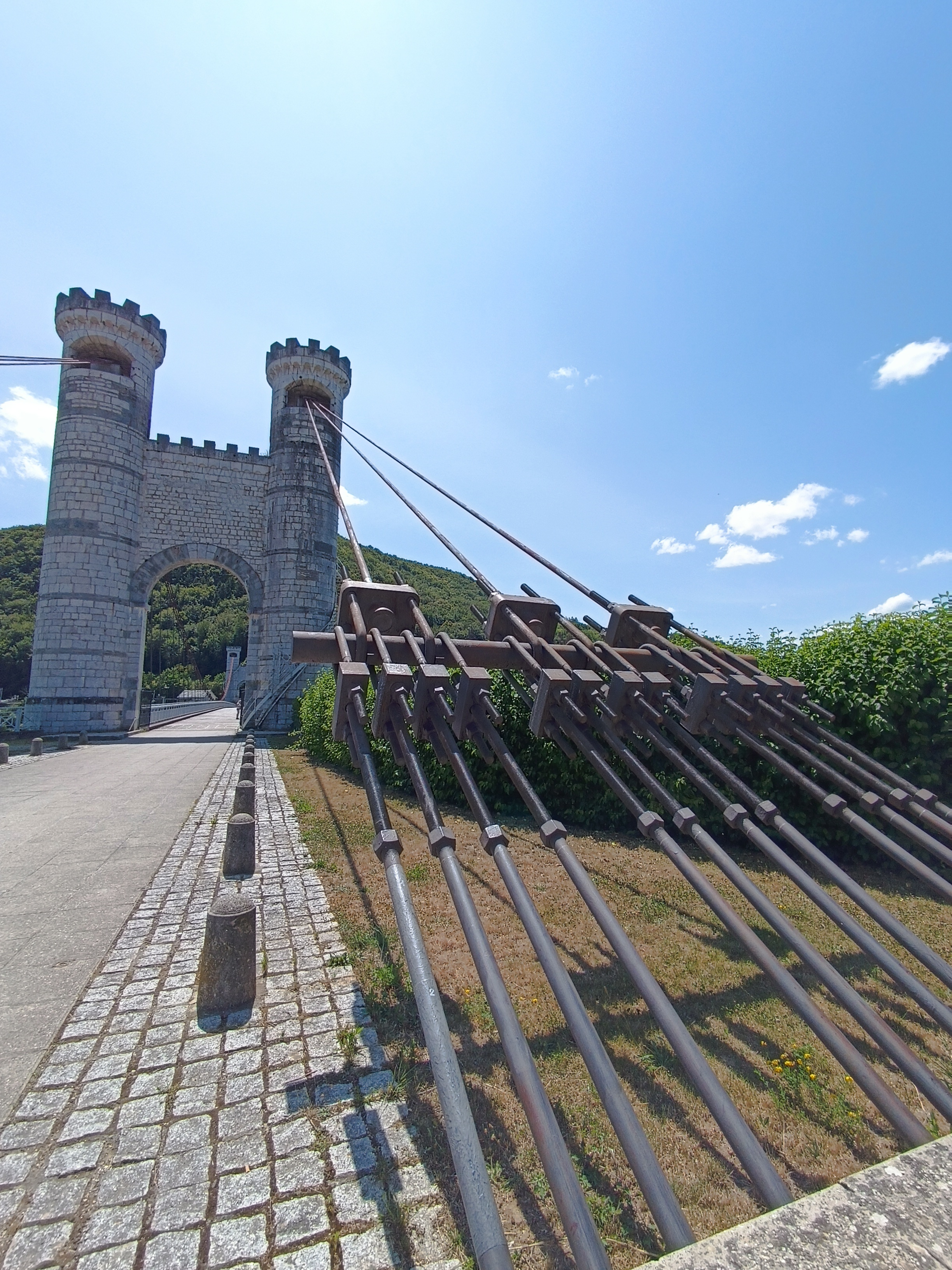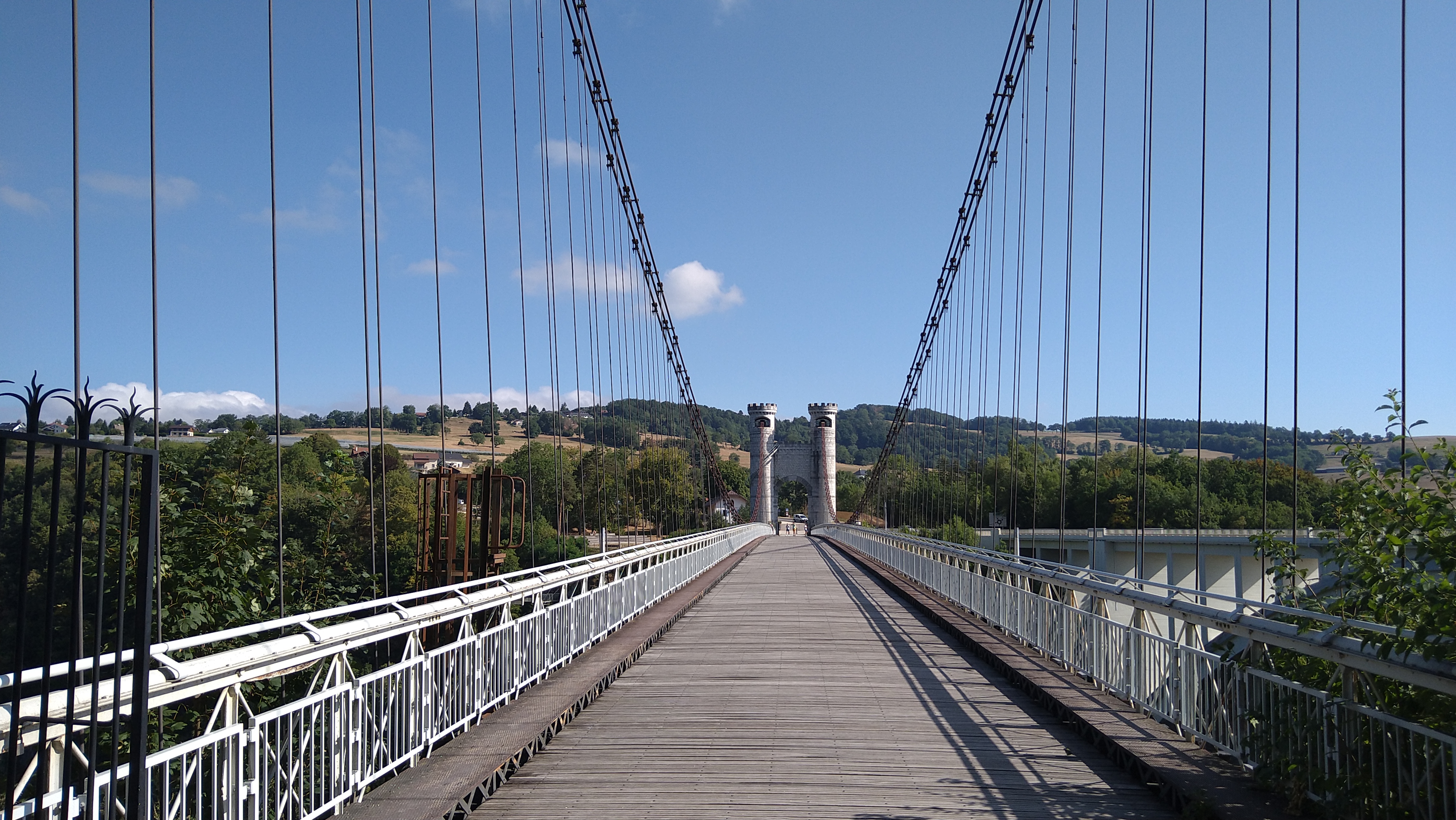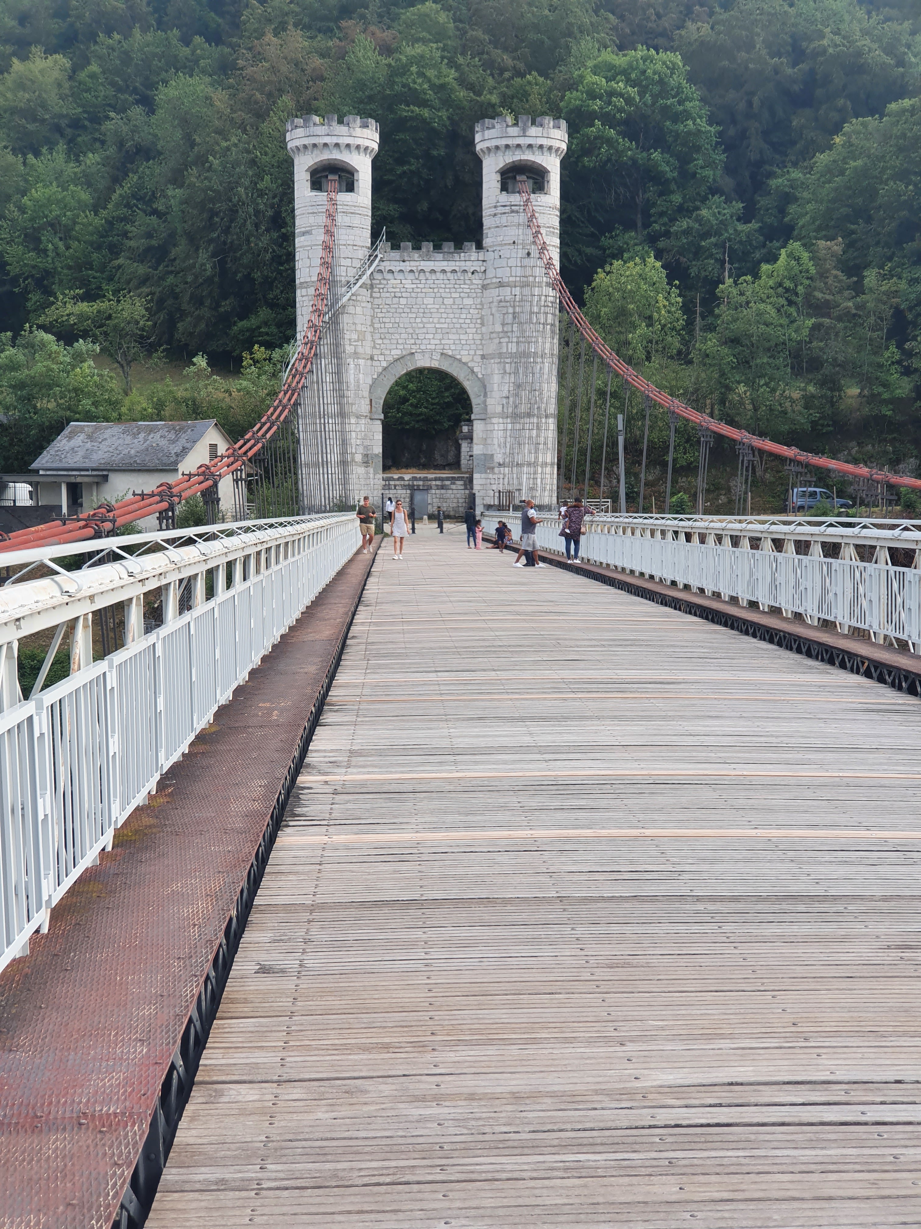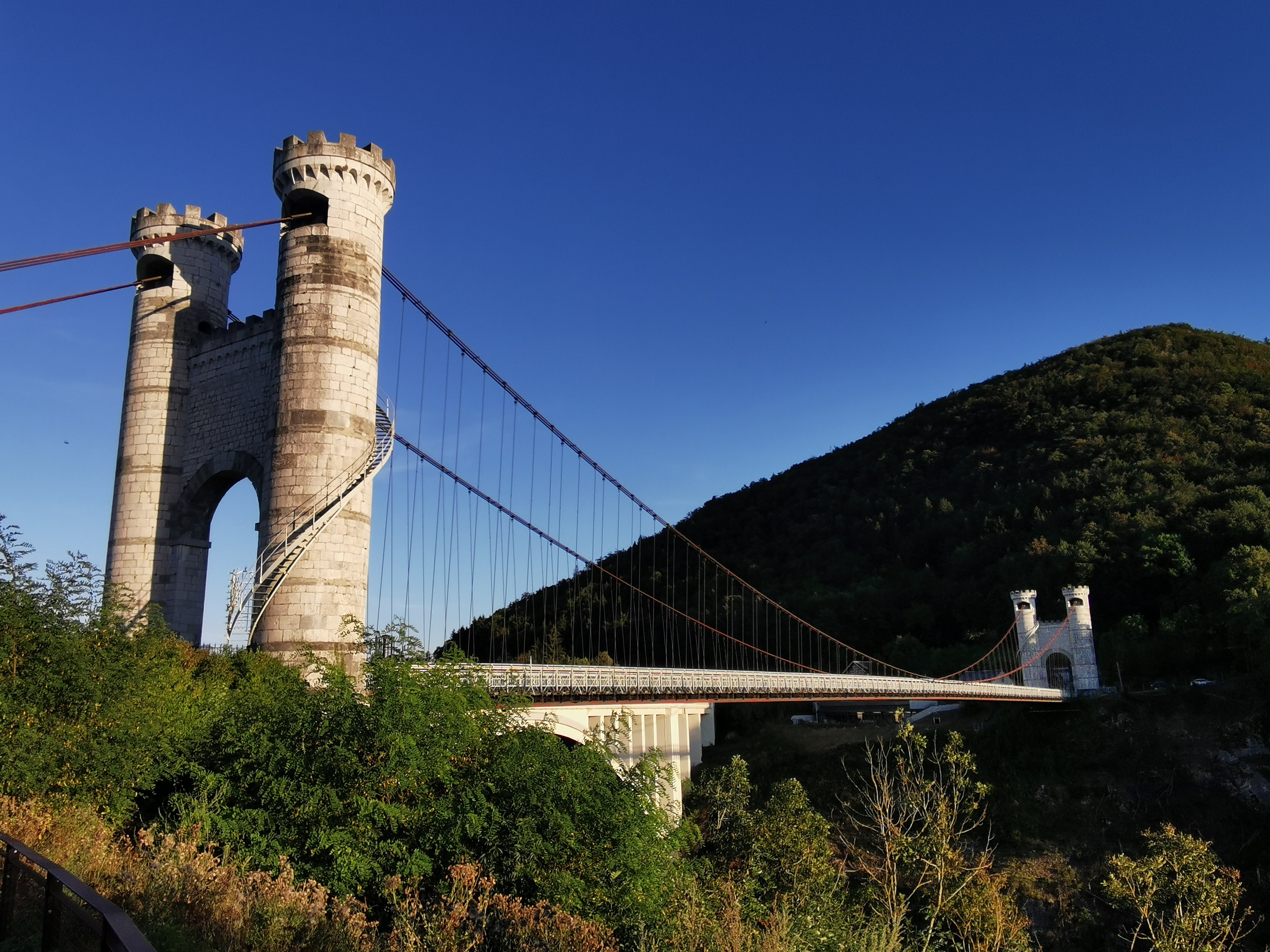 Spectaculaire pont suspendu en câble d'acier inscrit au titre des Monuments Historiques et c'est mérité. Il surplombe d'une belle hauteur une rivière. Le lieu est impressionnant avec toutes ces petites collines verdoyantes autour. Très belle réalisation avec des tours qui rappellent celles d'un château fort du moyen âge. Le panorama est magnifique.. À découvrir !