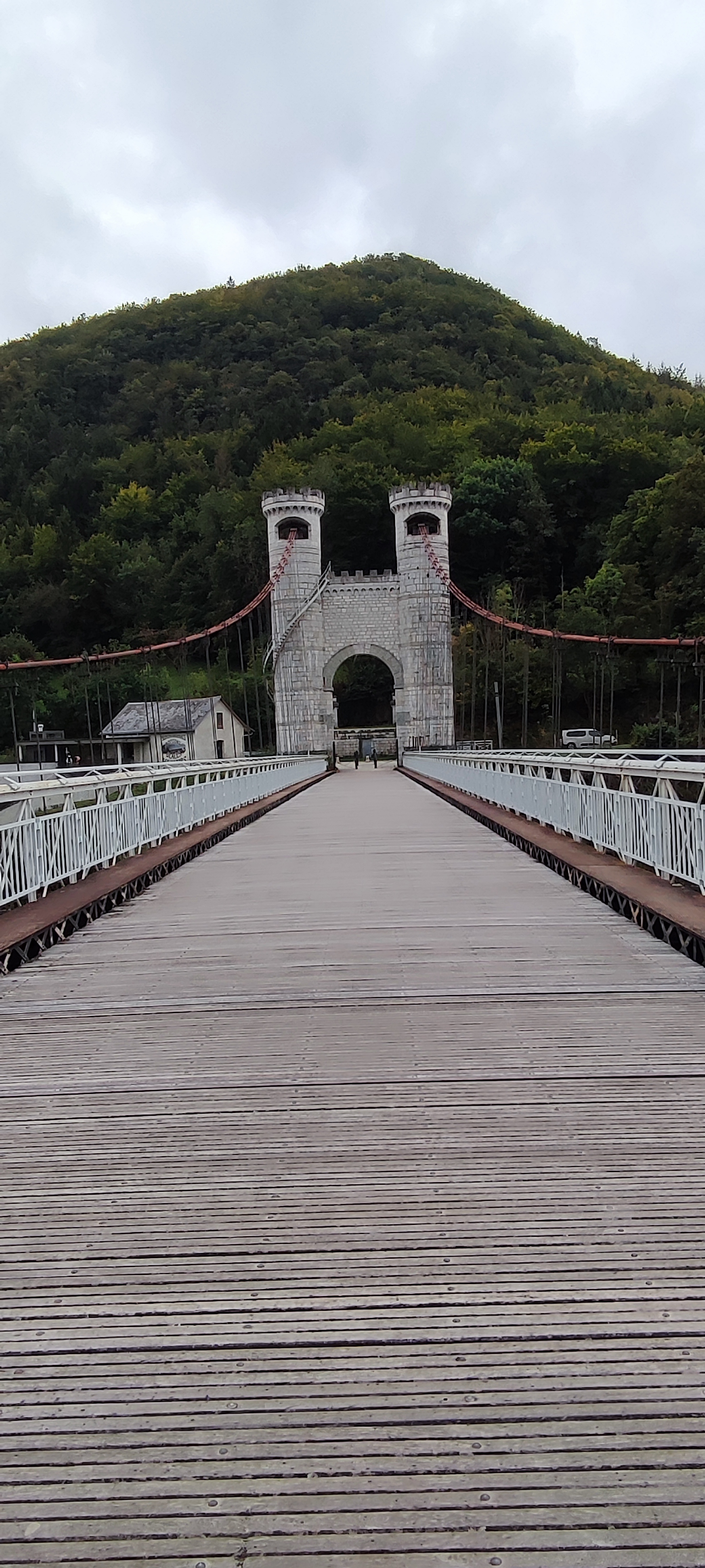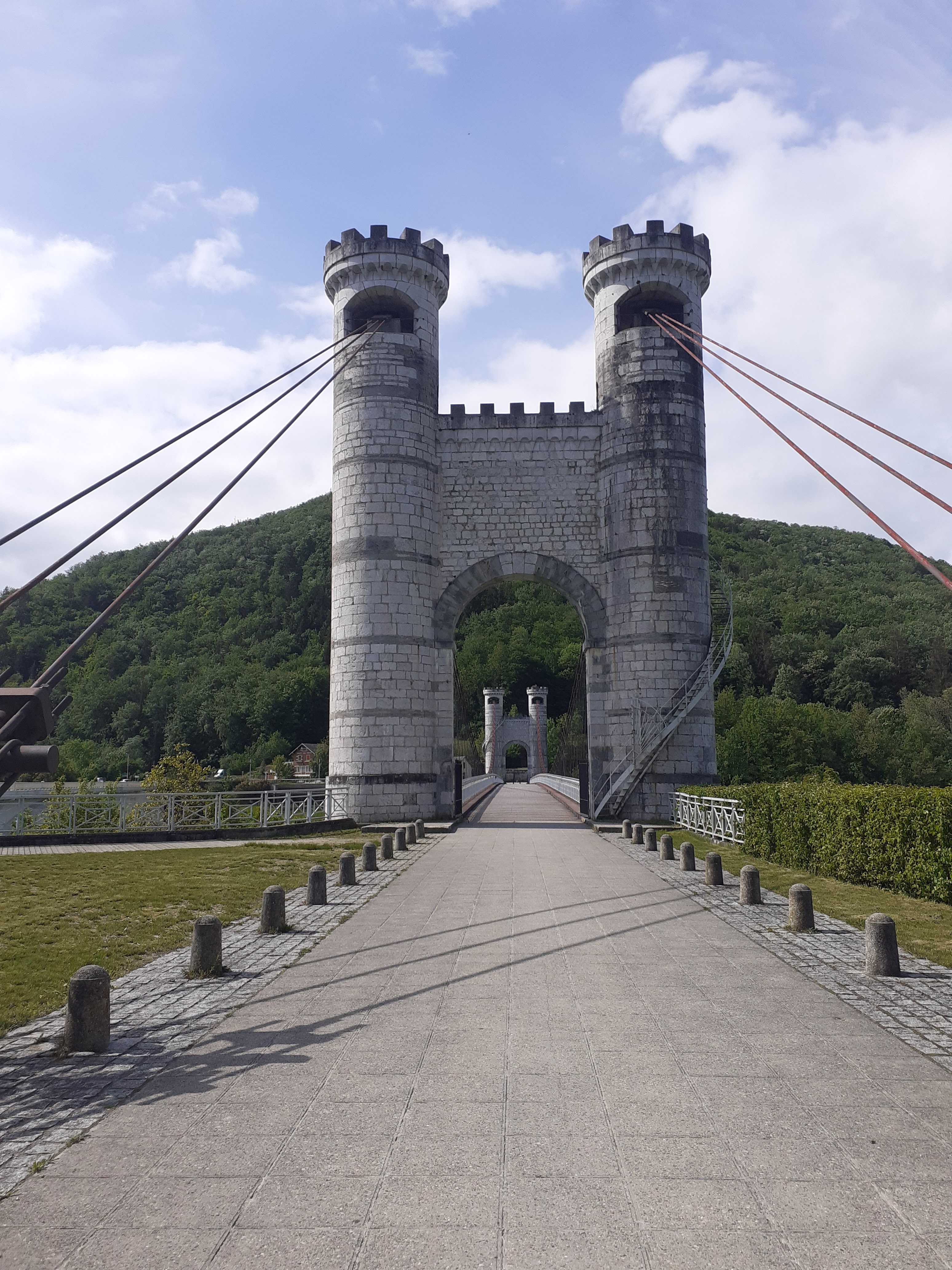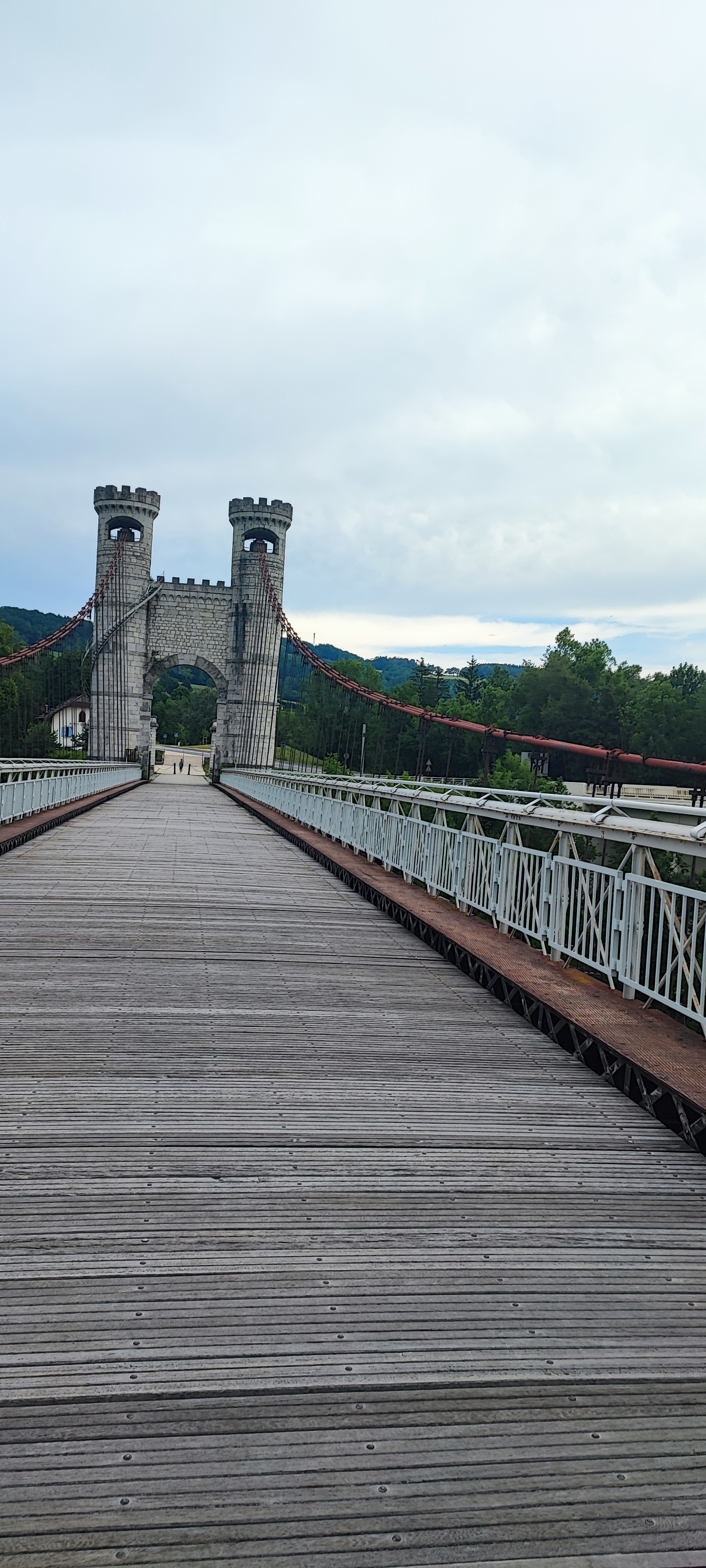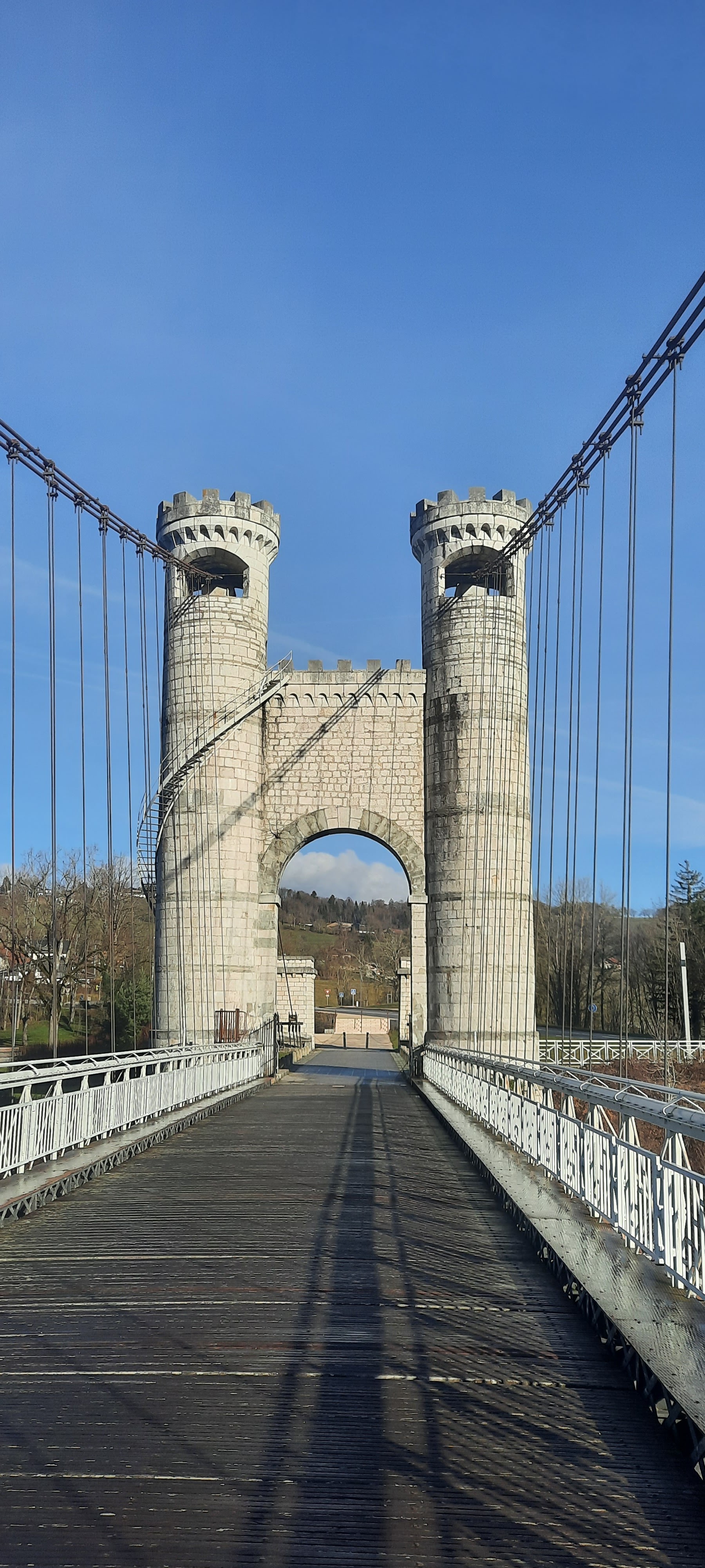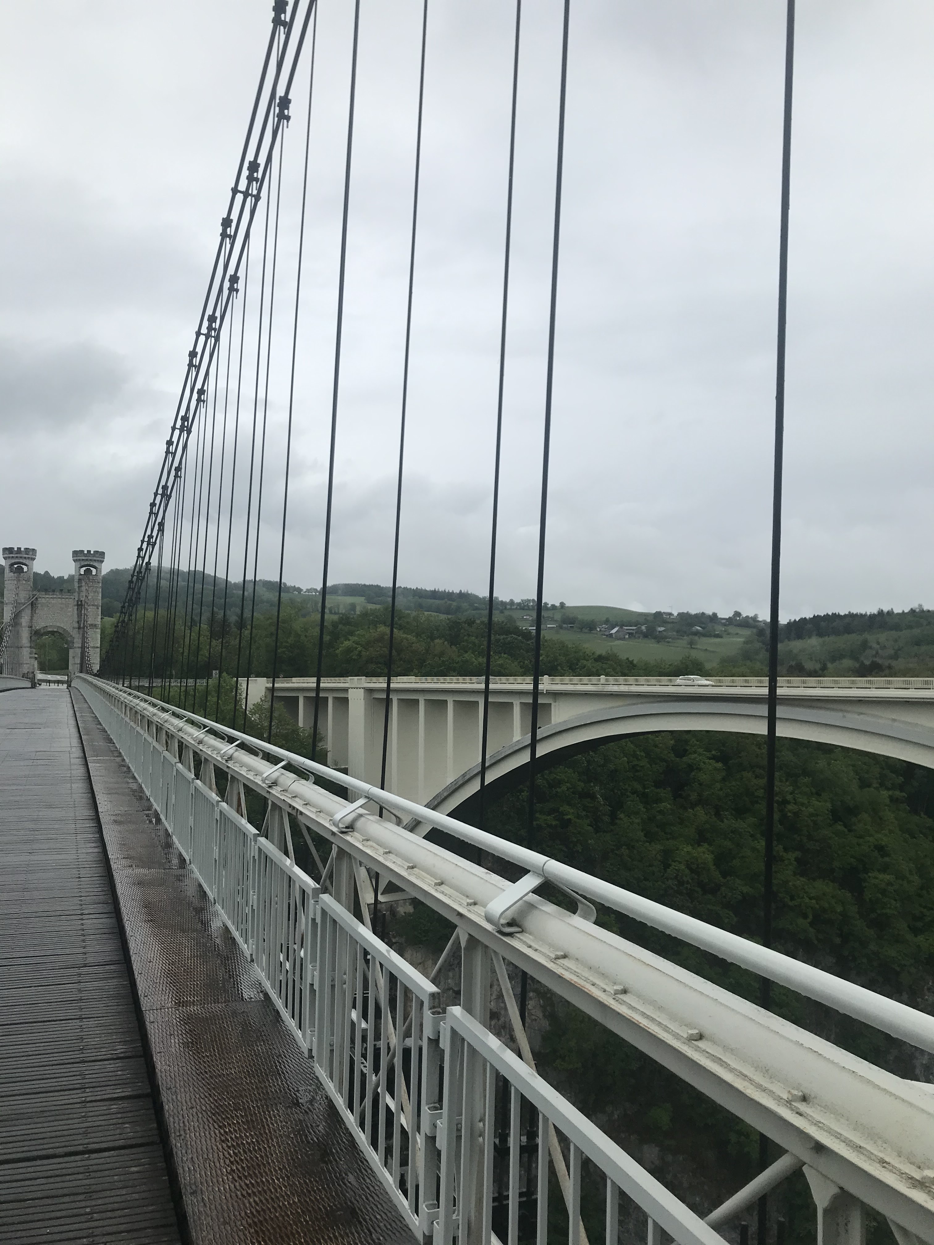 Spectaculaire pont suspendu en câble d'acier inscrit au titre des Monuments Historiques et c'est mérité. Il surplombe d'une belle hauteur une rivière. Le lieu est impressionnant avec toutes ces petites collines verdoyantes autour. Très belle réalisation avec des tours qui rappellent celles d'un château fort du moyen âge. Le panorama est magnifique.. À découvrir !