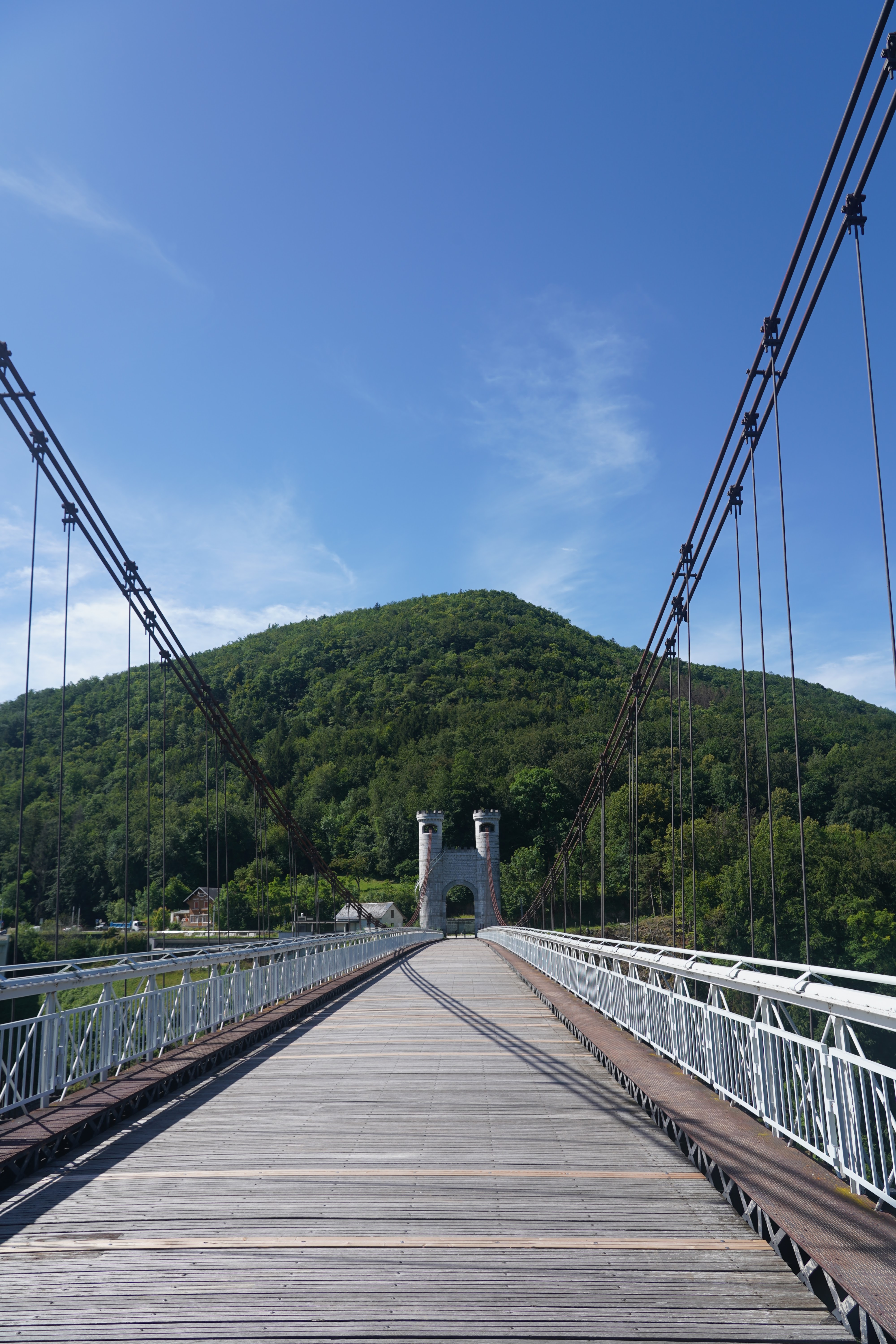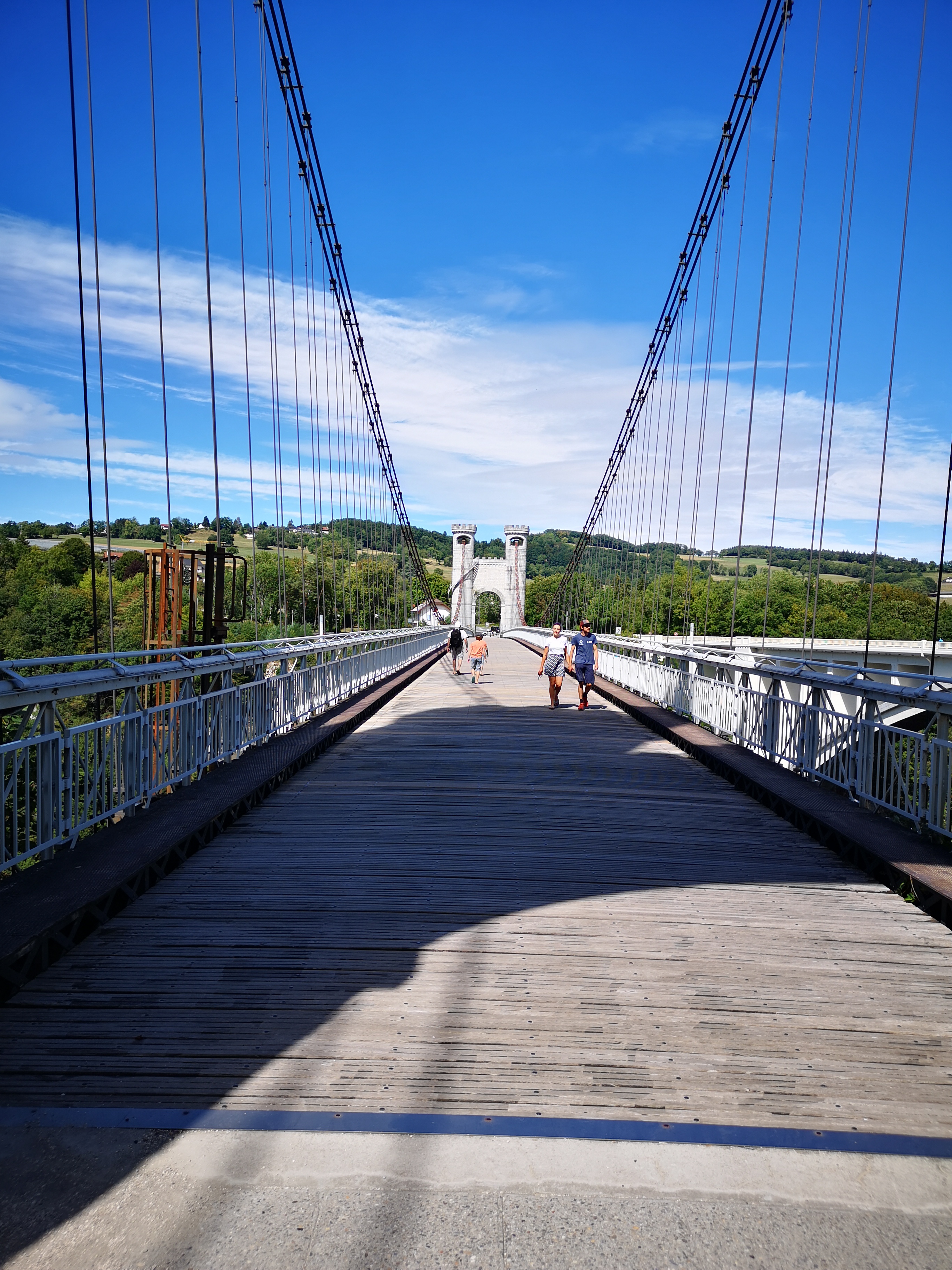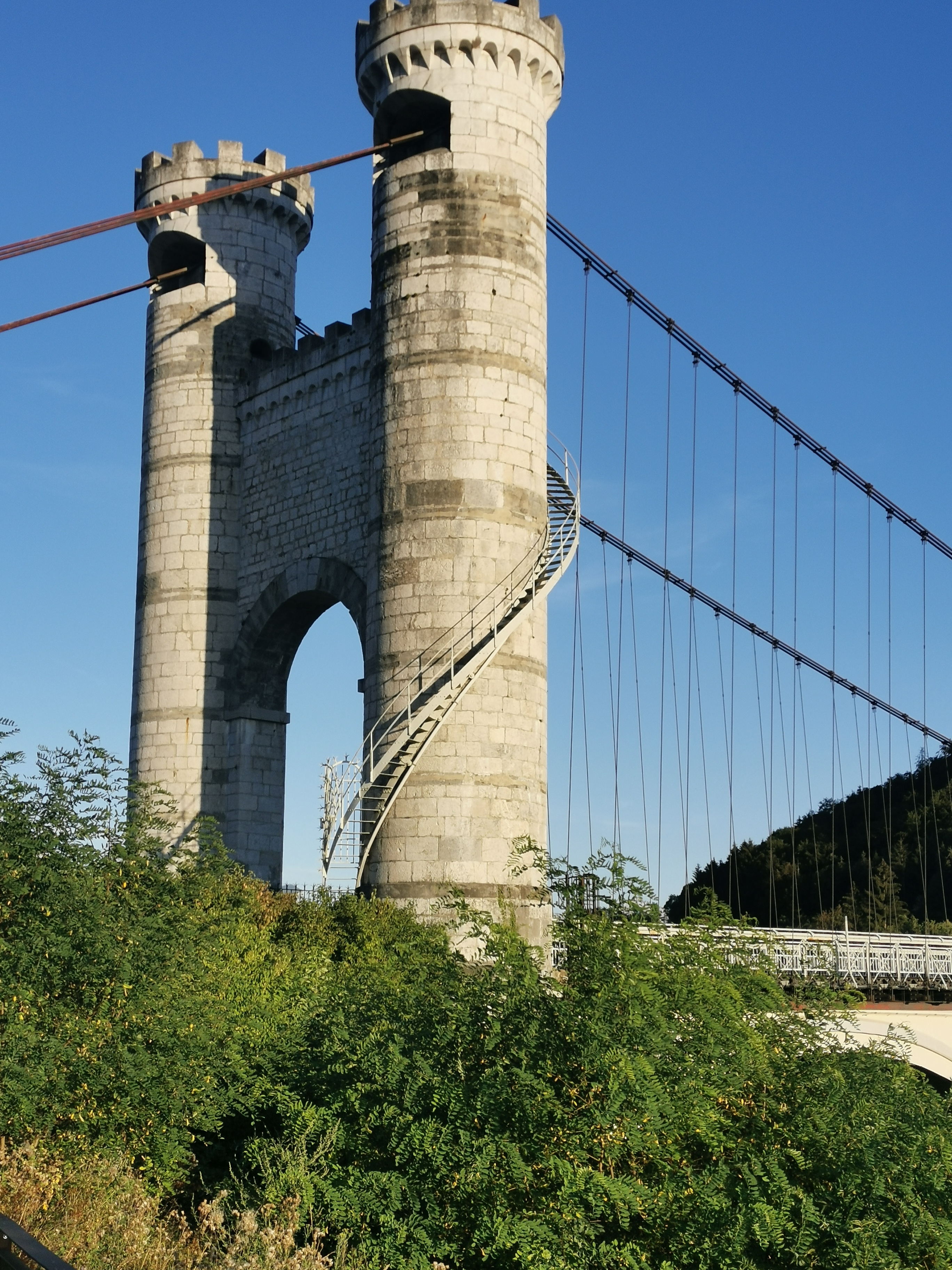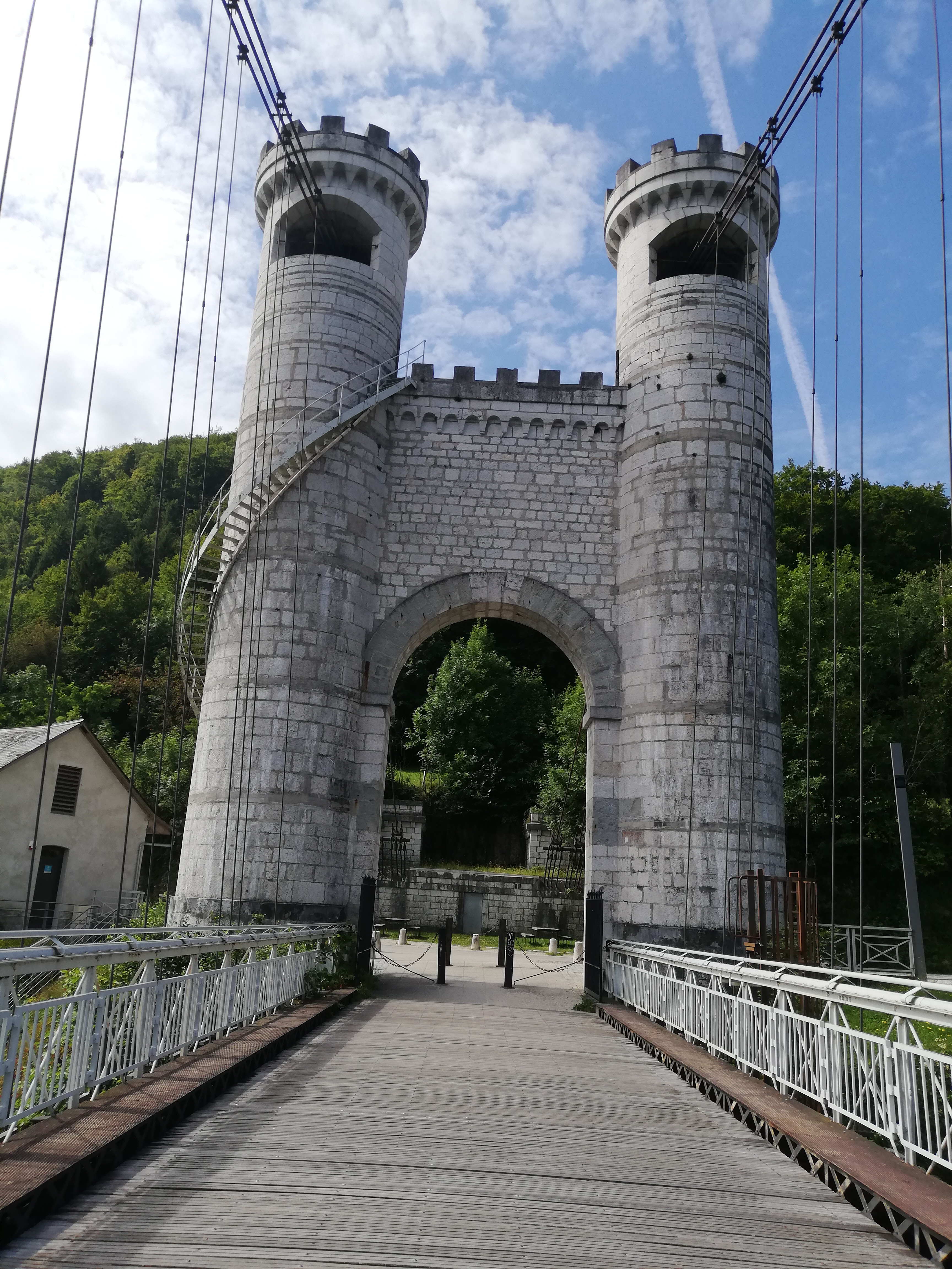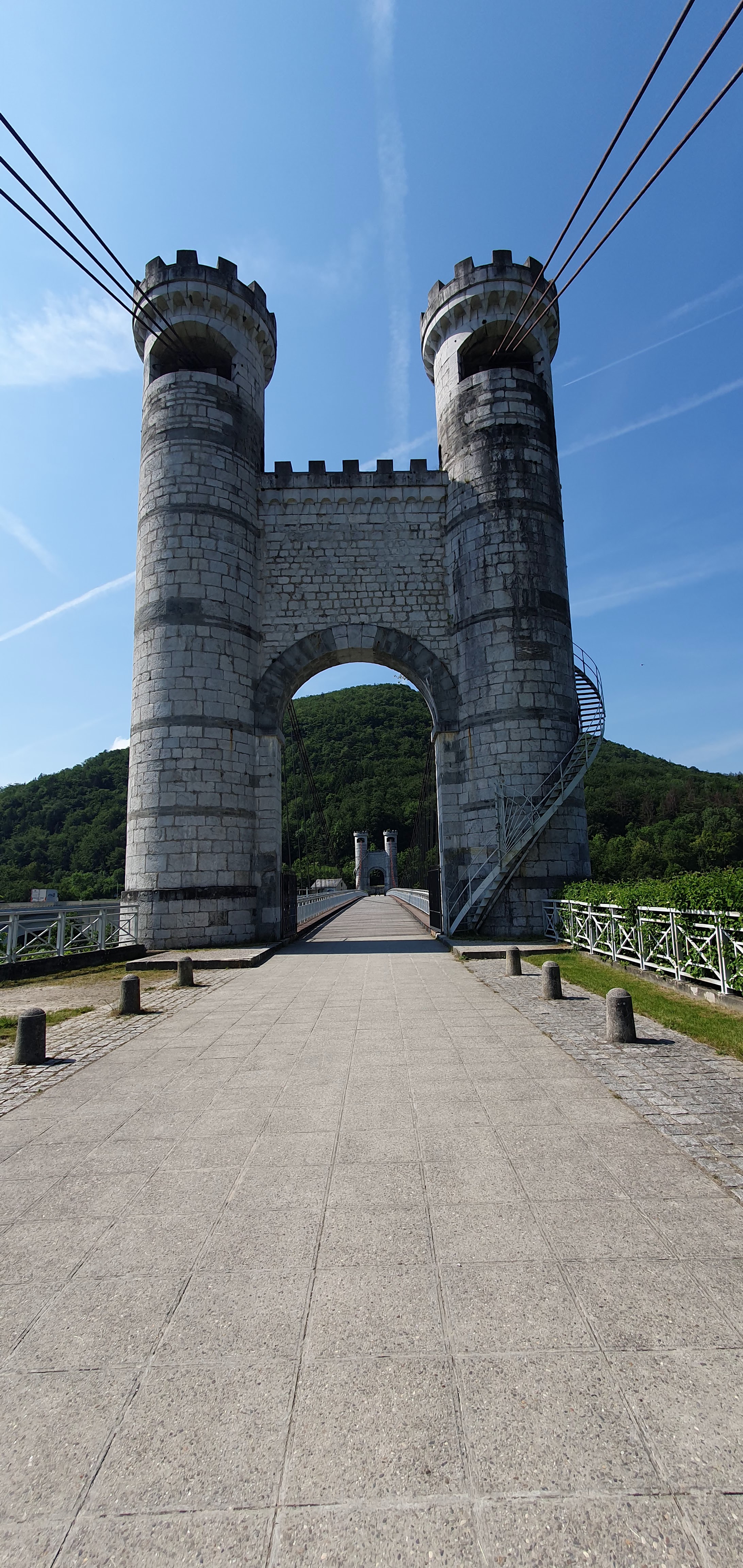 Spectaculaire pont suspendu en câble d'acier inscrit au titre des Monuments Historiques et c'est mérité. Il surplombe d'une belle hauteur une rivière. Le lieu est impressionnant avec toutes ces petites collines verdoyantes autour. Très belle réalisation avec des tours qui rappellent celles d'un château fort du moyen âge. Le panorama est magnifique.. À découvrir !