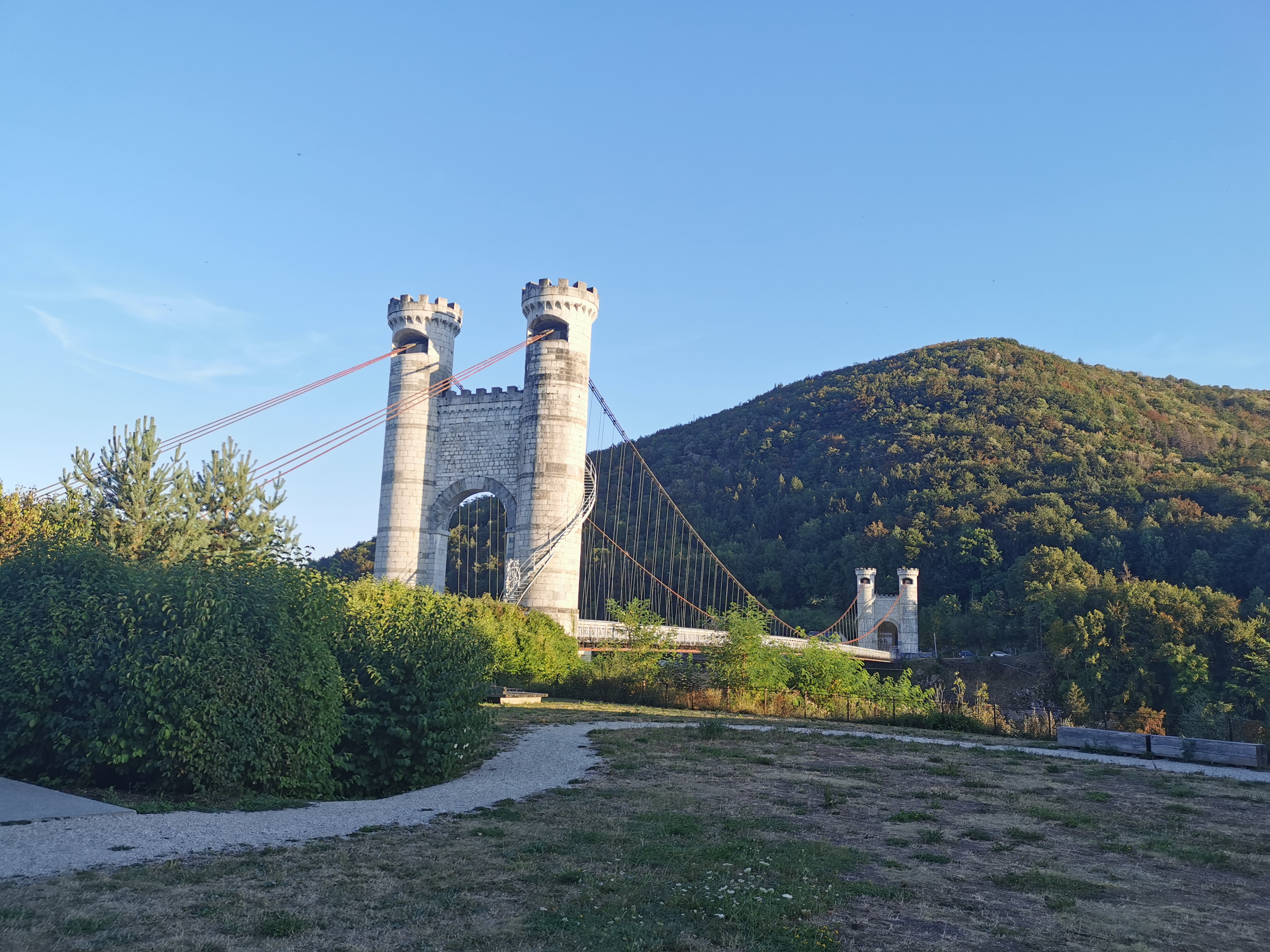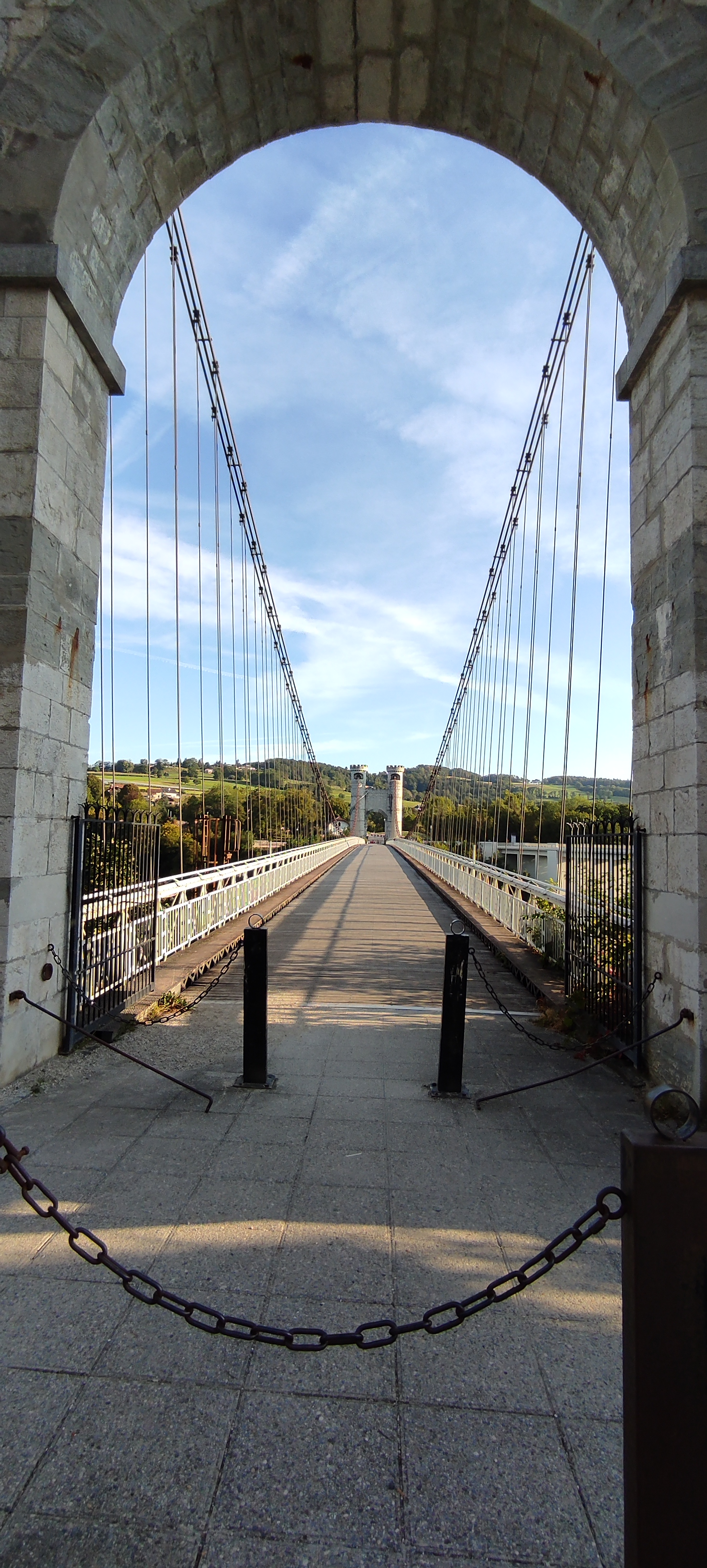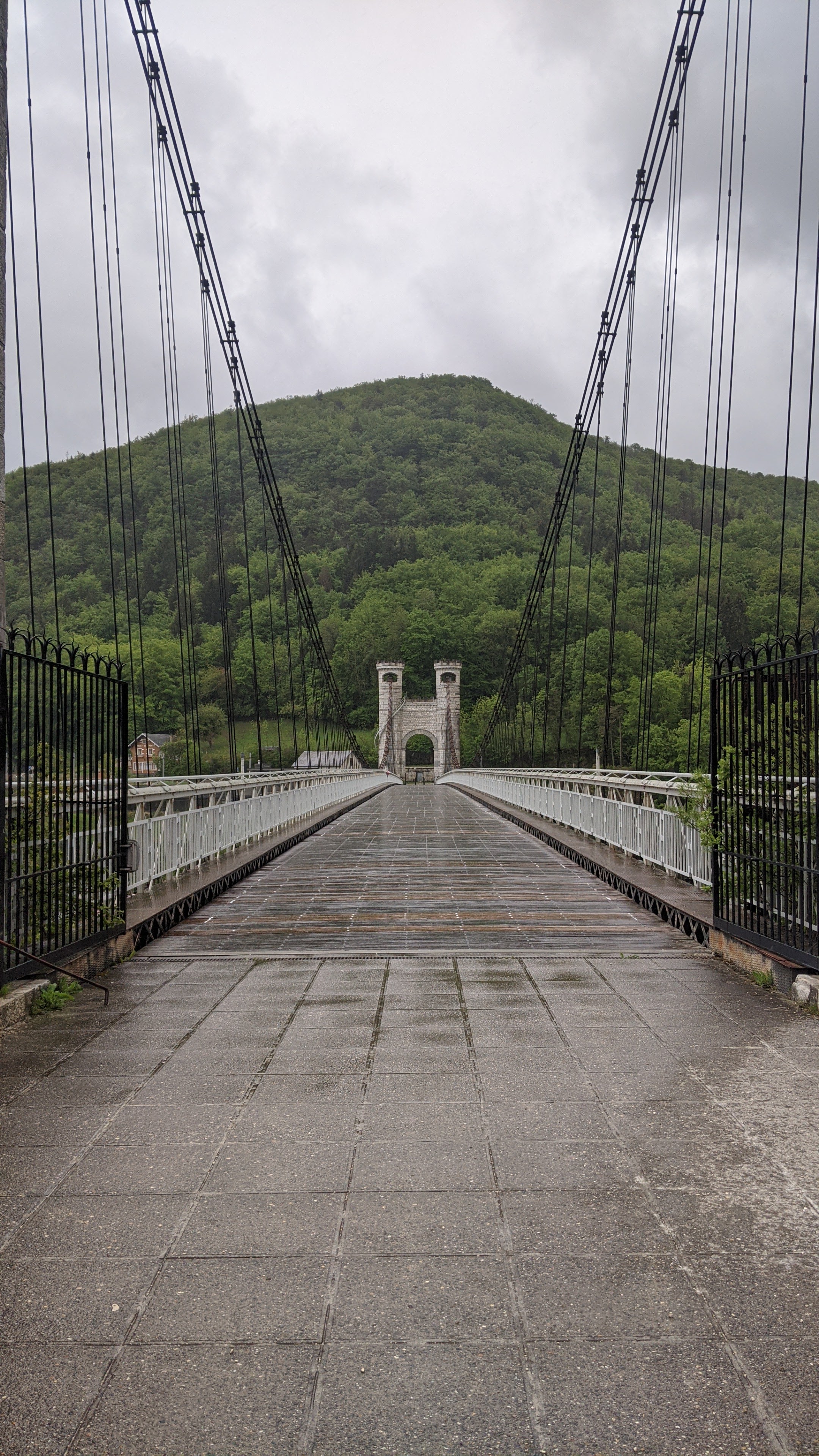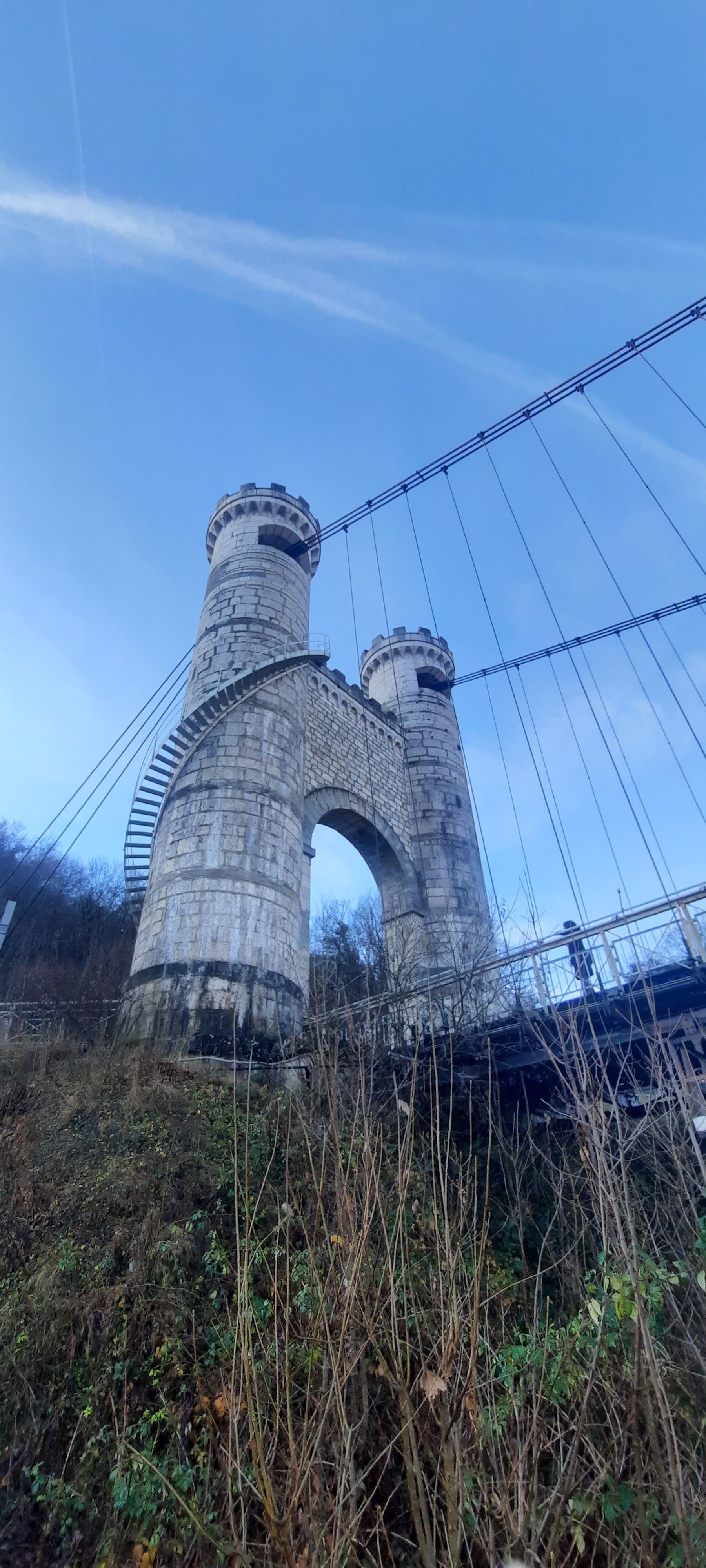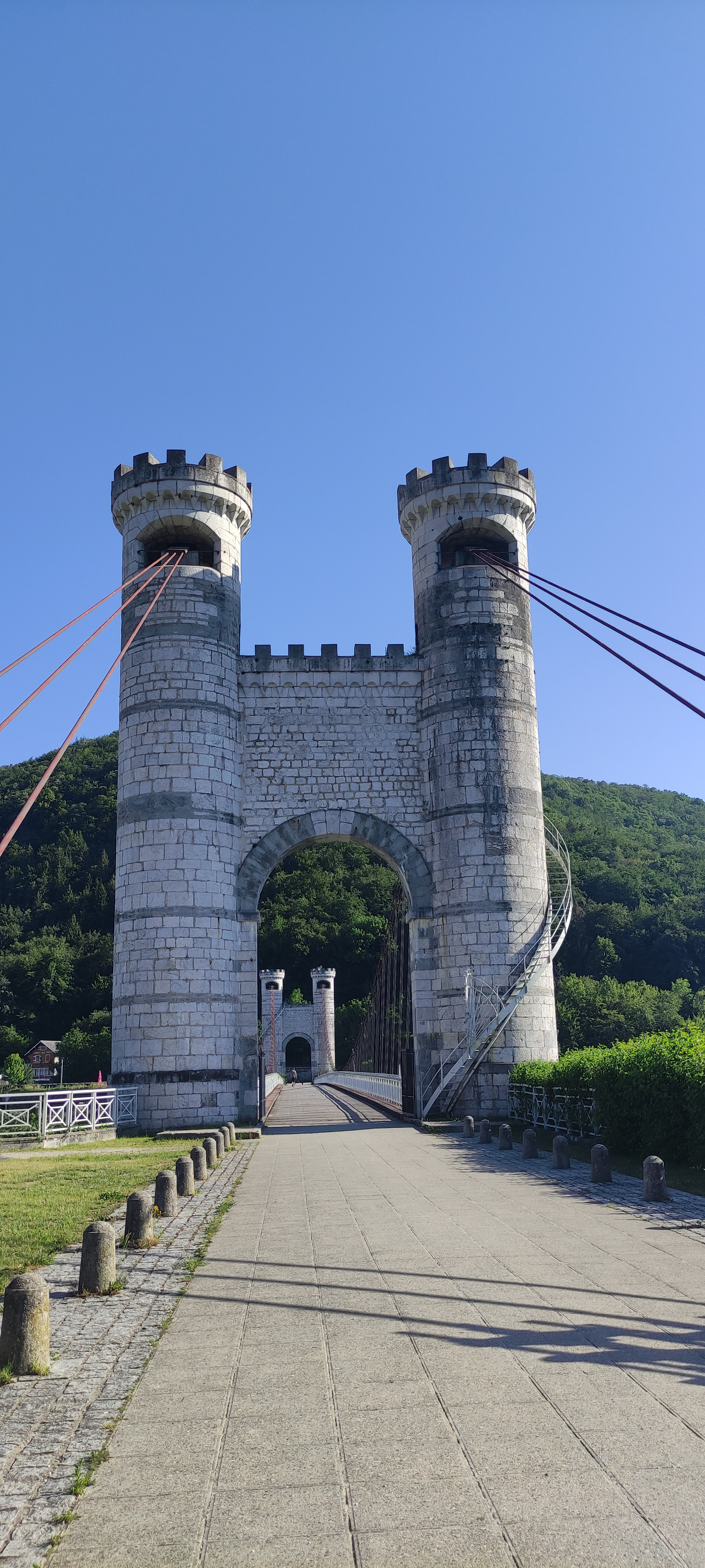 Spectaculaire pont suspendu en câble d'acier inscrit au titre des Monuments Historiques et c'est mérité. Il surplombe d'une belle hauteur une rivière. Le lieu est impressionnant avec toutes ces petites collines verdoyantes autour. Très belle réalisation avec des tours qui rappellent celles d'un château fort du moyen âge. Le panorama est magnifique.. À découvrir !