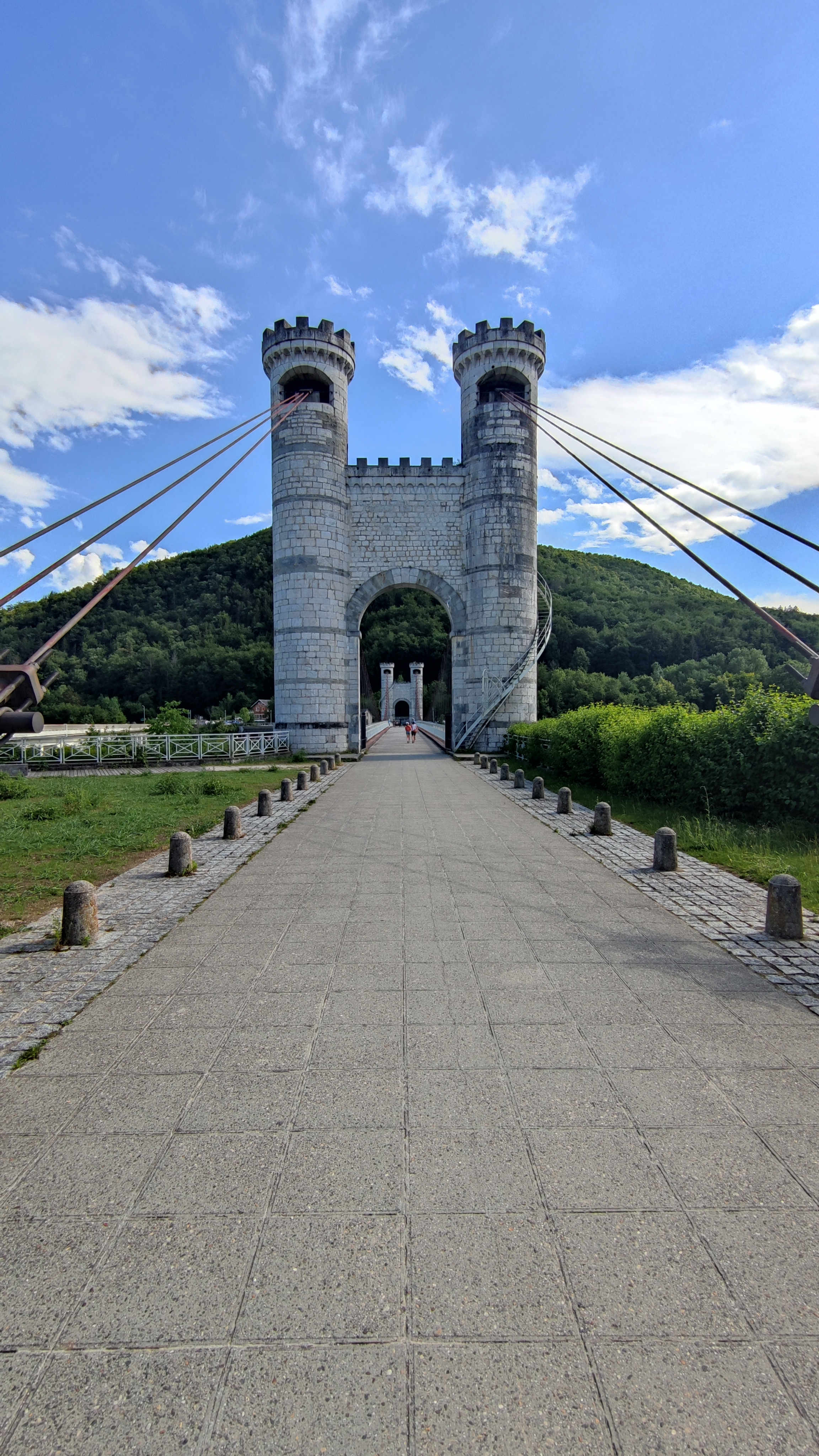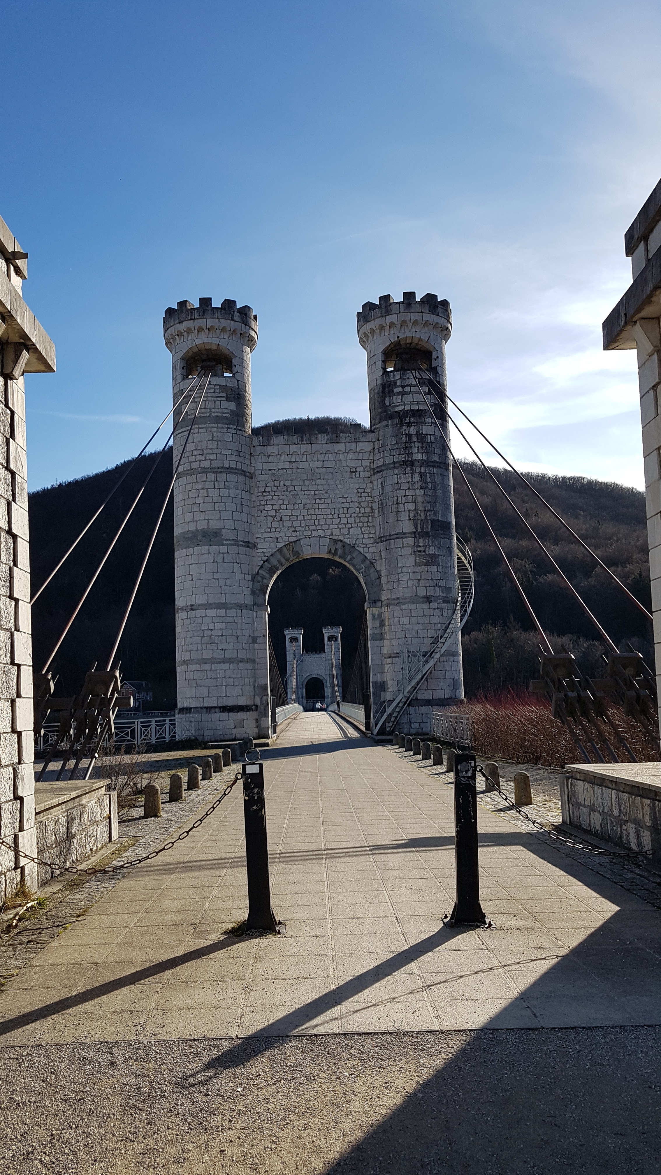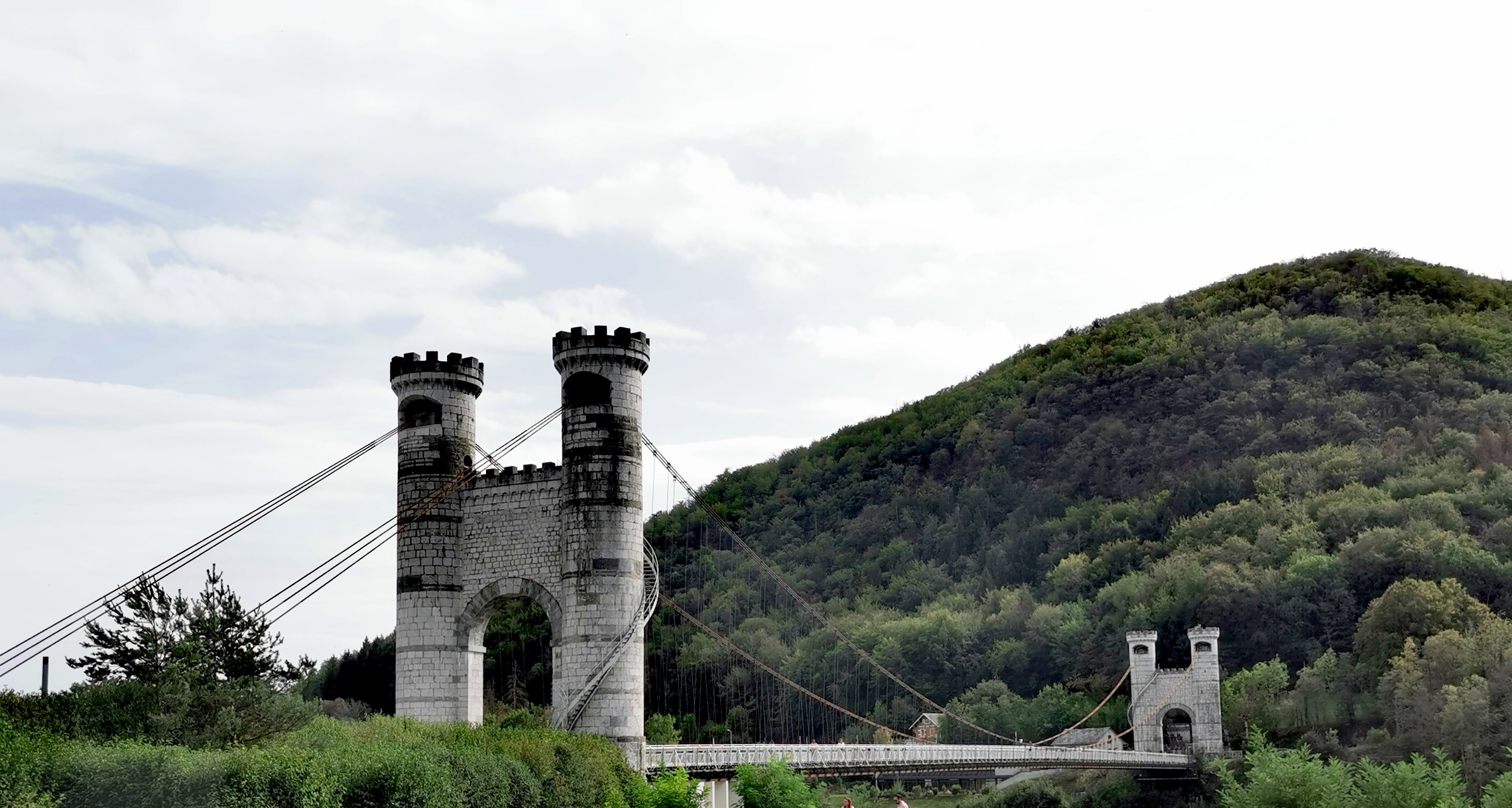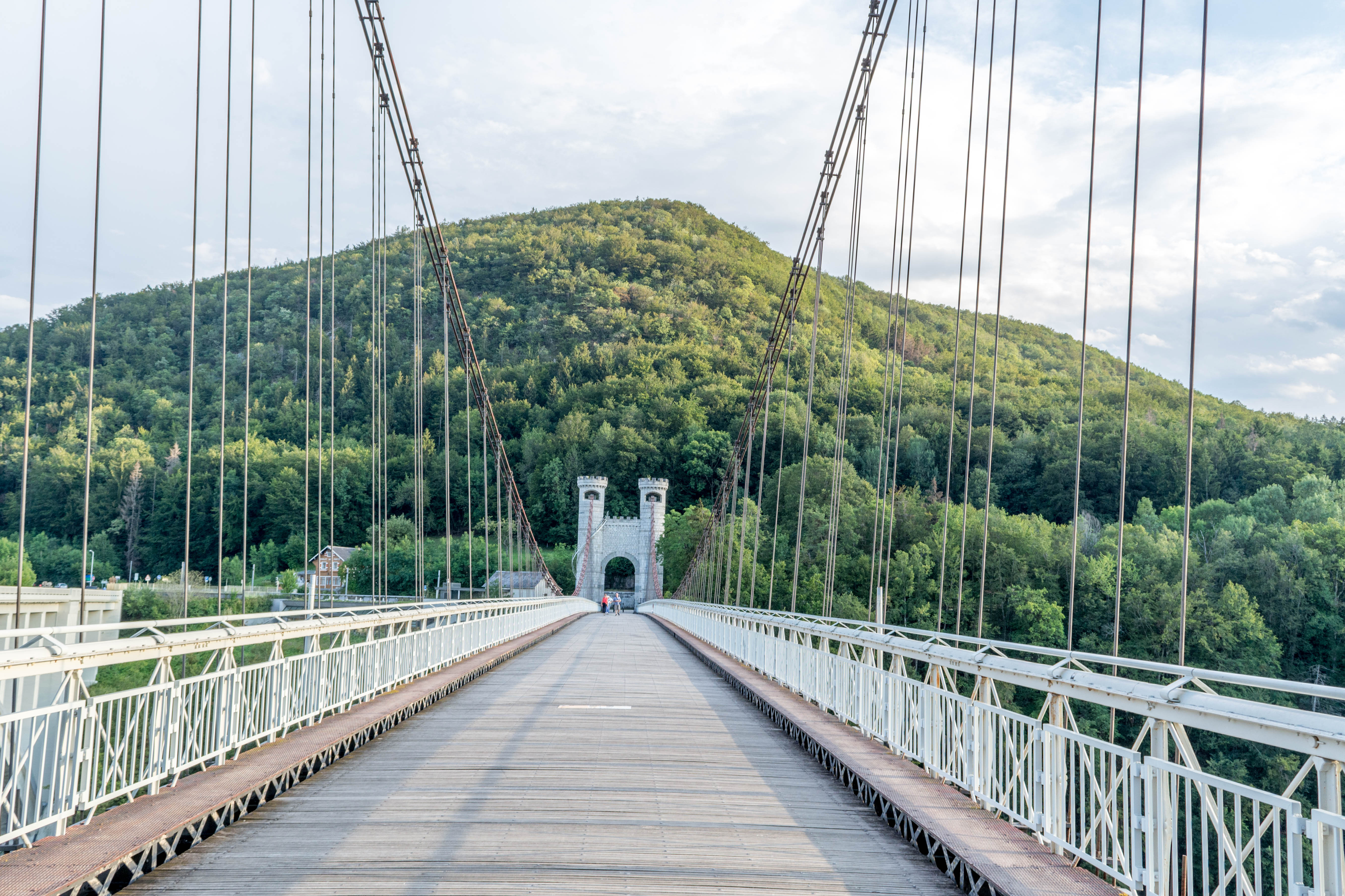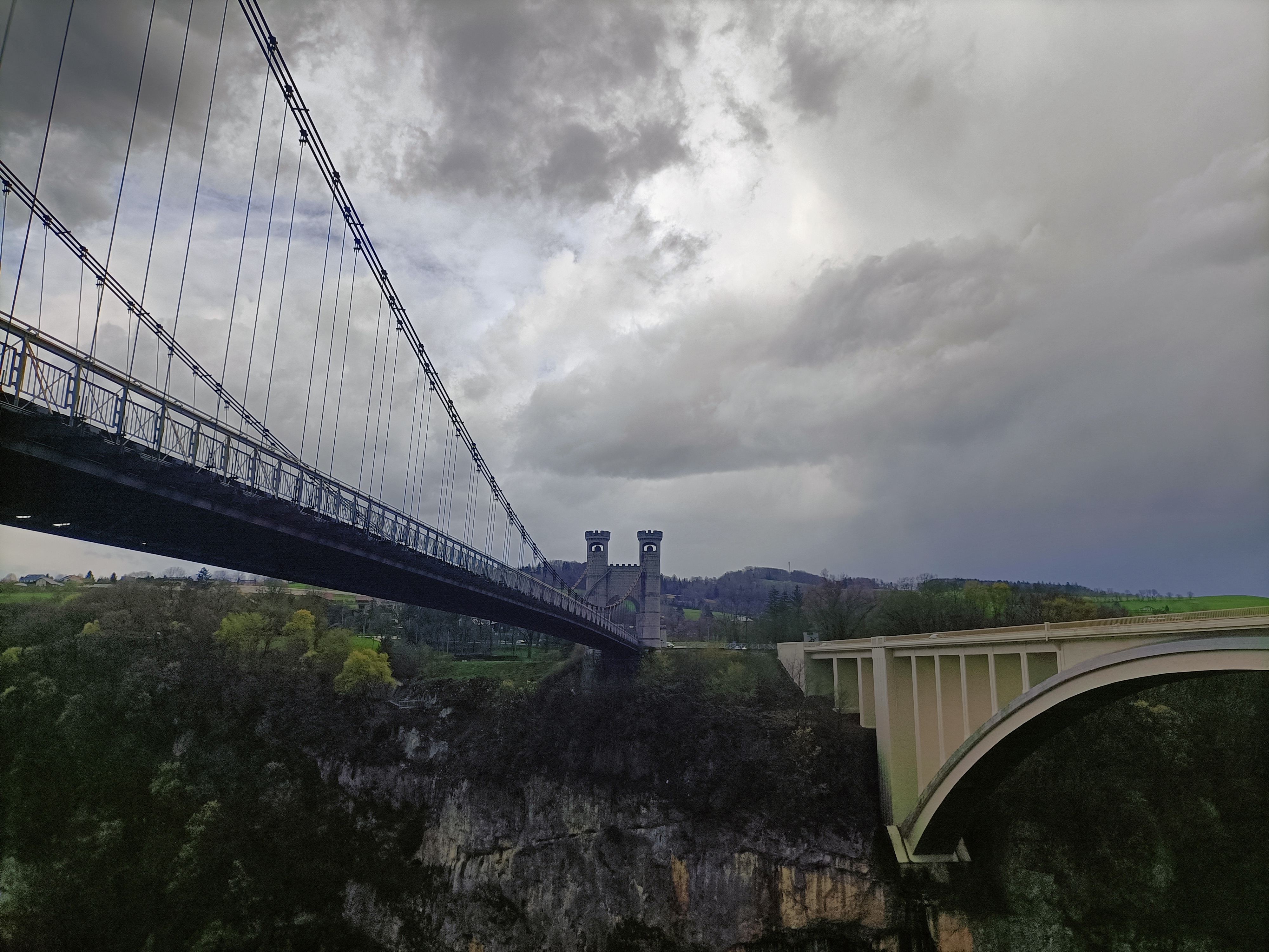 Spectaculaire pont suspendu en câble d'acier inscrit au titre des Monuments Historiques et c'est mérité. Il surplombe d'une belle hauteur une rivière. Le lieu est impressionnant avec toutes ces petites collines verdoyantes autour. Très belle réalisation avec des tours qui rappellent celles d'un château fort du moyen âge. Le panorama est magnifique.. À découvrir !