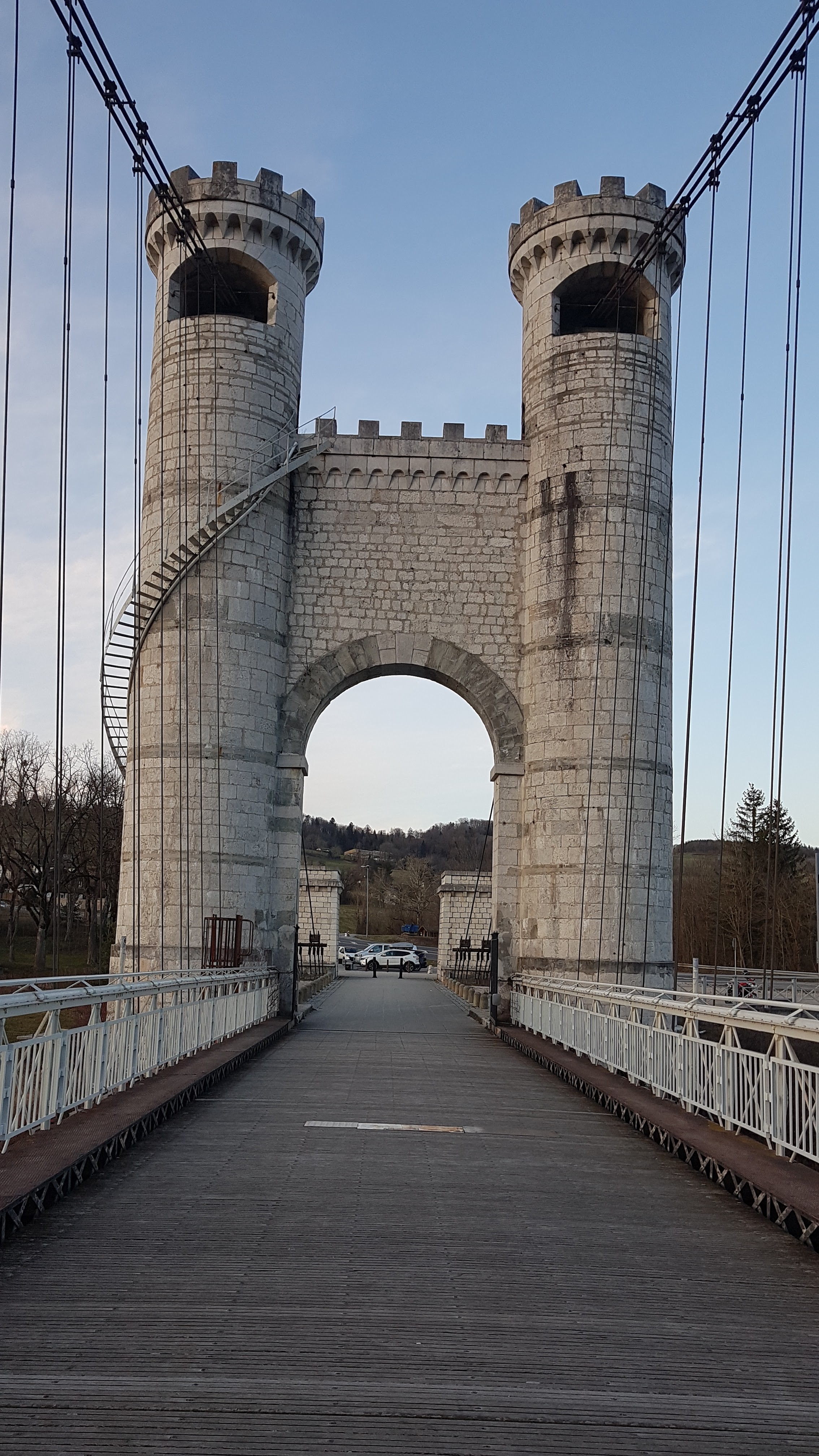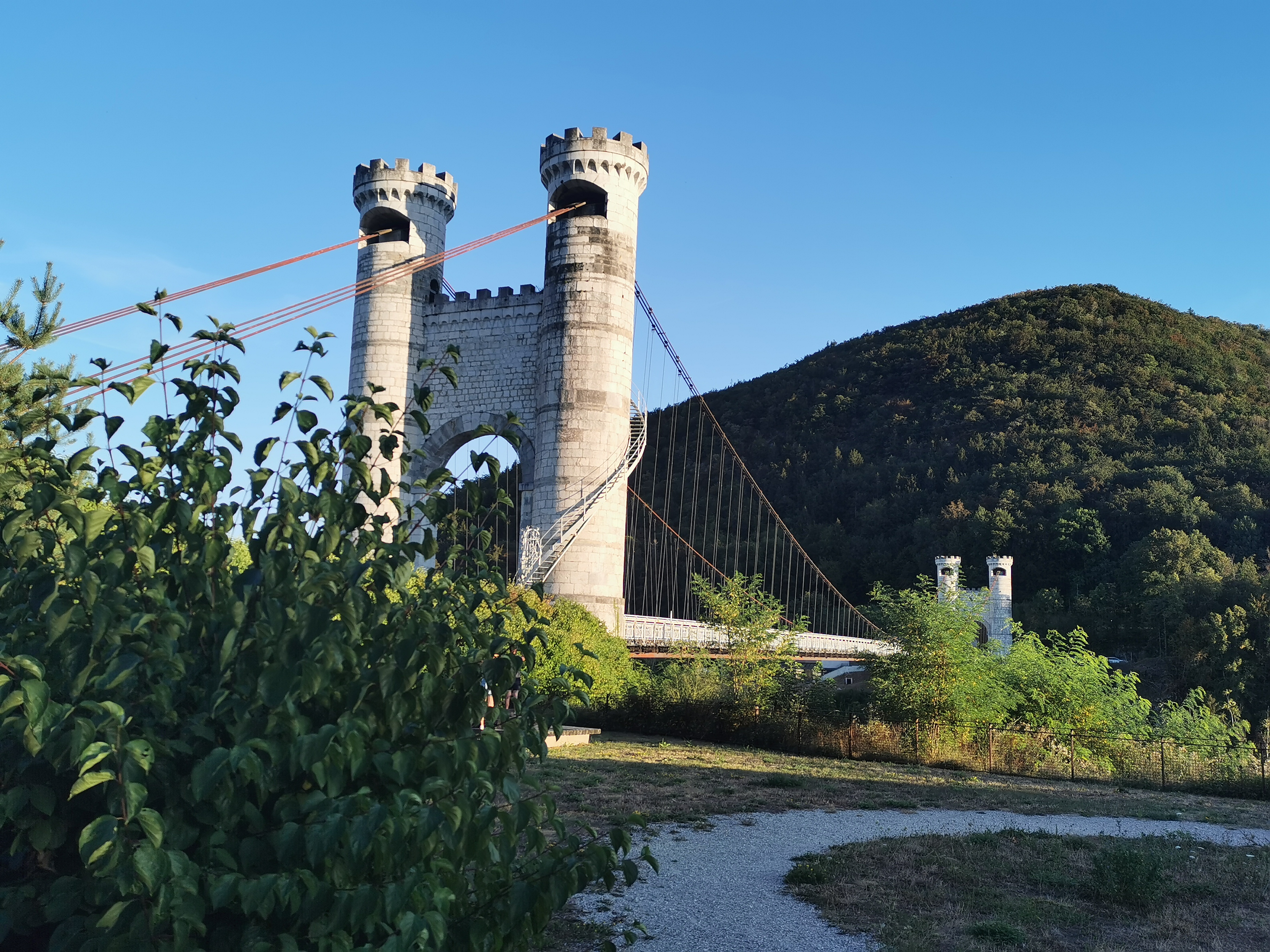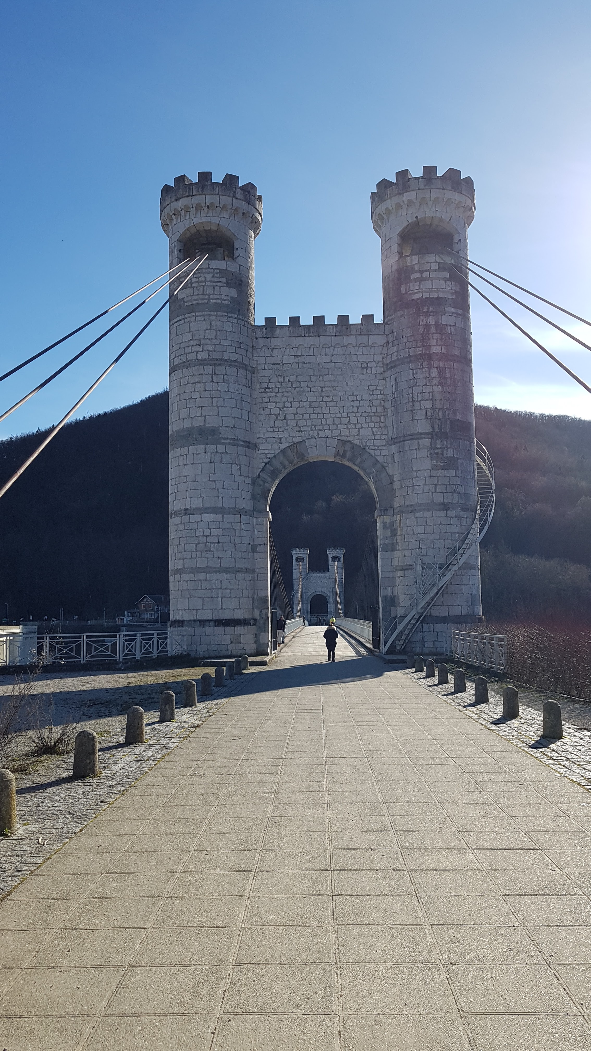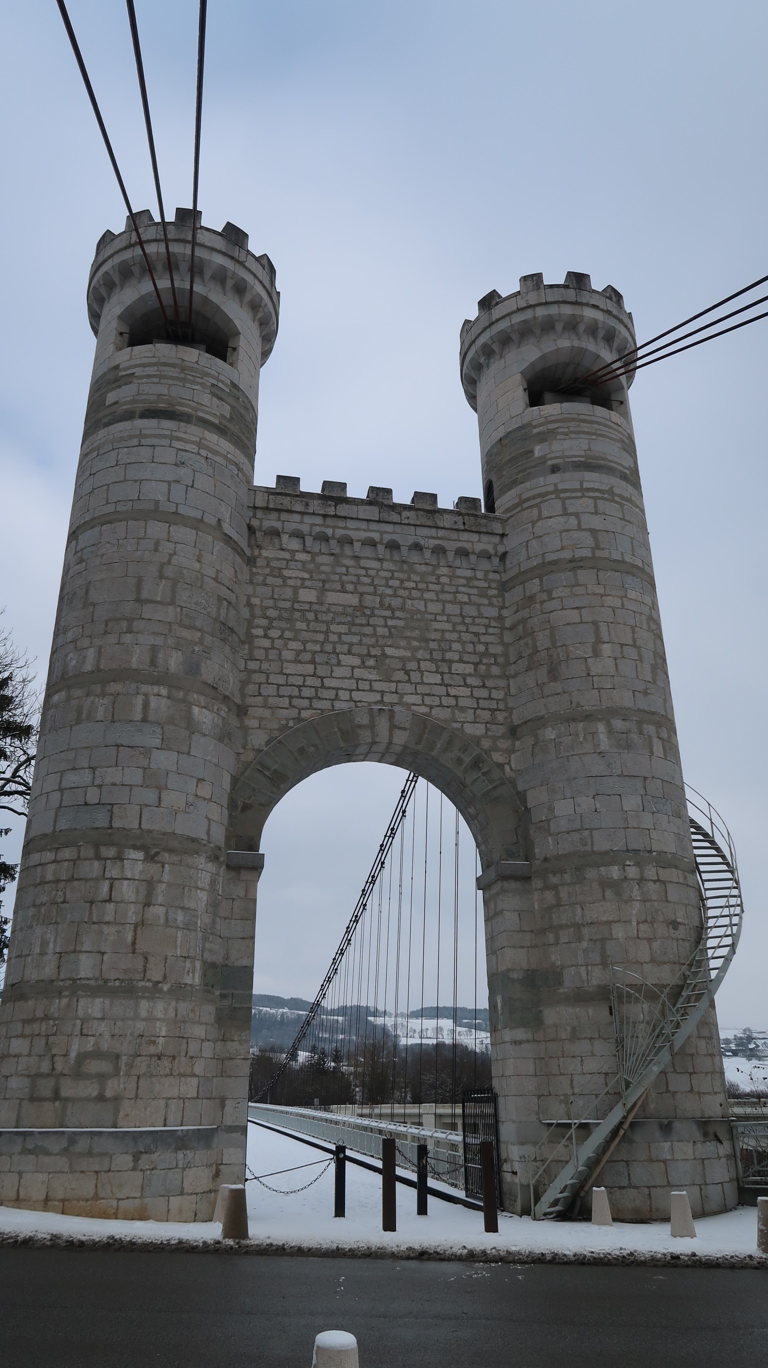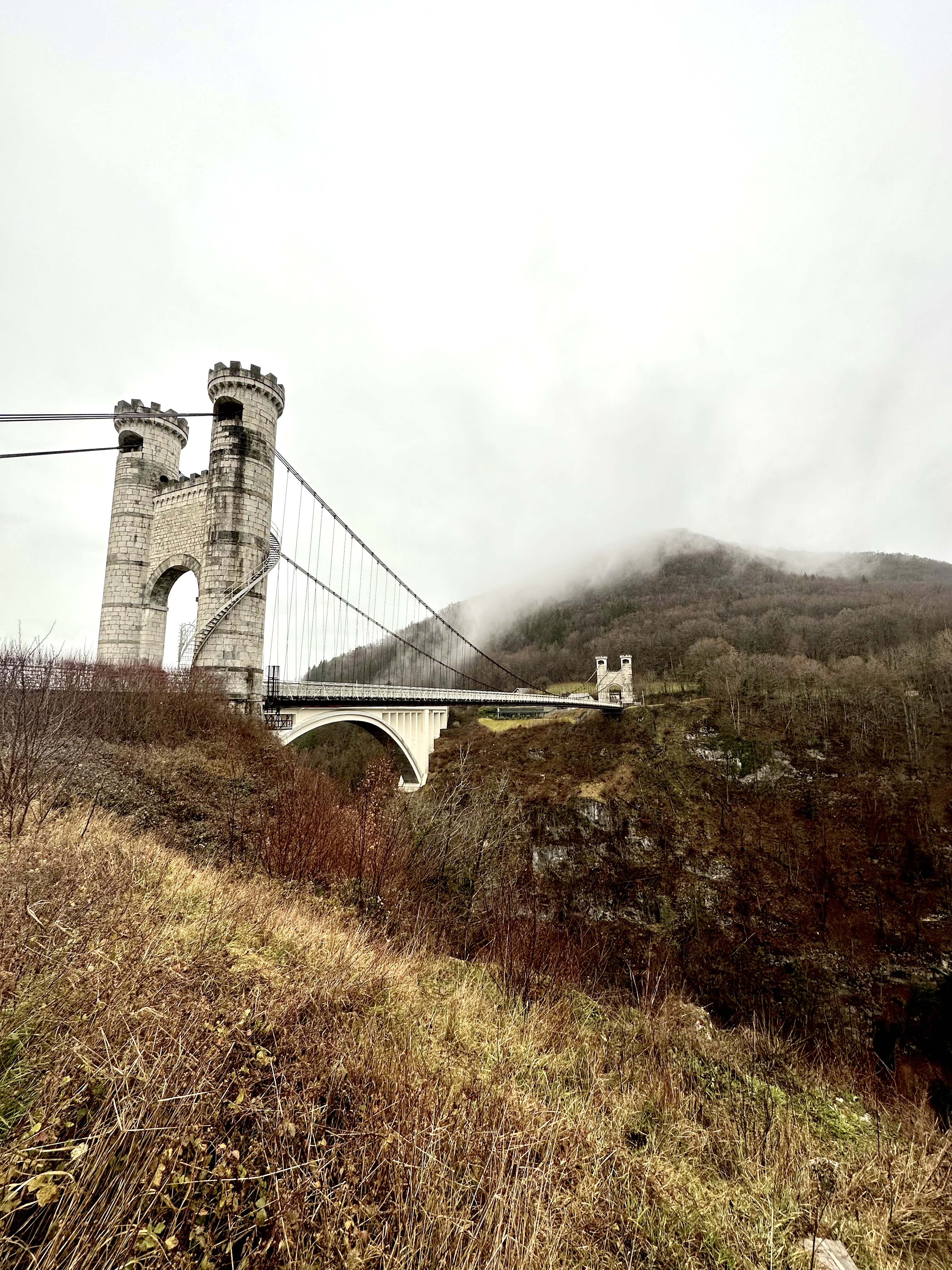 Spectaculaire pont suspendu en câble d'acier inscrit au titre des Monuments Historiques et c'est mérité. Il surplombe d'une belle hauteur une rivière. Le lieu est impressionnant avec toutes ces petites collines verdoyantes autour. Très belle réalisation avec des tours qui rappellent celles d'un château fort du moyen âge. Le panorama est magnifique.. À découvrir !