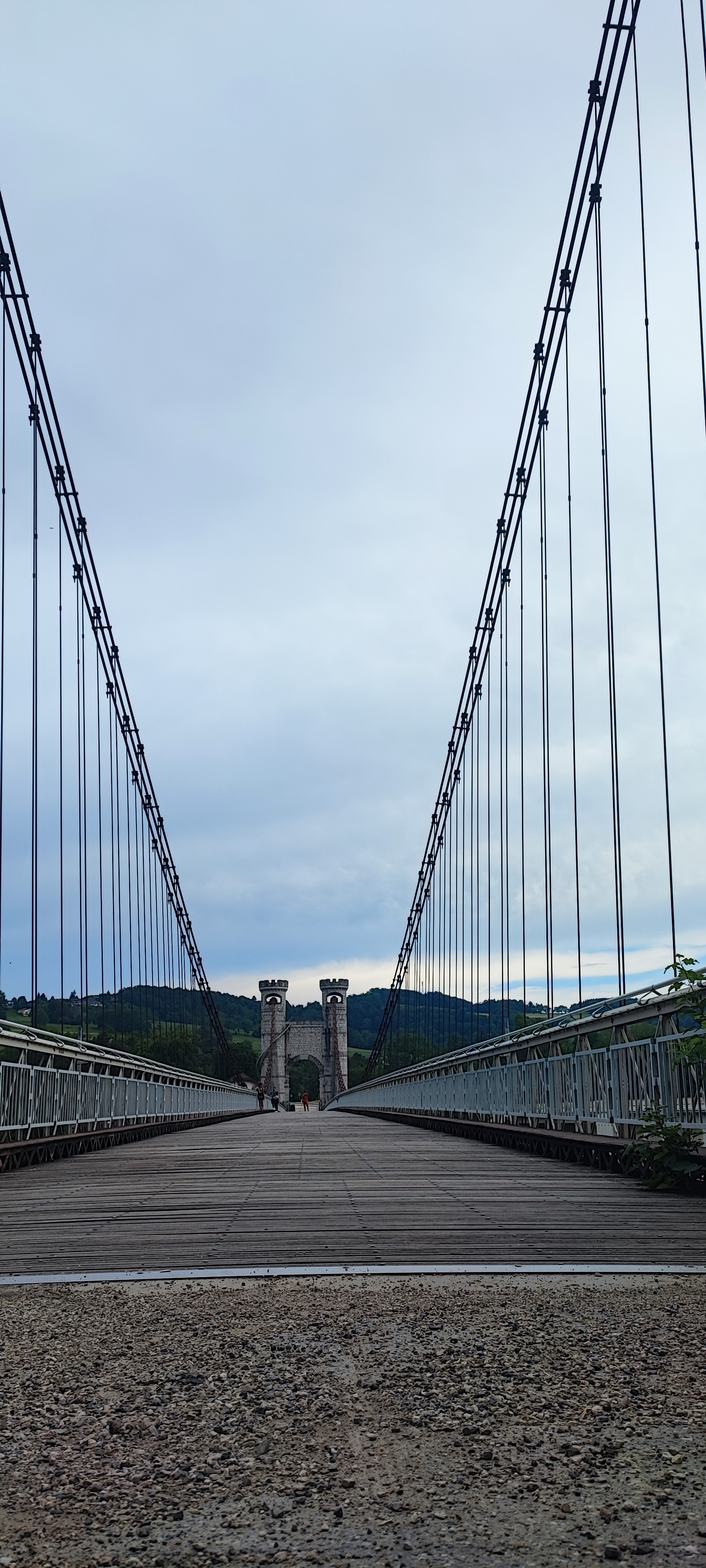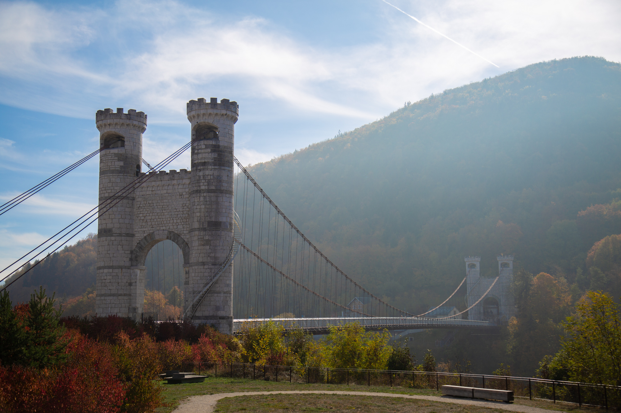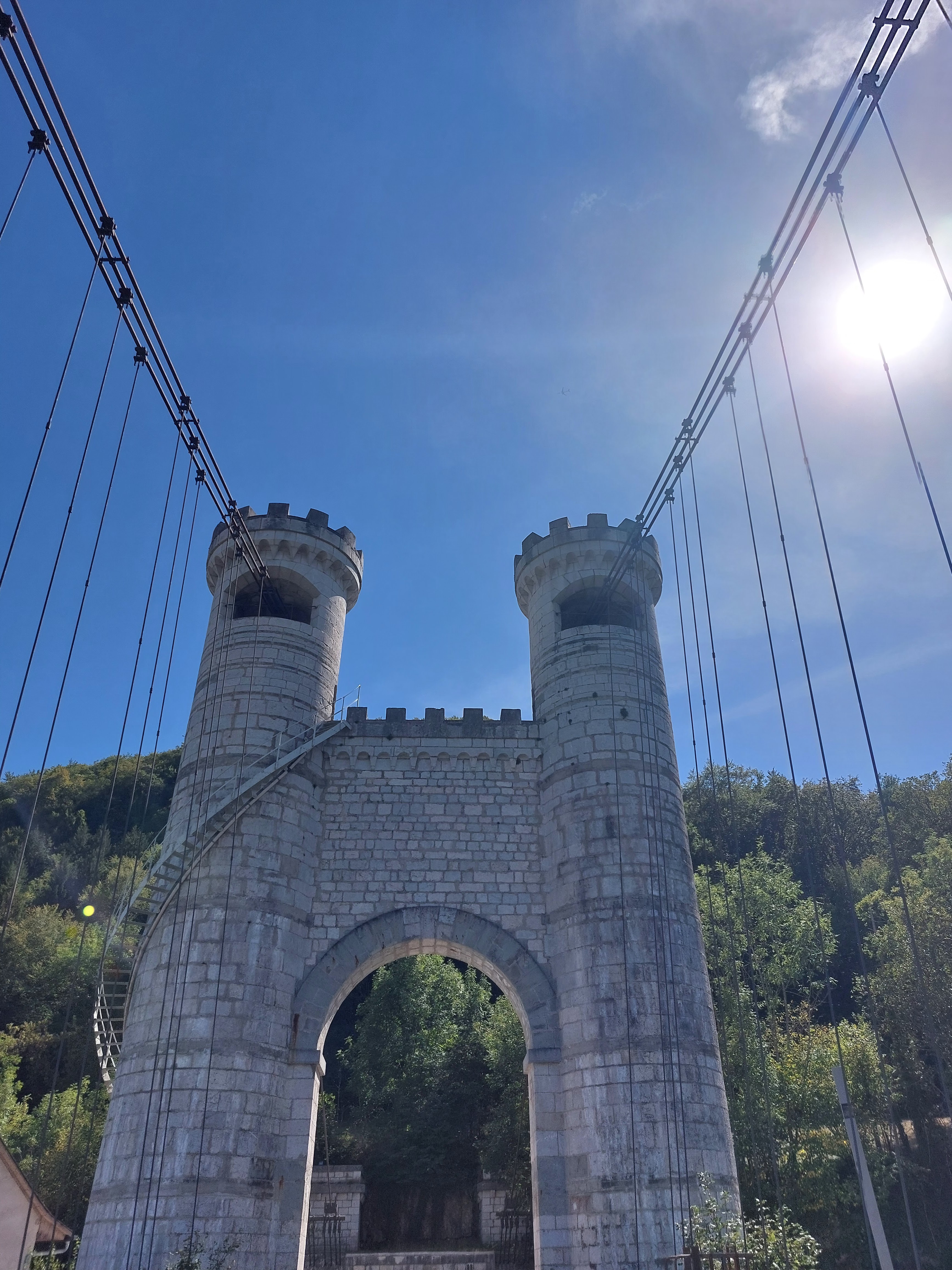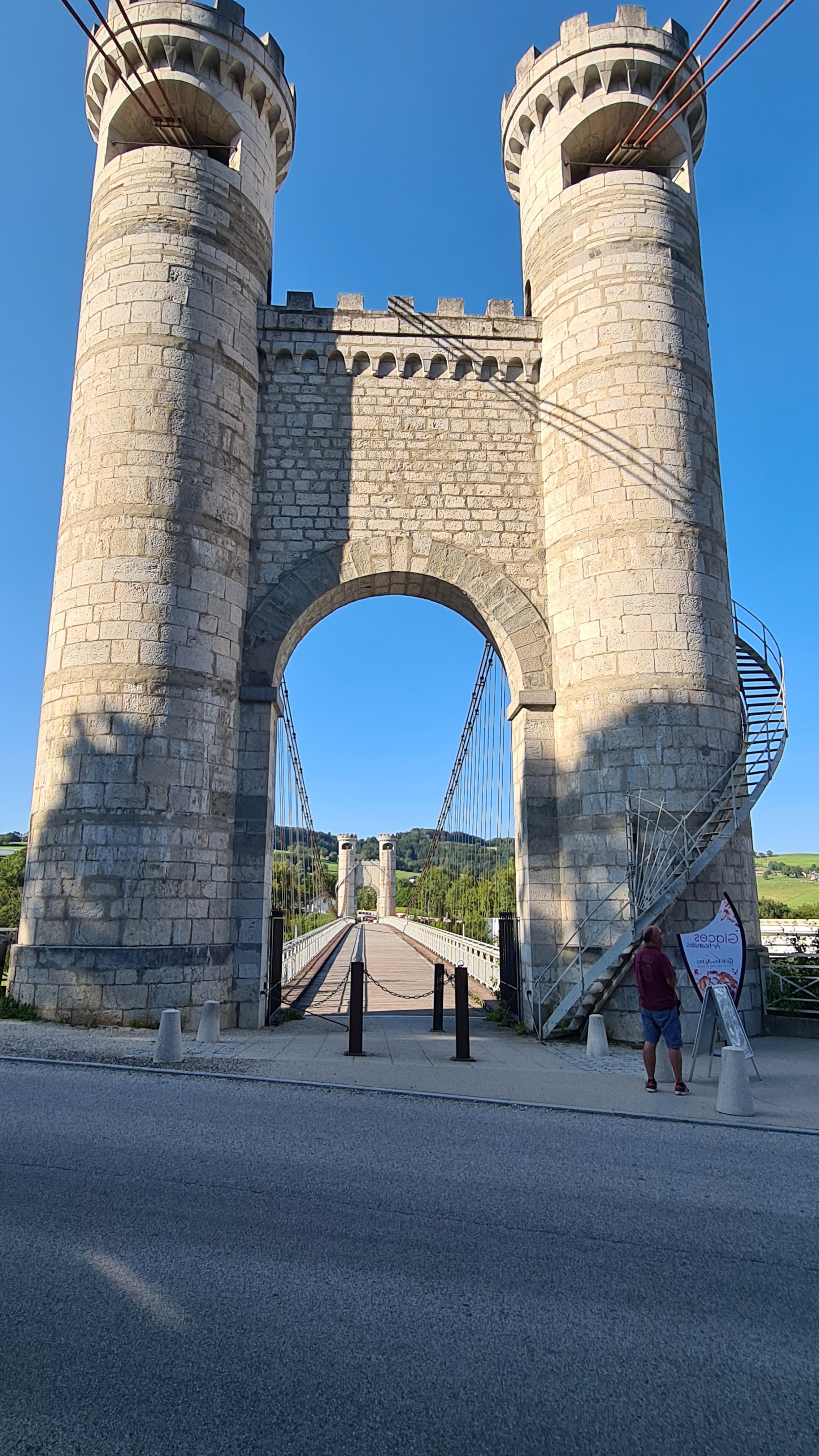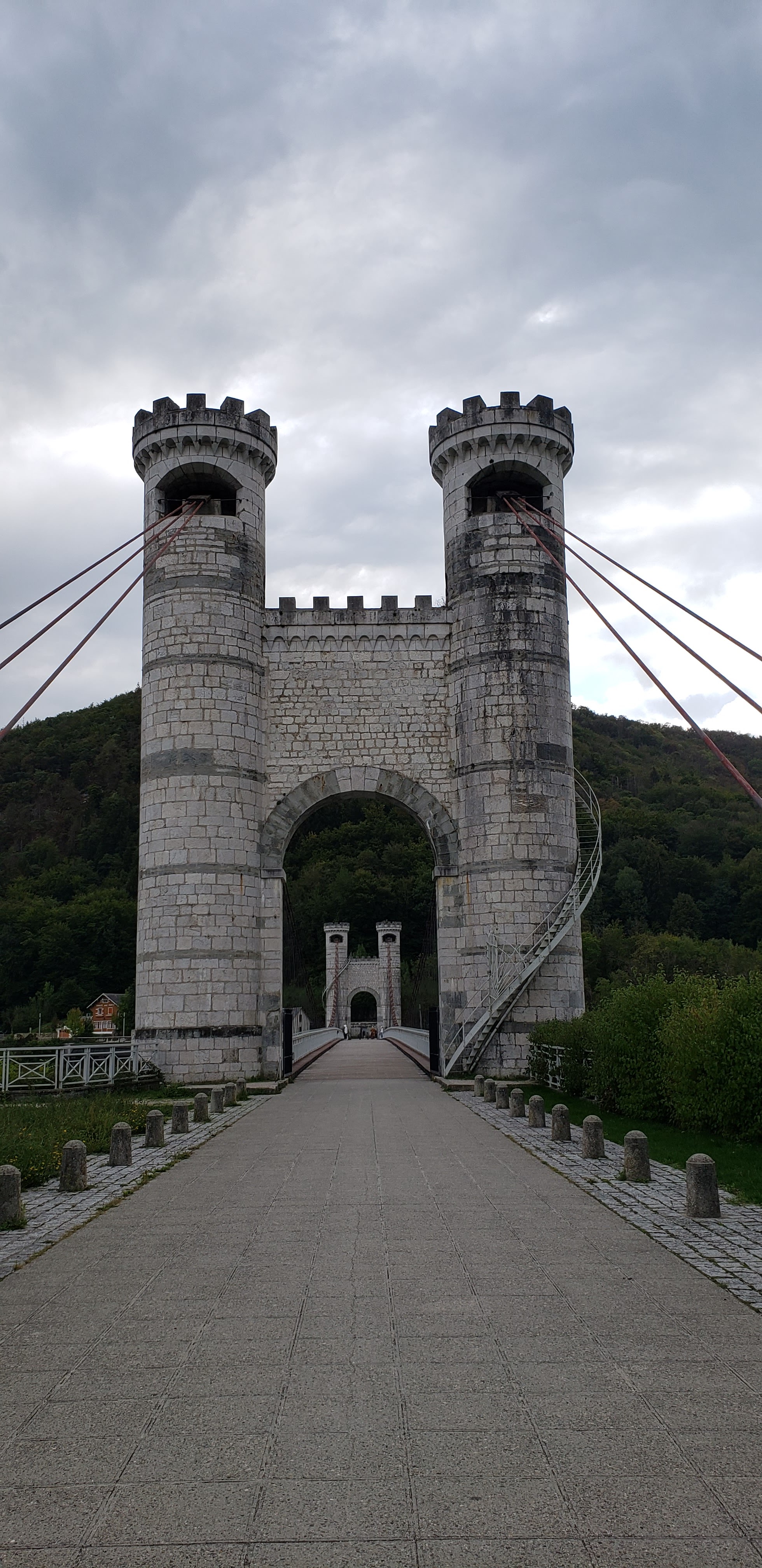 Spectaculaire pont suspendu en câble d'acier inscrit au titre des Monuments Historiques et c'est mérité. Il surplombe d'une belle hauteur une rivière. Le lieu est impressionnant avec toutes ces petites collines verdoyantes autour. Très belle réalisation avec des tours qui rappellent celles d'un château fort du moyen âge. Le panorama est magnifique.. À découvrir !