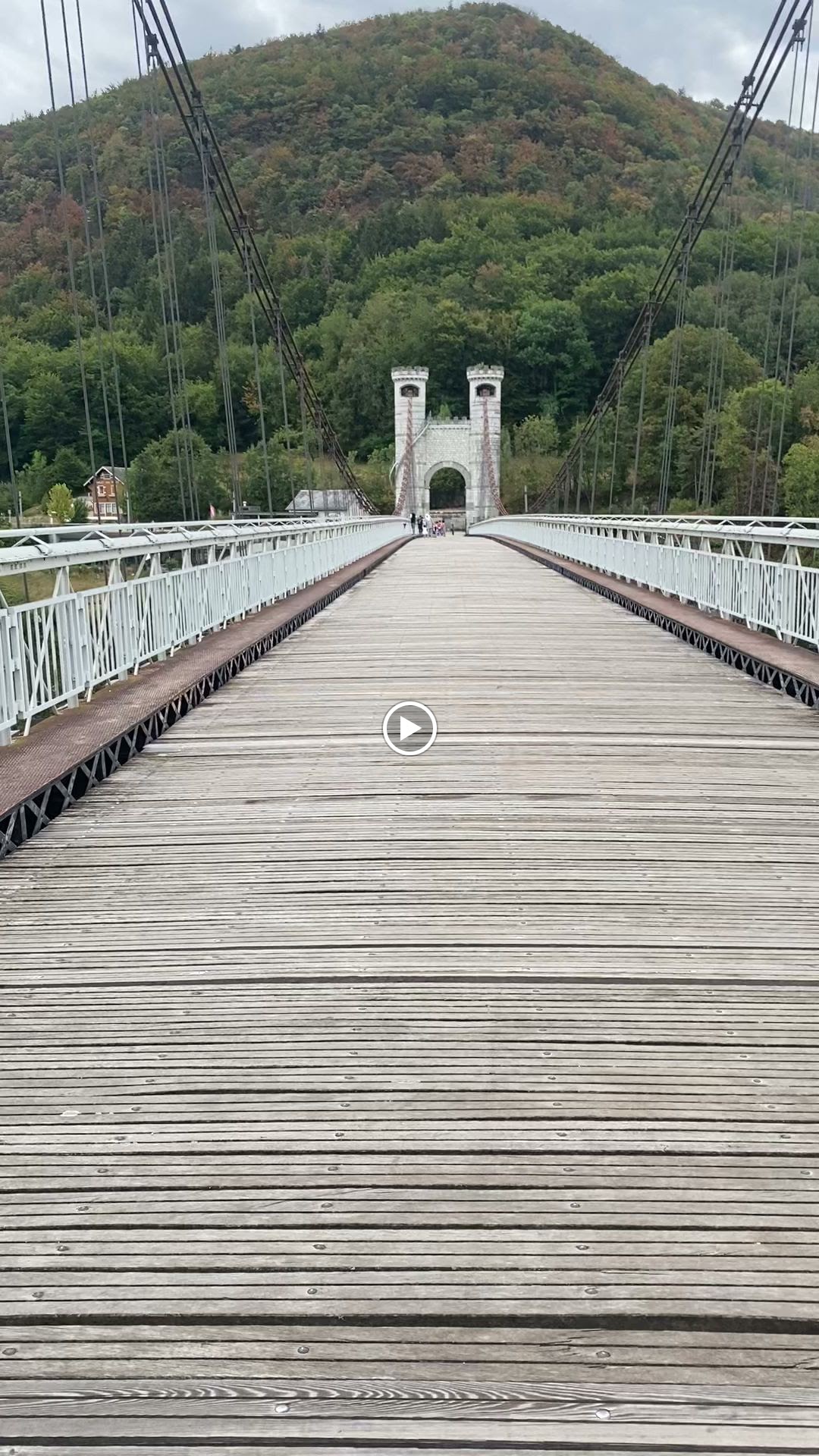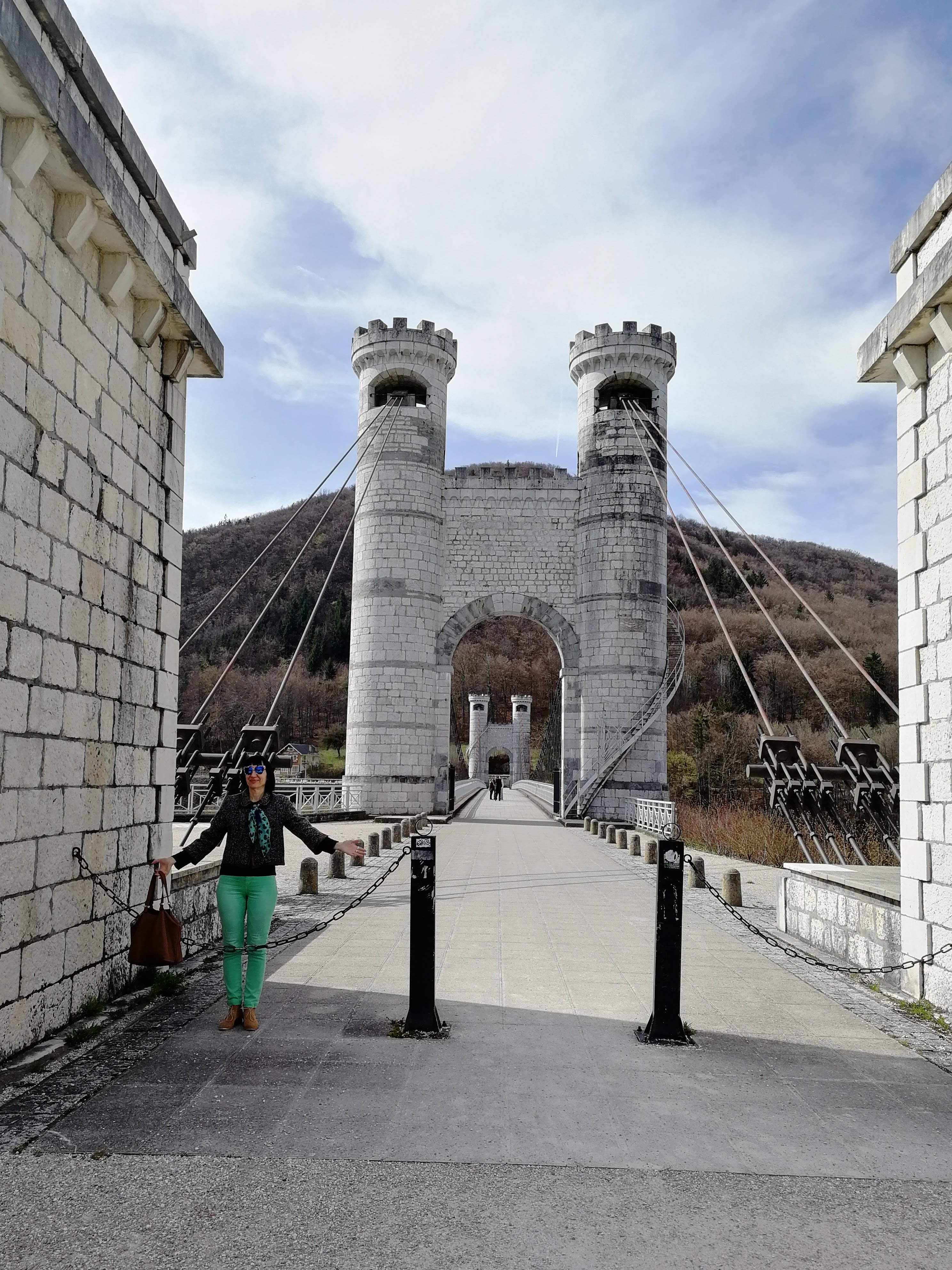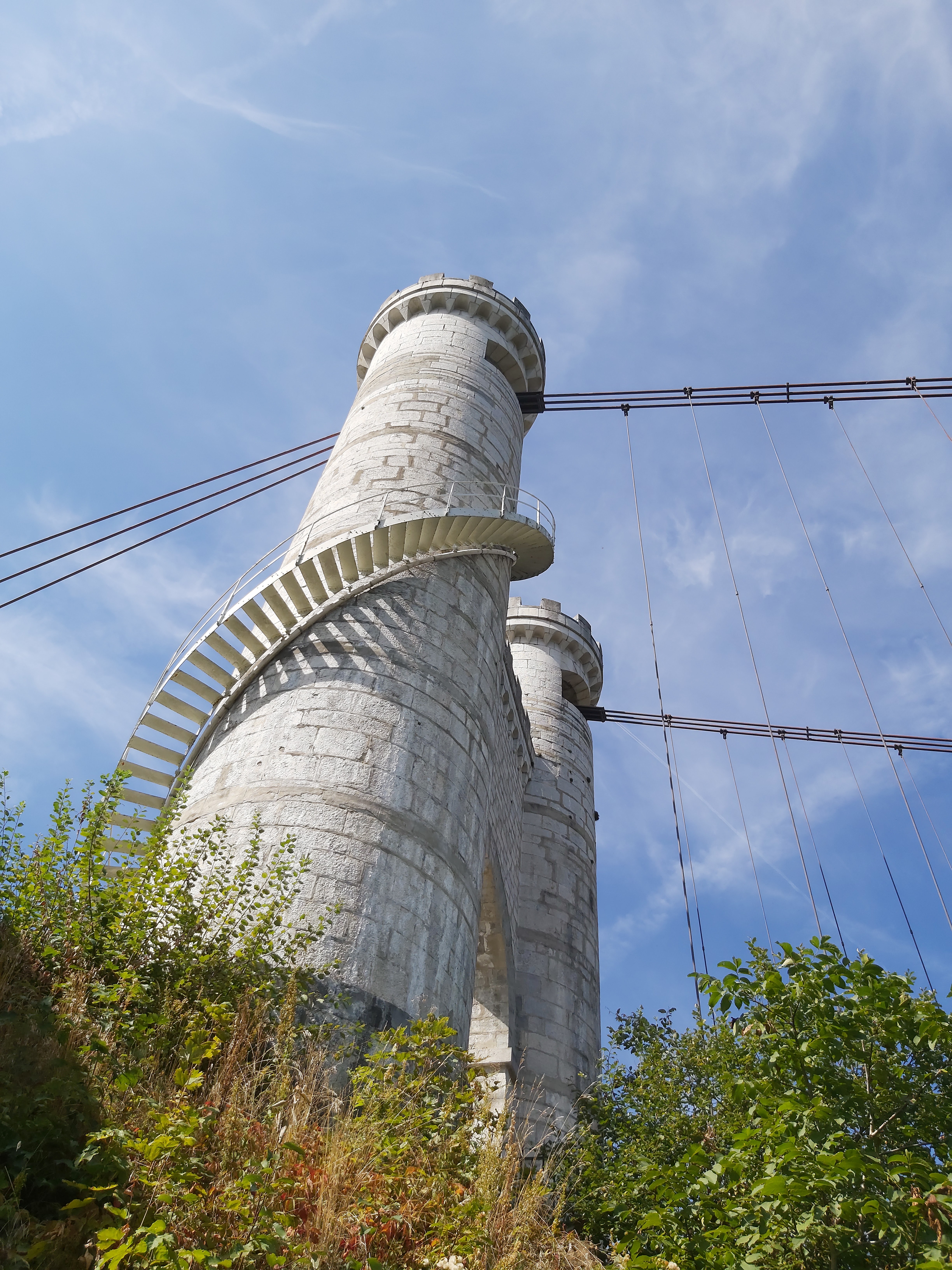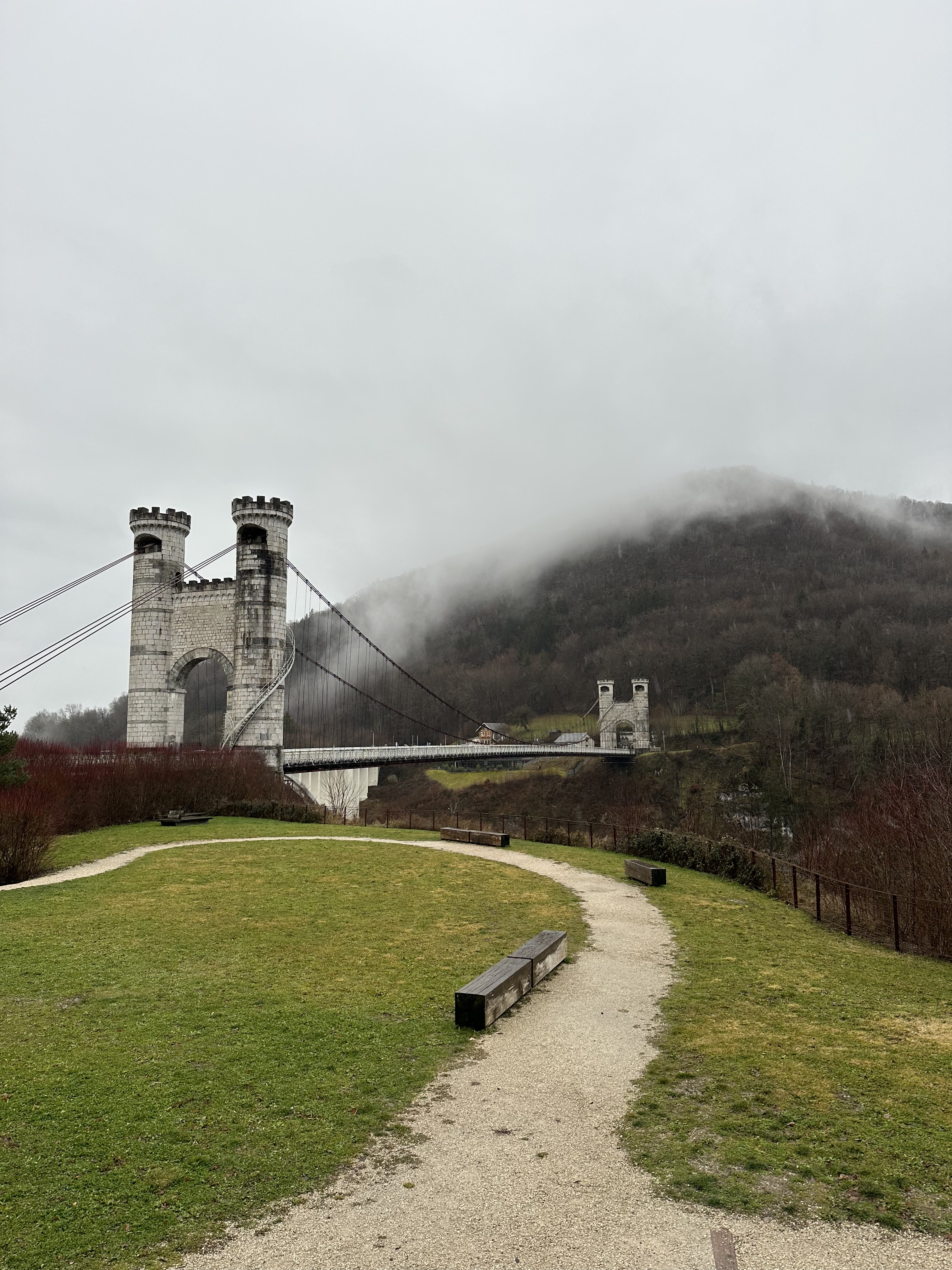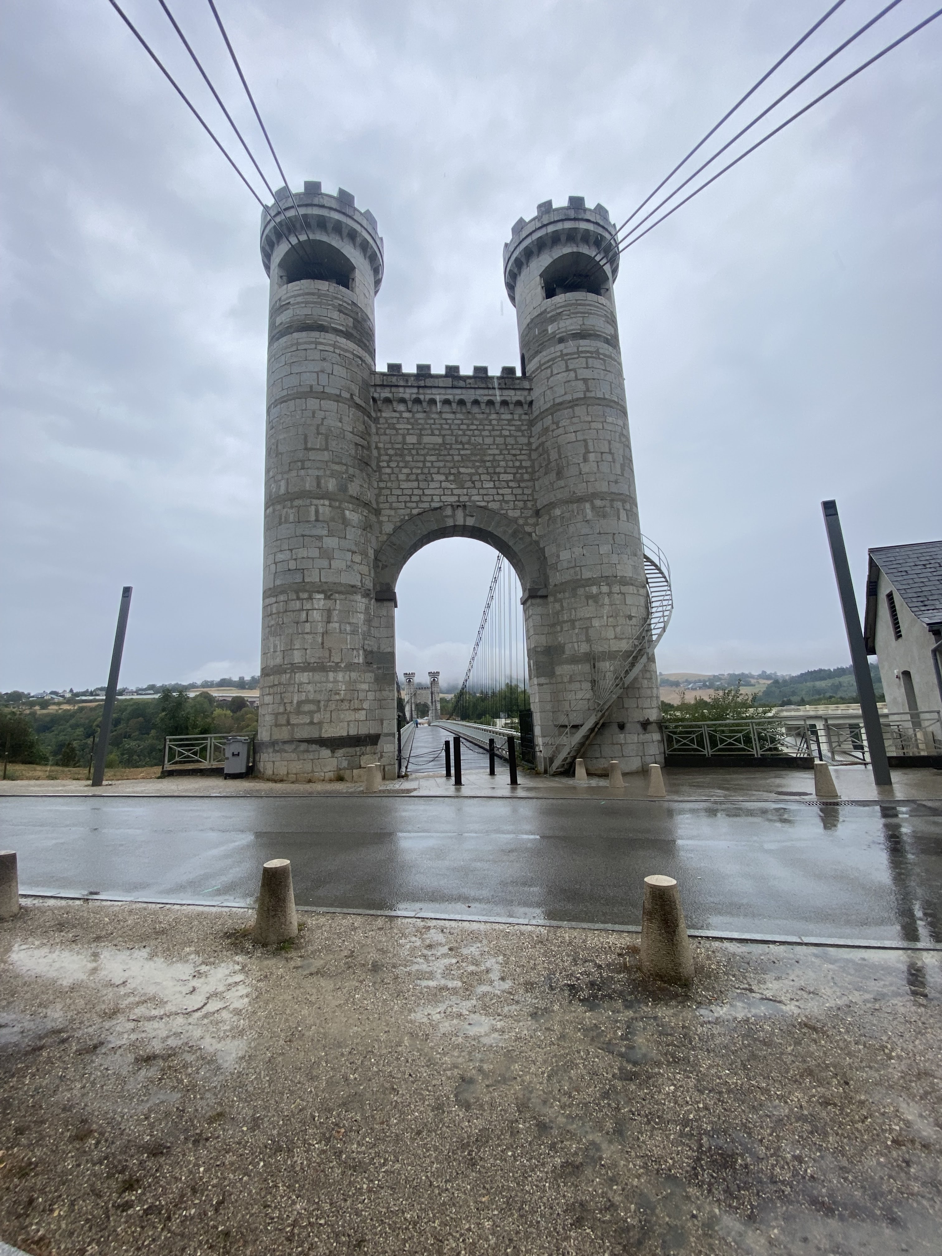 Spectaculaire pont suspendu en câble d'acier inscrit au titre des Monuments Historiques et c'est mérité. Il surplombe d'une belle hauteur une rivière. Le lieu est impressionnant avec toutes ces petites collines verdoyantes autour. Très belle réalisation avec des tours qui rappellent celles d'un château fort du moyen âge. Le panorama est magnifique.. À découvrir !
