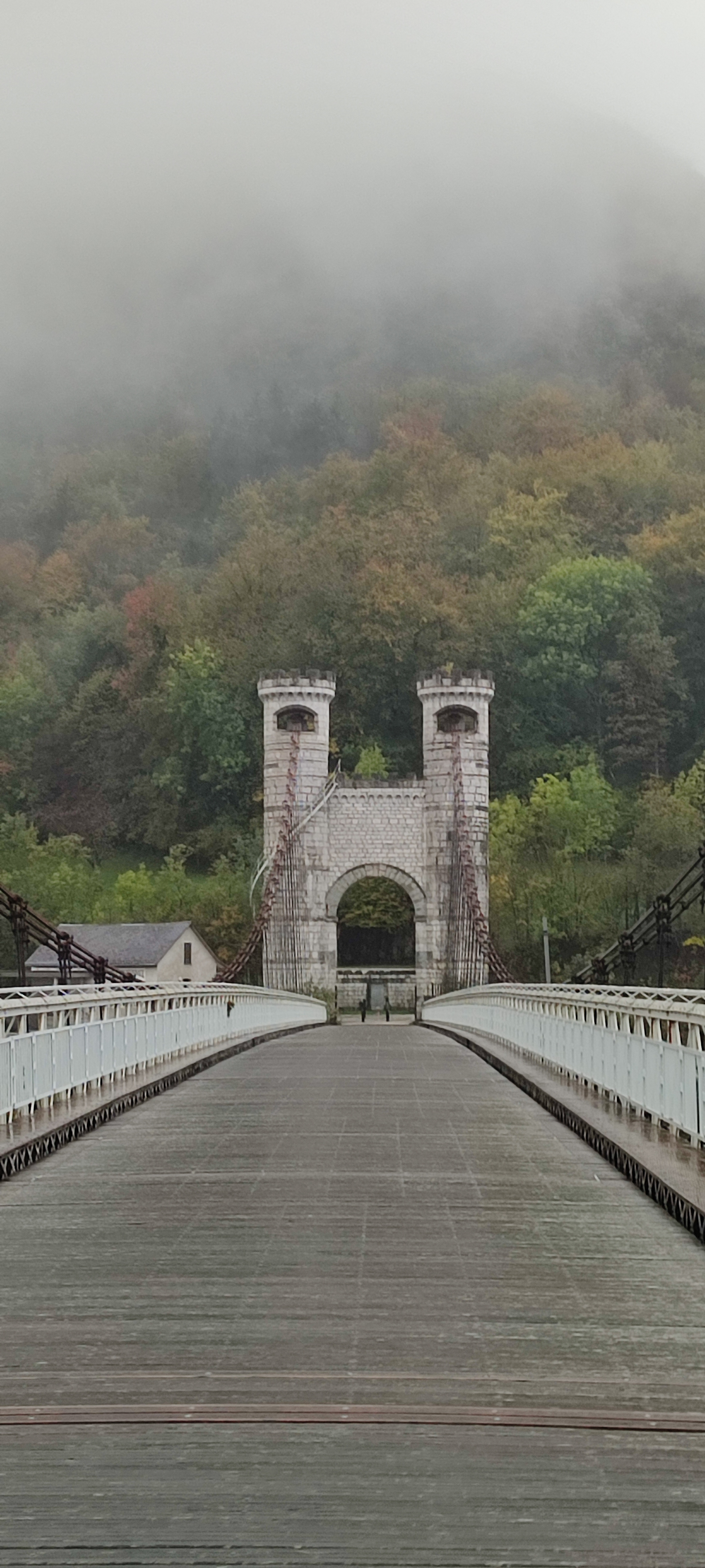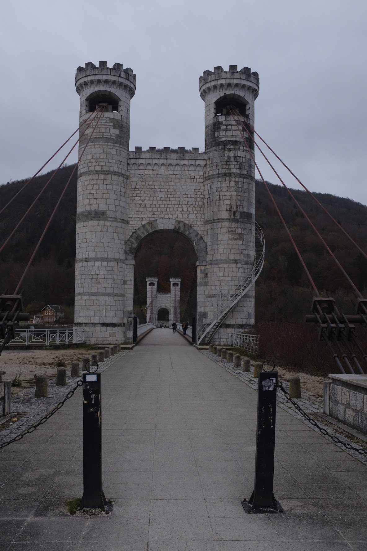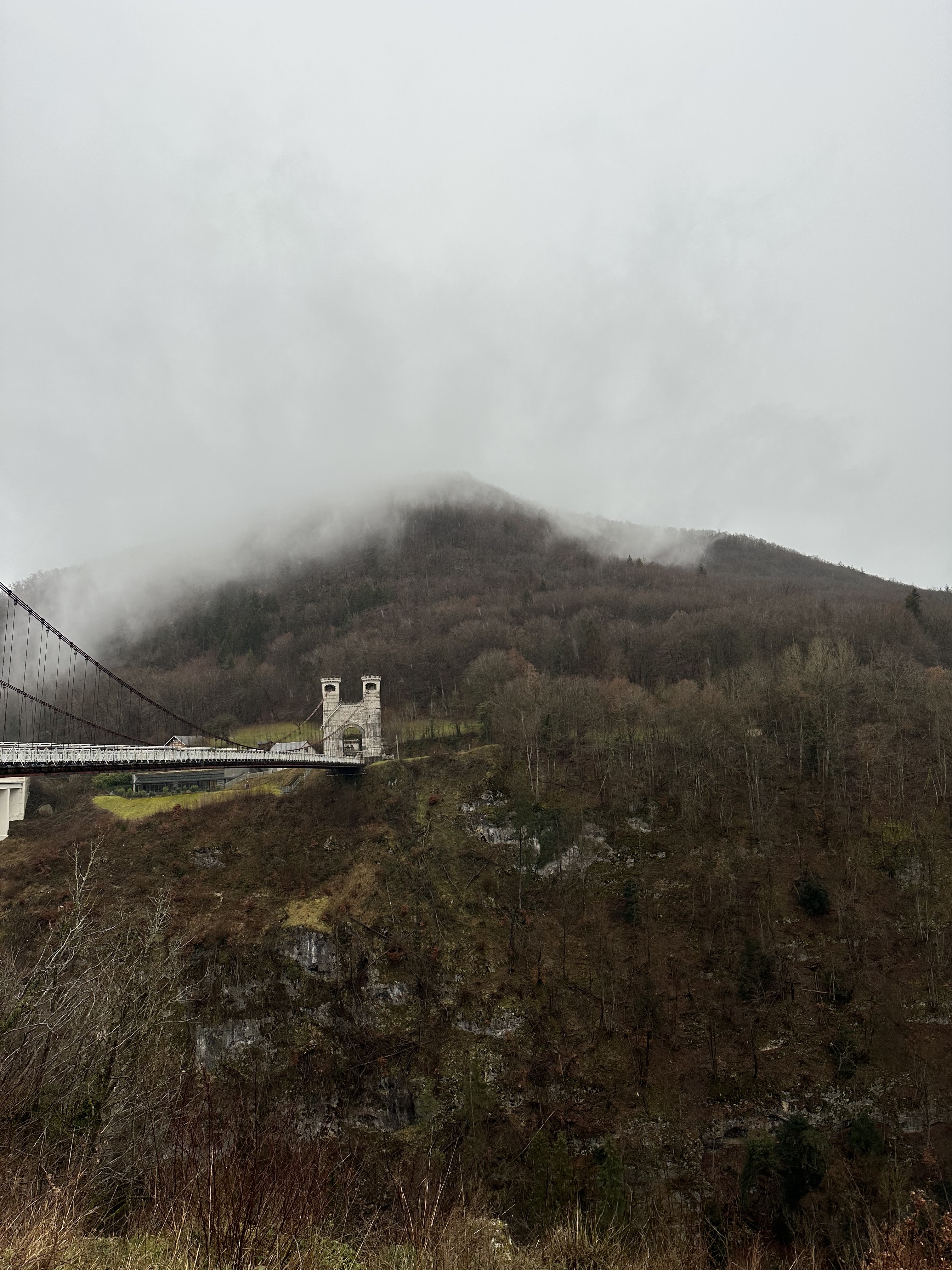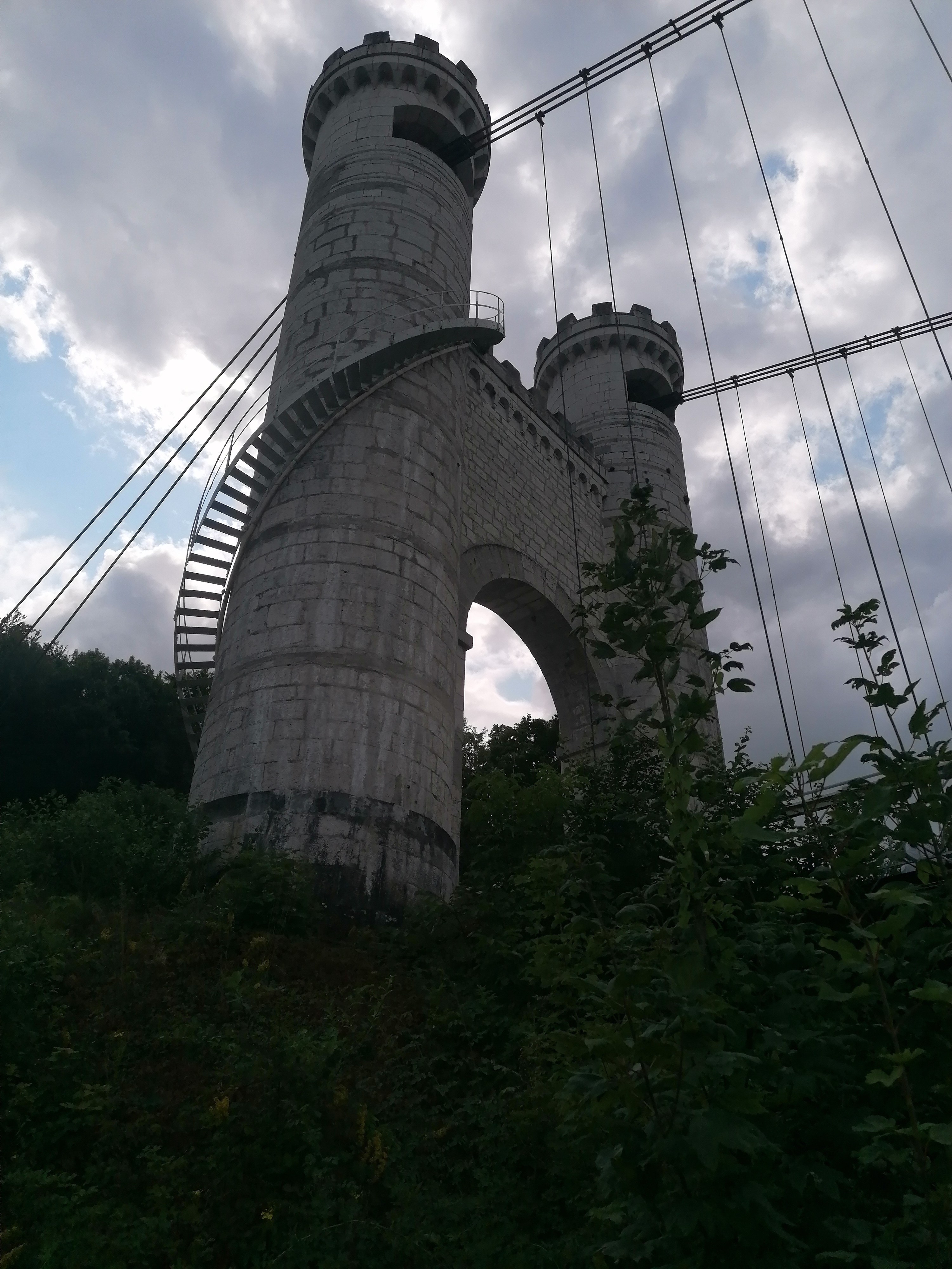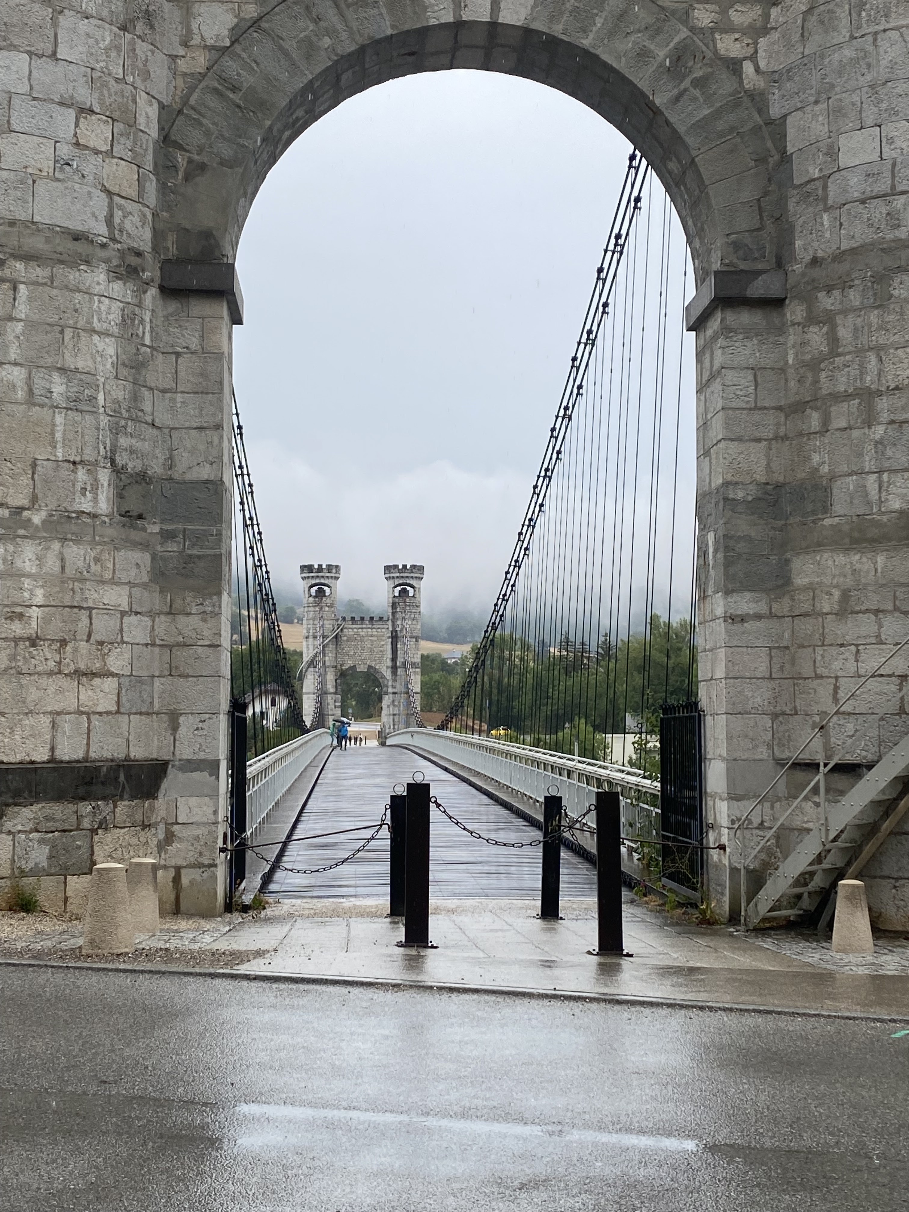 Spectaculaire pont suspendu en câble d'acier inscrit au titre des Monuments Historiques et c'est mérité. Il surplombe d'une belle hauteur une rivière. Le lieu est impressionnant avec toutes ces petites collines verdoyantes autour. Très belle réalisation avec des tours qui rappellent celles d'un château fort du moyen âge. Le panorama est magnifique.. À découvrir !