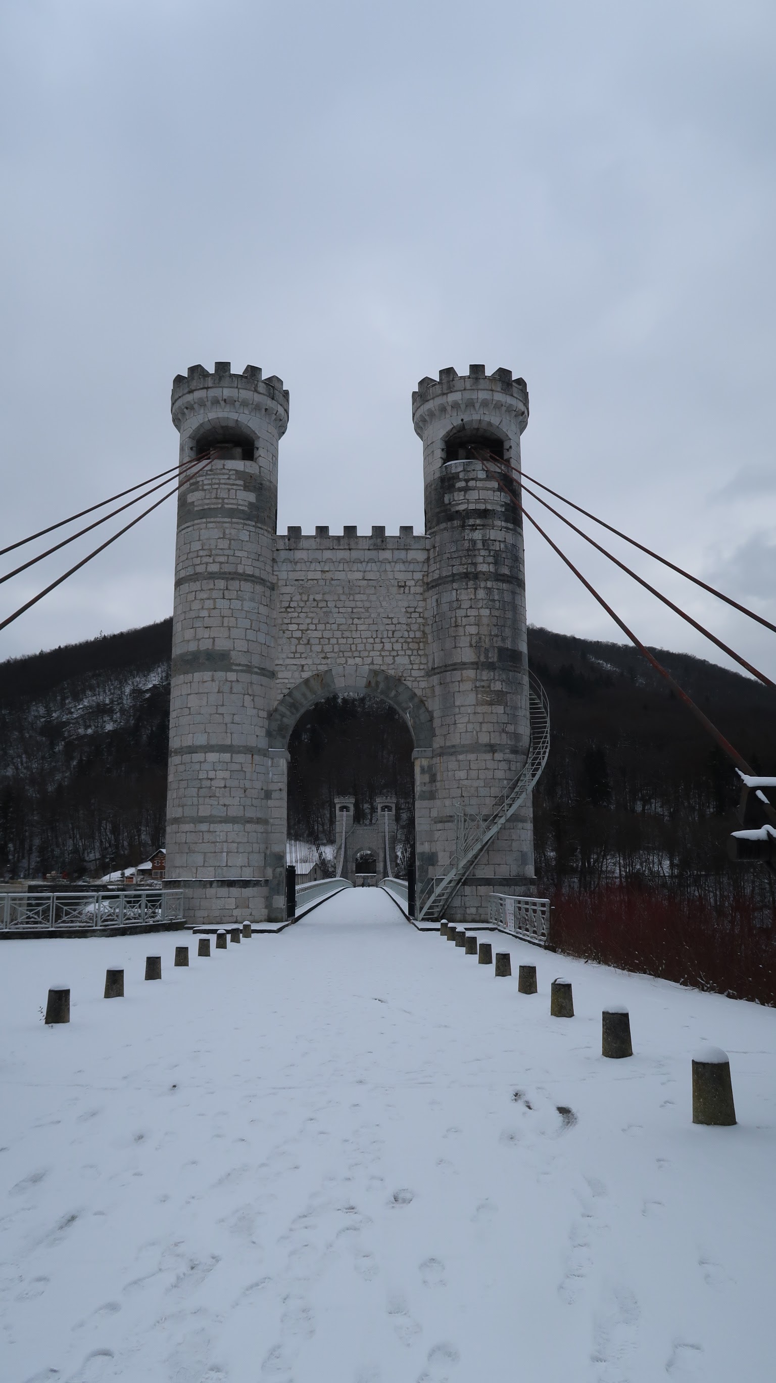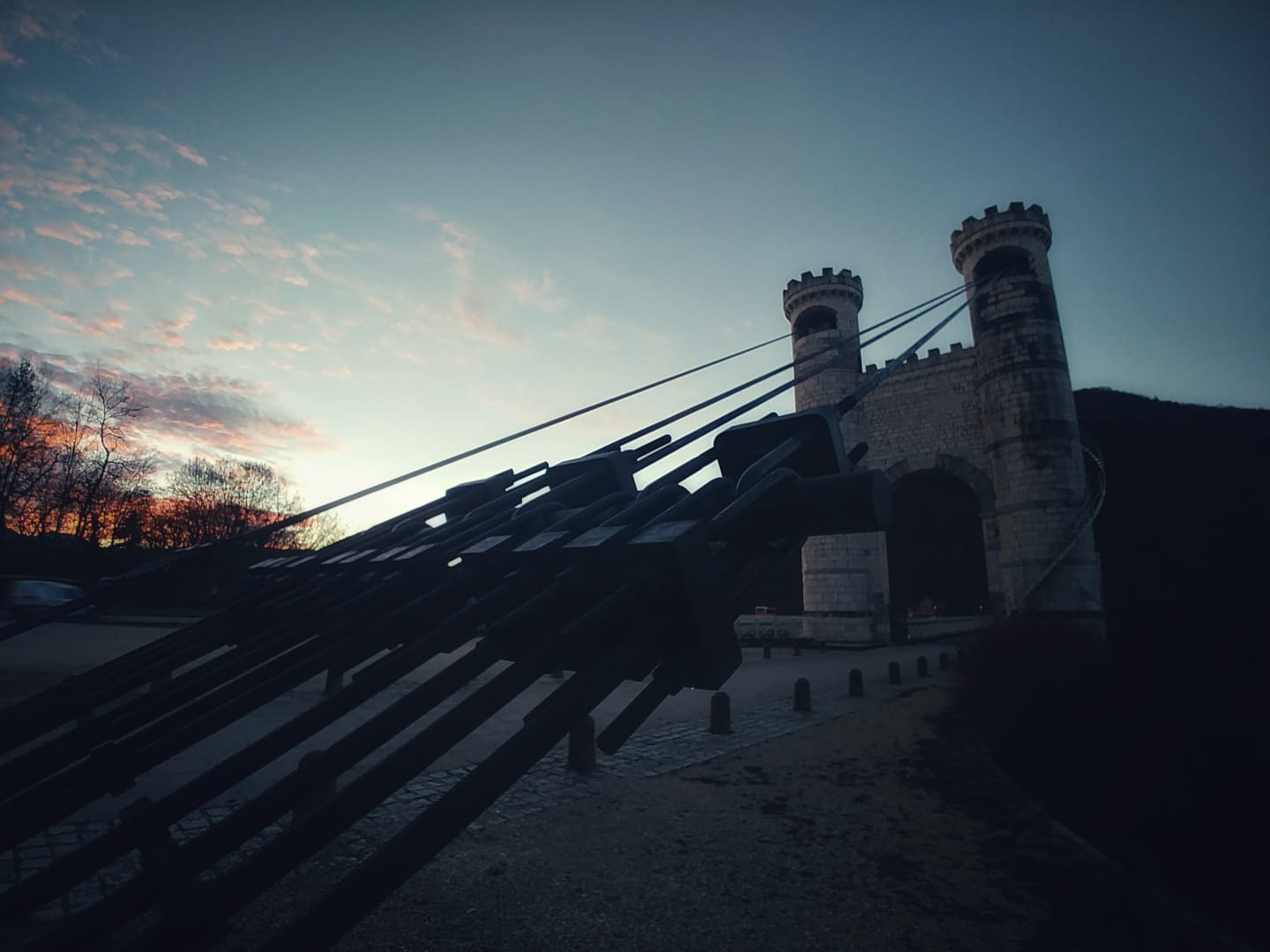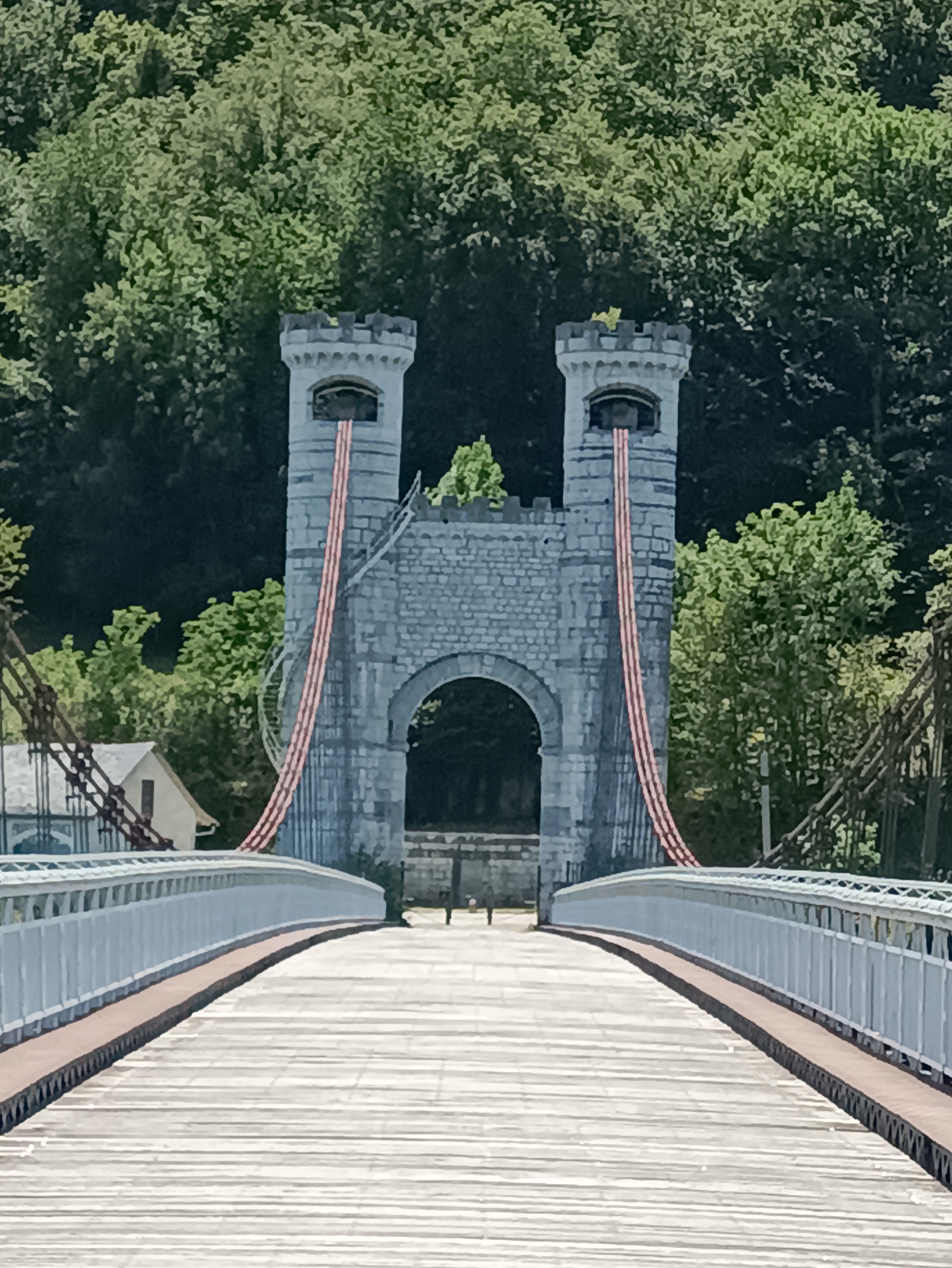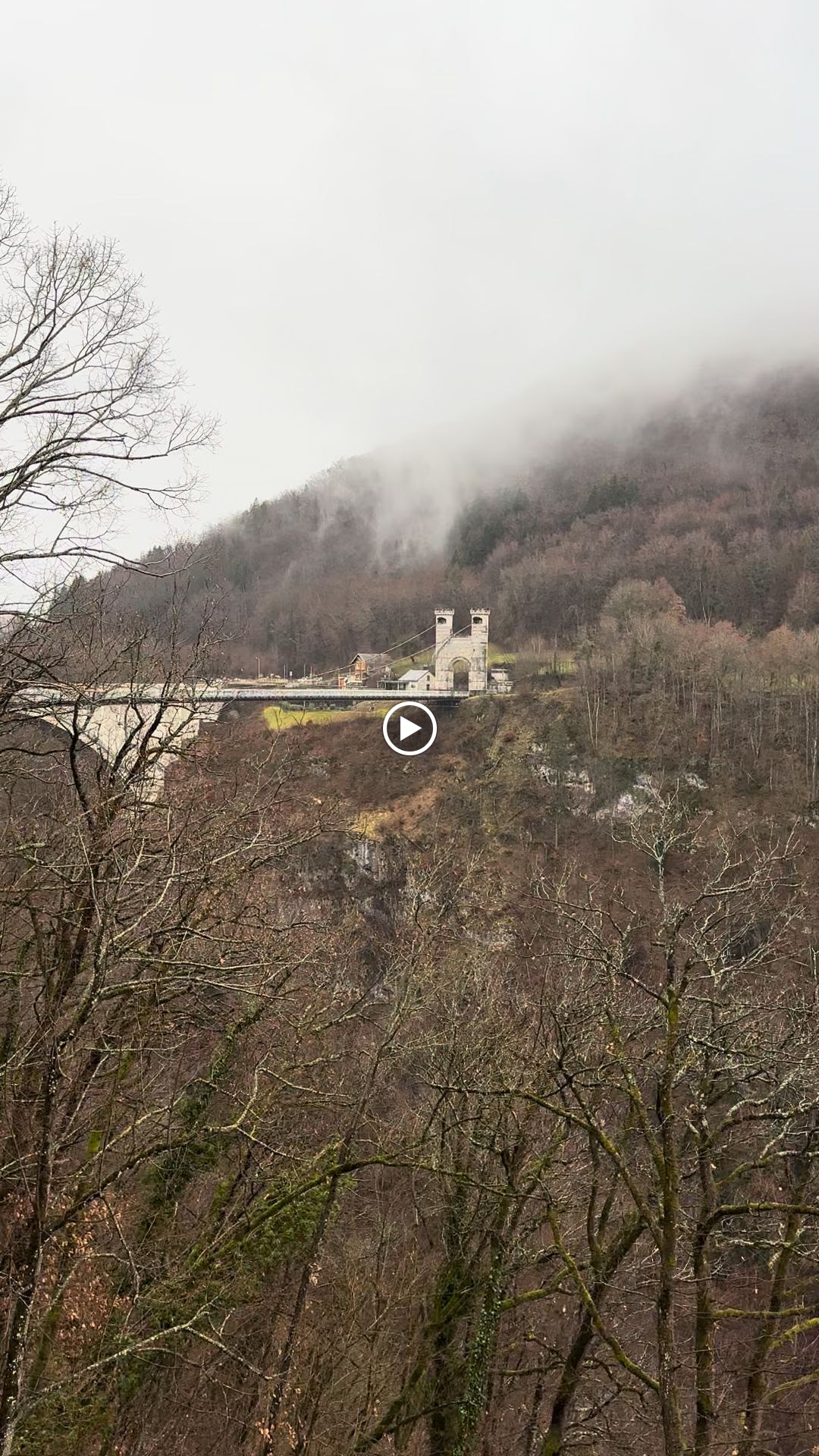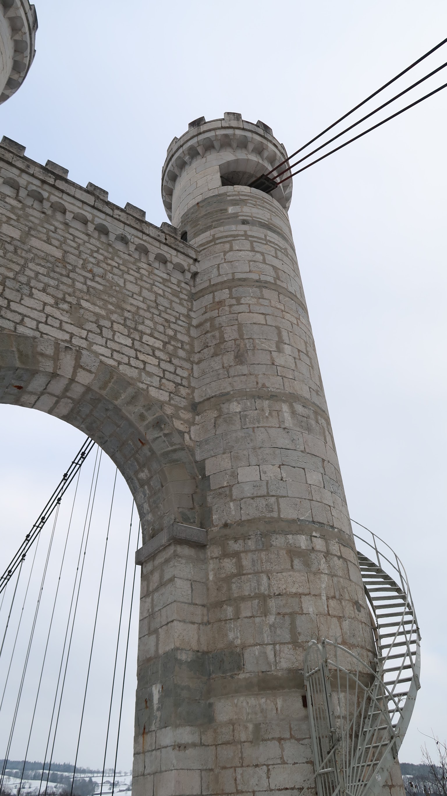 Spectaculaire pont suspendu en câble d'acier inscrit au titre des Monuments Historiques et c'est mérité. Il surplombe d'une belle hauteur une rivière. Le lieu est impressionnant avec toutes ces petites collines verdoyantes autour. Très belle réalisation avec des tours qui rappellent celles d'un château fort du moyen âge. Le panorama est magnifique.. À découvrir !