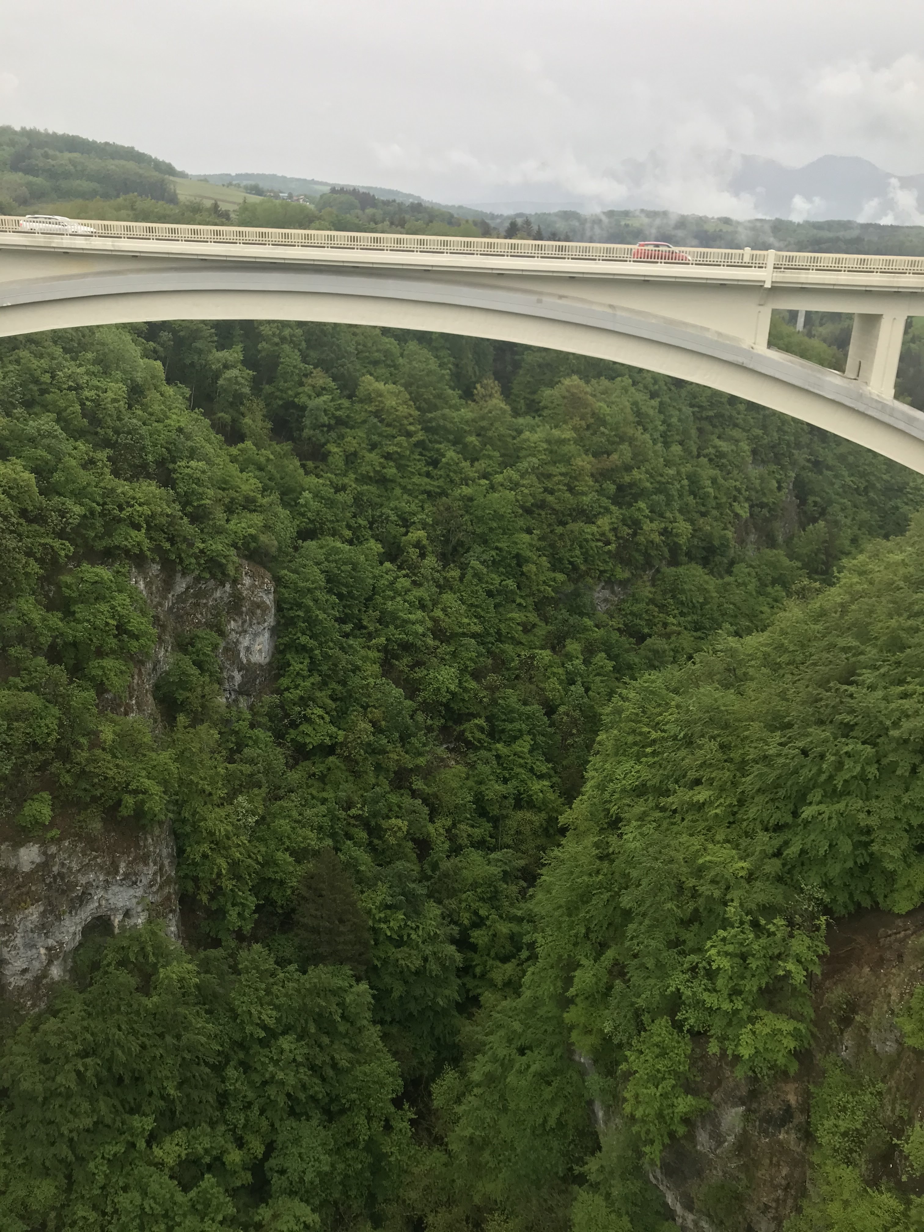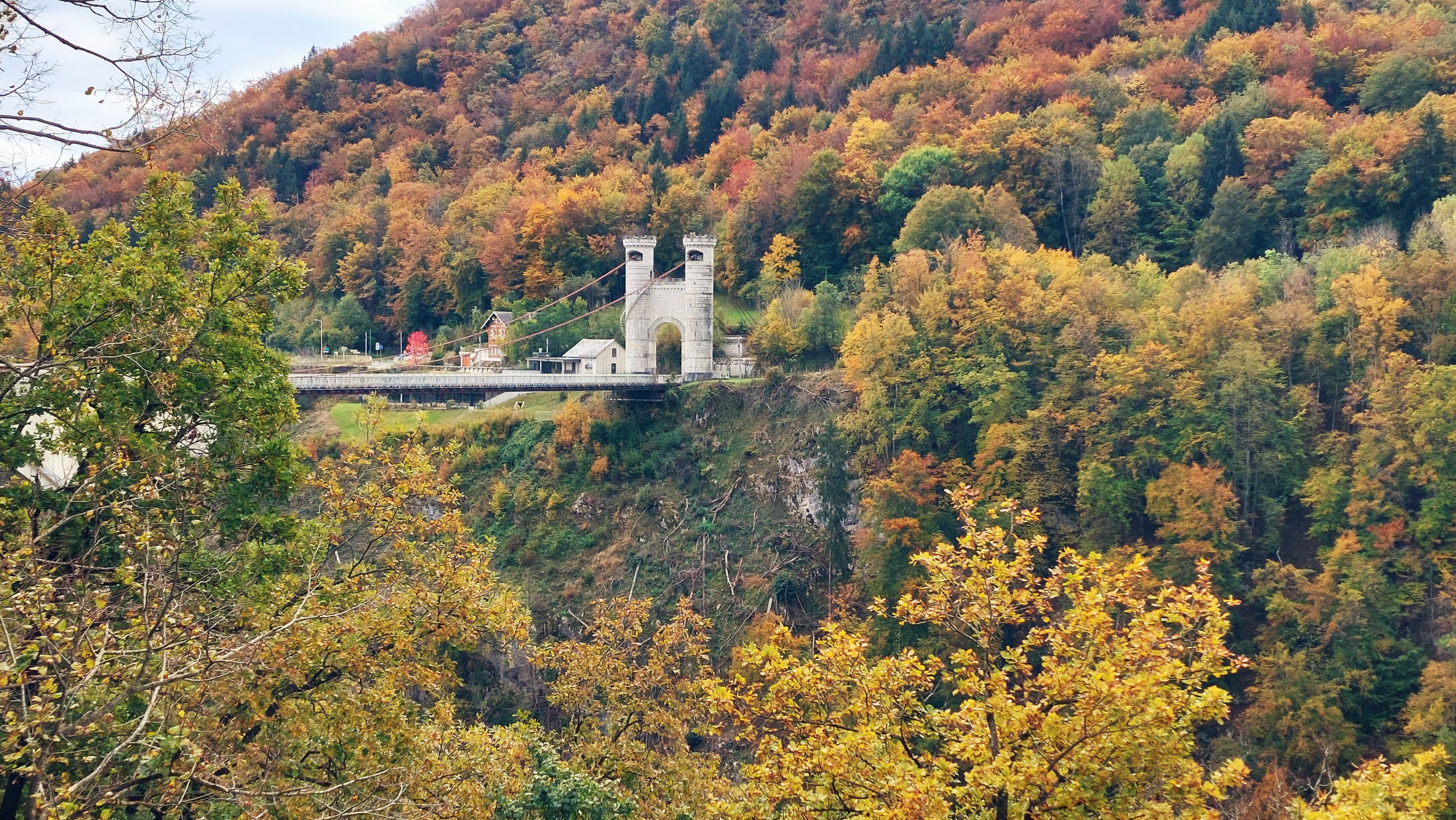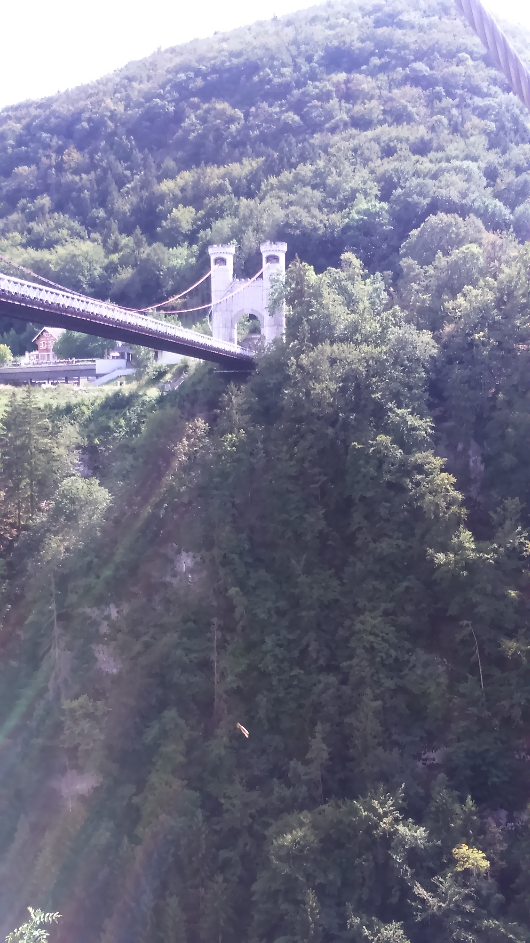 Mise en parallèle entre la nature sauvage ( vallée très encaissée creusée par la rivière, même vu un chamois! ) et le monde moderne en progrès ( vieux pont avec des planches en bois entre lesquelles on voit la cime des arbres et 2e pont avec une grande circulation routière). On voit les cimes des arbres PAR DESSUS !!!