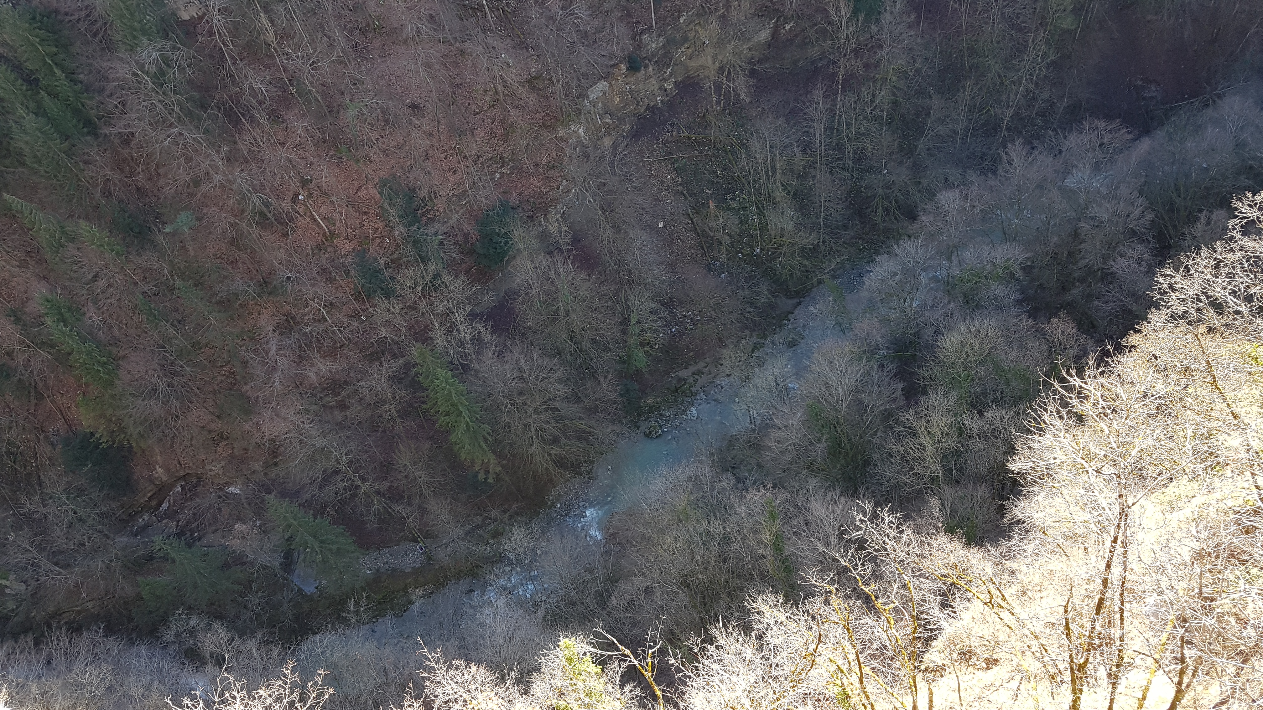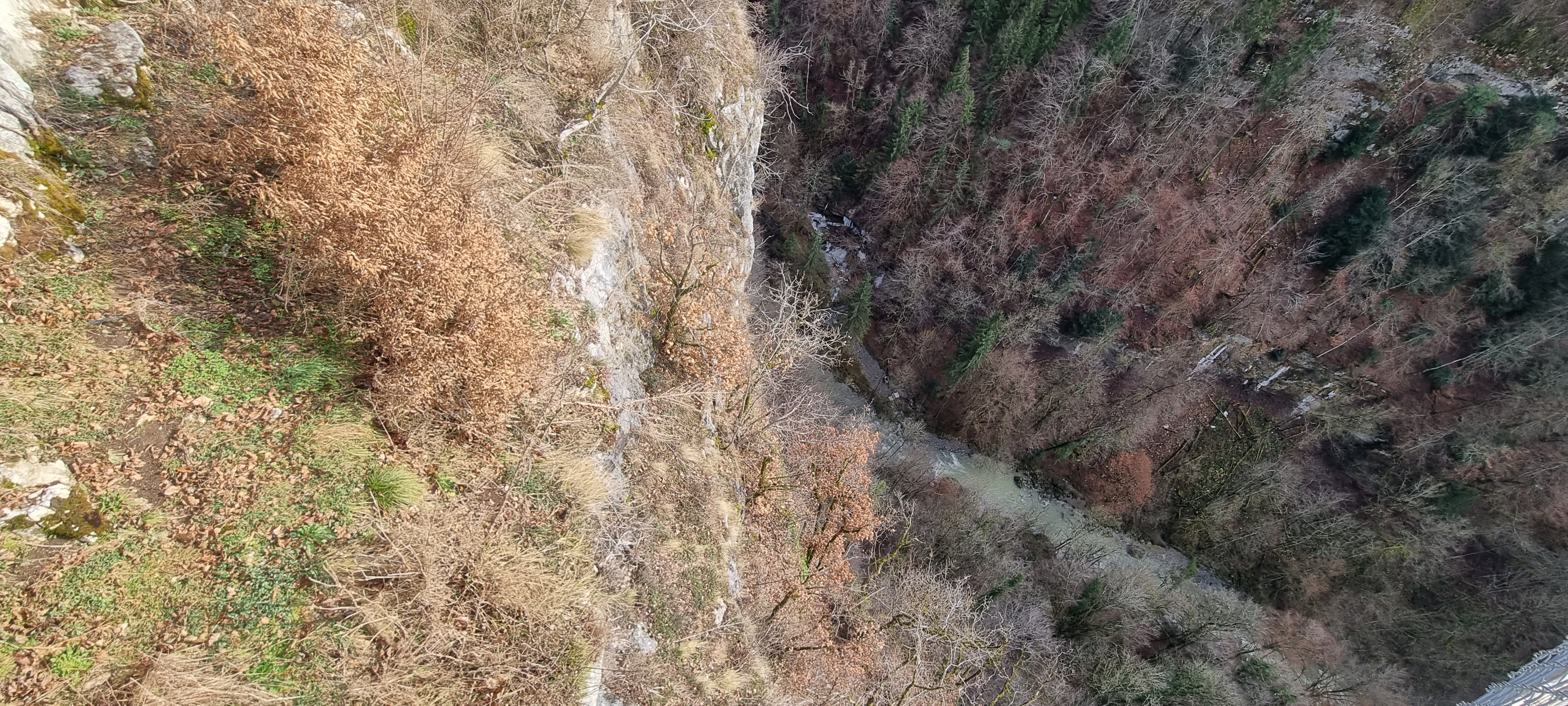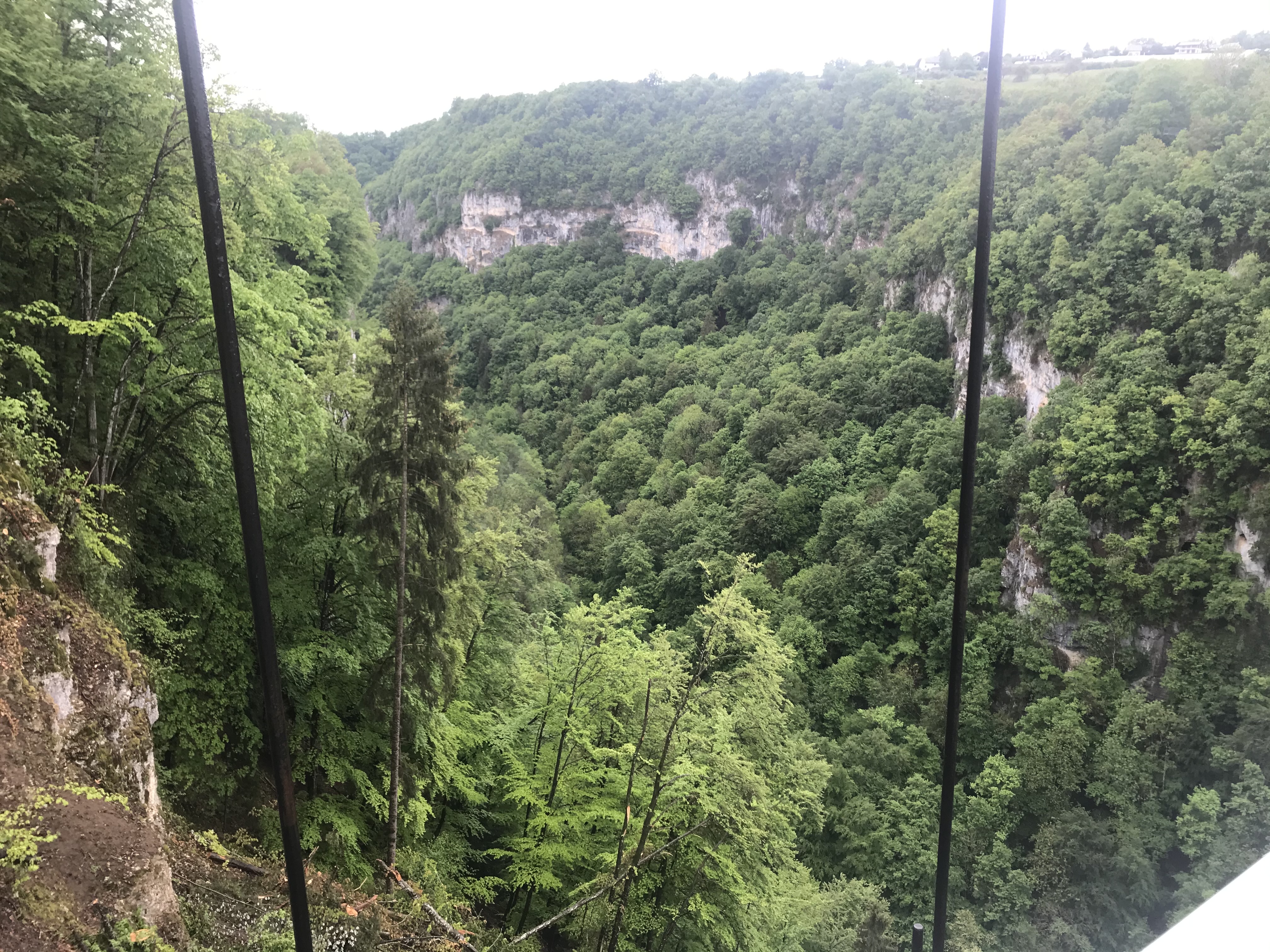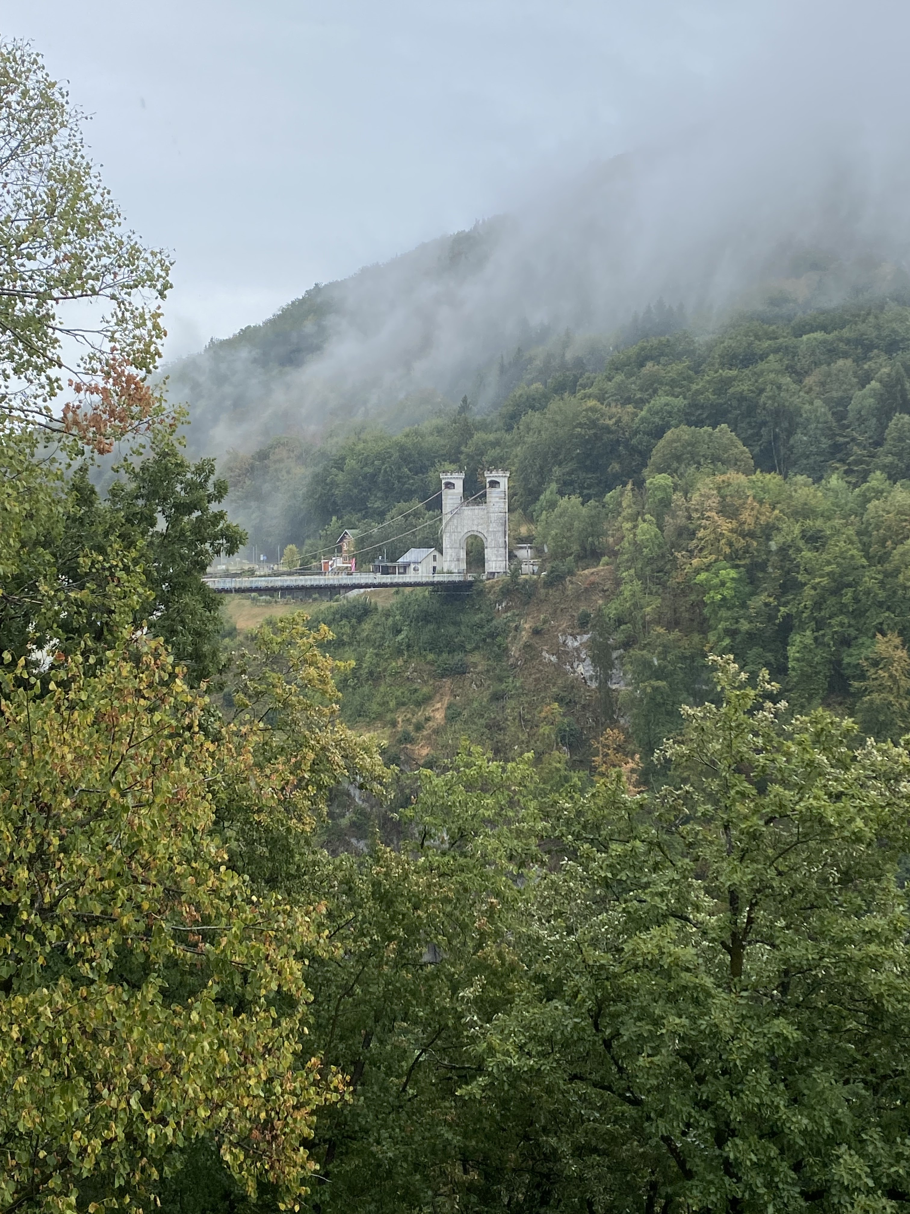 Mise en parallèle entre la nature sauvage ( vallée très encaissée creusée par la rivière, même vu un chamois! ) et le monde moderne en progrès ( vieux pont avec des planches en bois entre lesquelles on voit la cime des arbres et 2e pont avec une grande circulation routière). On voit les cimes des arbres PAR DESSUS !!!