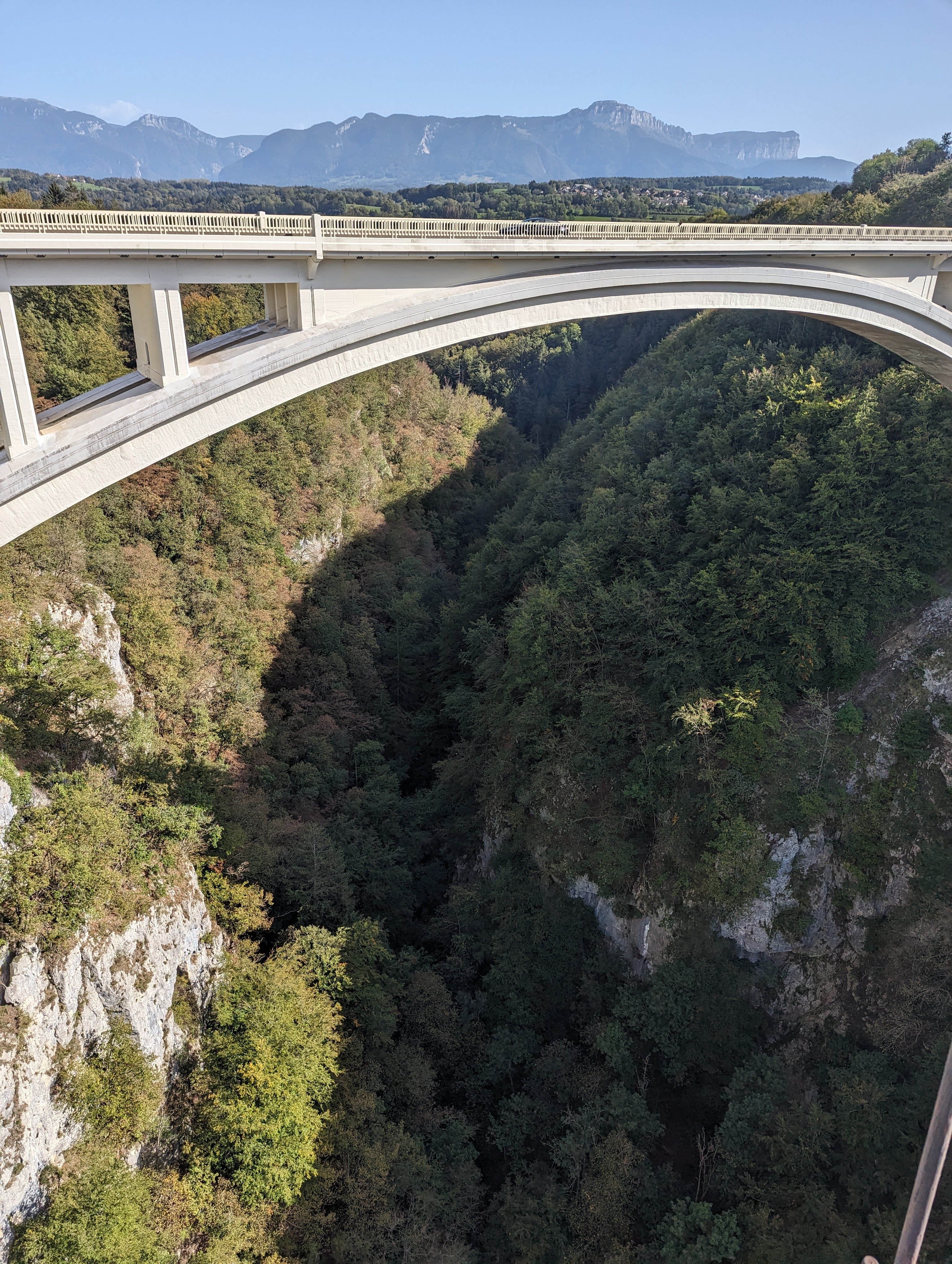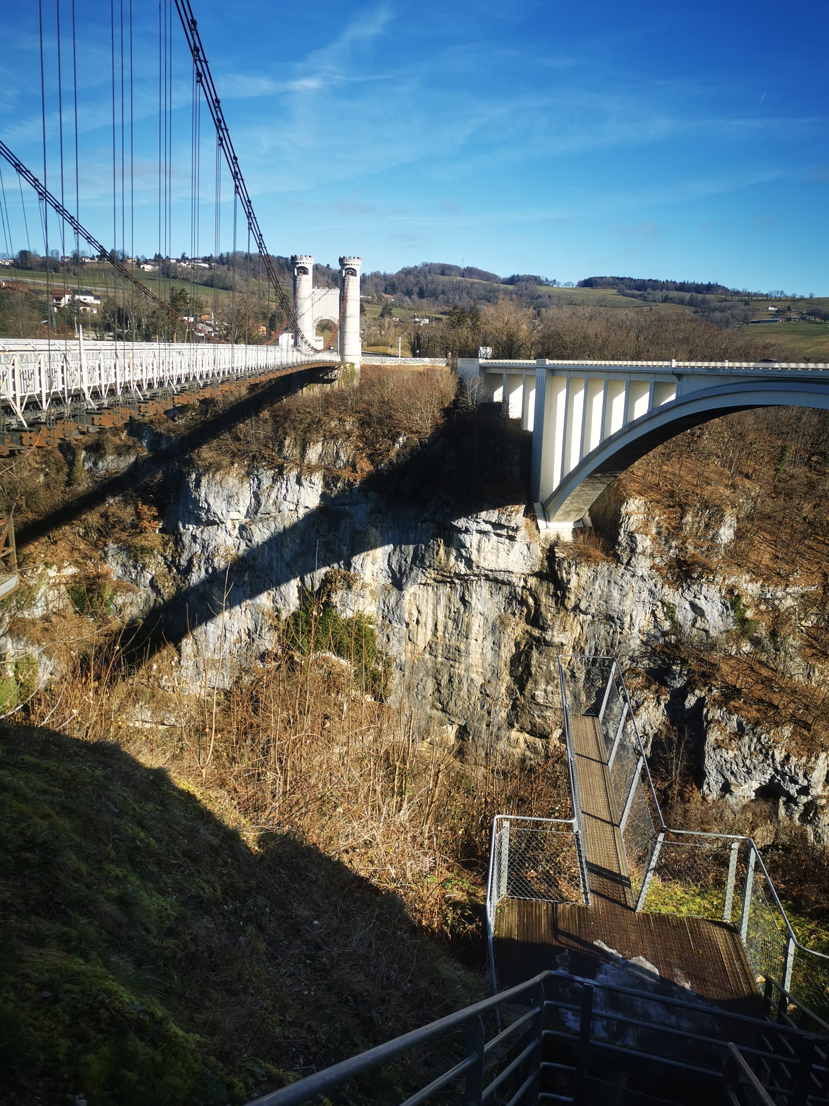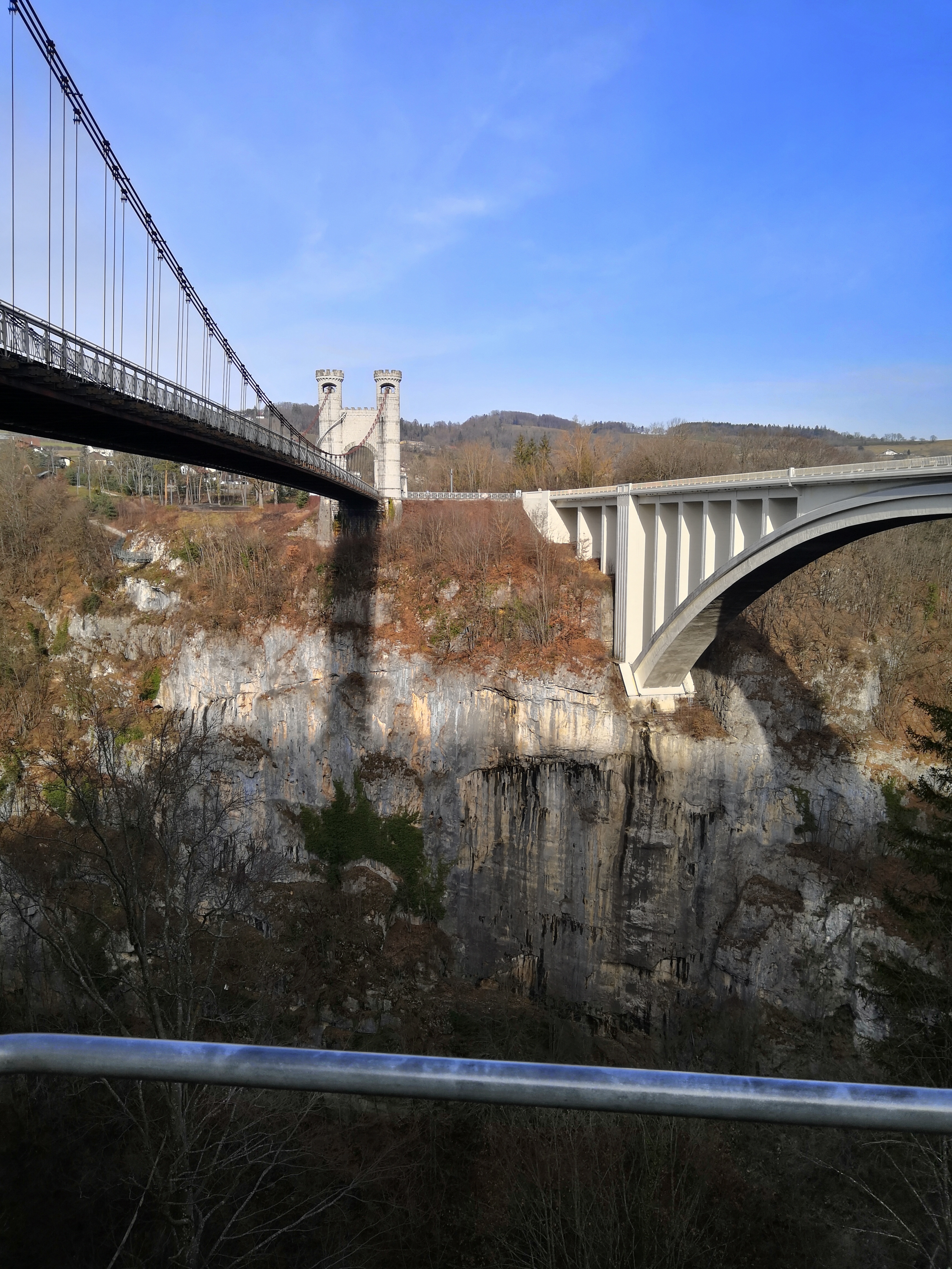 Un site remarquable et exceptionnel. Les 2 ponts de la Caille, longs de prés de 200 mètres (l'ancien de 1839 et l'actuel de 1928) enjambent la rivière des Usses qui coule 150 mètres plus bas. Le panorama sur les gorges est impressionant depuis l'ancien pont. Le site est parfaitement aménagé avec un grand parking gratuit, un espace pique-nique avec de nombreux bancs, et cerise sur le gâteau, deux passerelles qui s'avancent dans le vide. Frissons garantis. L'ensemble est parfaitement sécurisé et convient aux familles. Comptez une 1/2 heure pour la visite. Un incontournable de Haute-Savoie sur la route de Genève.