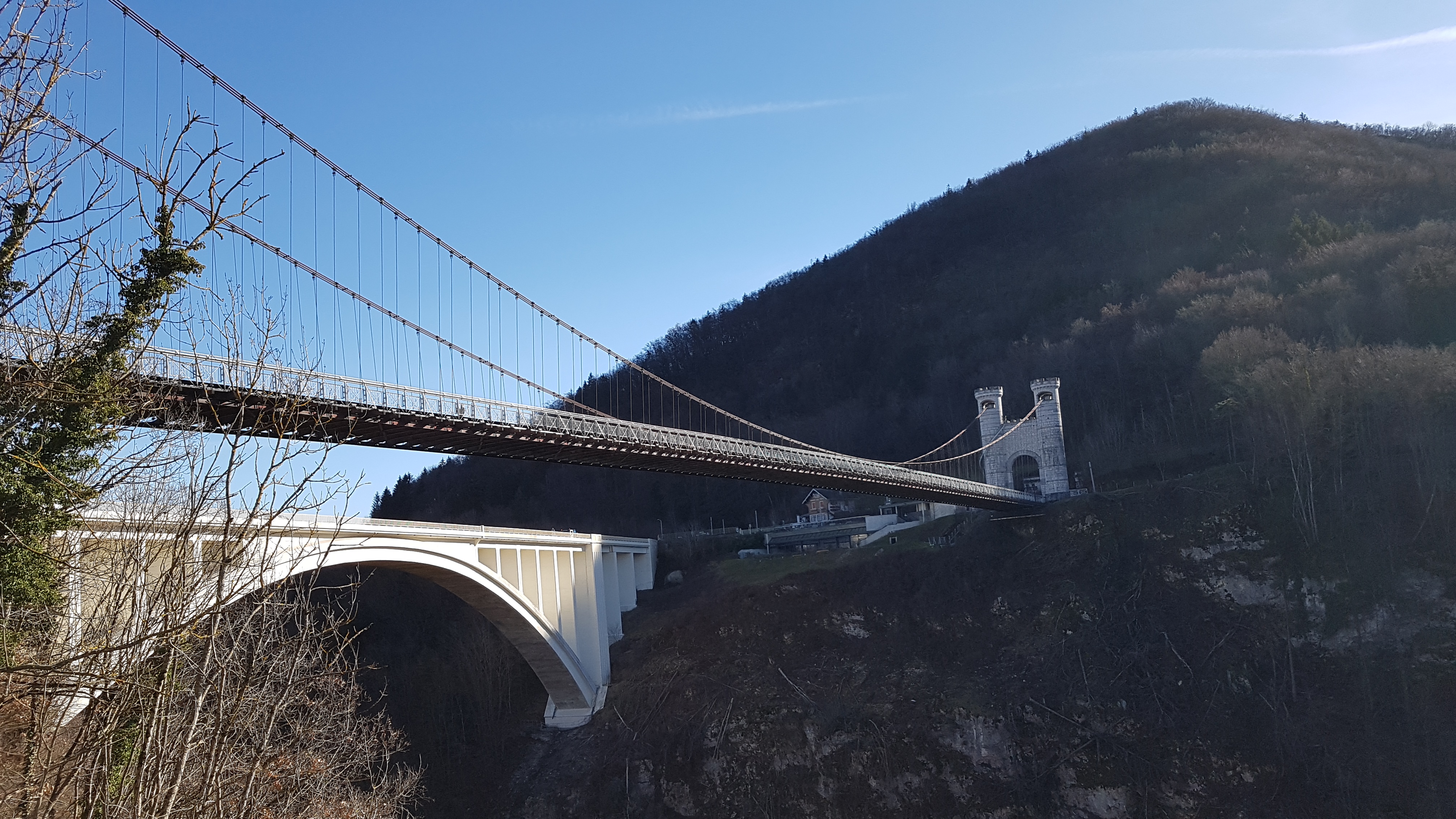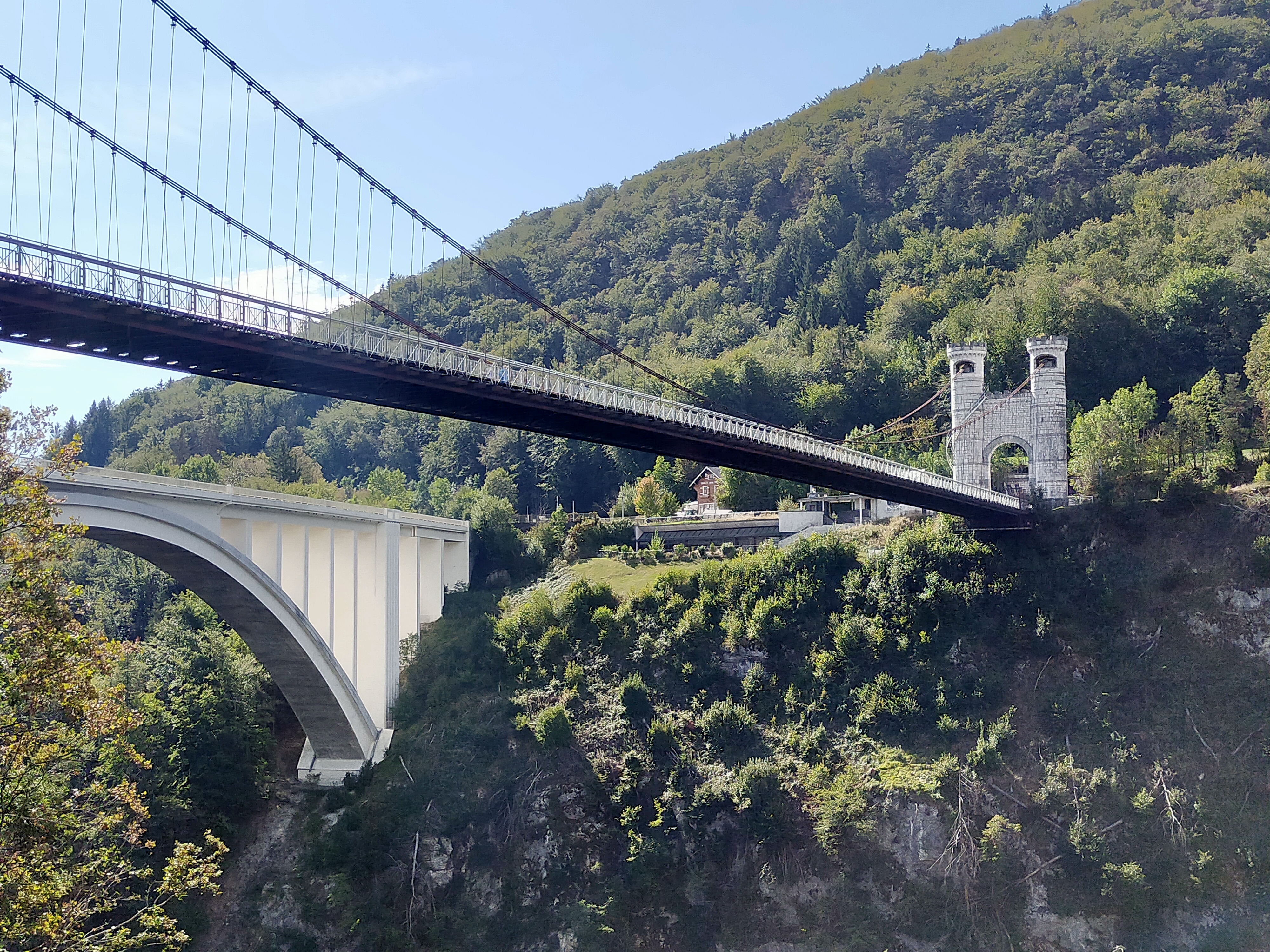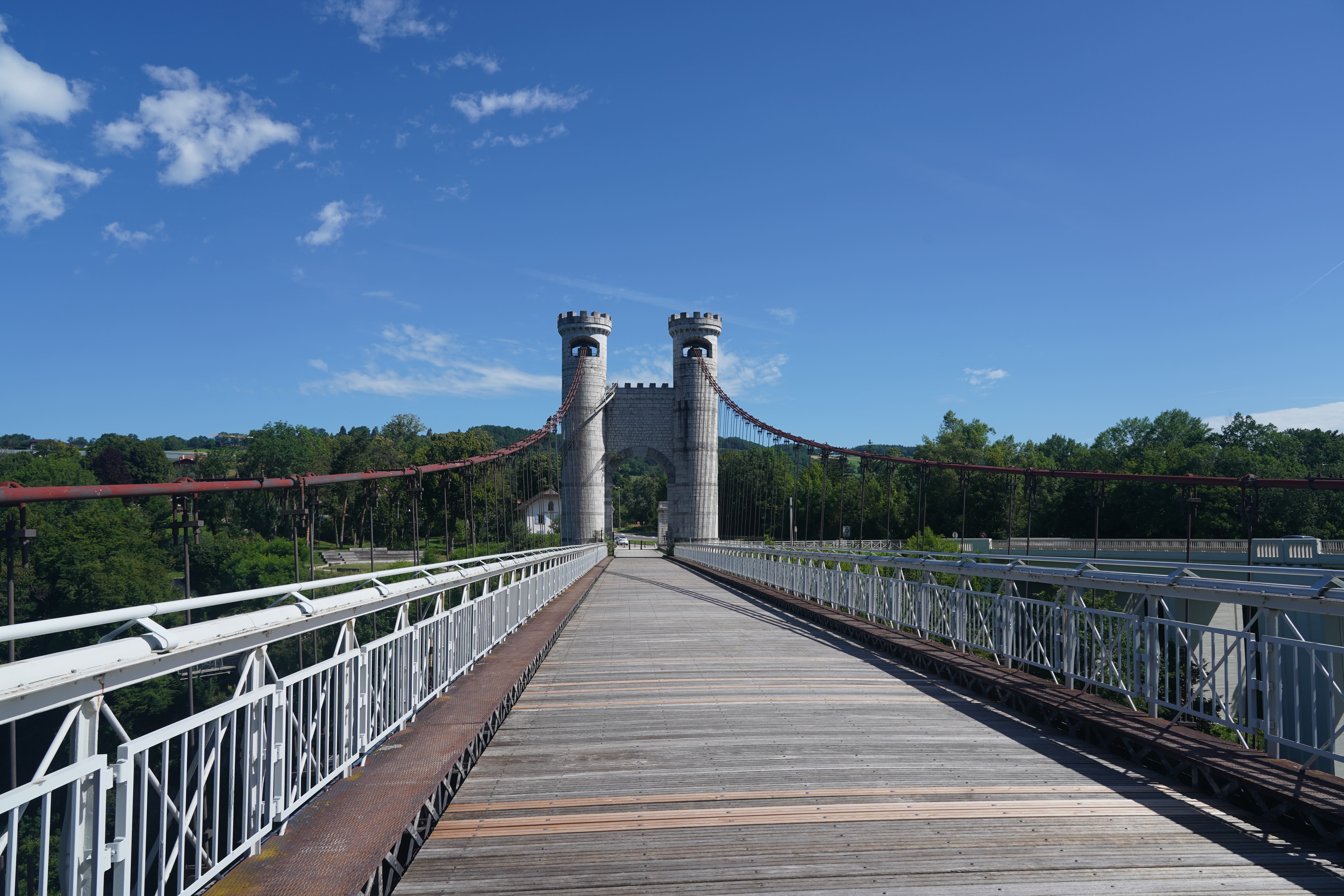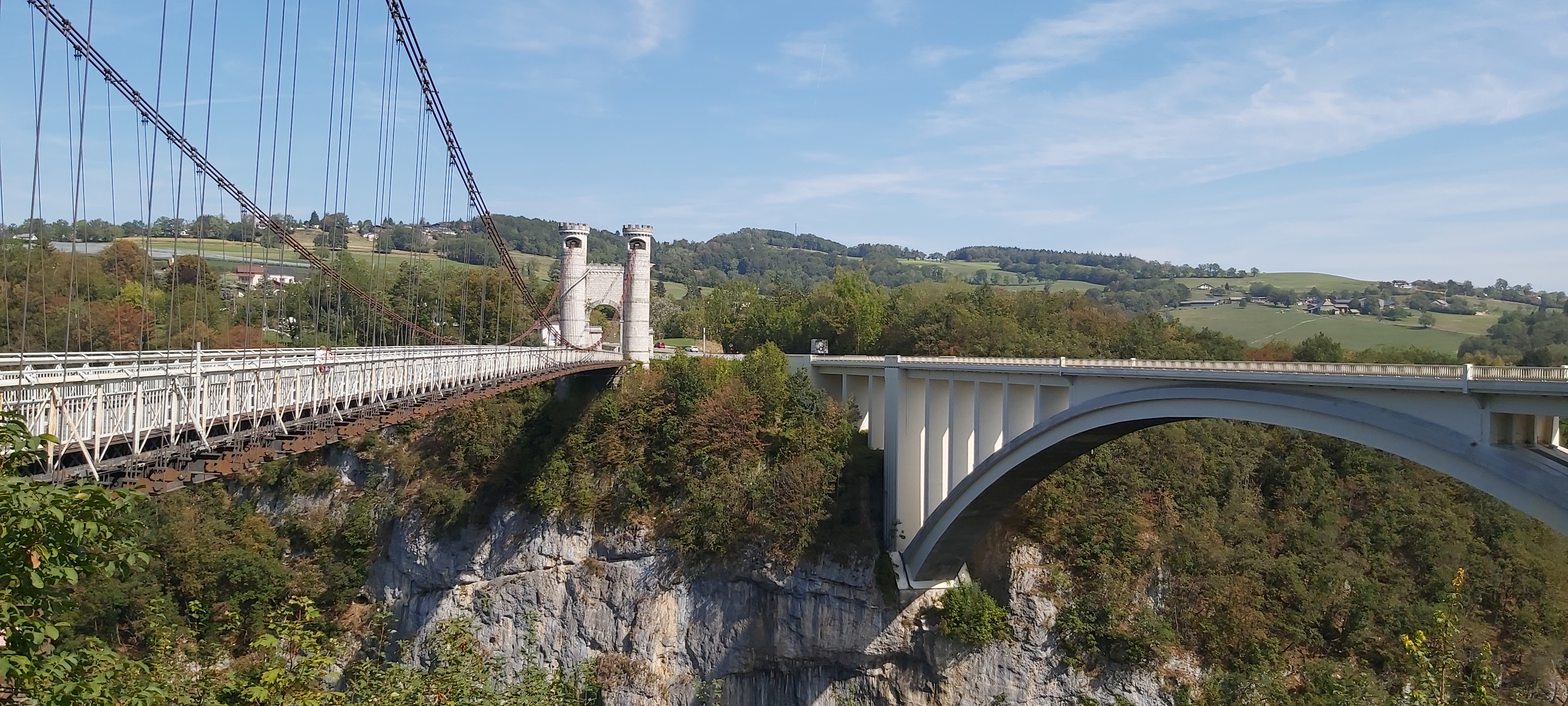 Ce majestueux pont blanc suspendu au dessus des verdoyantes gorges des Usses est remarquable par l'architecture néo moyenâgeuse de ses entrées. Originellement baptisé pont Charles-Albert, cet édifice nous renvoi à une époque où ce territoire appartenait au Royaume de Savoie-Sardaigne. Un parking et des aménagements nous apprennent qu'avant sa construction, il faillait descendre dans les gorges et passer un vieux pont romain pour accéder d'une rive à l'autre. De cette époque antique, le lieu est connu pour sa source médicinale jadis exploitée par un établissement thermal aujourd'hui en ruines.