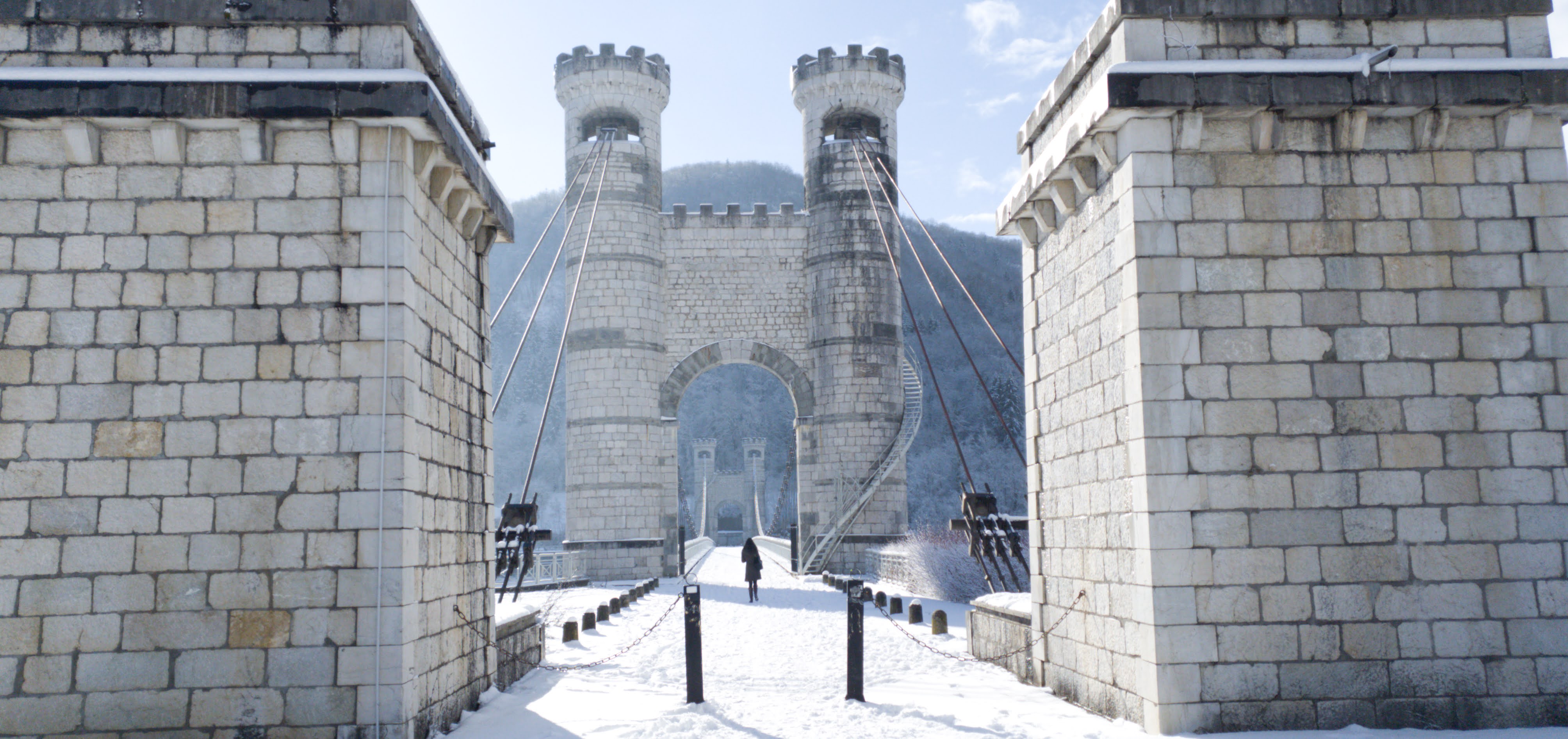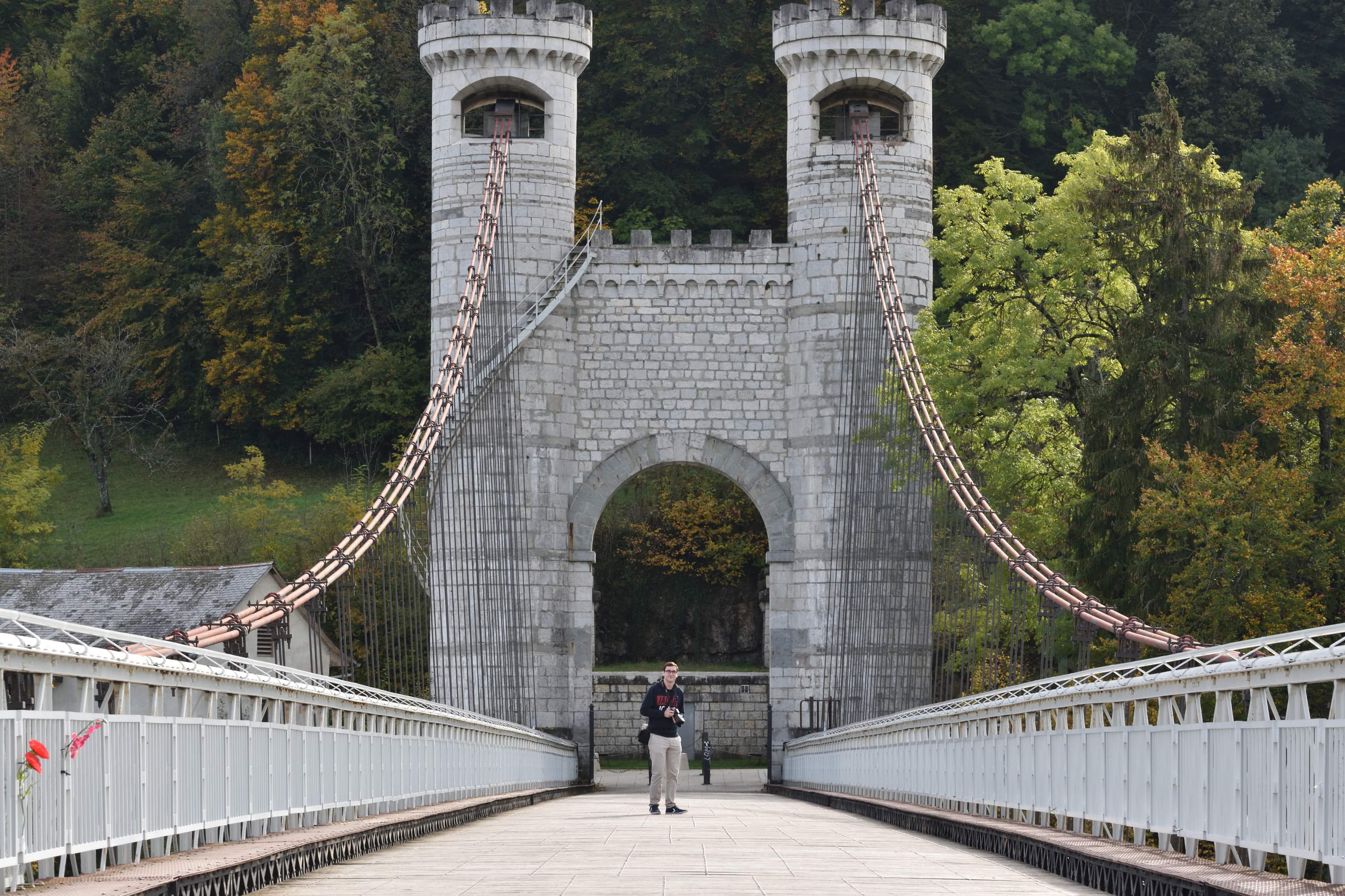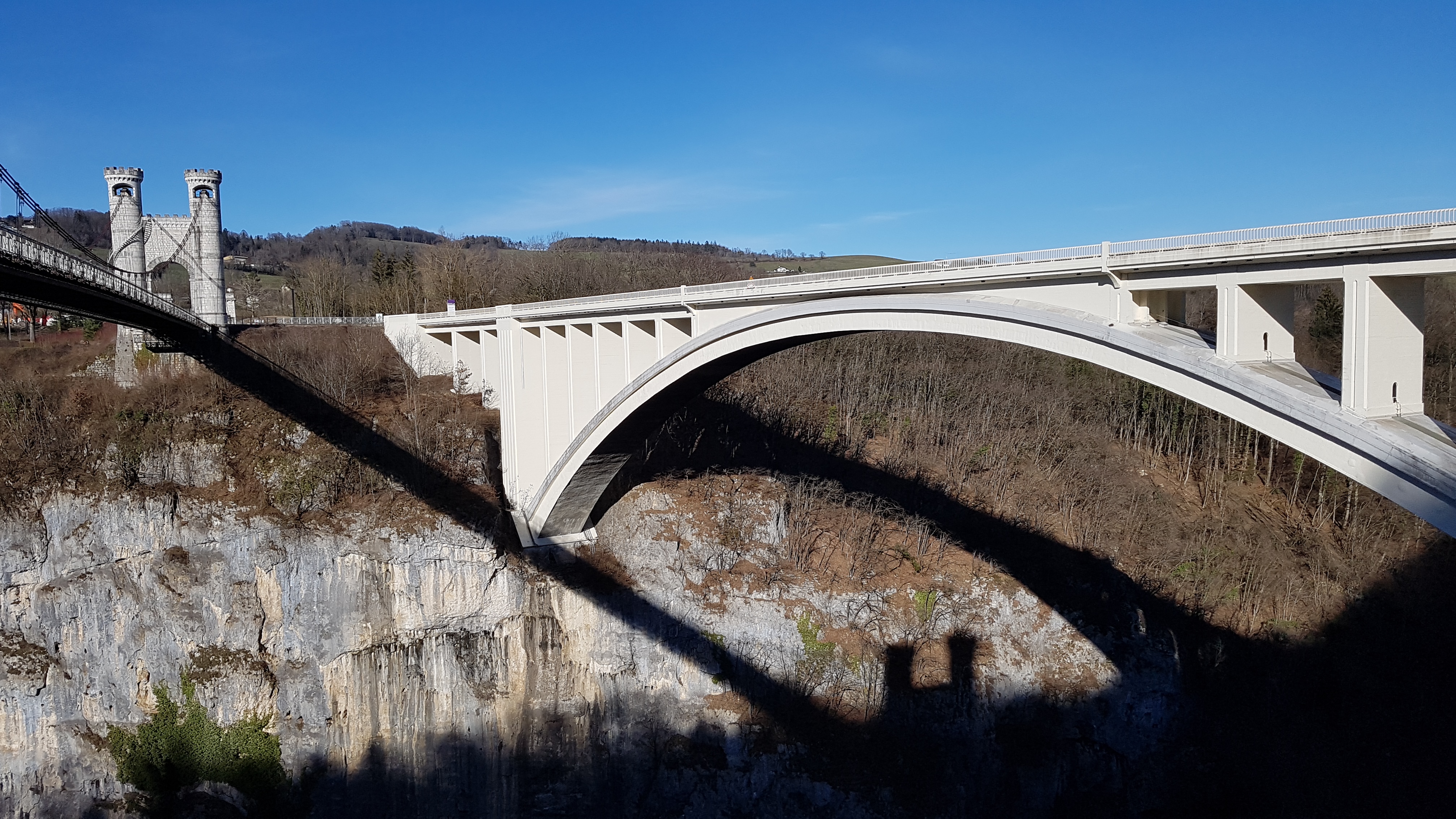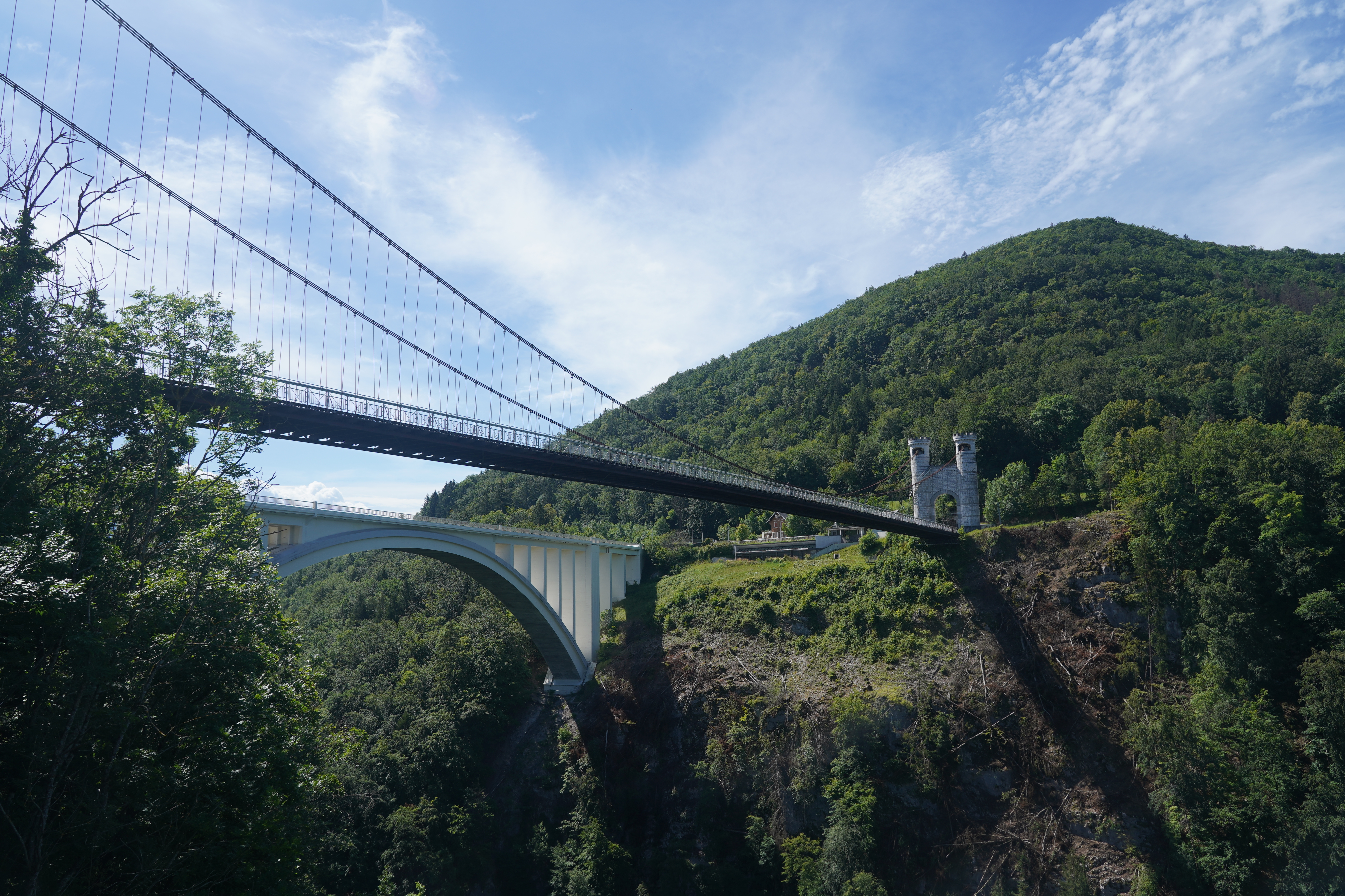 Ce majestueux pont blanc suspendu au dessus des verdoyantes gorges des Usses est remarquable par l'architecture néo moyenâgeuse de ses entrées. Originellement baptisé pont Charles-Albert, cet édifice nous renvoi à une époque où ce territoire appartenait au Royaume de Savoie-Sardaigne. Un parking et des aménagements nous apprennent qu'avant sa construction, il faillait descendre dans les gorges et passer un vieux pont romain pour accéder d'une rive à l'autre. De cette époque antique, le lieu est connu pour sa source médicinale jadis exploitée par un établissement thermal aujourd'hui en ruines.