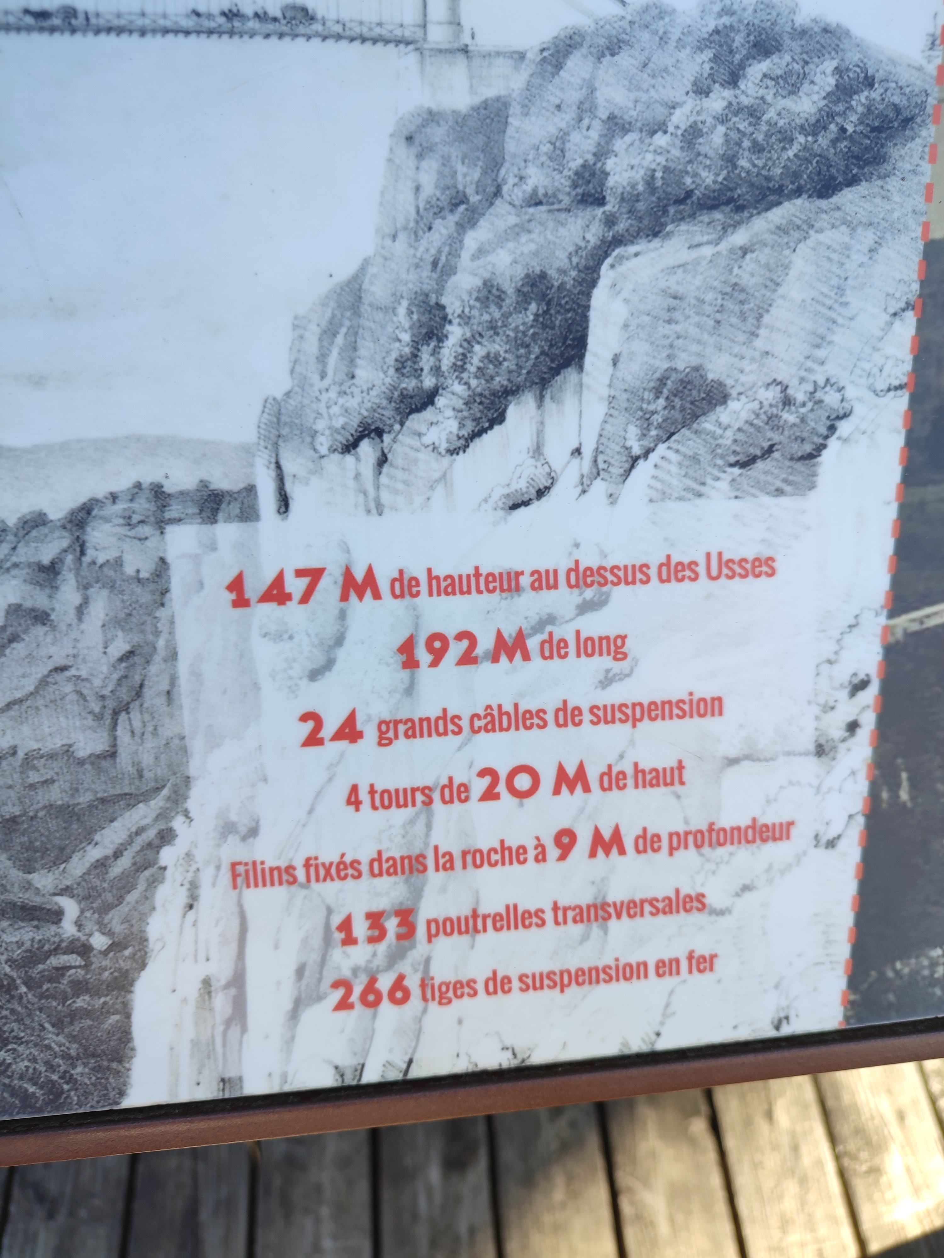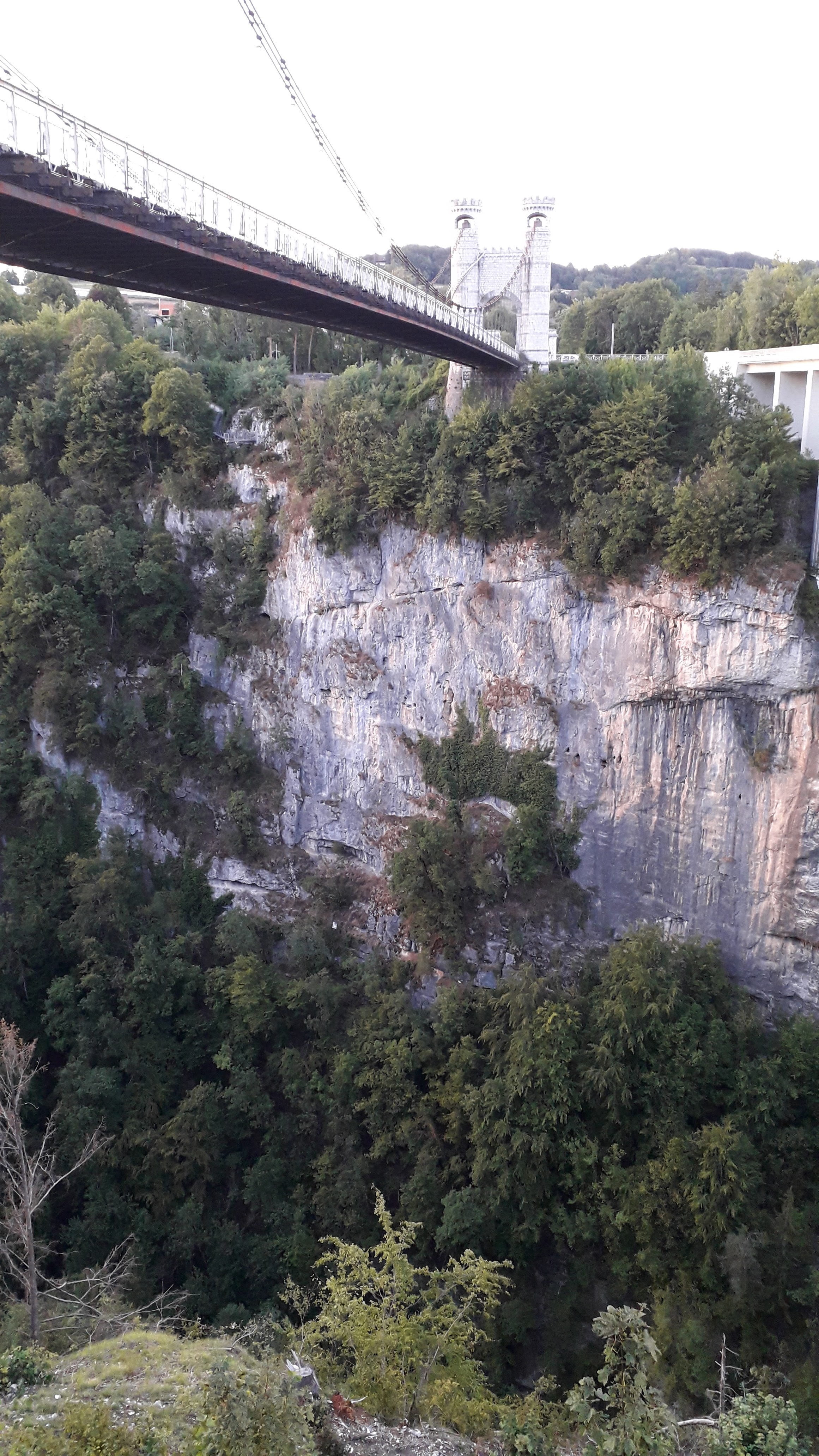 Ouvrage impressionnant, pont suspendu surplombant une vallée étroite et encaissée.