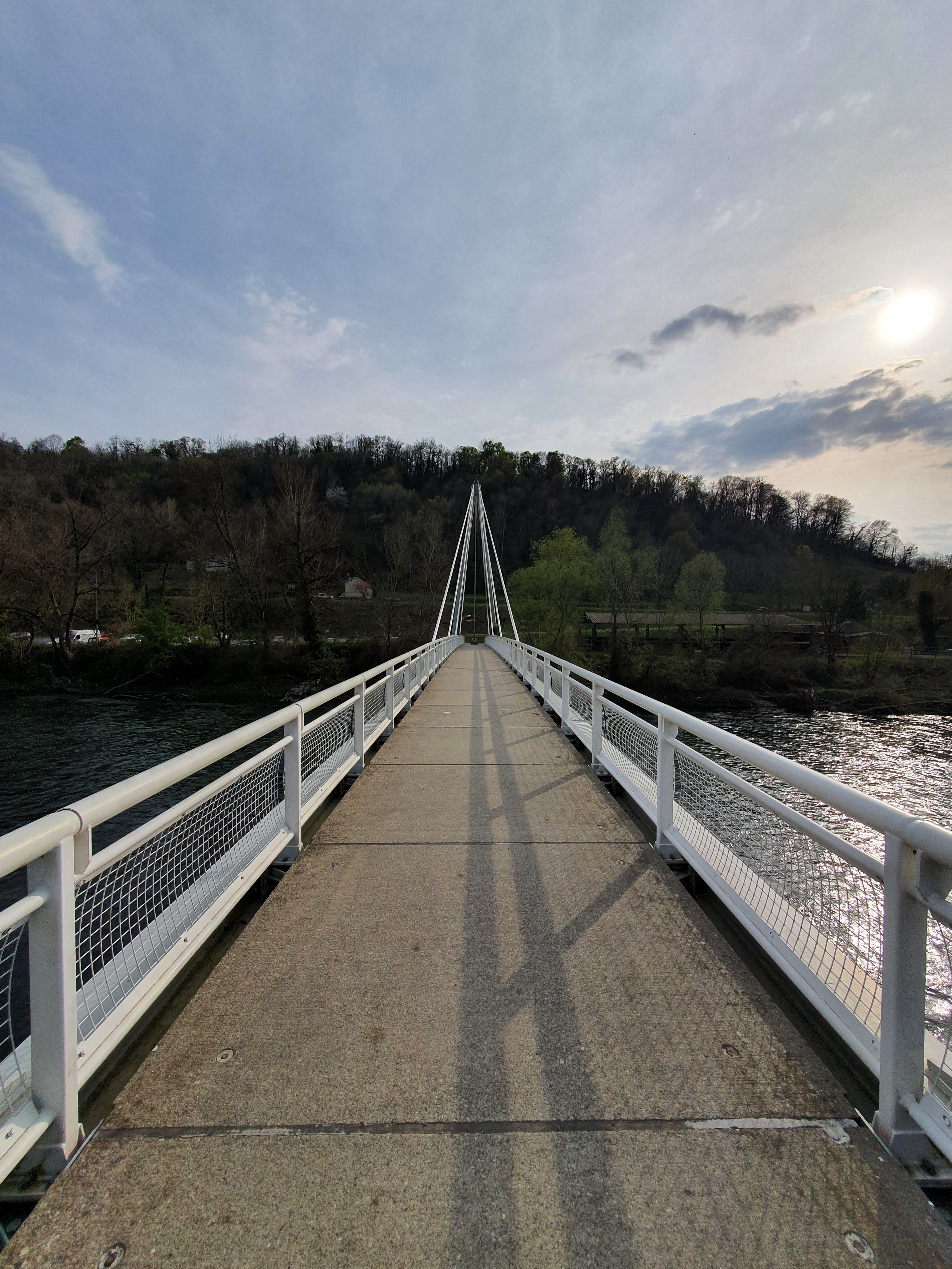 Très pratique pour traverser le gave ! Ouvrage assez imposant par rapport à sa fonction ! Cela offre un joli point de vue sur le gave en amont et en aval. De là on peut observer de nombreux oiseaux 🐦 et des canards 🦆 La passerelle est assez large, on s'y croise facilement. Dessus à l'arrêt vous pouvez sentir un léger mouvement de haut en bas si des poneys ou un coureur se déplacent sur la passerelle