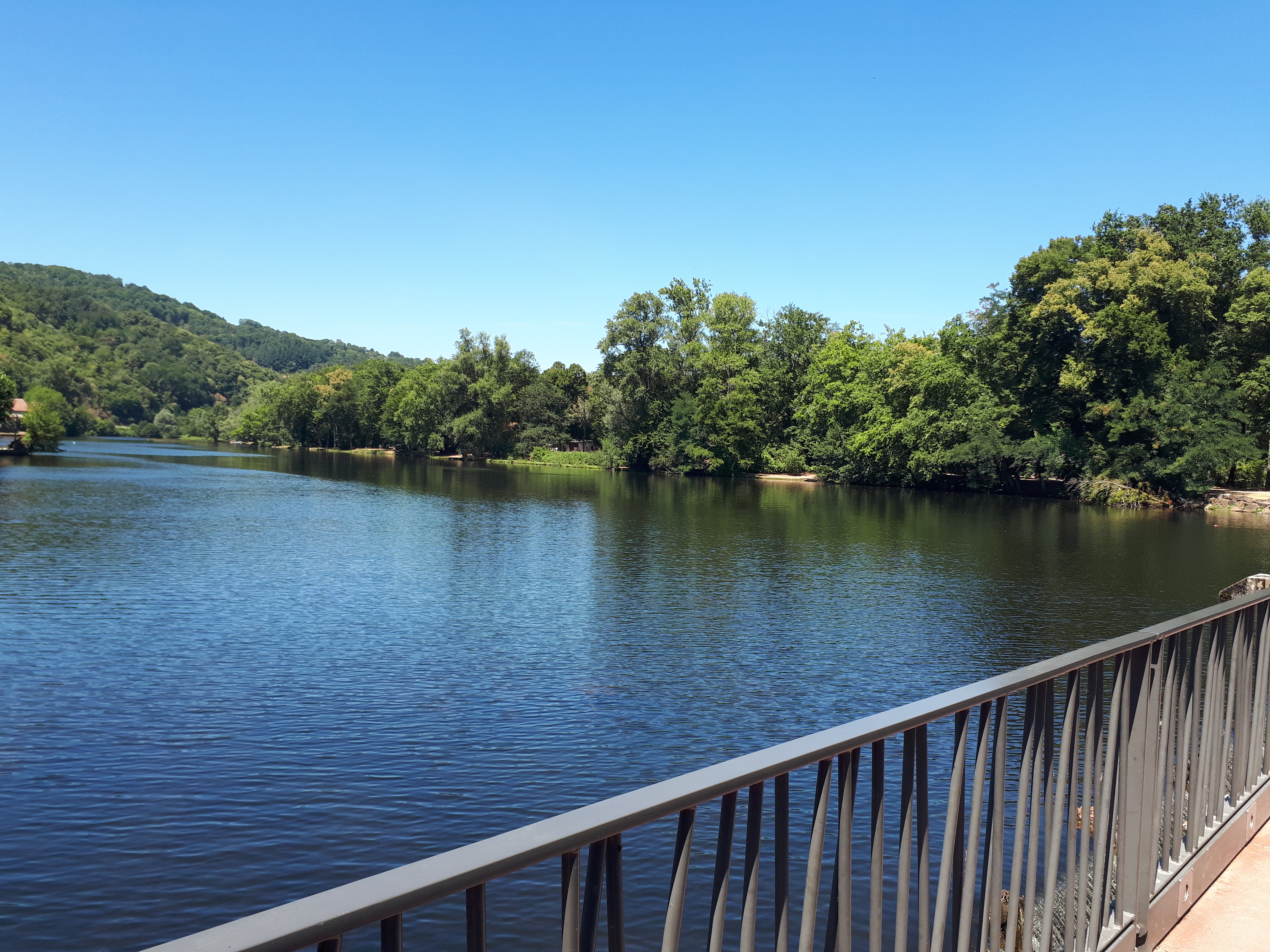 Une passerelle piétonne qui traverse la Dordogne offrant une vue magnifique sur Beaulieu sur Dordogne et sur la passe à poissons (panneau explicatif sur la berge). Paisible et rafraîchissante, une invitation à la ballade.