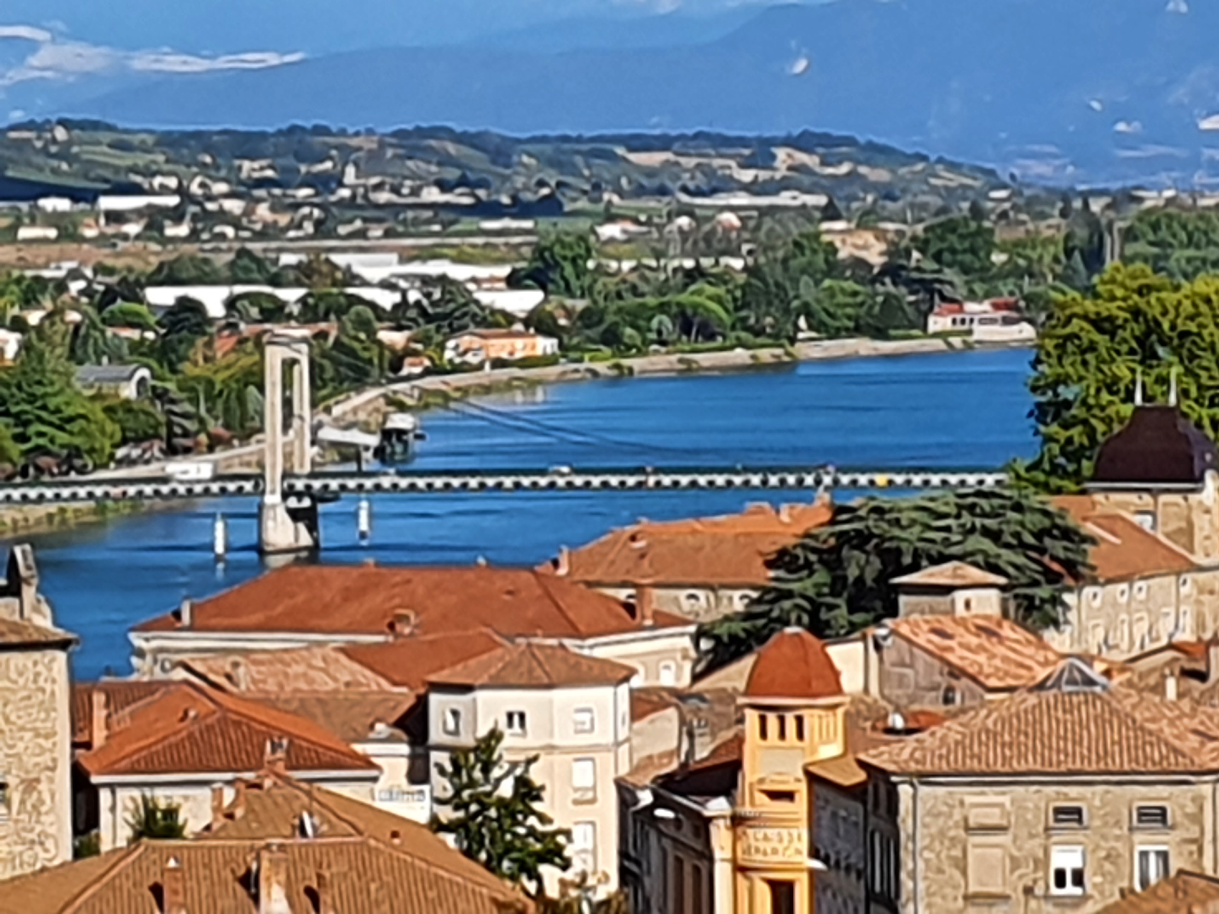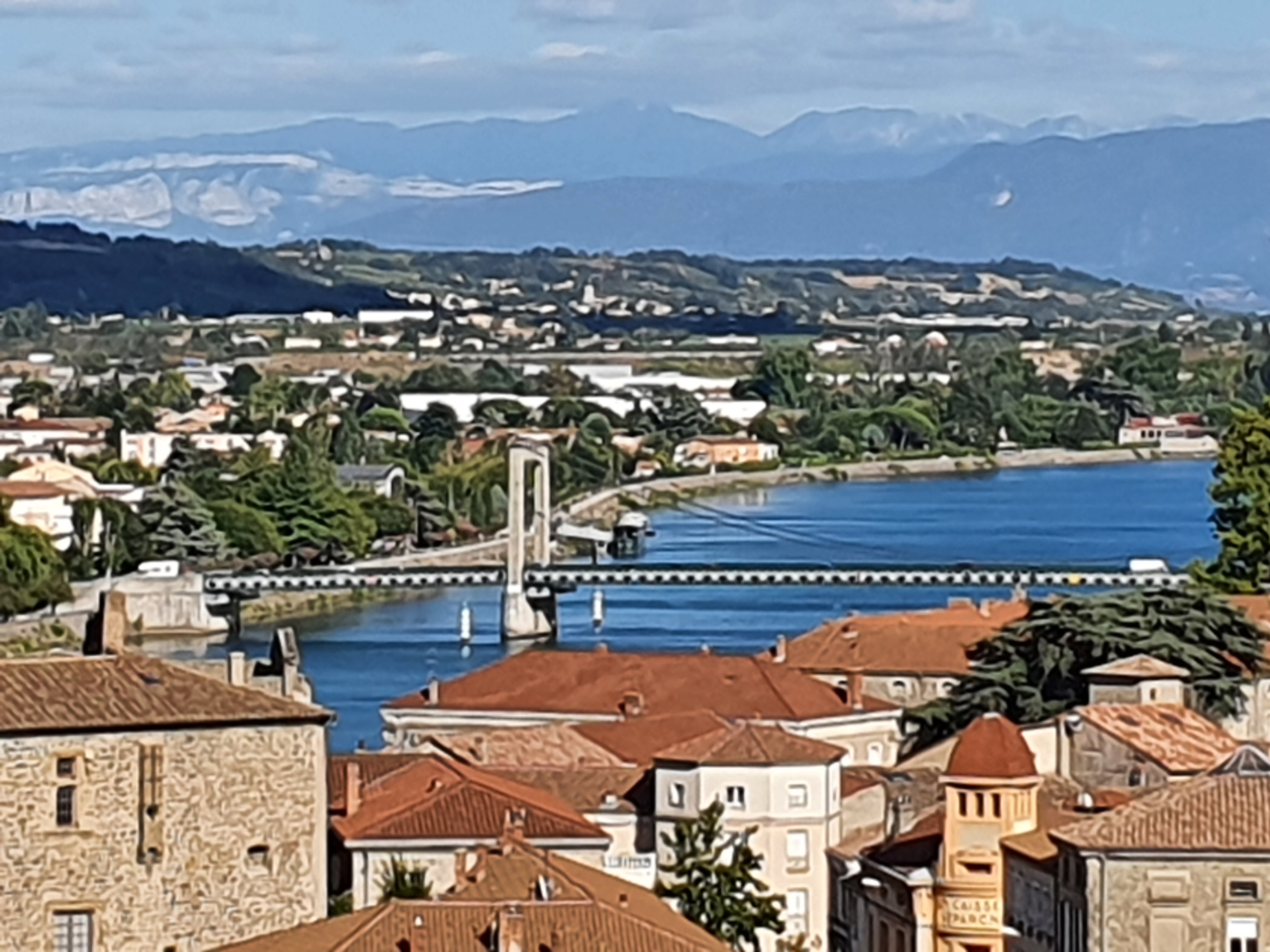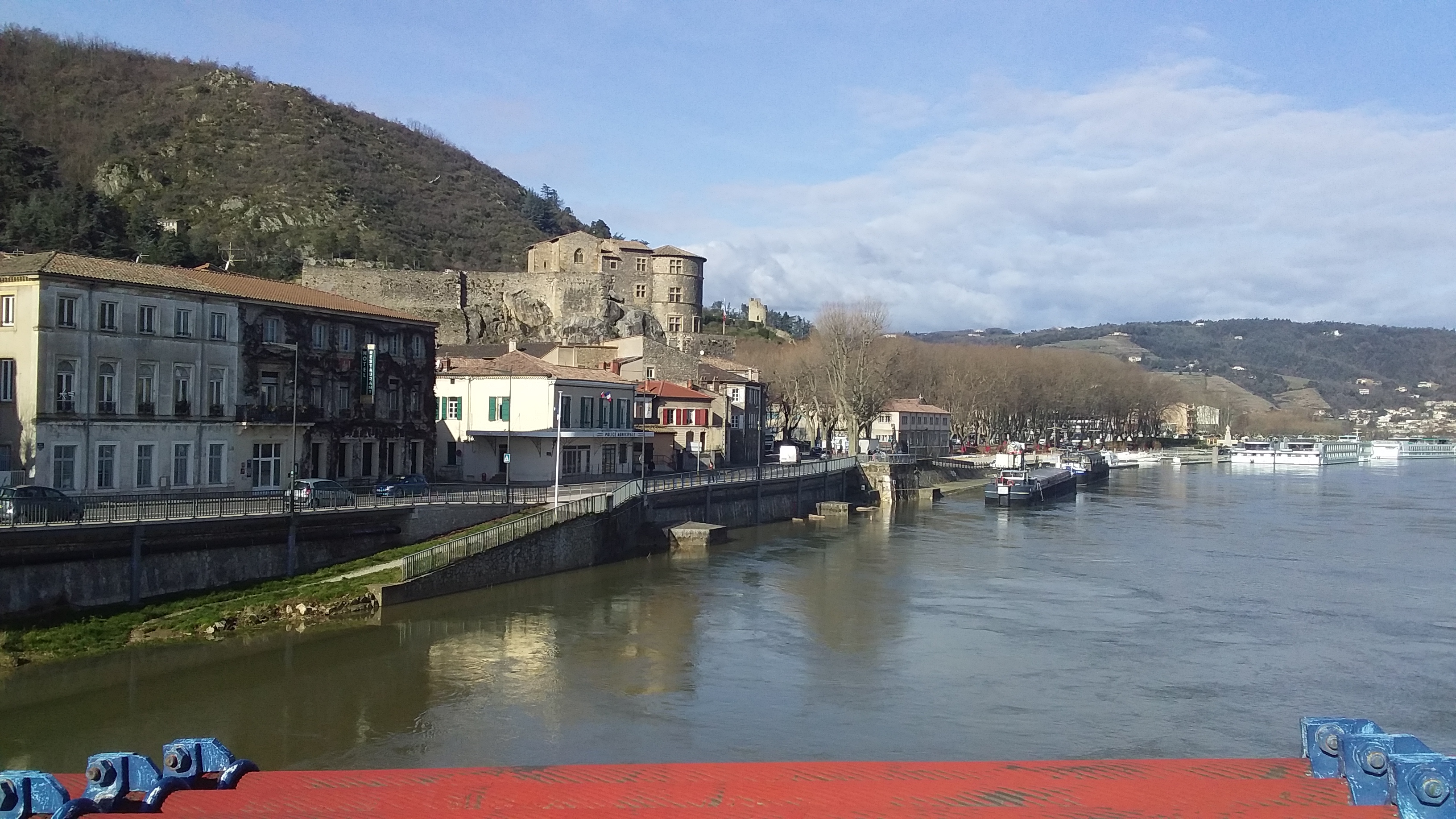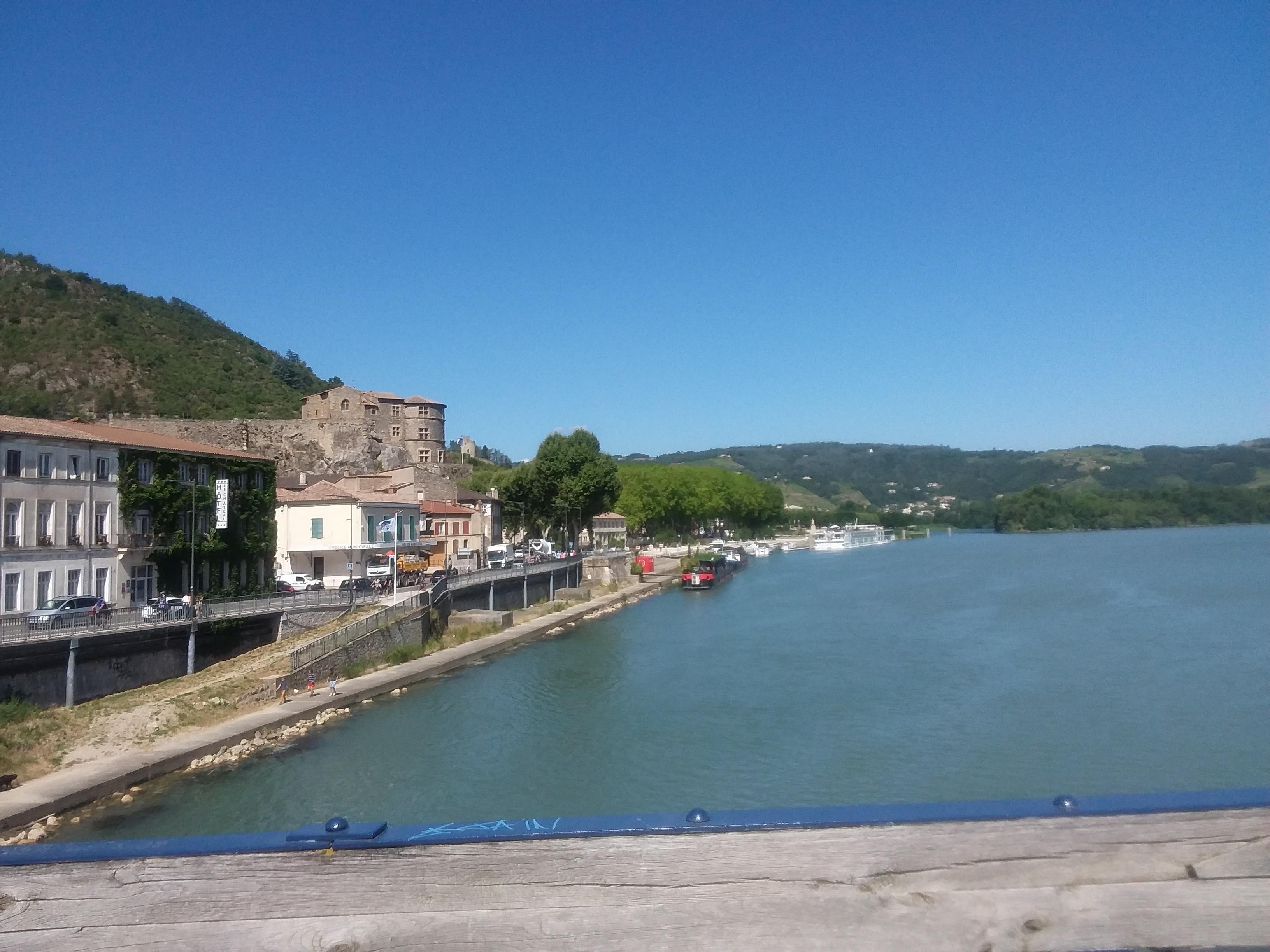 Très belle vue de Tournon sur les coteaux de Tain l'hetmitage, et de Tain jolie vue du chateau belle passerelle pietonne ou l'on peut faire de belles photos péniches et longs Bâteaux de plaisance passent au fil du Rhône.. 👍📷