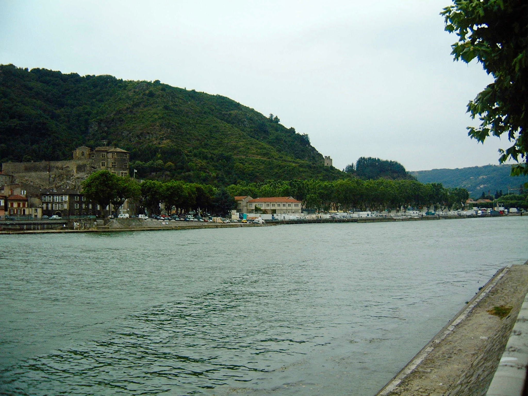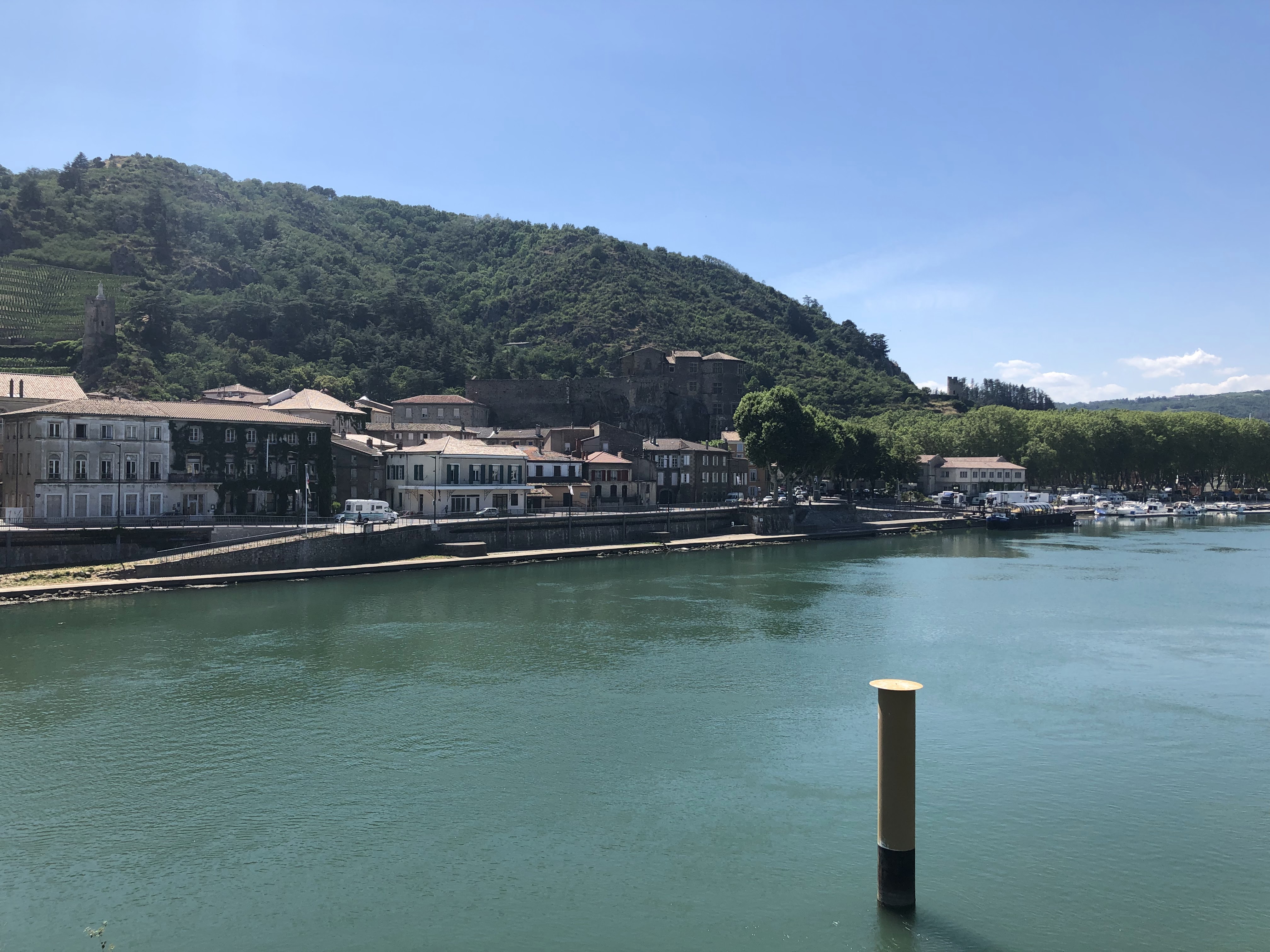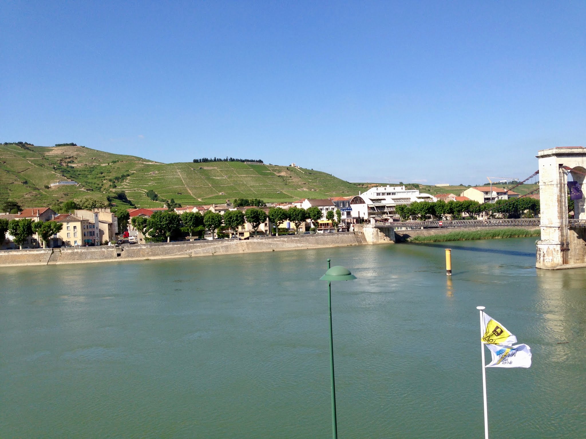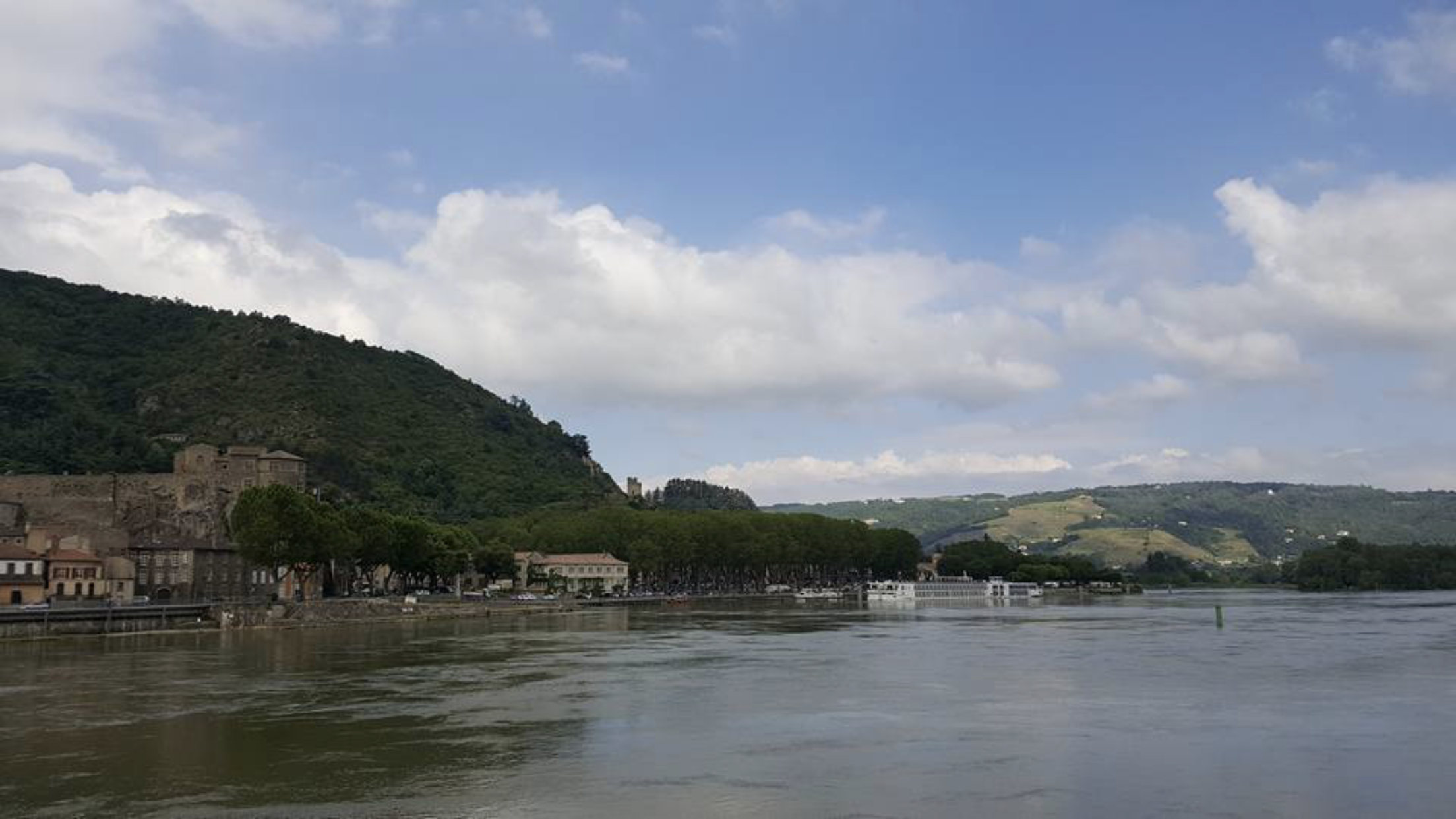 Très belle vue de Tournon sur les coteaux de Tain l'hetmitage, et de Tain jolie vue du chateau belle passerelle pietonne ou l'on peut faire de belles photos péniches et longs Bâteaux de plaisance passent au fil du Rhône.. 👍📷