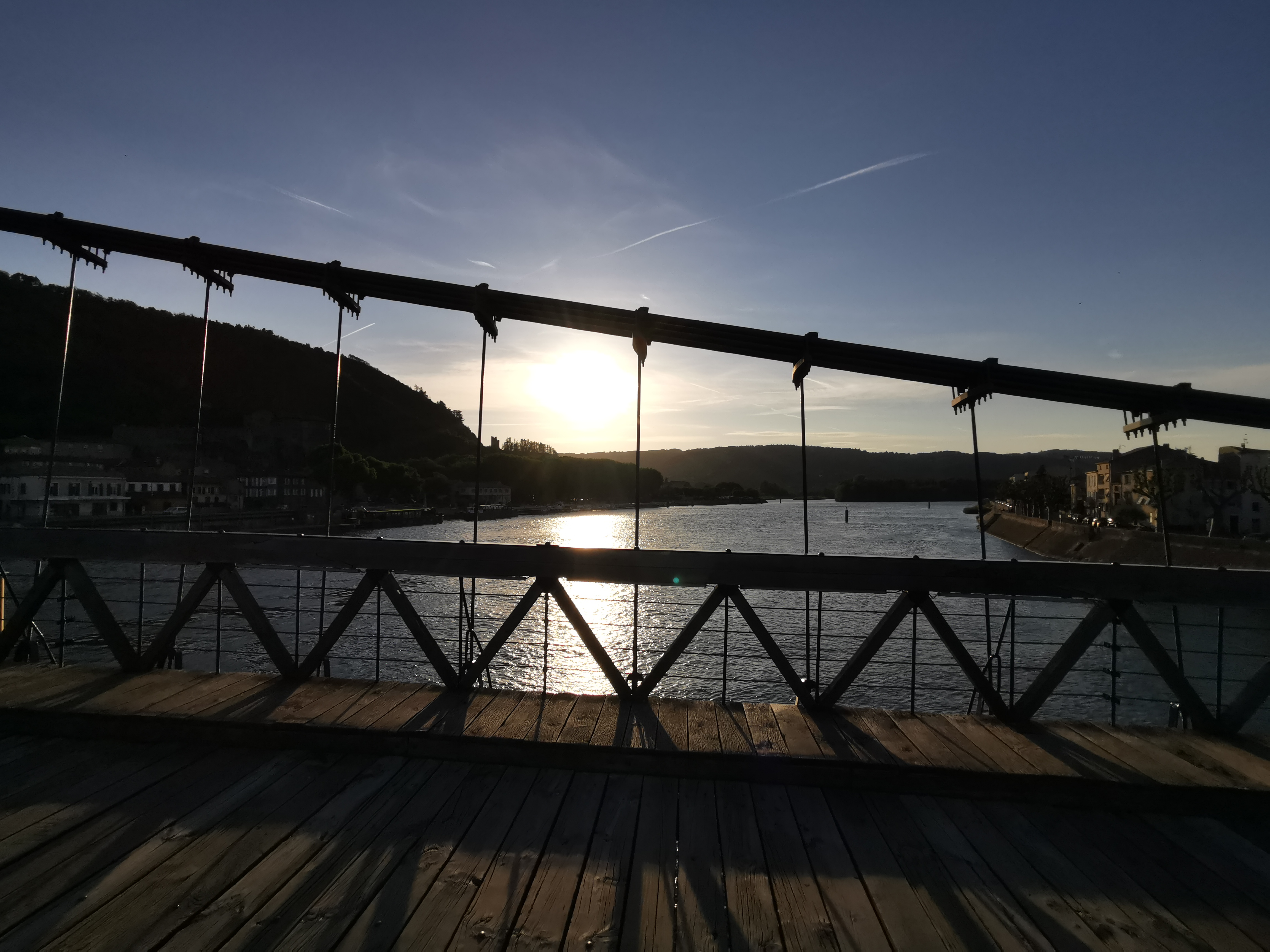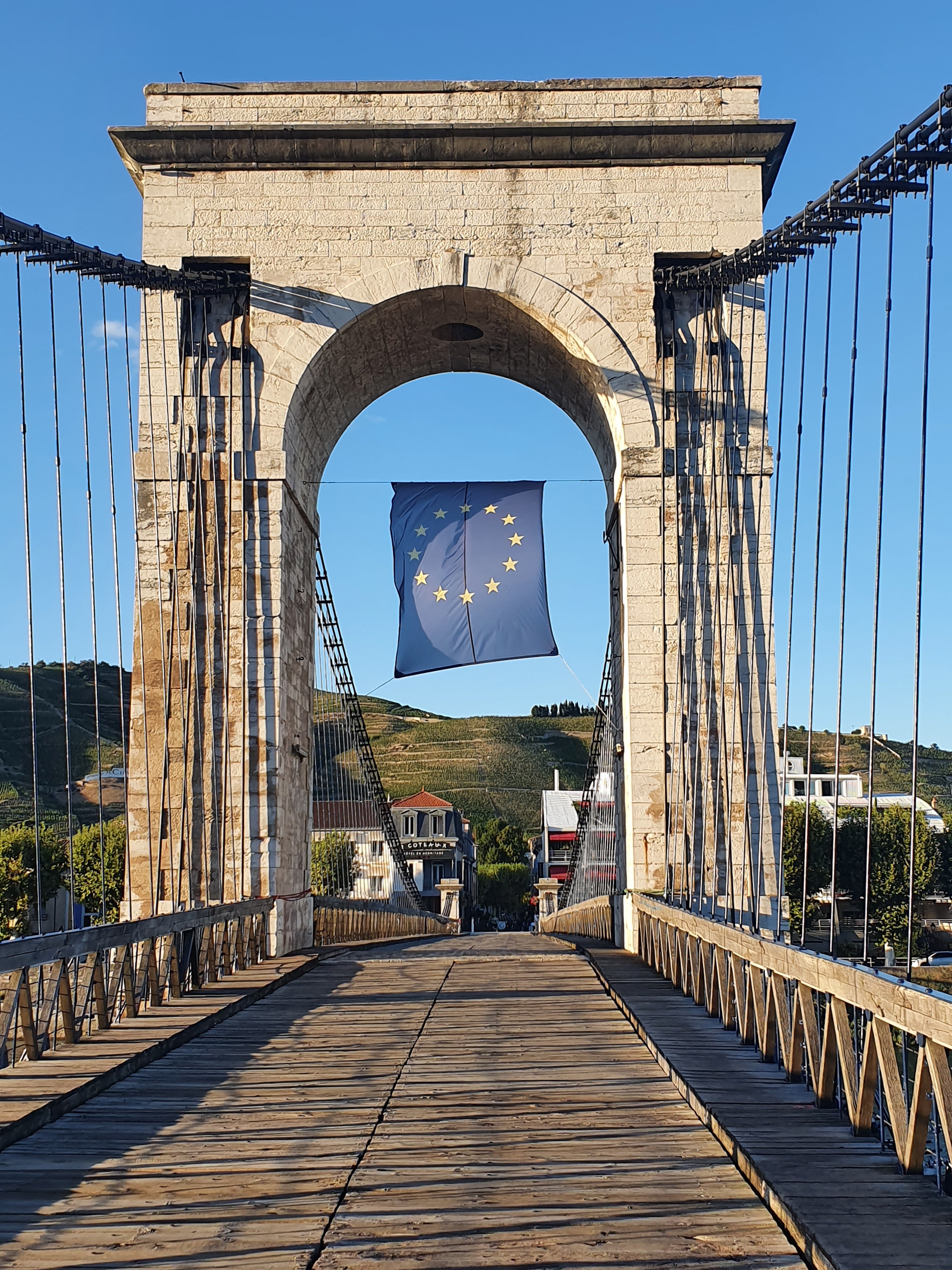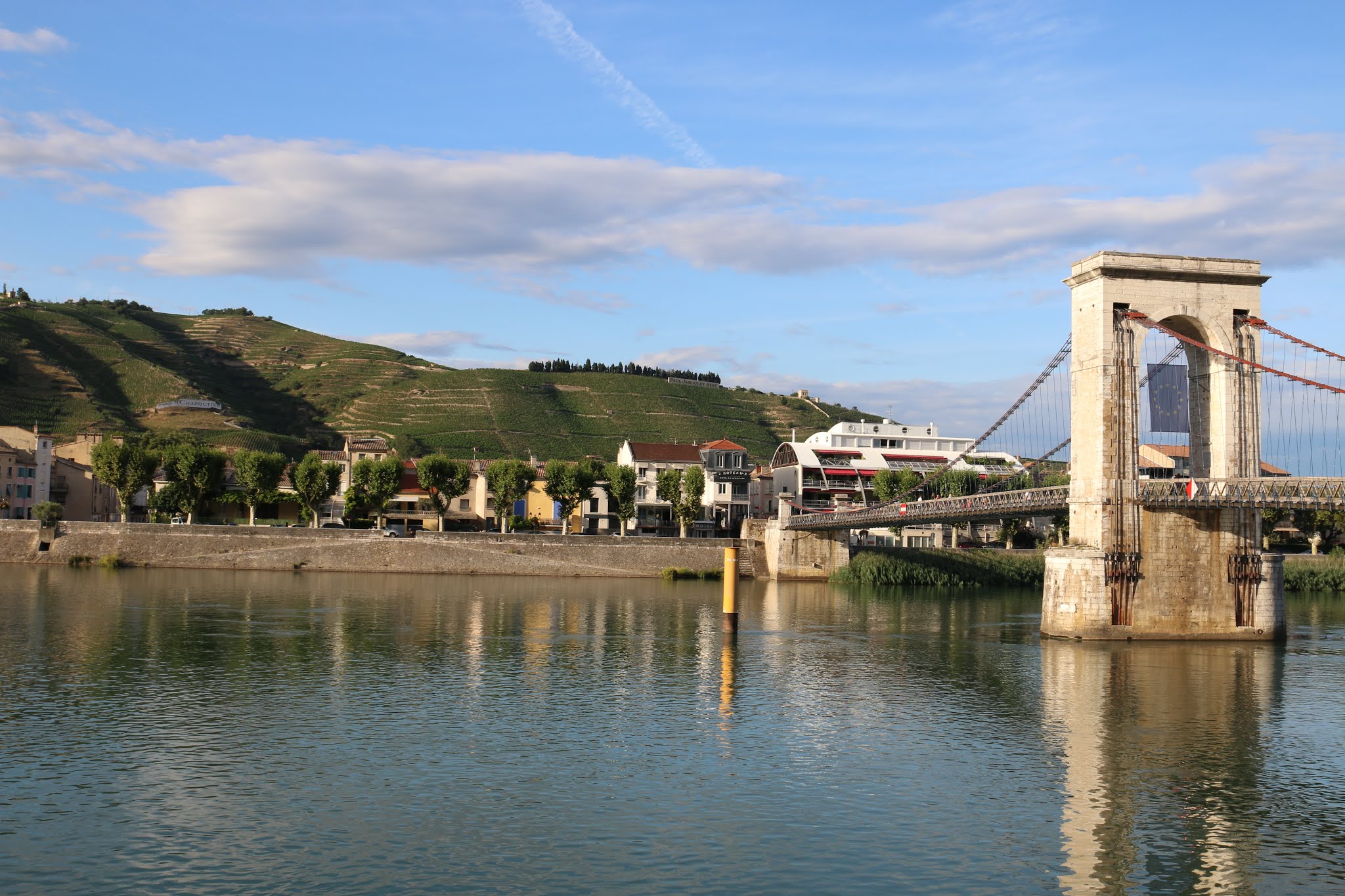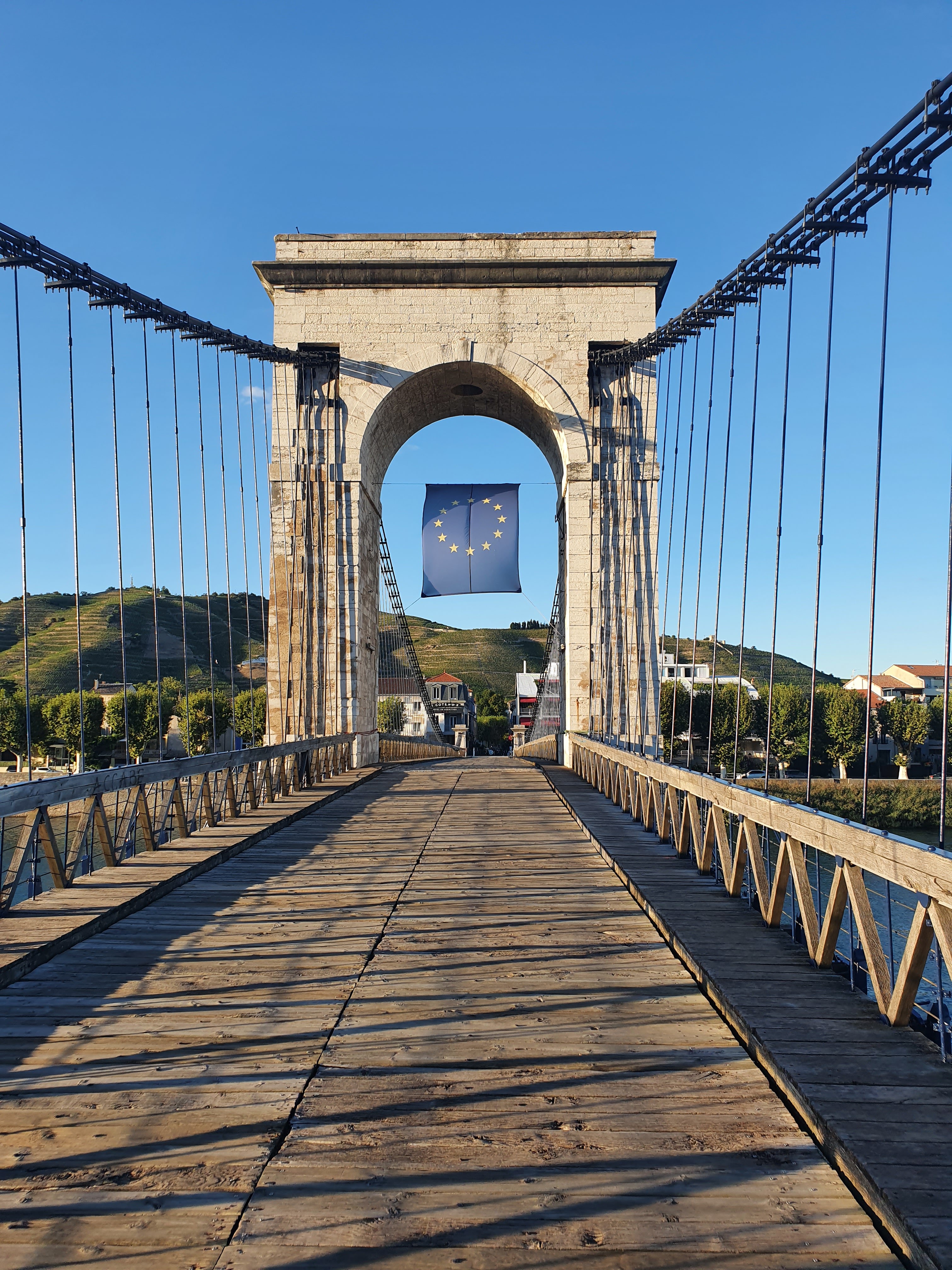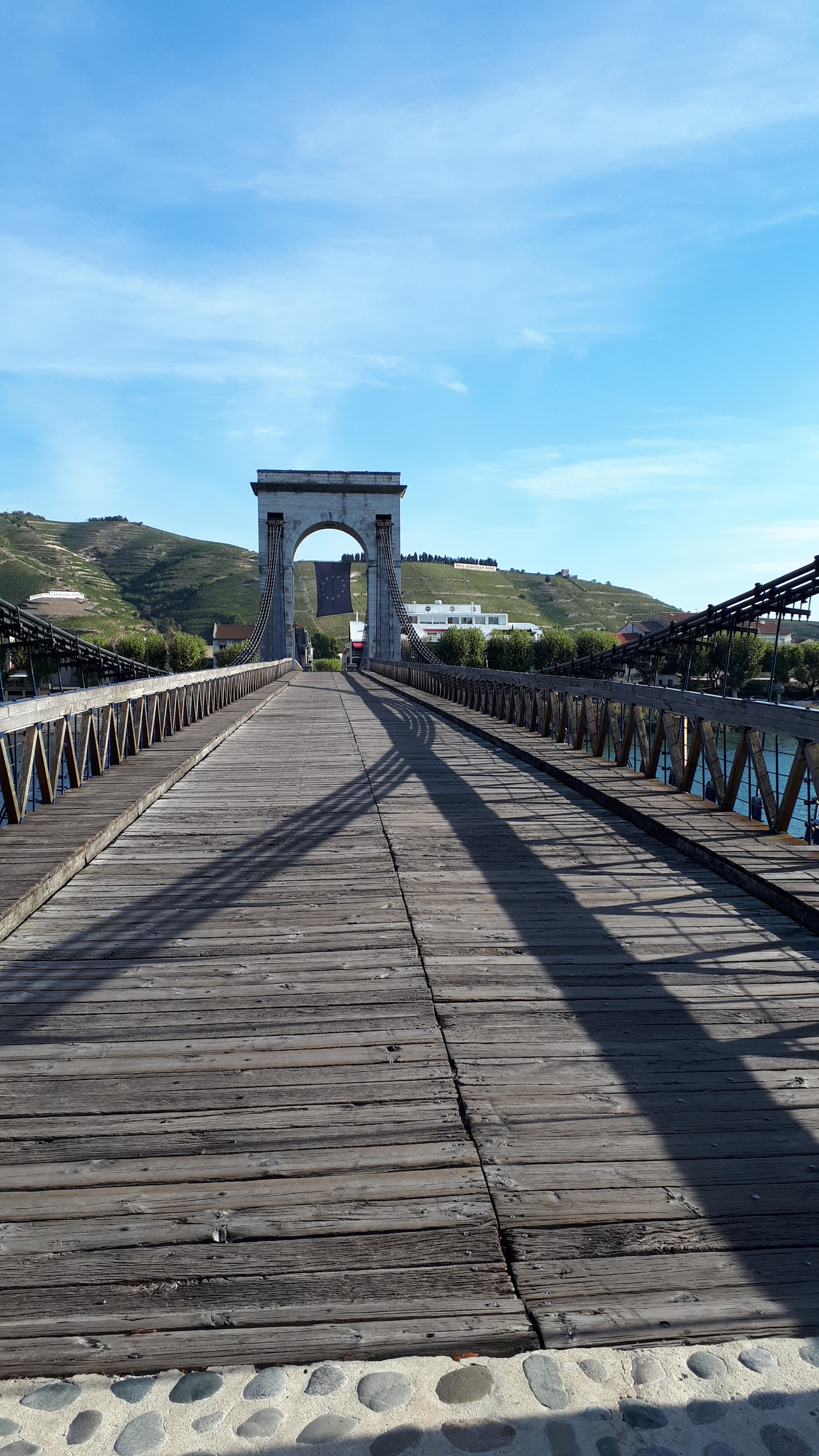 Incontournable passerelle Marc Seguin ! C'est le plus ancien pont suspendu en France datant de 1847 encore en usage avec encore à ce jour un sol tout en bois et désormais dédié aux piétions et cyclistes. Belle vue depuis le fleuve Rhône vers la plaine valentinoise au sud, vers les quais Tain l'Hermitage et le château de Tournon-sur-Rhône.
