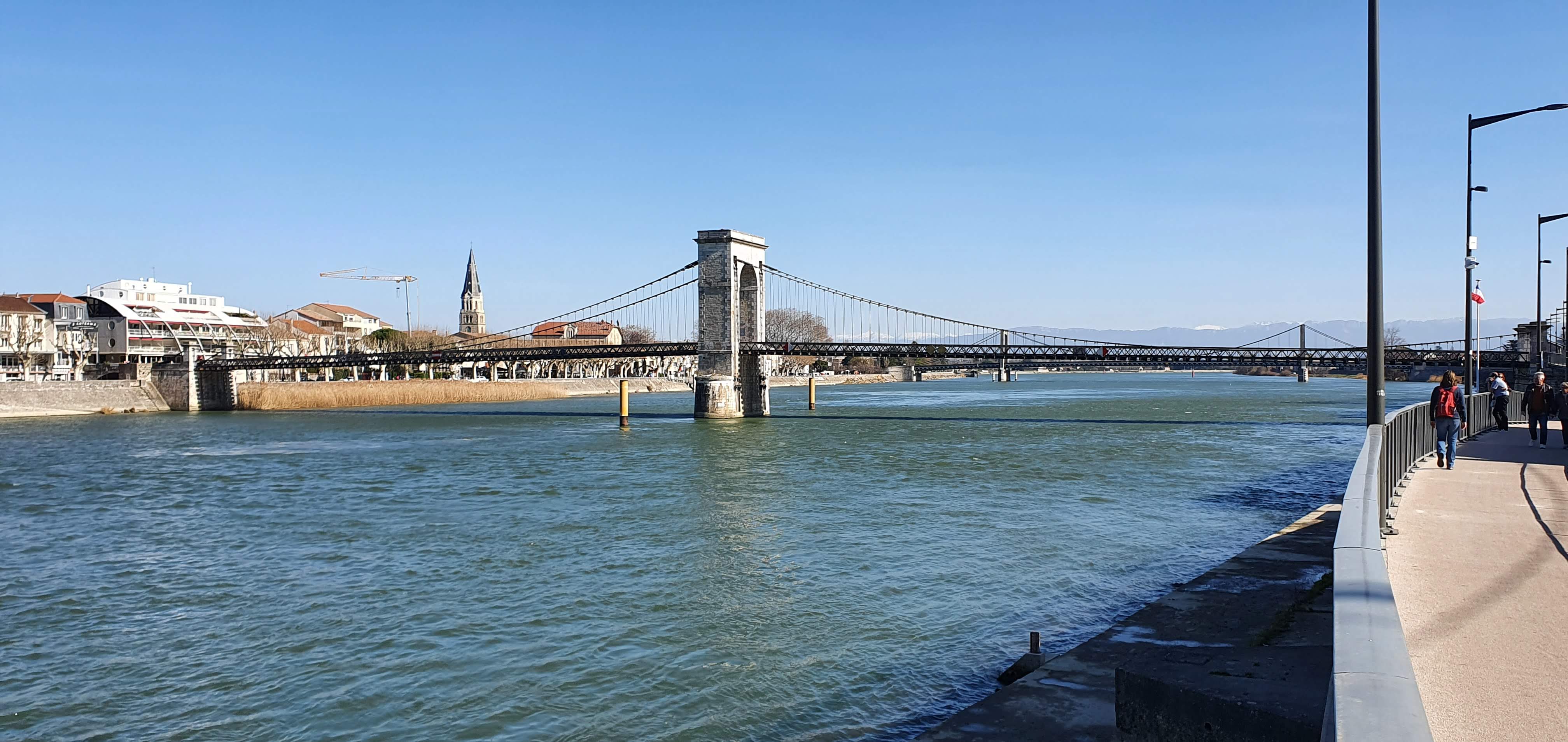 Pont que l'on traverse à pieds. Le Rhône sépare les départements de la Drôme et de l'Ardèche. Vue magnifique.