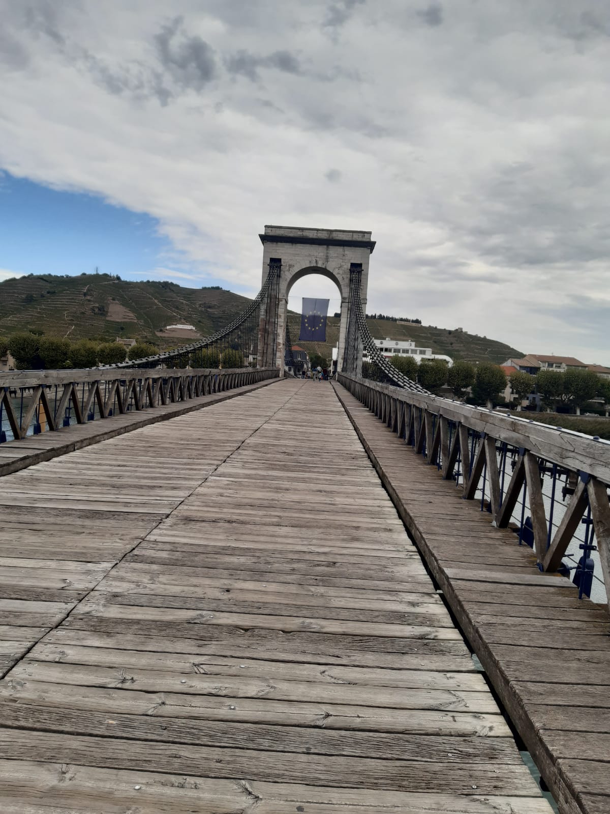 Superbe ouvrage reliant Tournon-sur-Rhône et Tain-l'Hermitage, c'est-à-dire séparant la Drôme de l'Ardèche au-dessus du Rhône. C'est une passerelle, avec un platelage en bois et des câbles métalliques, uniquement réservée aux piétons et aux cyclistes qui offre une magnifique vue de part et d'autre de ces deux villes, et sur les coteaux qui les bordent. Y déambuler fut un vrai plaisir. Prendre l'autre pont, qui lui est parallèle et sur lequel roulent les voitures, serait une grossière erreur !