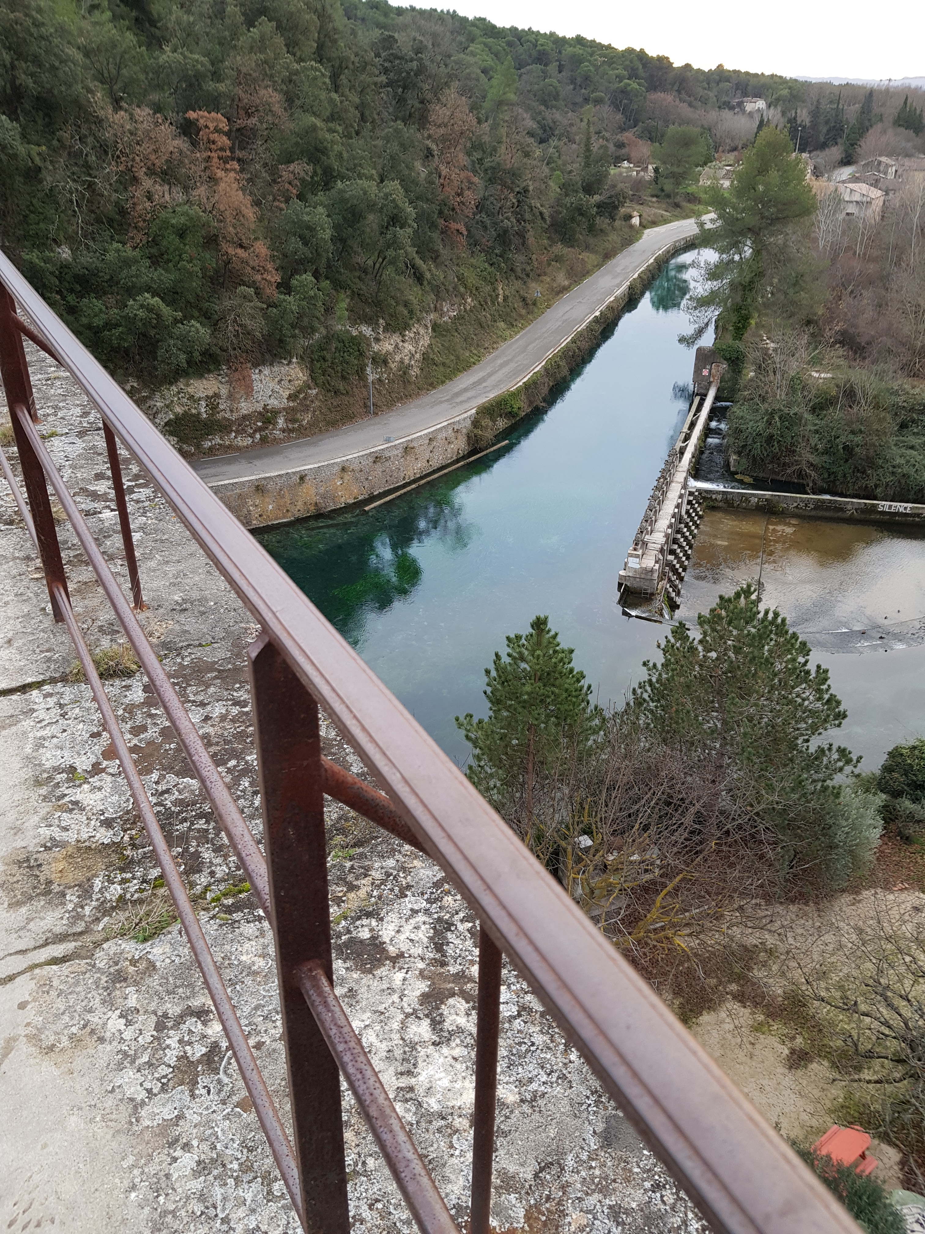 Lieu original, on ne pense pas en étant sur la route en-dessous qu'il y a cet ouvrage original, le pont est la continuité du canal de Carpentras. La baignade y est interdite, lorsque l'on est là-haut, on a un joli point de vue sur la Sorgue