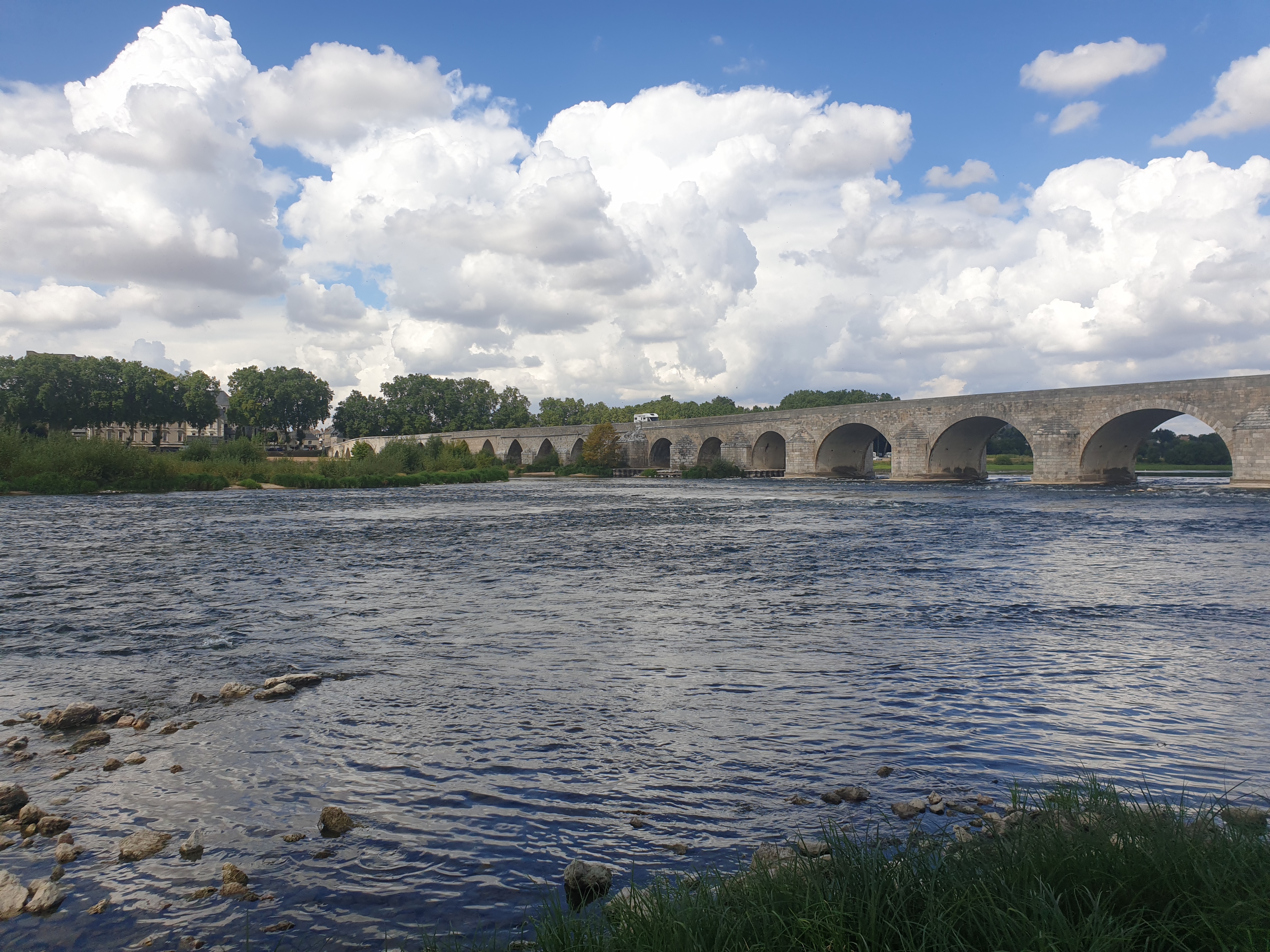 Pour une belle ballade et de jolies vues sur la Loire. Le premier ouvrage daterait du 11ème où 12ème siècle selon les sources. Il s’agissait de deux ponts en prolongement appuyés sur une île située au milieu du fleuve et équipés chacun d’un pont Levis. Mais les crues de la Loire sont terribles et l’une d’elle emporta les deux ponts et l’île. On construisit alors au 14ème siècle un ouvrage en maçonnerie qui fut modifié au cours du temps à cause de destructions partielles dues aux intempéries, aux guerres et aux bombardements. Cet ouvrage du 14ème siècle nous arrive aujourd’hui comme une succession de ponts de conceptions diverses mais harmonieusement réalisée. 460 mètres de long, 24 arches de formes et dimensions diverses et de multiples techniques utilisées : pierres, béton armé ou béton projeté etc...