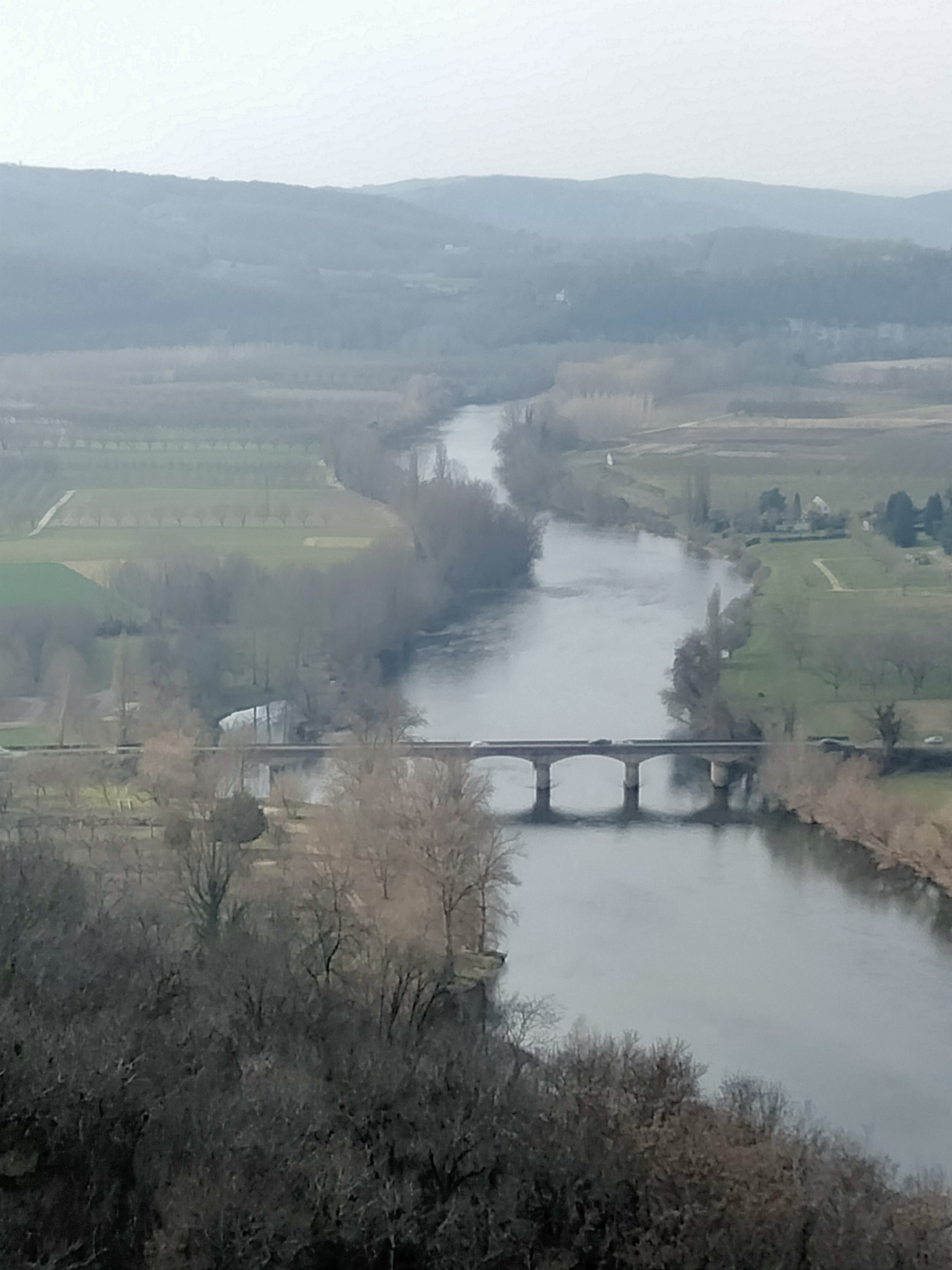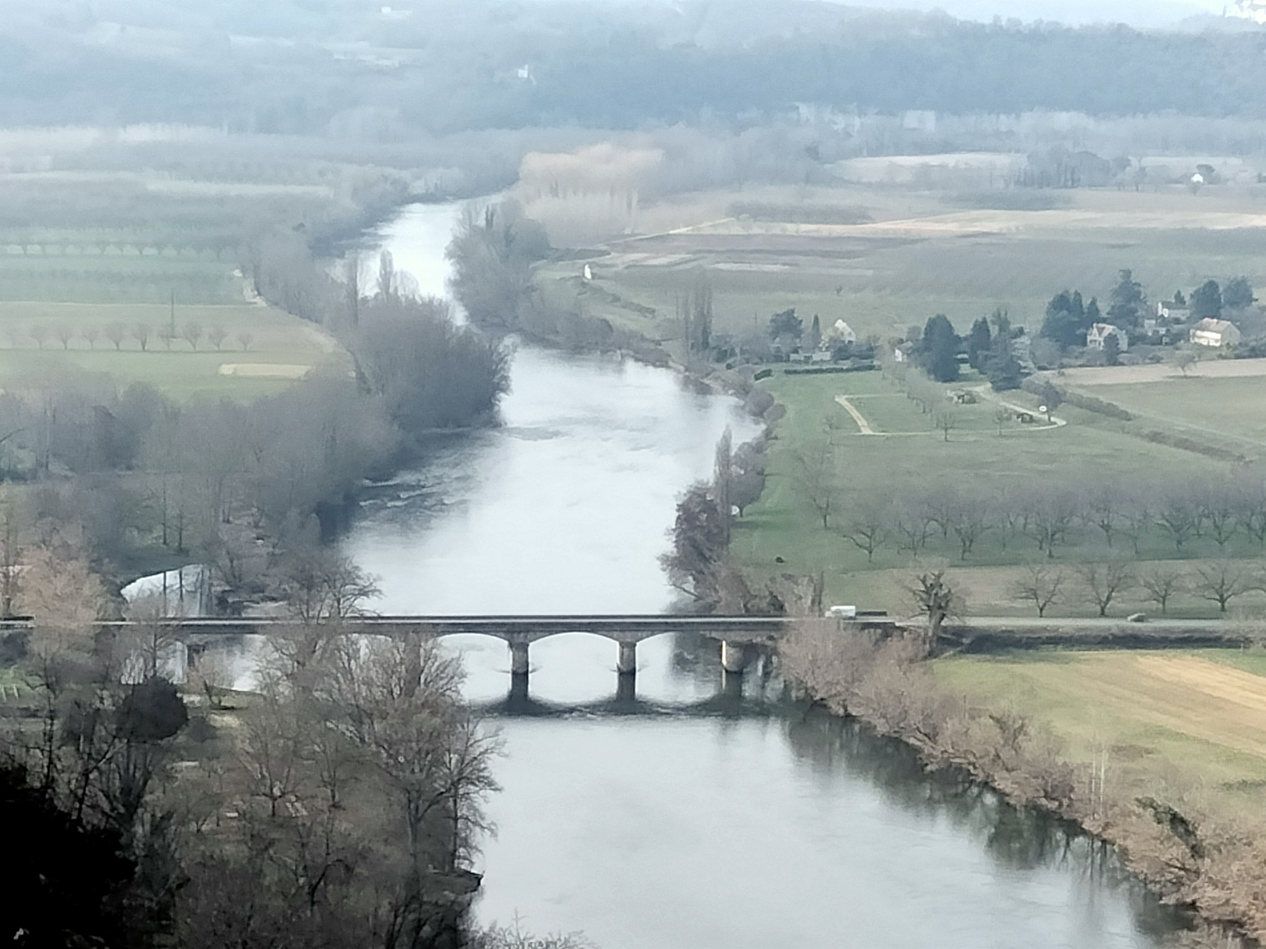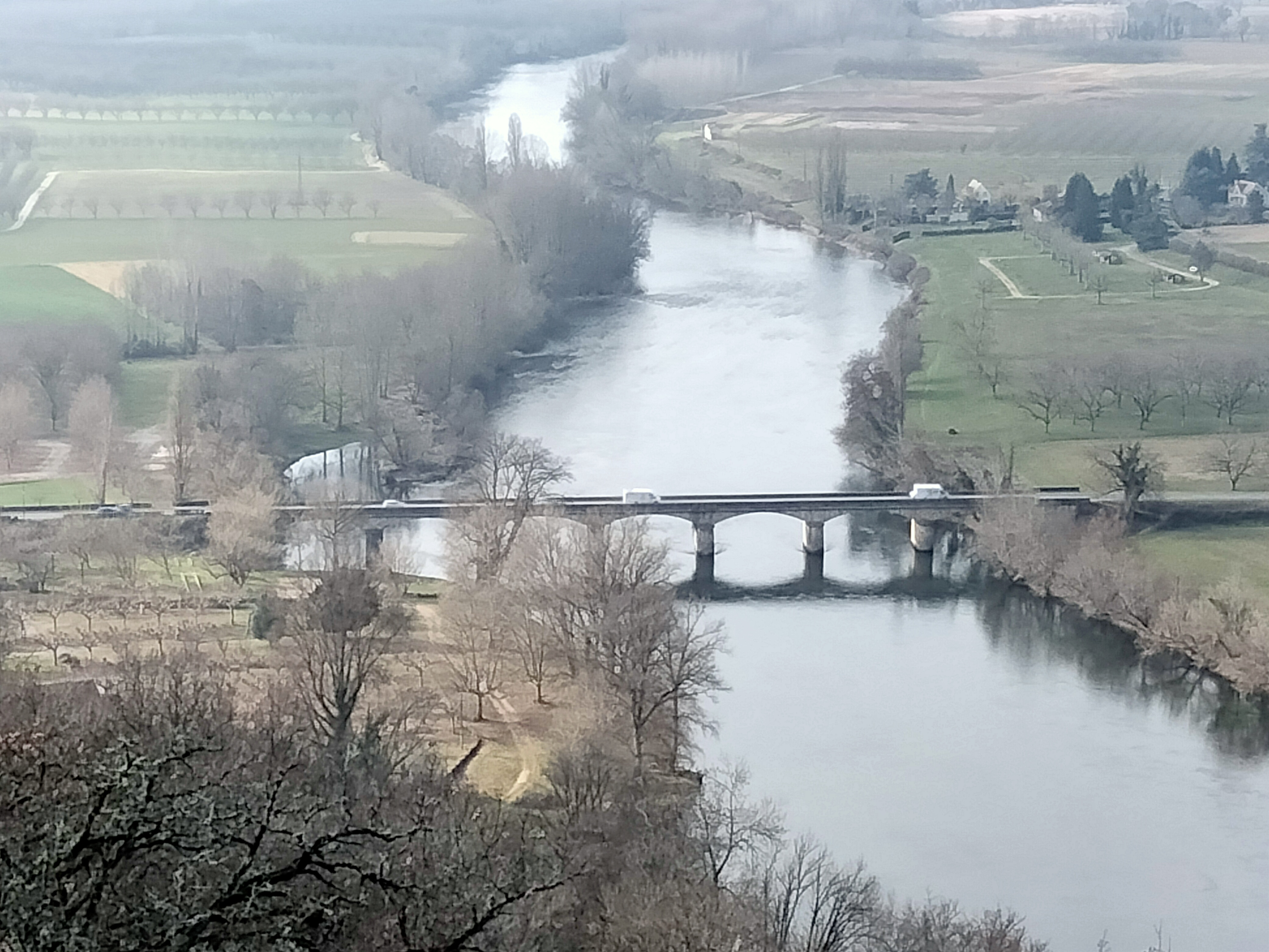 Du haut de Domme, vous avez une vue plongeante sur ce pont. Un joli jeu de reflets sur la Dordogne. Inversement en passant par là, vous pouvez voir en haut d'une grande butte la magnifique ville de Domme. Le parapet est un petit mur de pierre