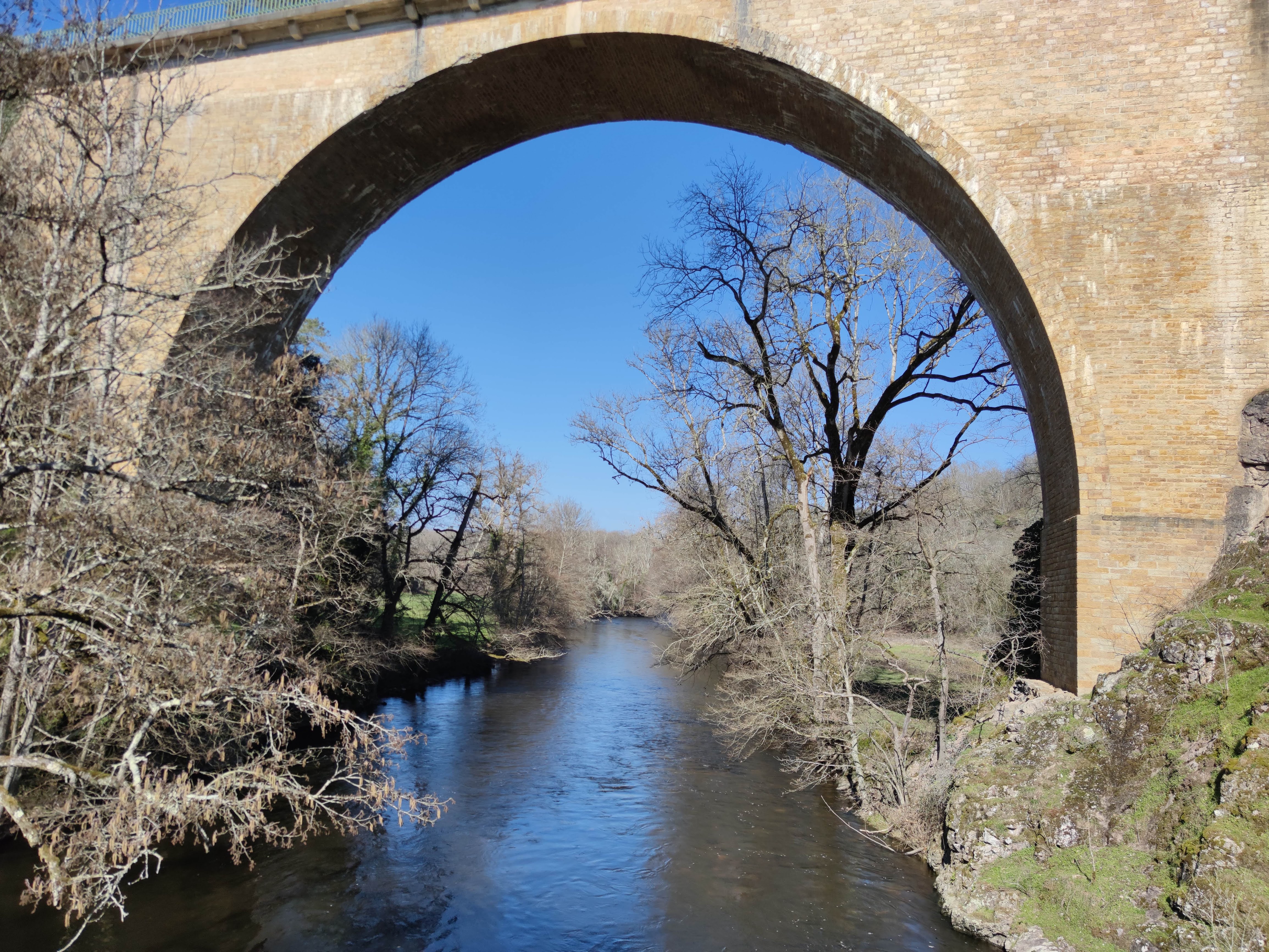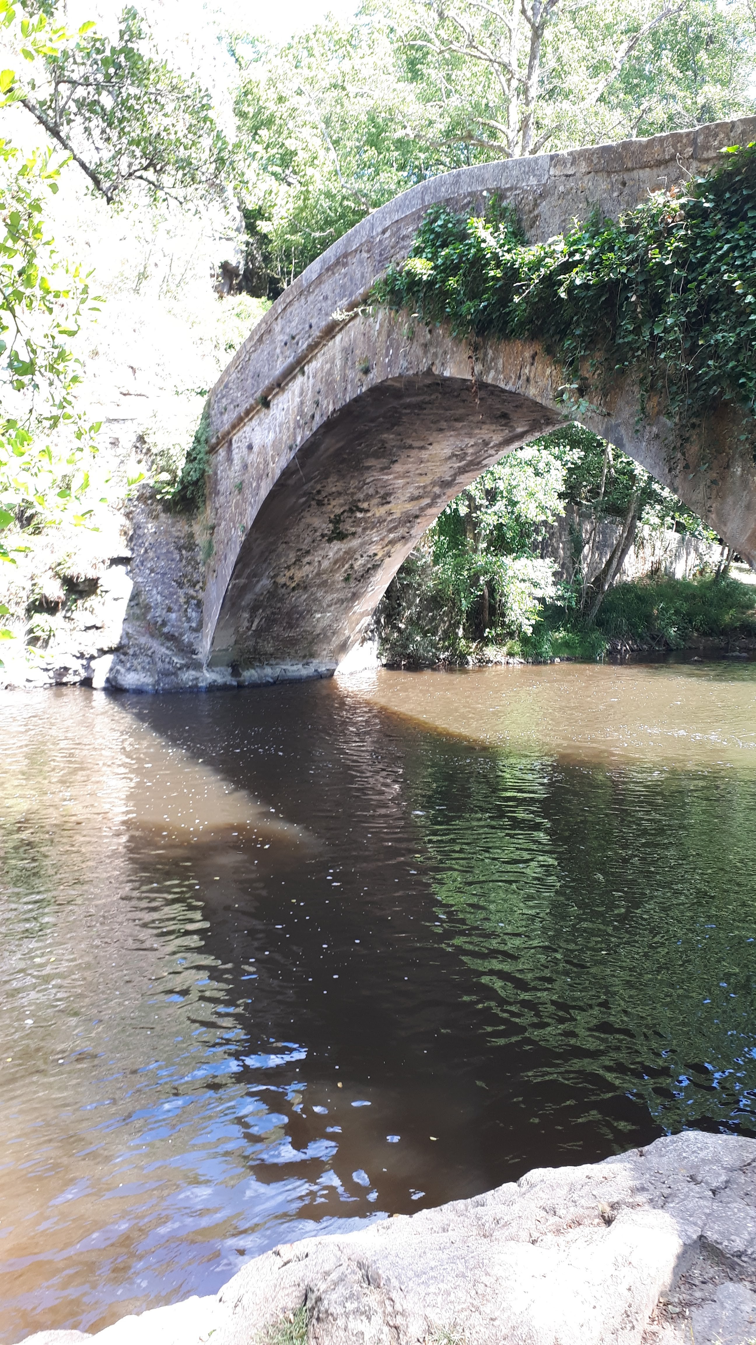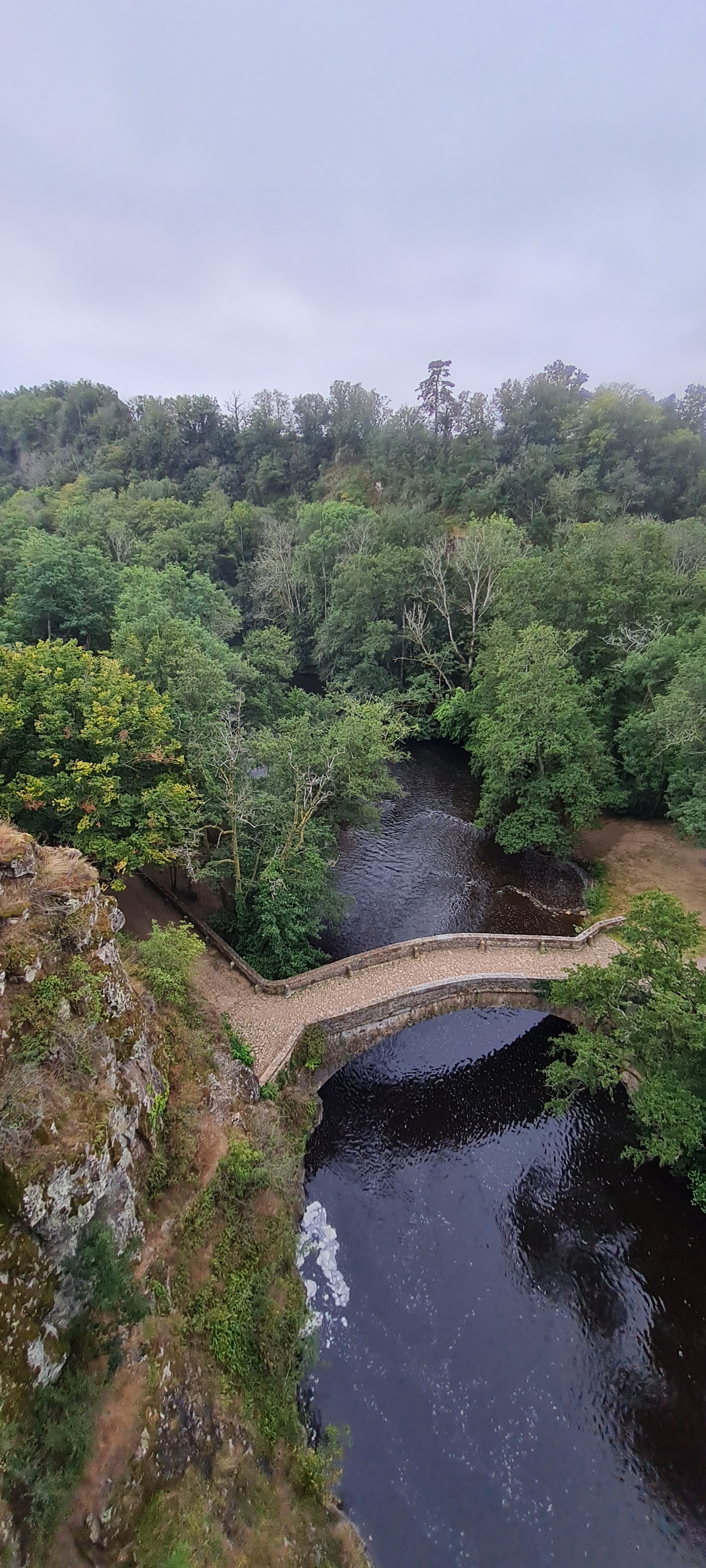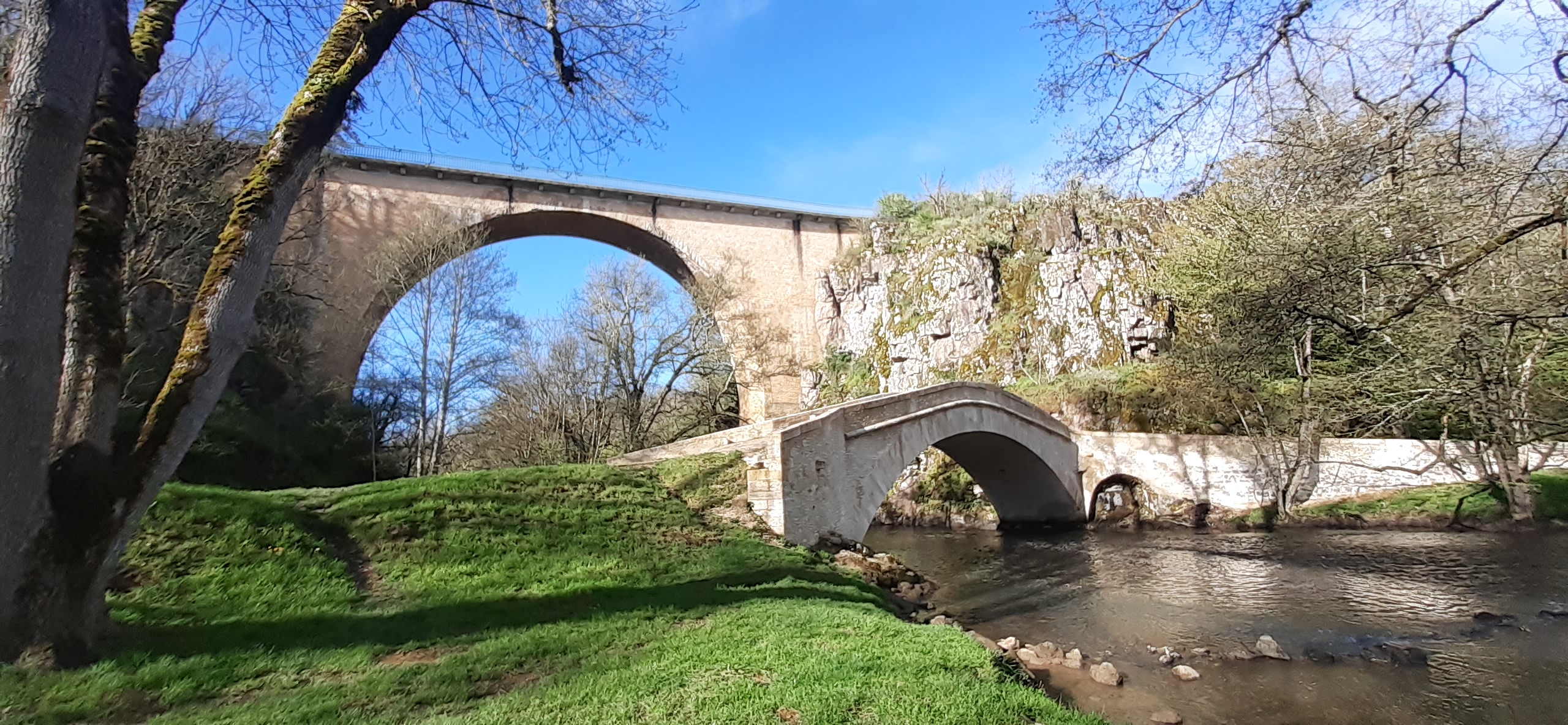 La route pour aller au parking est étroite, on se gare à quelques dizaines de mètres de la rivière, arrivée de nombreux canoës. Jolie vue, à la fois sur le vieux pont (superbement rénové) et sur le nouveau plus haut. Nombreux spots pour se poser pour quelques instants ou la journée, à l'ombre des arbres. Plusieurs tables de pique nique. Petite promenade de 45 minutes à faire le long de la rivière à droite après avoir traversé le pont. Facile d'aller dans l'eau, peu profonde en août 2022. Nombreuses écrevisses, surtout le long de la berge après avoir traversé le vieux pont, dans le renfoncement juste avant l'arbre tombé au sol sur le chemin qui est à 1 mètre de l'eau. Gare à vos doigts 😉