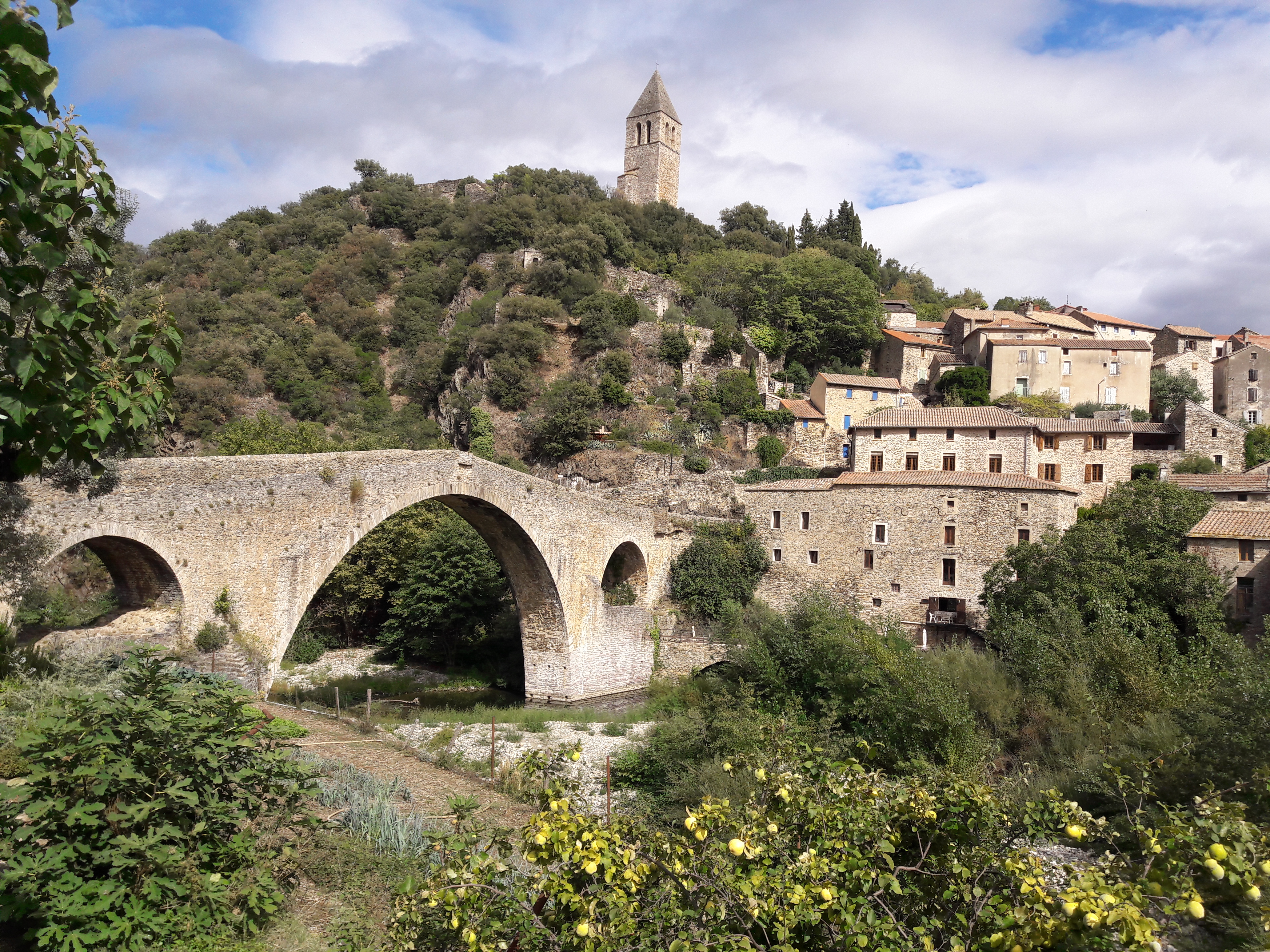 Lieu pittoresque avec un vieux pont de pierres et un village qui se dresse au-dessus de l'Orb.