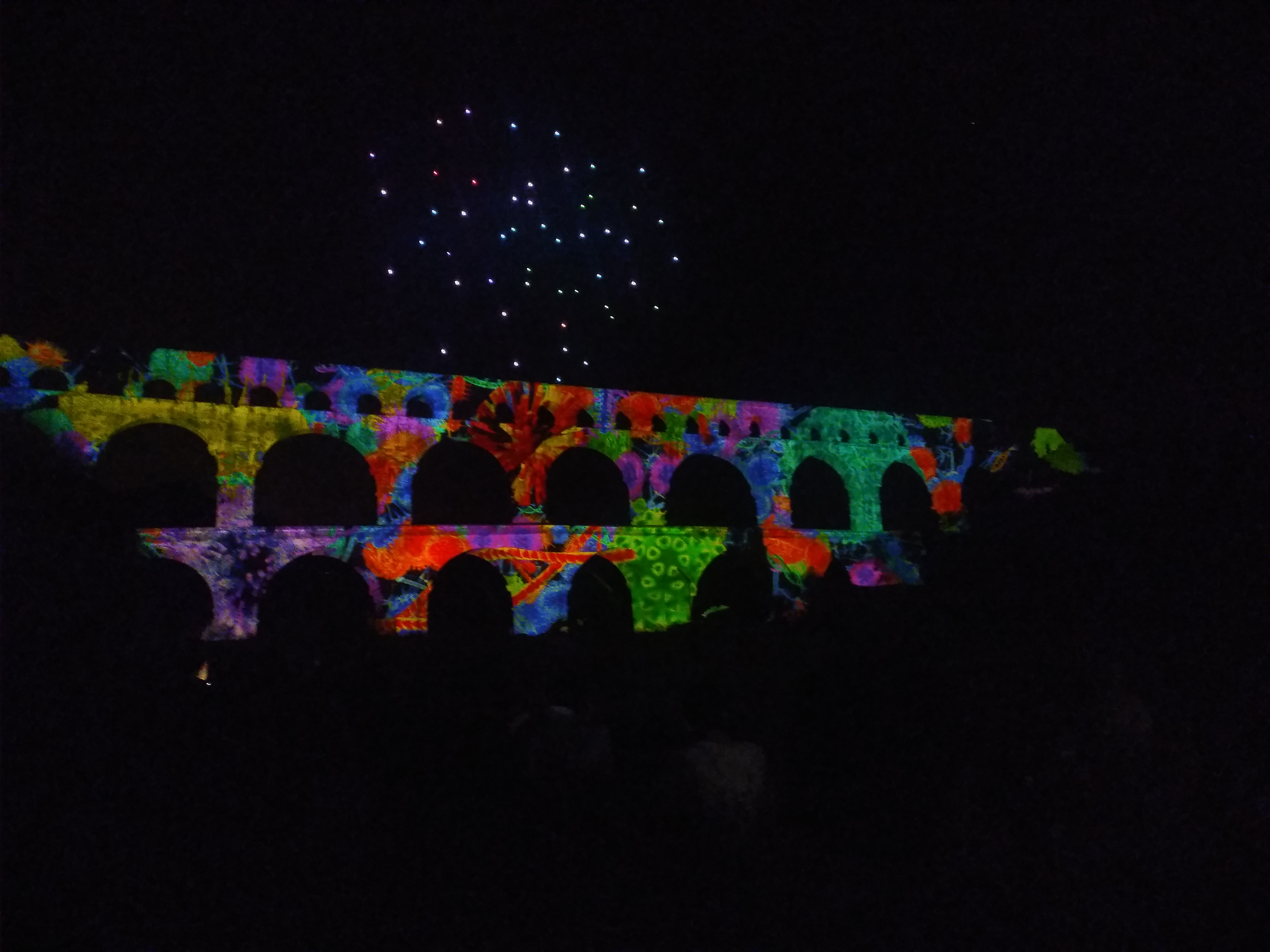 Le pont du Gard est un chef d'œuvre de l'architecture antique. L'imposant aqueduc Romain de 400 m de long et 17 m de haut traverse le Gardon. Super endroit pour venir pique-niquer et se baigner.. Lors des chaudes nuits d'été, le Pont du Gard prend vie grâce à des spectacles de son et lumières. Les nuits du jeudi au dimanche, des drones illuminent le ciel. Nous avons pu assister au spectacle Notre Vaisseau du 22h30 à 22h50 un mercredi soir. C'est un merveilleux spectacle que je vous conseille d'aller voir en famille.