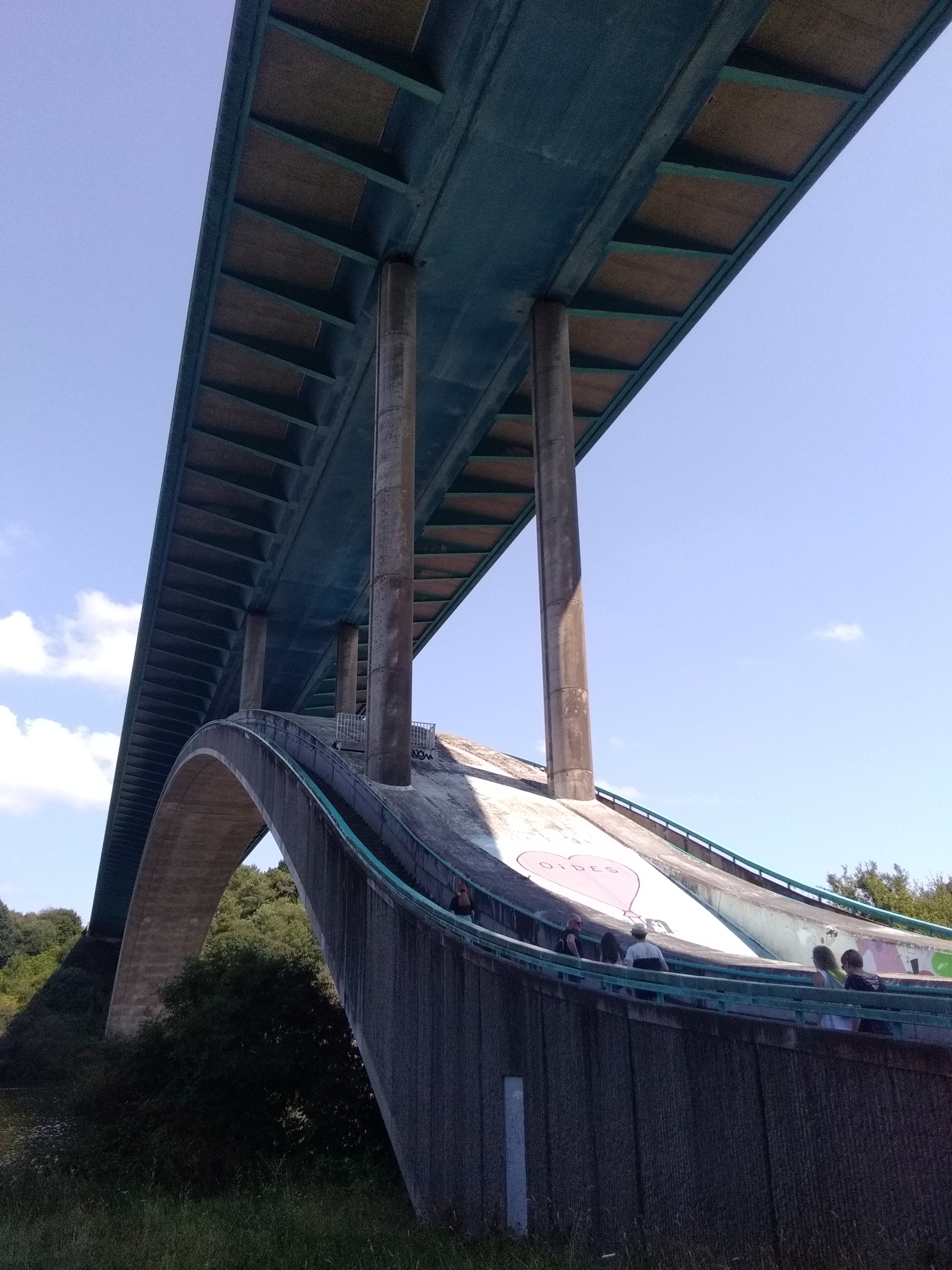 Lors de notre randonnée en bord de Vilaine, nous avons traversé ce pont à pied qui cache, dans l'immense arceau en béton armé, deux chemins piétonniers. C'est très judicieux, et cela évite d'être au contact des véhicules.