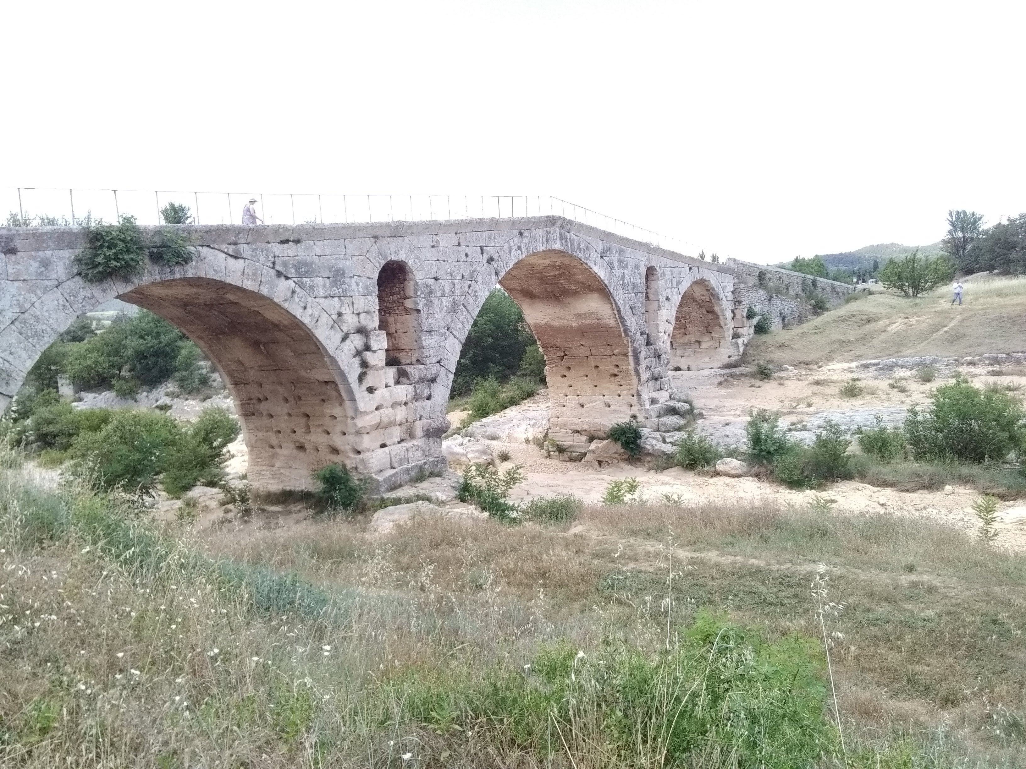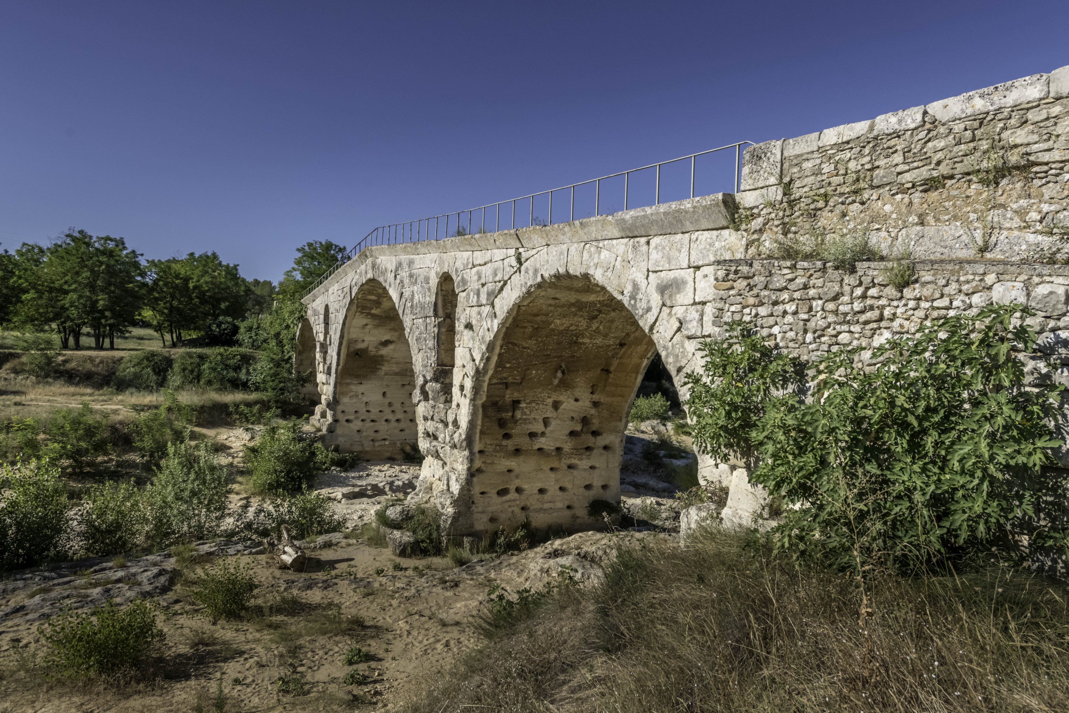 Impressionnant ouvrage solide, construit par les romains pour relier l'actuelle Italie à l'Espagne en utilisant la « Pierre du Midi », une pierre taillée dans une roche calcaire d'origine marine qui s’est formé par l'accumulation de sables et de débris de coquilles il y a des millions d’années. Ce pont a été intégré au réseau routier jusqu’au printemps 2005. Depuis il est emprunté par la véloroute du Calavon. Le lit asséché de la rivière avec ses rochers sculptés et polis par l'eau se prête agréablement pour se ressourcer.