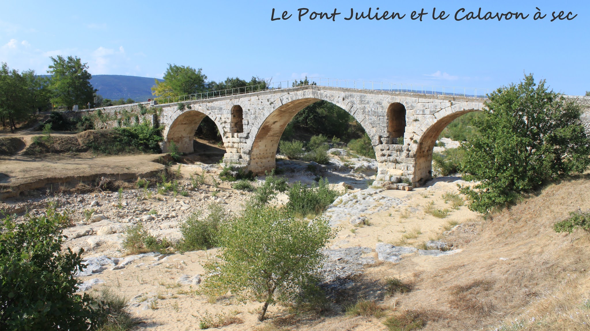 Caché du trafic de transit sur la D300 d'Avignon à Apt, le pont Julien d'époque romaine traverse la rivière Calavon. Aujourd'hui, il ne s'agit plus d'un trafic motorisé, mais d'une partie de la véloroute verte du Calavon, basée sur une ancienne voie ferrée. En raison de la source humide, l'eau coule à travers le lit du Calavon en juin de cette année.