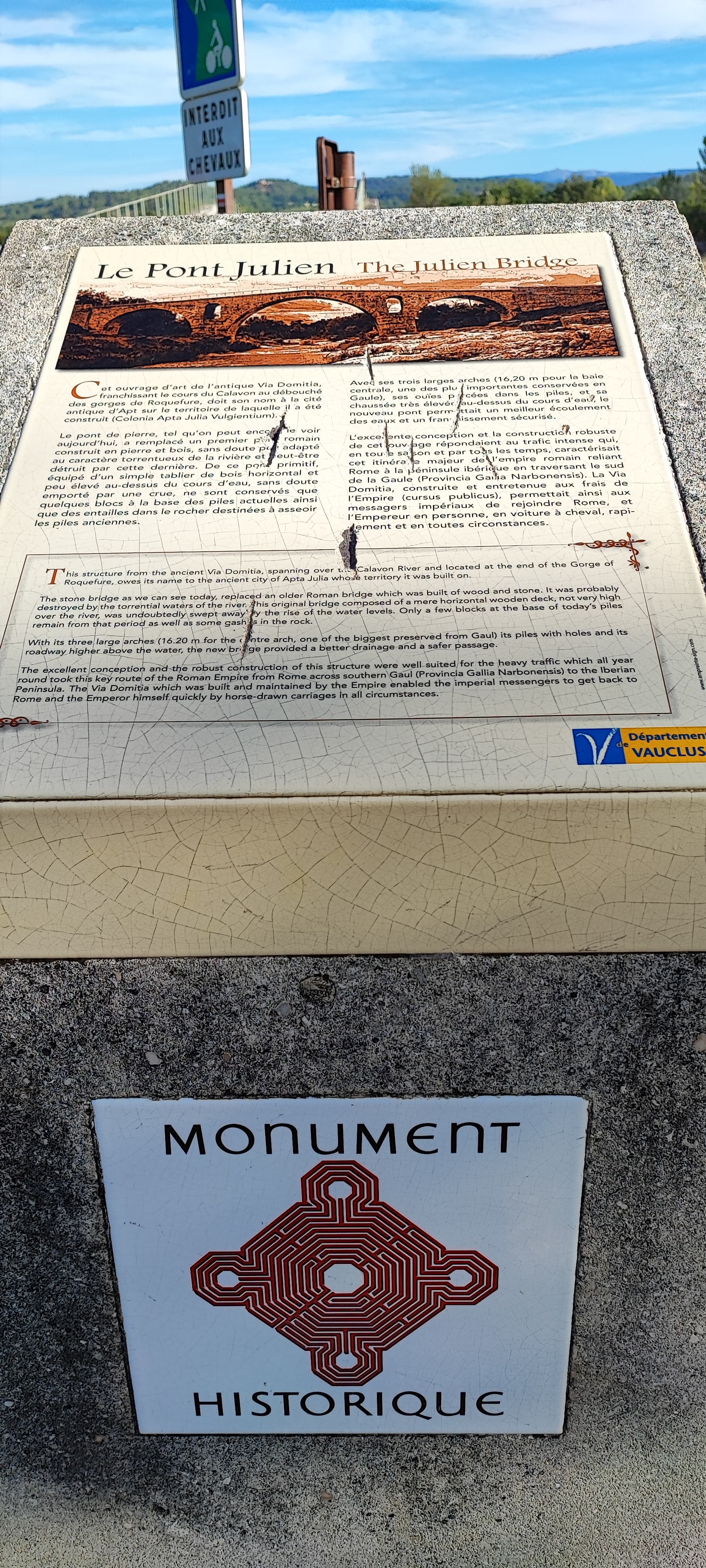 A proximité de Bonnieux, de Lacoste, d'Apt, ce pont romain du premier siècle av. J.C est très bien conservé et très accessible Pas loin de l'ex N100 (aujourd'hui D900), autrefois via Domitia. Un parking. Tout est fait pour profiter agréablement de ce monument historique. Une pause antique d'un quart d'heure ou plus si on se sent bien.