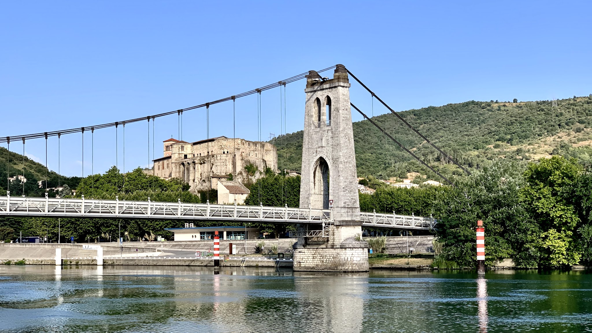 280 mètres de pont pour relier deux bourgades, c'est la fonction principale d'un pont. Ici il relie aussi les département de la Drôme et l'Ardèche. Jolie vue depuis le Rhône avec le pont suspendu, le château et le clocher de l'Eglise Saint-Vincent.La nuit, une jolie mise en lumière est à ne pas manquer.