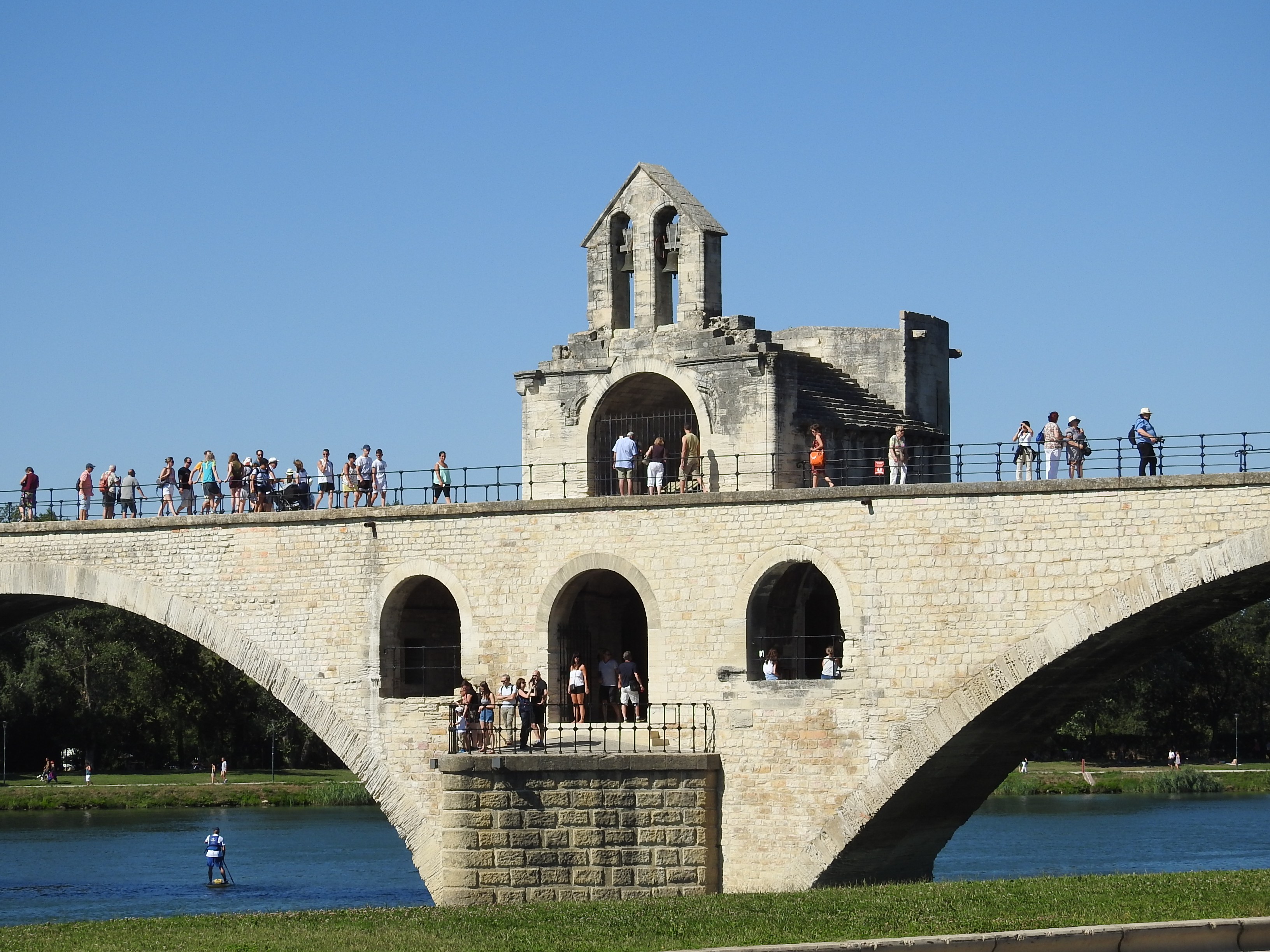 Un joli pont avec de belles vues Le pont en bois enjambant le Rhône entre Villeneuve-lès-Avignon et Avignon a été construit entre 1177 et 1185. Ce premier pont a été détruit quarante ans plus tard en 1226 lors de la croisade des Albigeois lorsque Louis VIII de France assiégea Avignon. À partir de 1234, le pont fut reconstruit avec 22 arches en pierre. Le pont de pierre mesurait environ 900 m (980 yd) de longueur et seulement 4,9 m (16 pi 1 po) de largeur, y compris les parapets sur les côtés. Le pont fut abandonné au milieu du XVIIe siècle car les arches avaient tendance à s'effondrer à chaque crue du Rhône, rendant son entretien très coûteux. Quatre arches et la guérite à l'extrémité avignonnaise du pont ont survécu. La chapelle Saint-Nicolas qui se trouve sur la deuxième pile du pont a été construite dans la seconde moitié du XIIe siècle mais a depuis été considérablement modifiée. Le terminus ouest, la Tour Philippe-le-Bel, est également conservé. Le pont a inspiré la chanson Sur le pont d'Avignon et est considéré comme un monument de la ville. En 1995, les arches survivantes du pont ont été classées au patrimoine mondial, avec le Palais des Papes, la Cathédrale Notre-Dame des Doms et d'autres monuments du centre historique d'Avignon, en raison de leur témoignage du rôle moteur d'Avignon dans la papauté aux XIVe et XVe siècles.