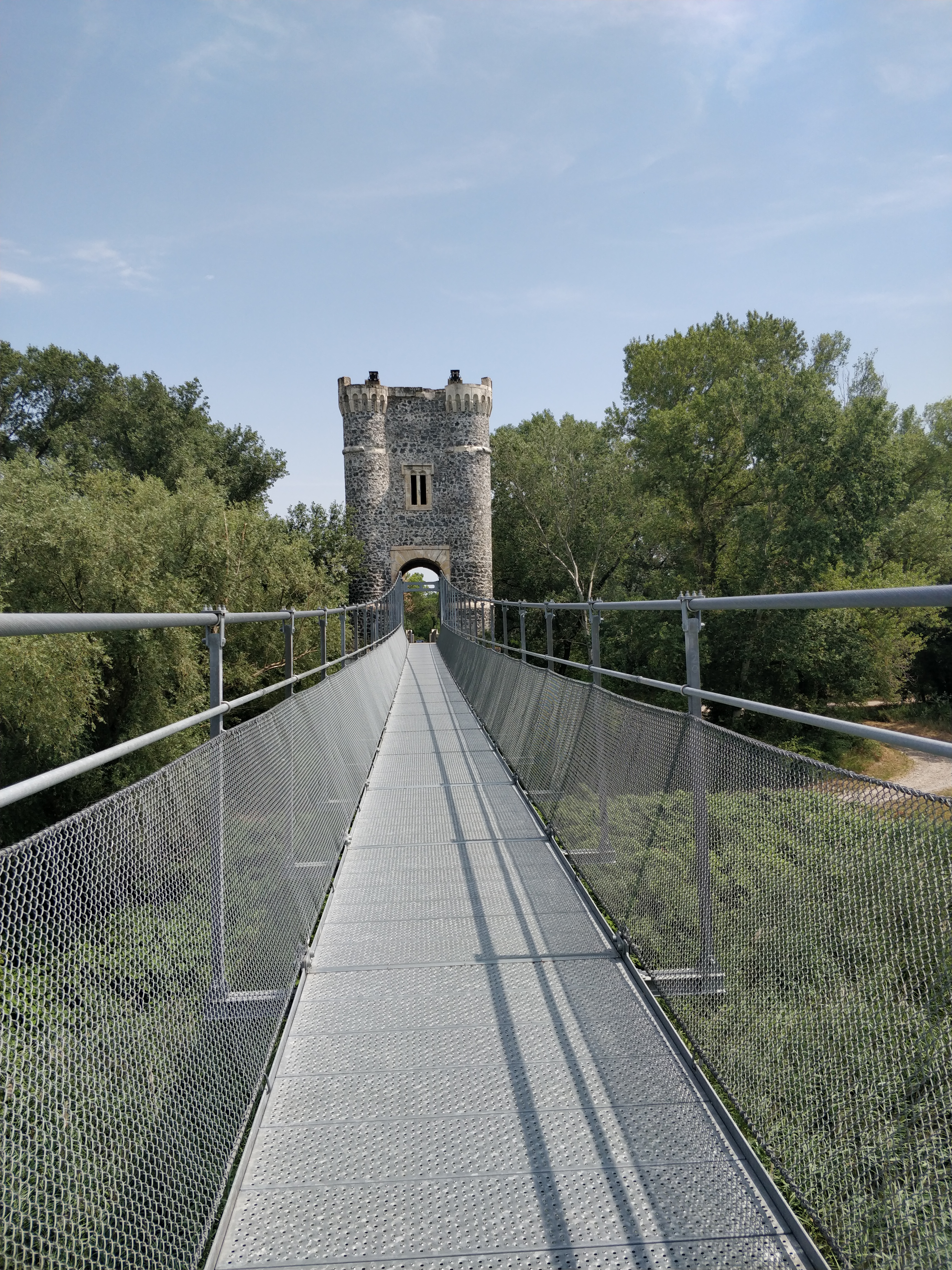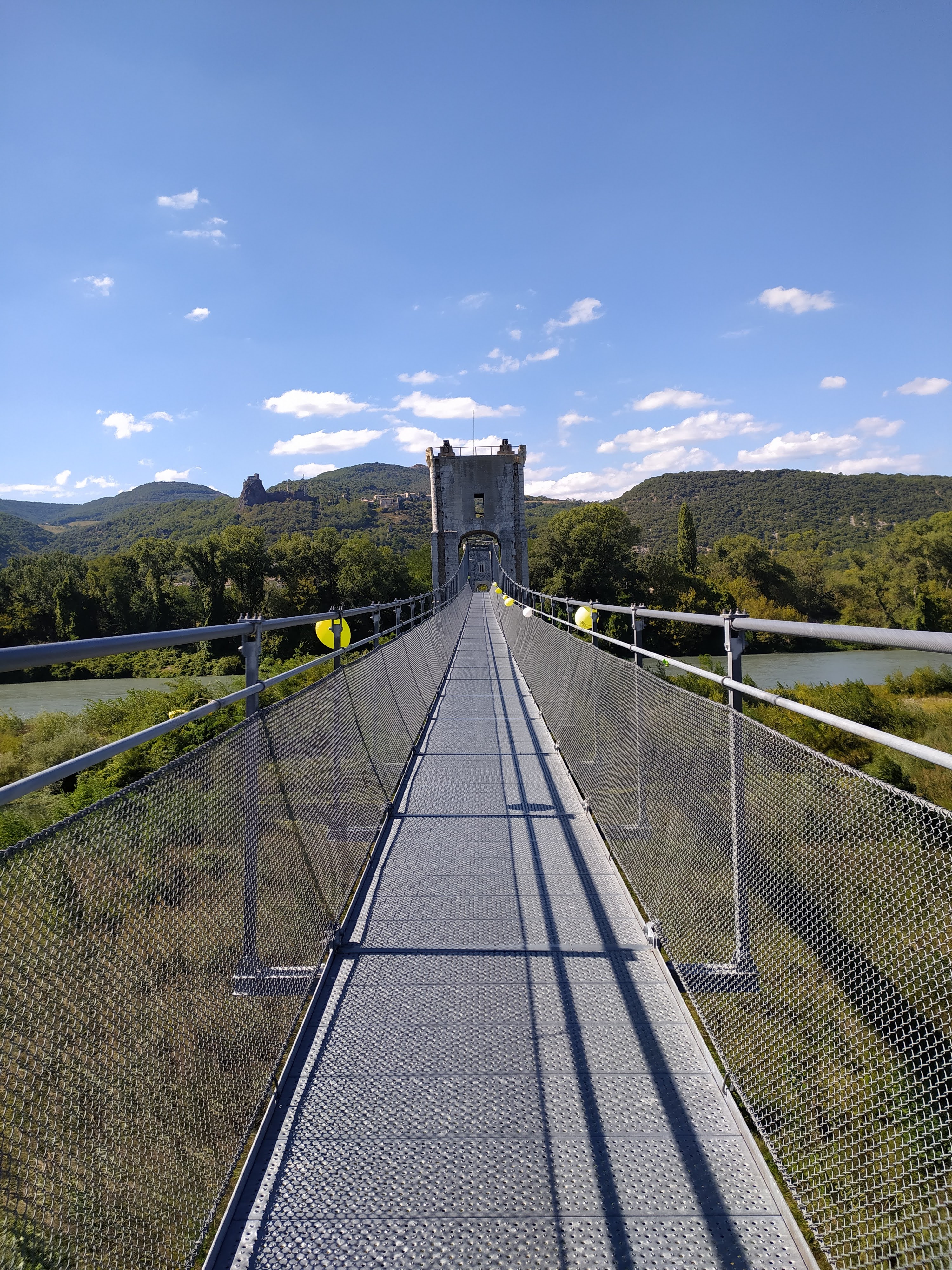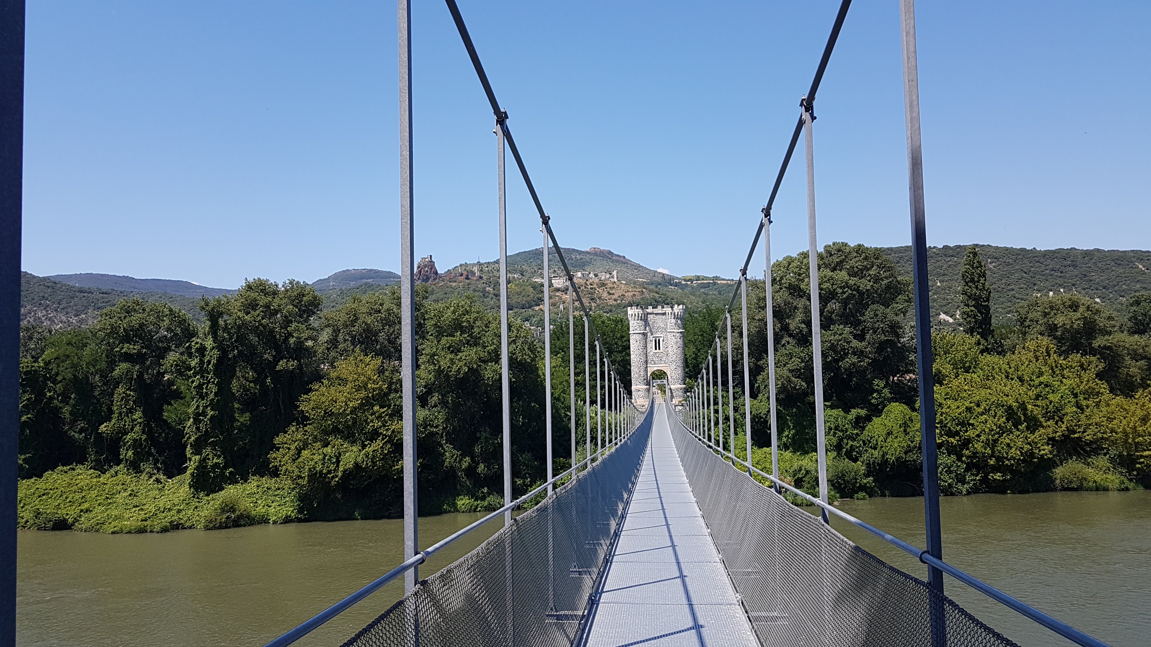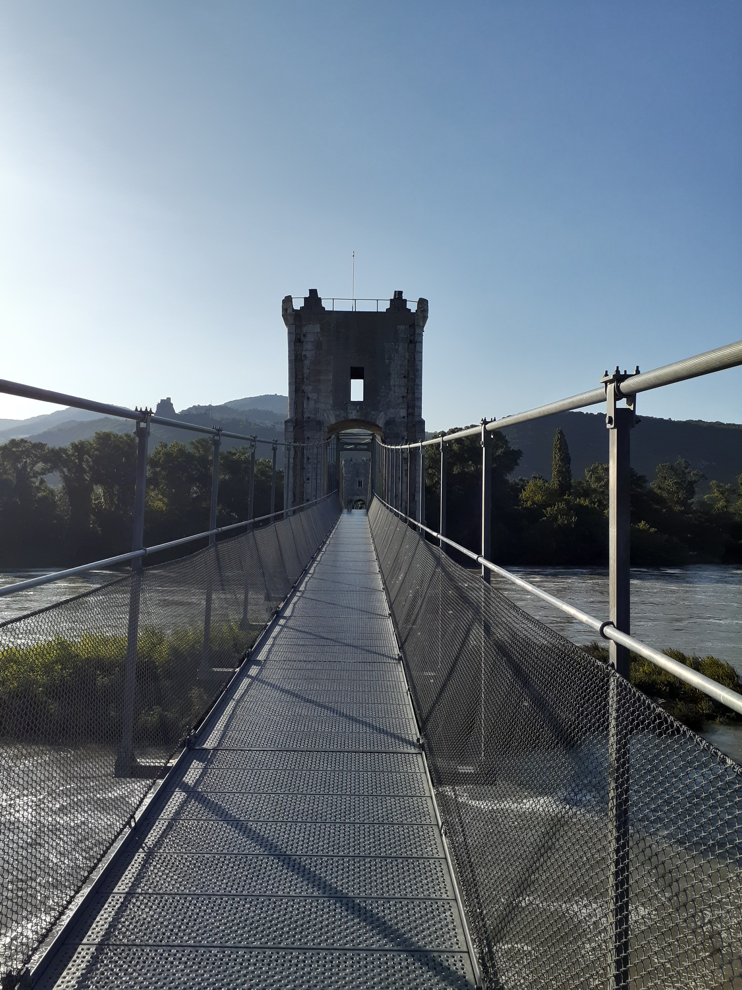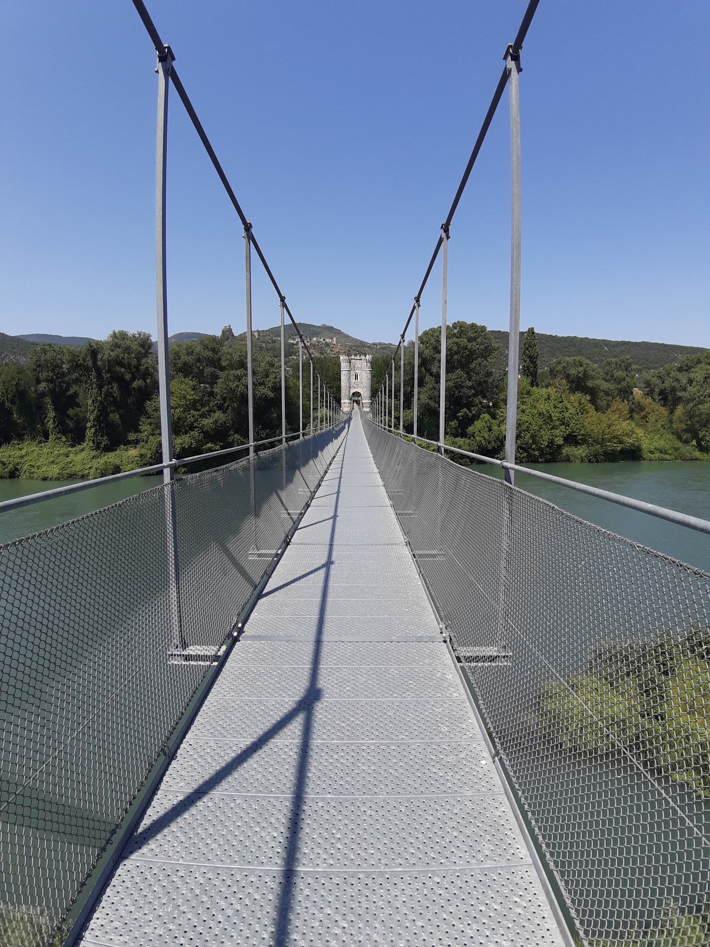 Super pont passerelle à faire absolument, le pont bouge un peu mais ces ce qui fait le charme. On passe au dessus du Rhône avec une vue magnifique sur un village médiéval. On peut le passer à pied ou en vélo.
