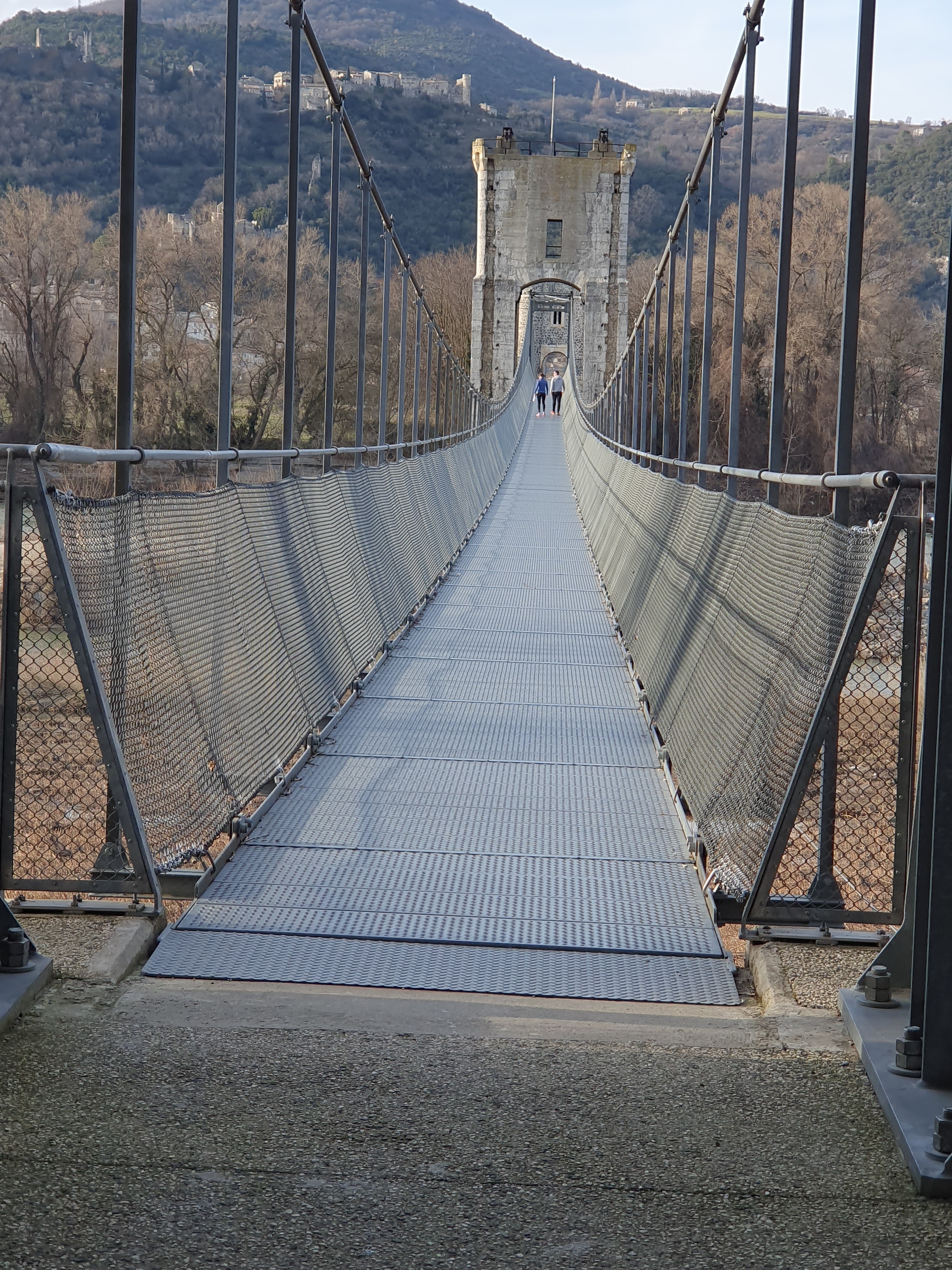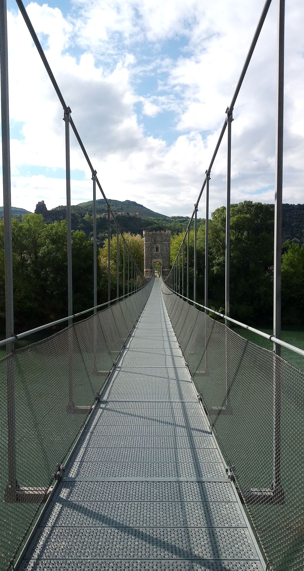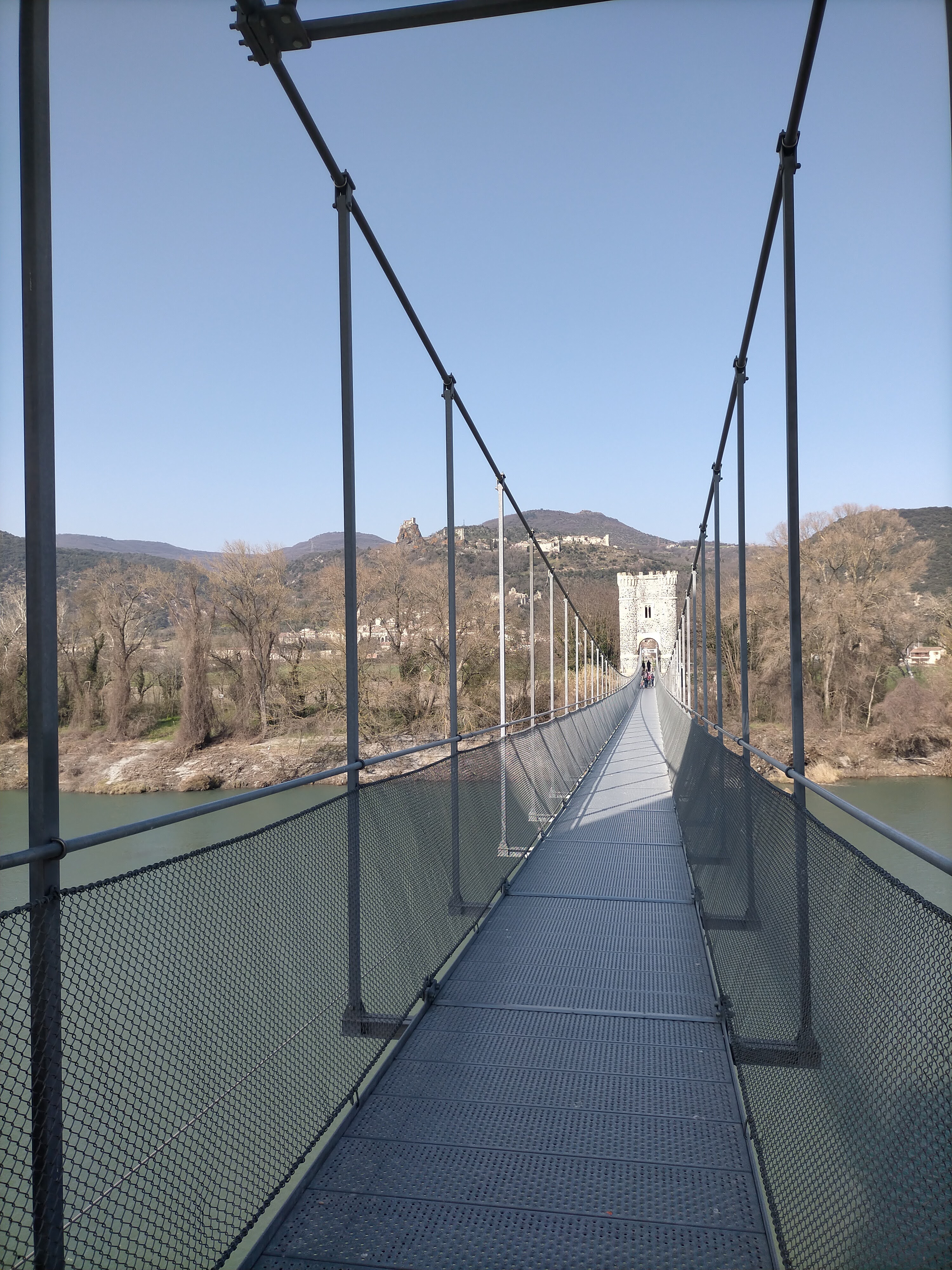 Après la montée vers le château de Rochemaure nous sommes redescendus en direction de la passerelle et franchi celle-ci avec nos 2 adolescents ! Simple à franchir et rapide mais par temps venté difficile de marcher dessus ! Belle vue du Rhône ! Nous n avons pas pu visiter le Château car fermé et aucun restaurant d ouvert donc nous dommes allés à meysse et avons été enchanté de bistronoma rerestaurant ouvert à midi un samedi!