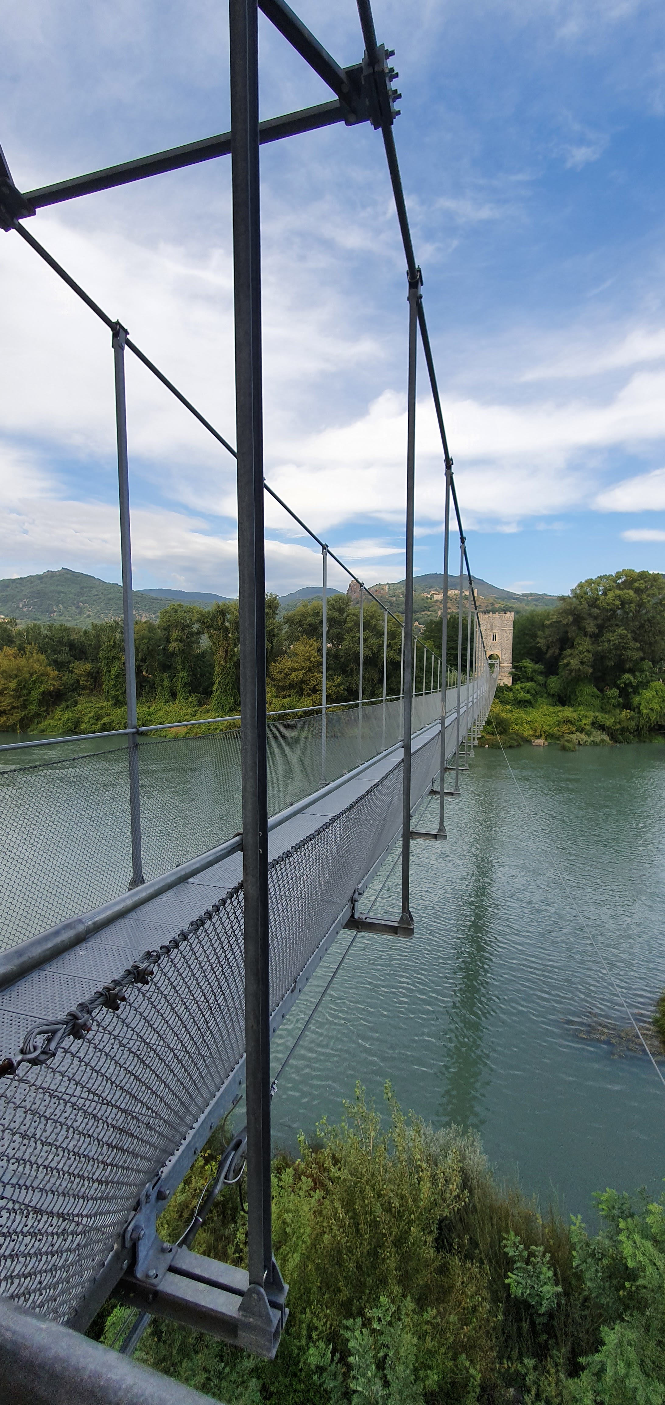Belle idée que cette passerelle himalayenne sur le pont historique de Roquemaure. Un joli final pour notre balade sur la Via Rhôna, un AR entre Bourg St-Andéol et Roquemaure. Si vous passez en Isère allez voir celle de Monteyard, qui traverse le Drac, elle a inspiré la construction de celle de Roquemaure.