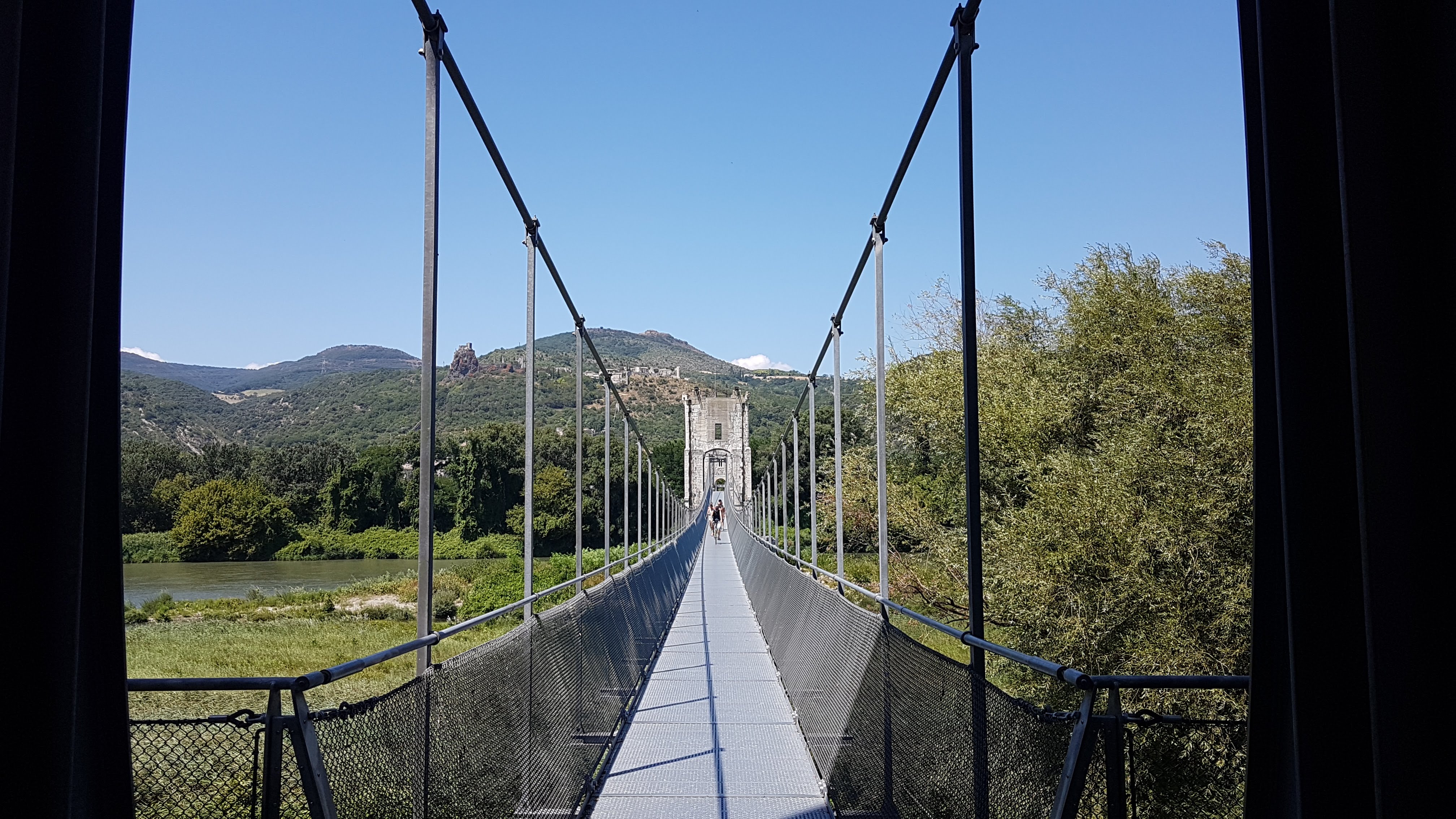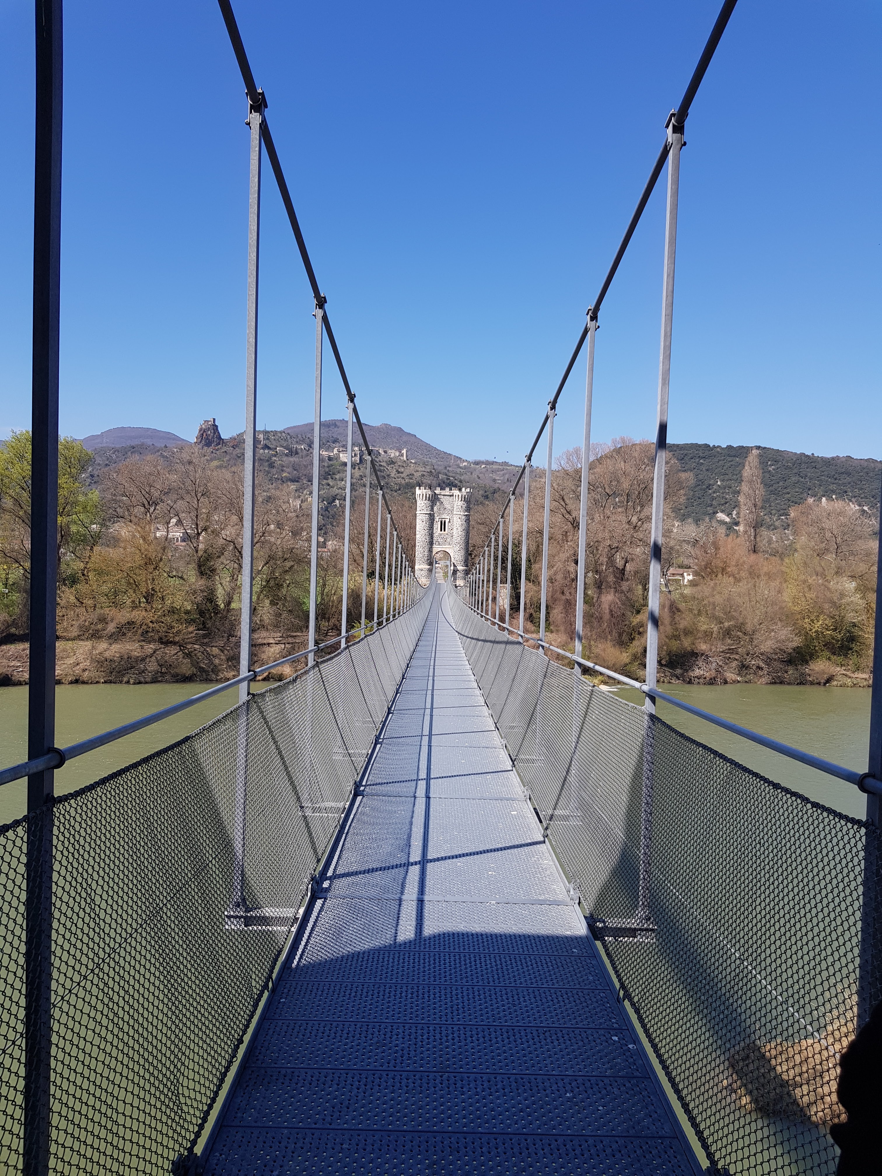 Super sympa, passage sur le Rhône, sur une passerelle en fer. Moi qui ai un peu le vertige, le sol n'est pas trop ajouré et on profite du paysage sur la forteresse en haut du village de Rochemaure.