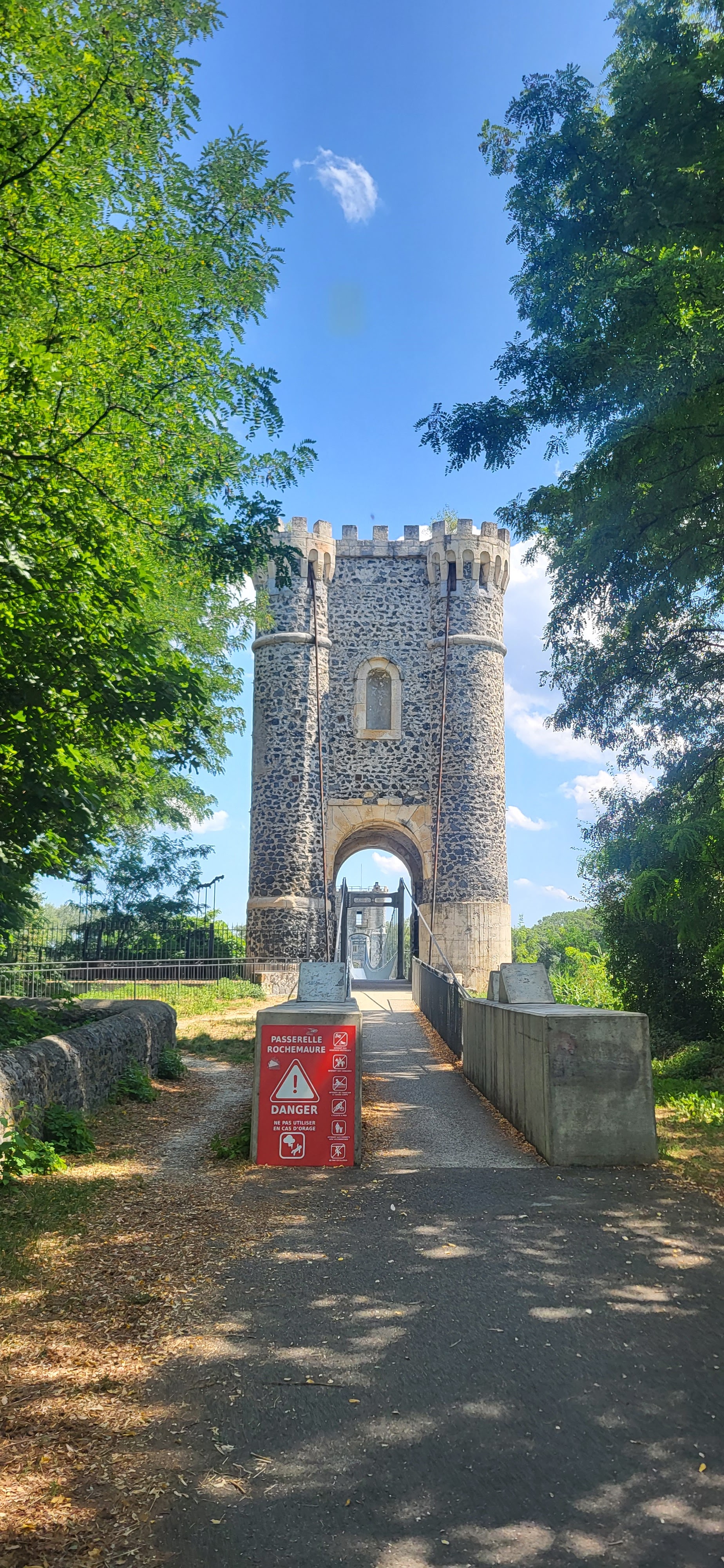 Superbe passerelle himalayenne Seule la tour du milieu est d'époque les deux autres sont récentes. Avec le vent elle se soulève et on semble voler avec les éléments. Très jolie expérience et magnifique vue sur le château de Rochemort Pour ceux qui on le vertige c'est relativement impressionnant. À faire et refaire en famille.