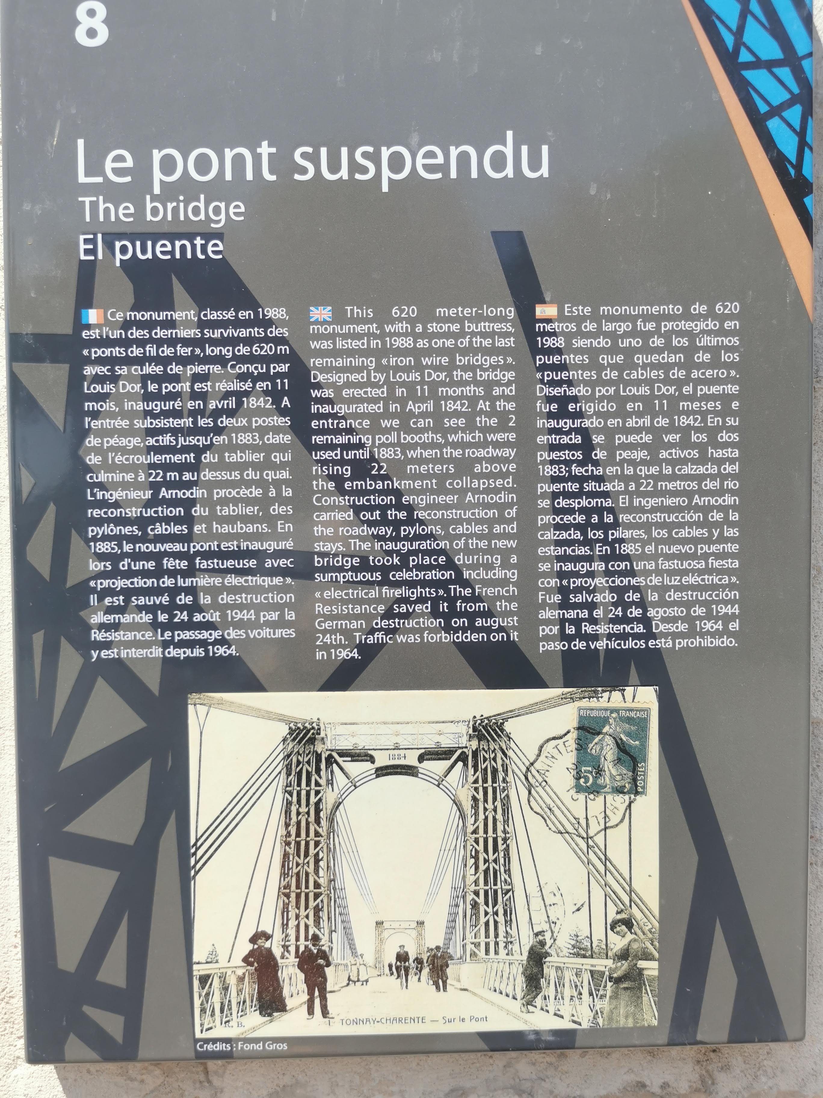 Pont suspendu très ancien (1842), en partie reconstruit en 1885, et récemment rénové et sécurisé. Servant autrefois à tout le trafic, il est réservé aux vélos et piétons. Idéal pour une ballade vers le marais sur l'autre rive de la Charente. Point de vue très étendu sur la ville de Tonnay, sur les méandres de la Charente (magnifique), les marais et les ponts de Rochefort et Cabariot.