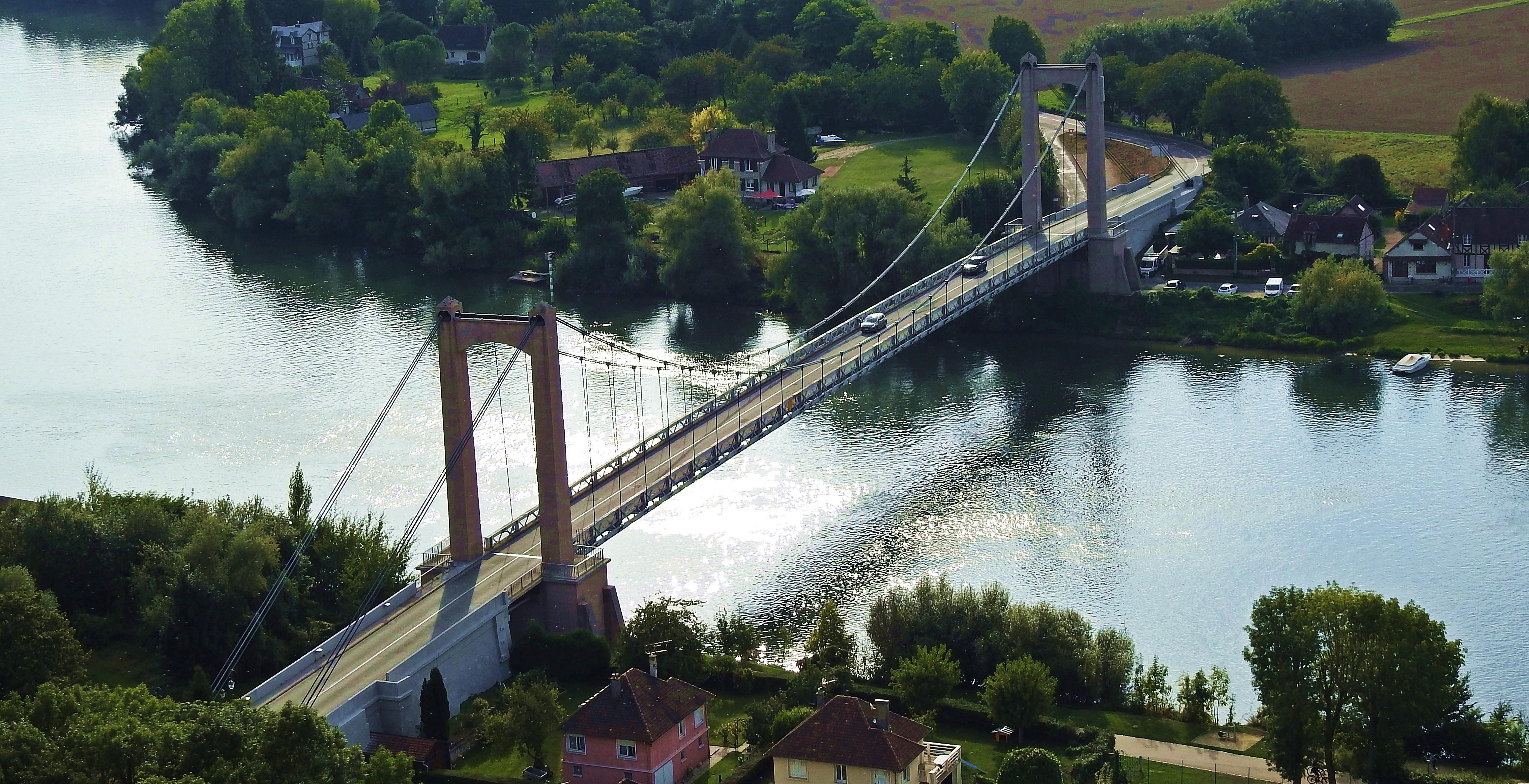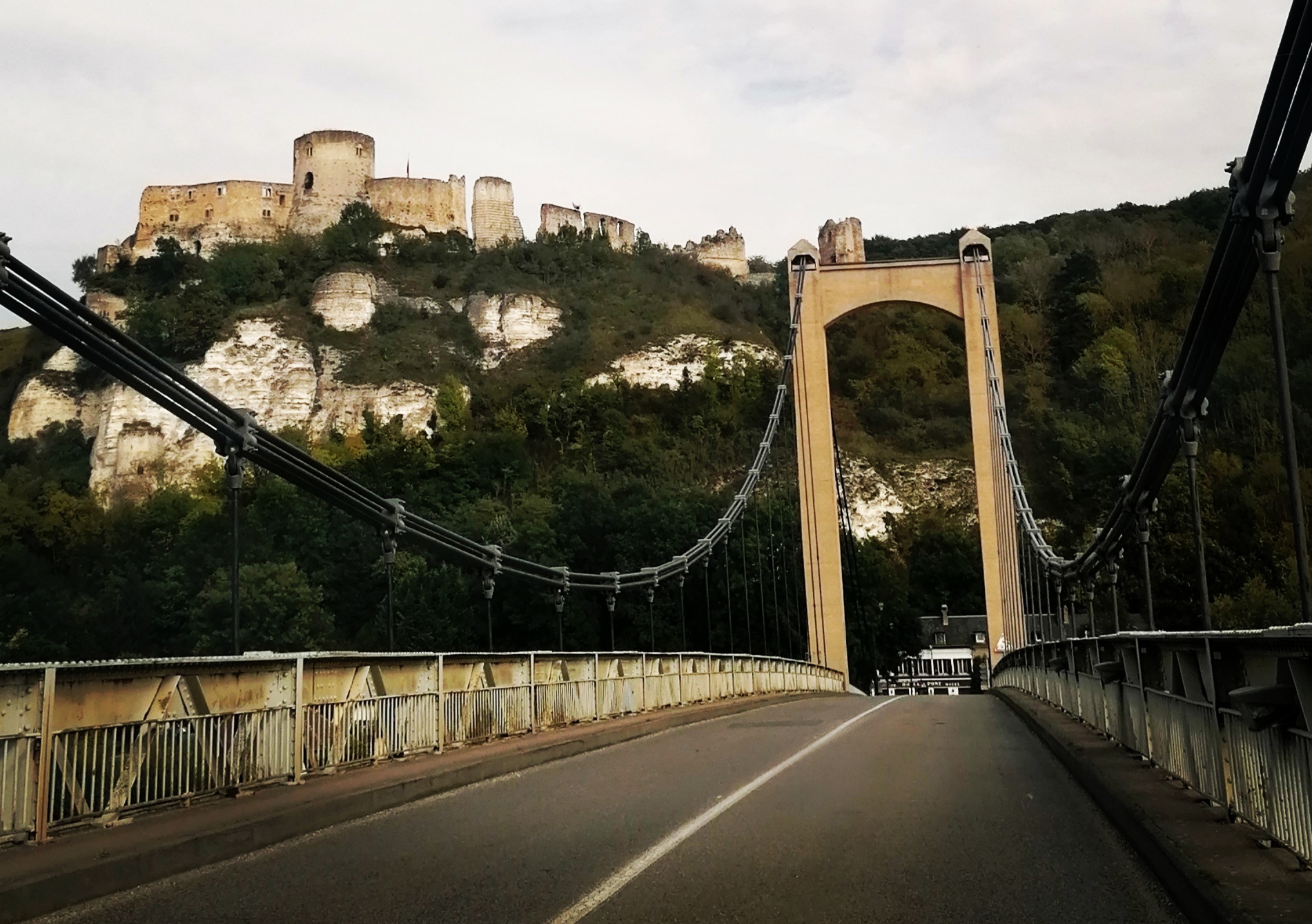 Beau pont suspendu, il a l'air bien entretenu. Je suis juste passé dessous à Vélo. Quand le pont est derrière nous, on voit d'ailleurs bien le petit Andelys et son église.