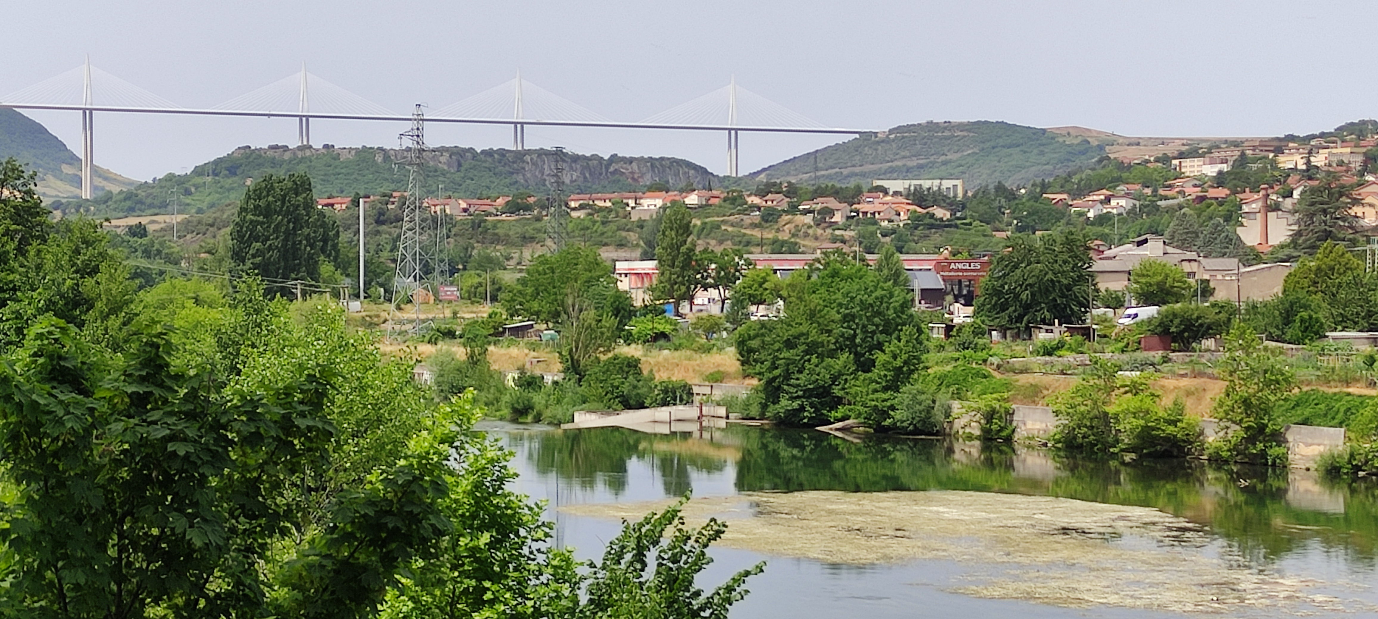Jolie vue sur le cours d'eau, sur le pont et le viaduc de Millau. Possible de voir l'intérieur car un exposition à lieu cet été.