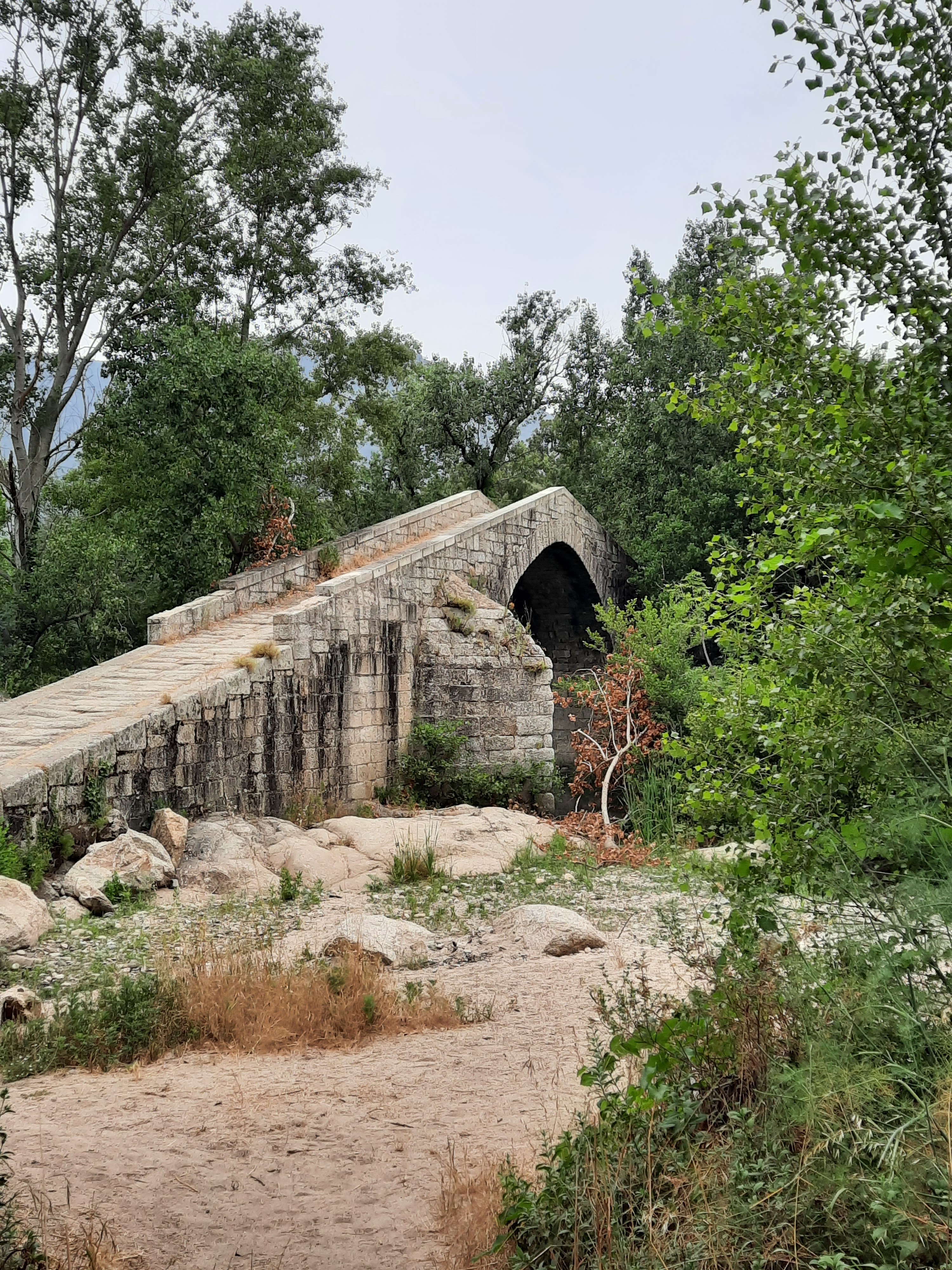 Pont à la forme étrange. Il date du treizième siècle. Endroit paisible. Plagettes au bord de la rivière.