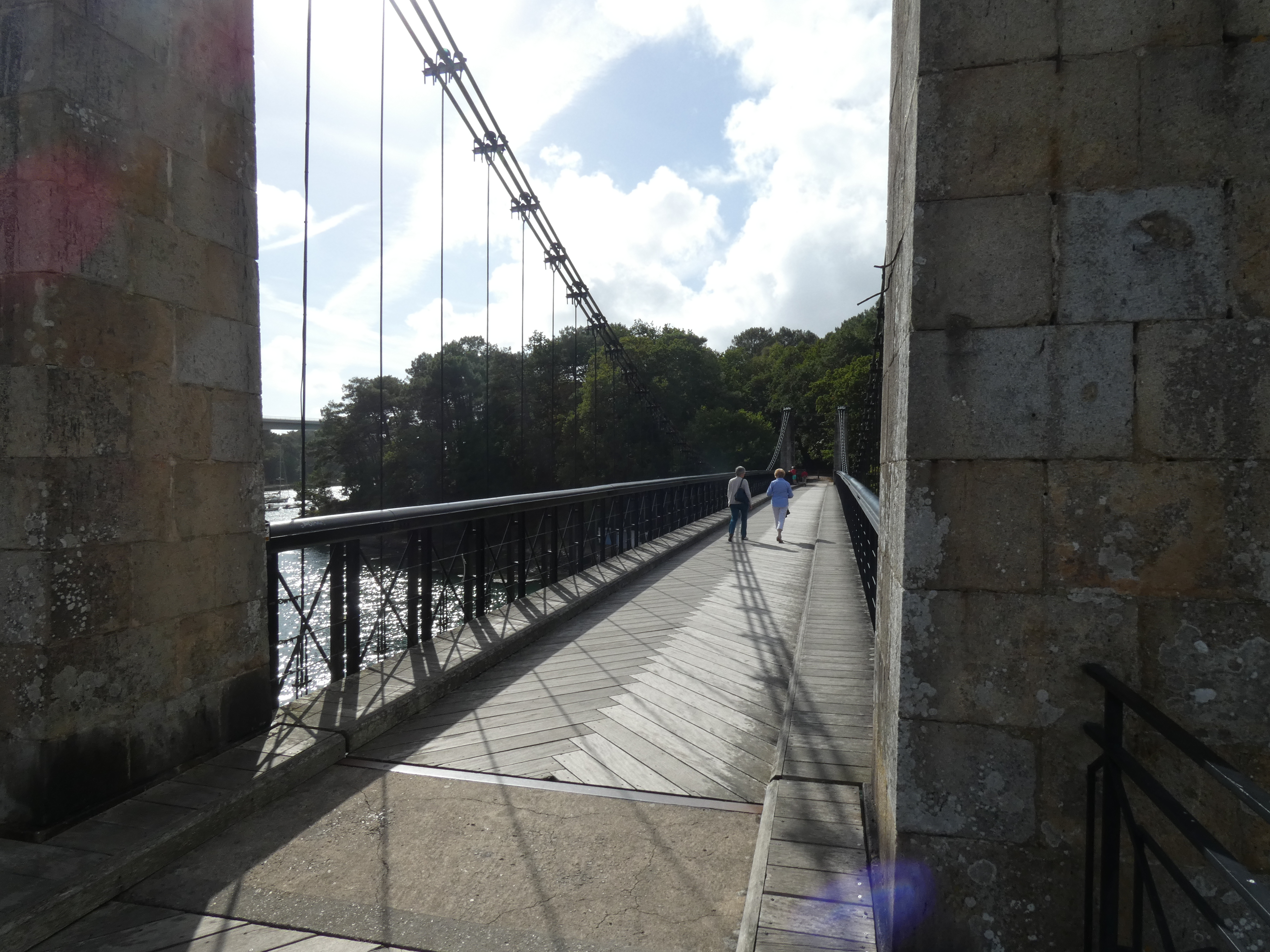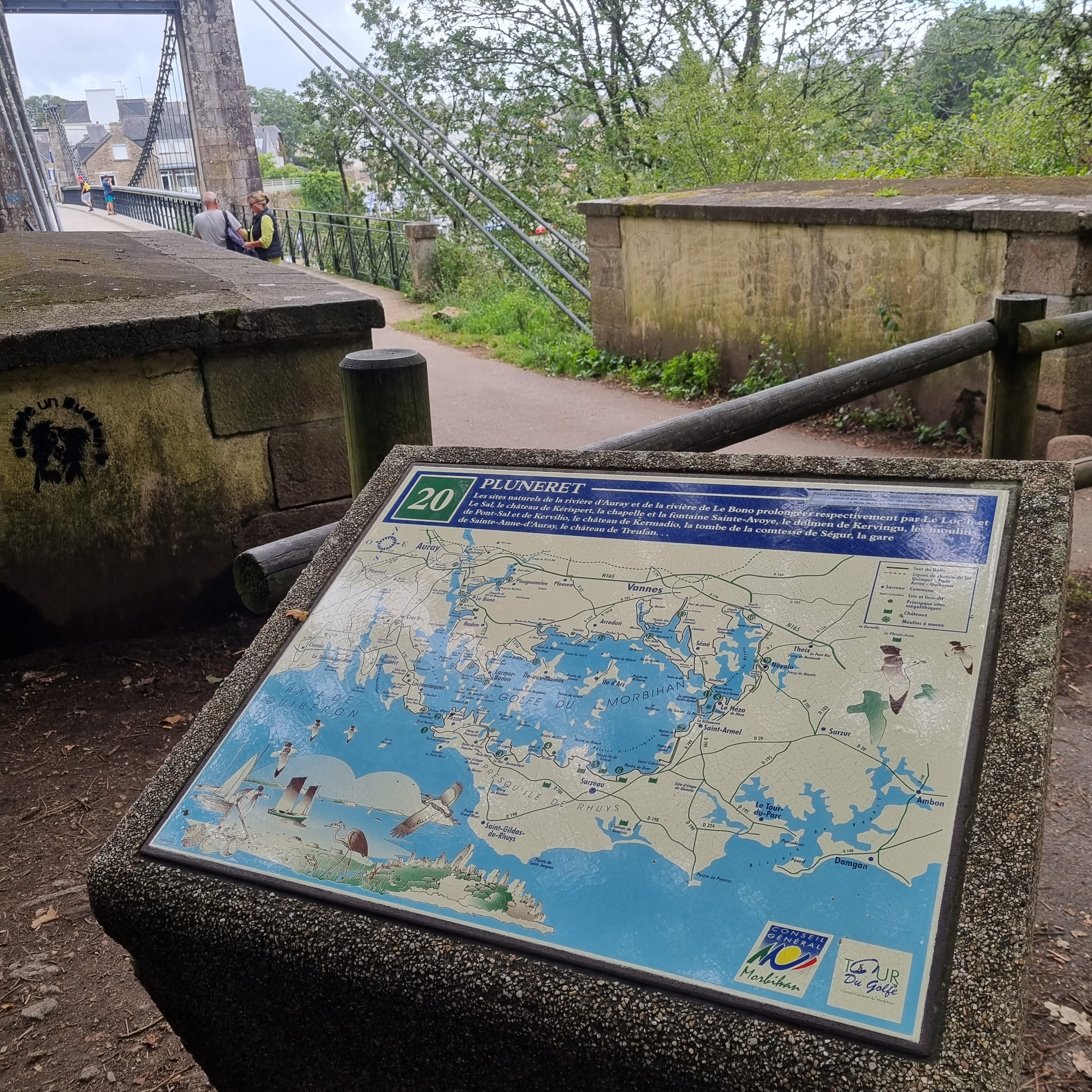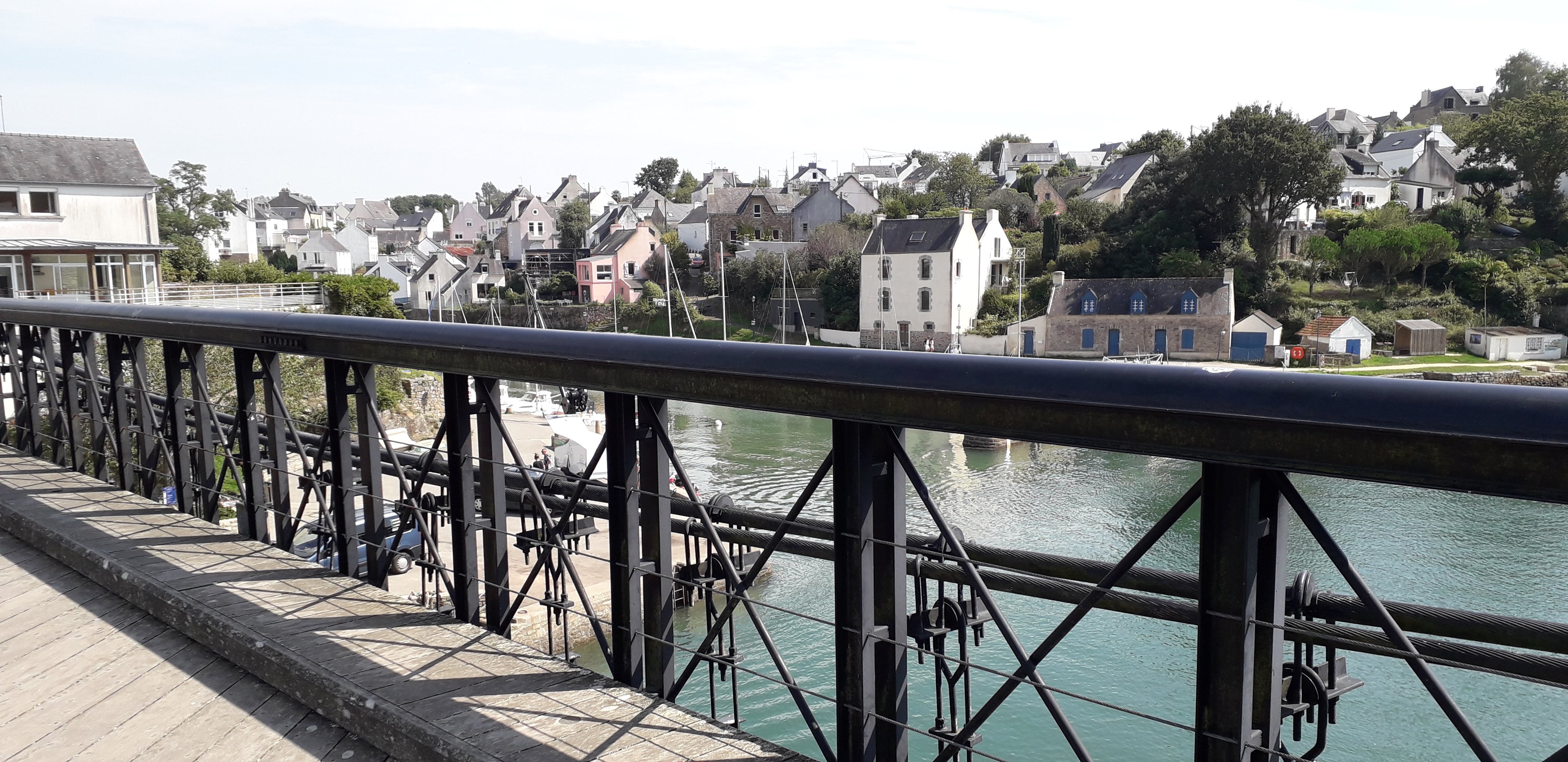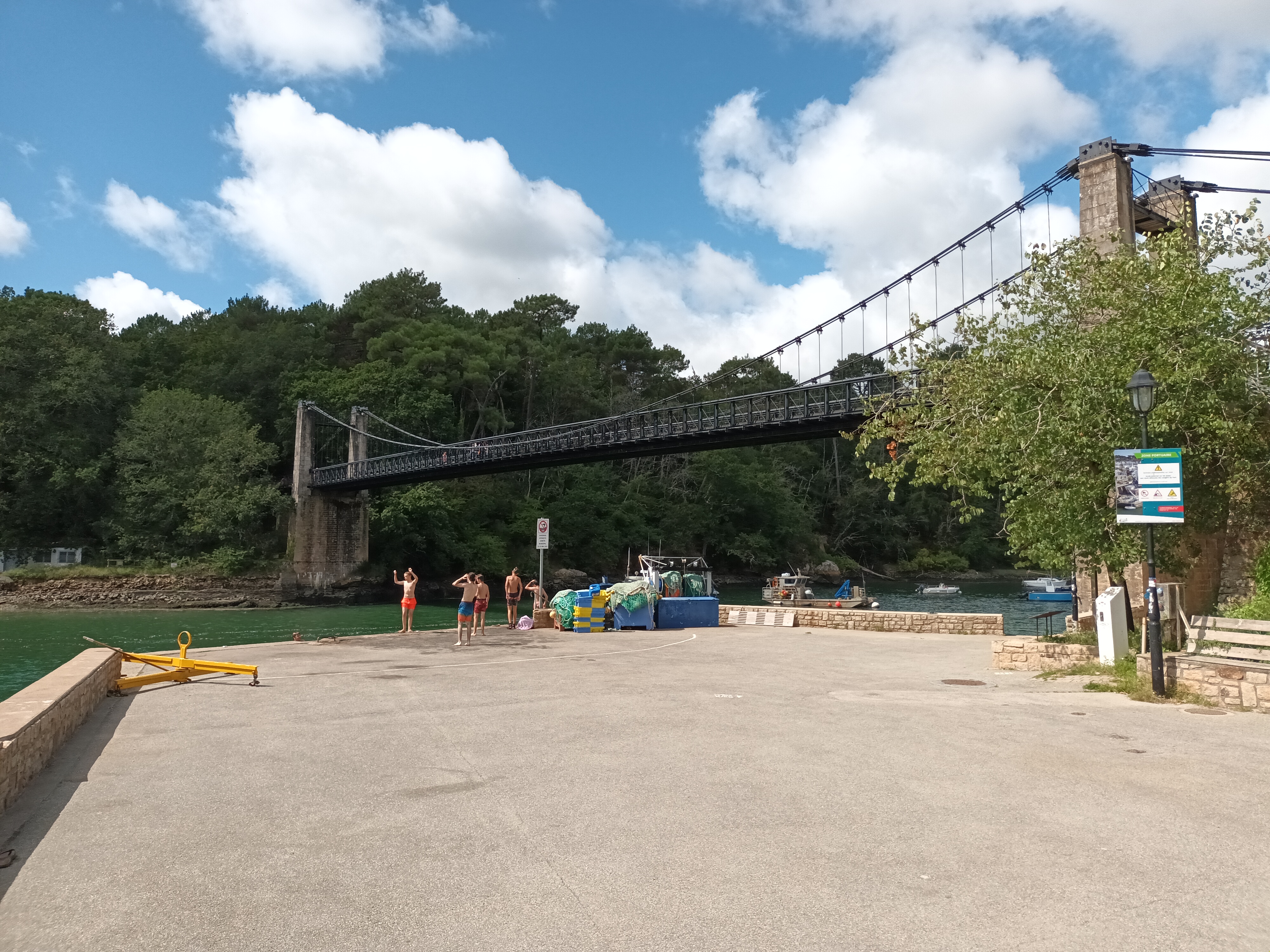 de passage au port du Bono nous avons traversé ce pont d un autre âge ; reconstruit à l identique . et je recommande la balade côtière jusqu'à la pointe de kerister . vous y découvrirez le jardin du souvenir un lieu de recueillement et de souvenir . que personne , avec une once d'honneur , ne devrait avoir l idée de rayer de la carte . quelle honte si jamais cela arrivait , soutenez les